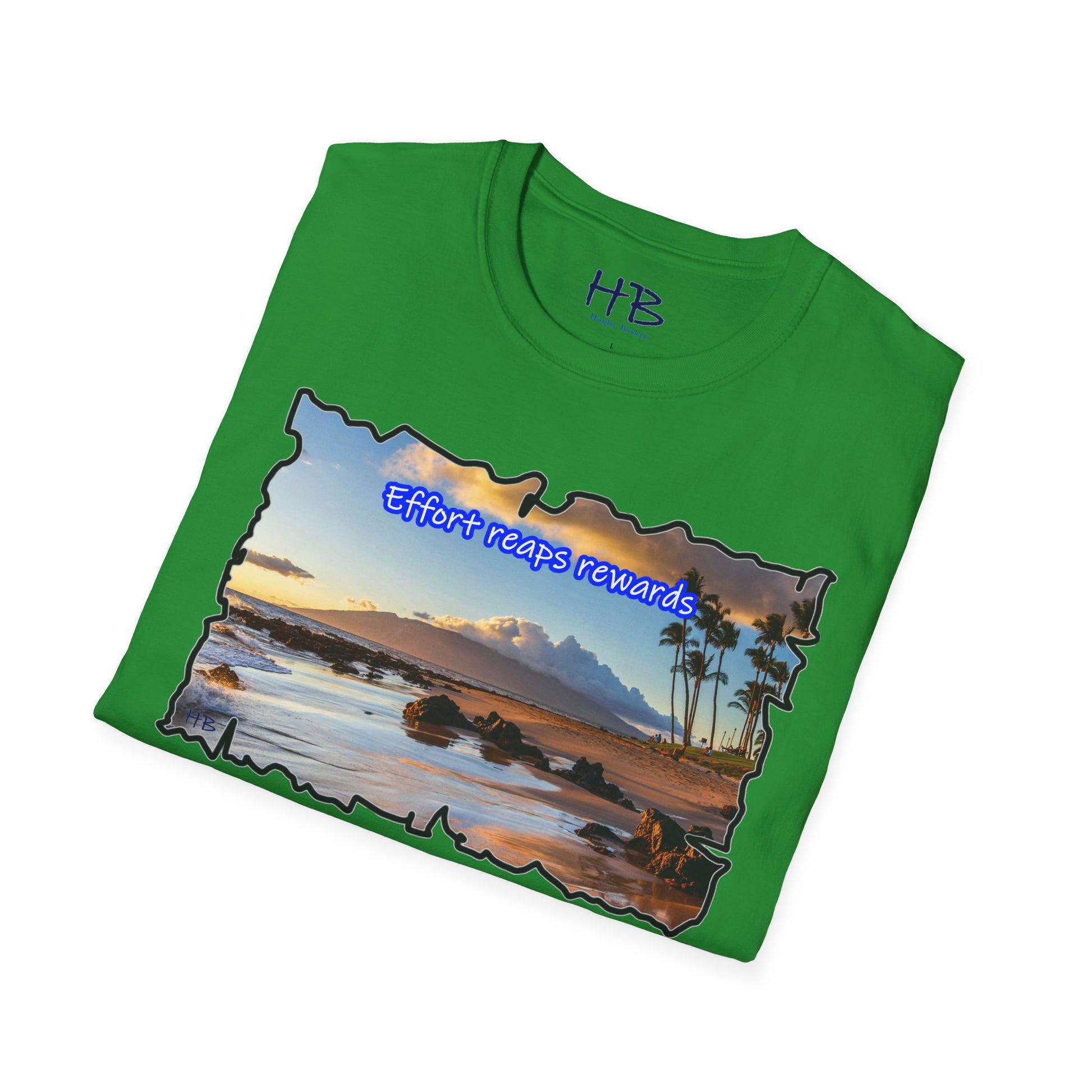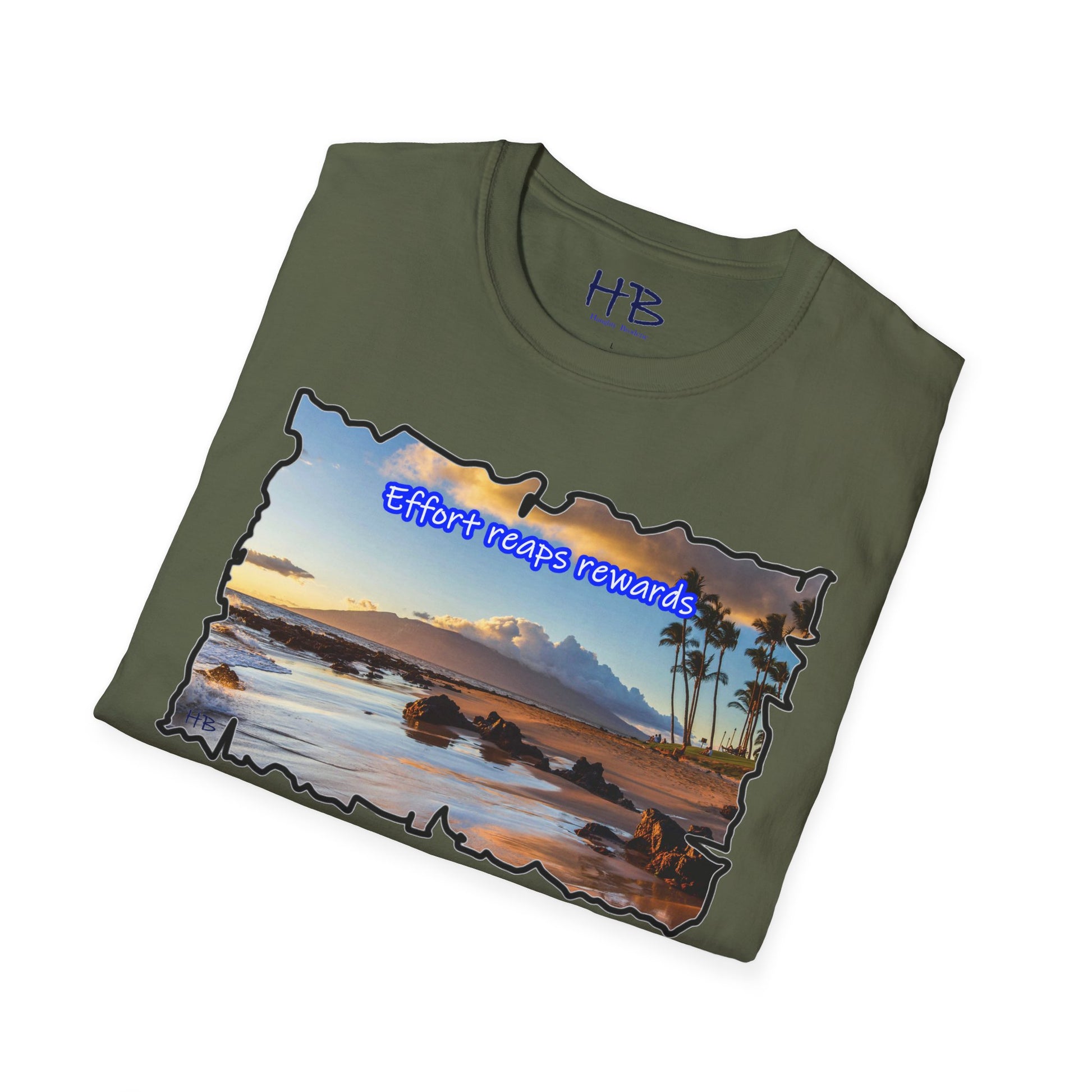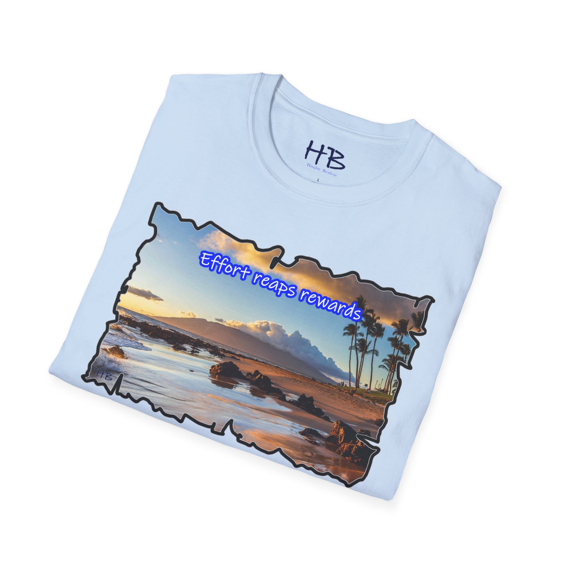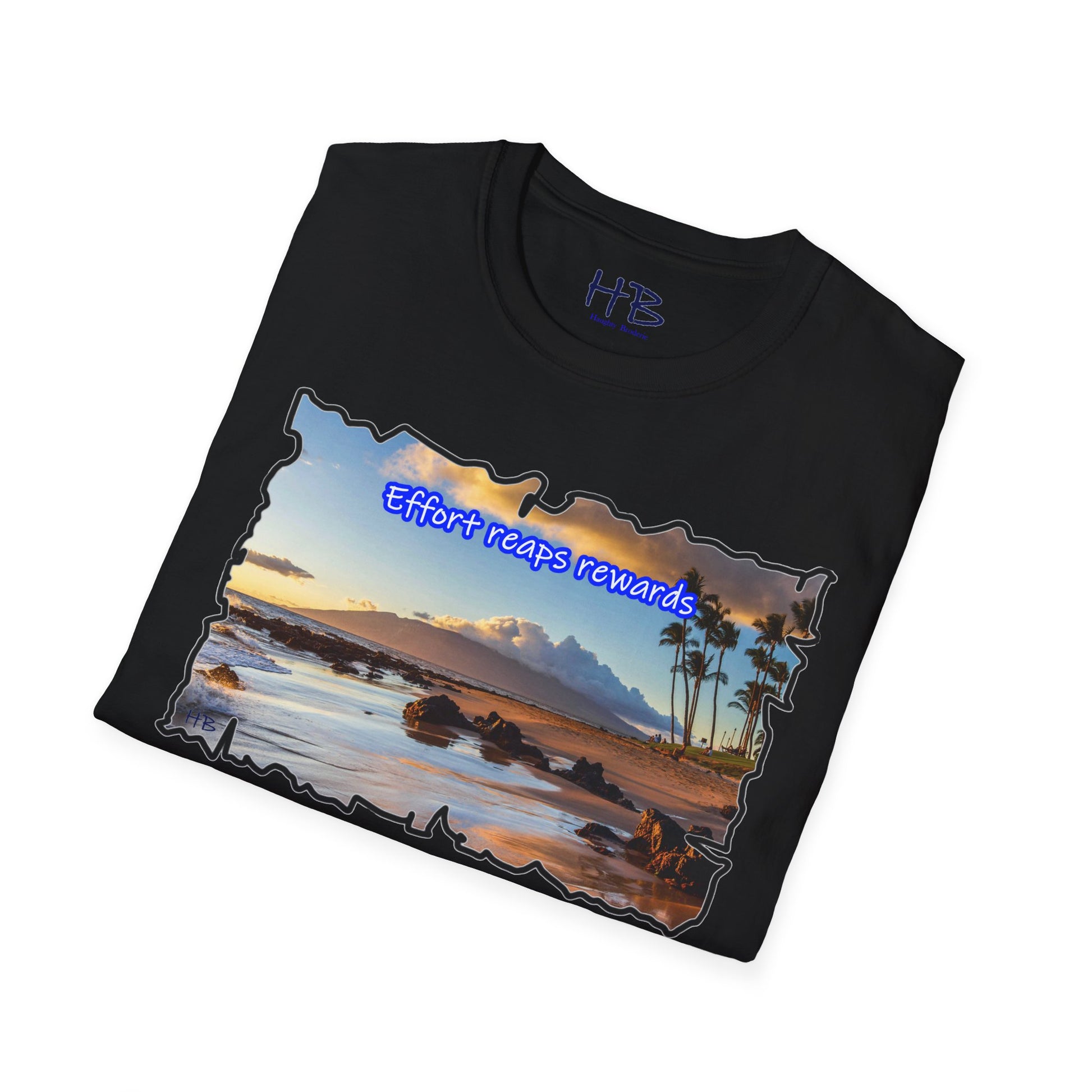 Picture yourself strolling along the shore, waves tenderly caressing the rocks scattered on the sand, creating a harmonious symphony of nature's beauty. The image is not just a feast for the eyes; it's a visual testament to the phrase proudly emblazoned across this extraordinary piece: "Effort reaps rewards." A reminder that hard work yields the ultimate prize—an idyllic island escape where the toil of the year transforms into a well-deserved vacation paradise.