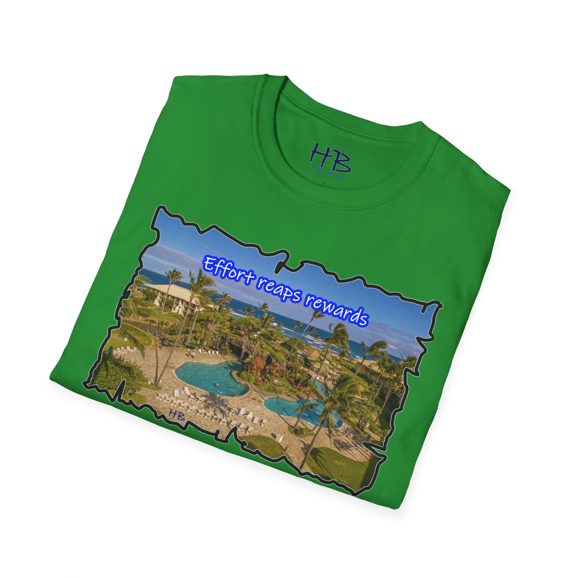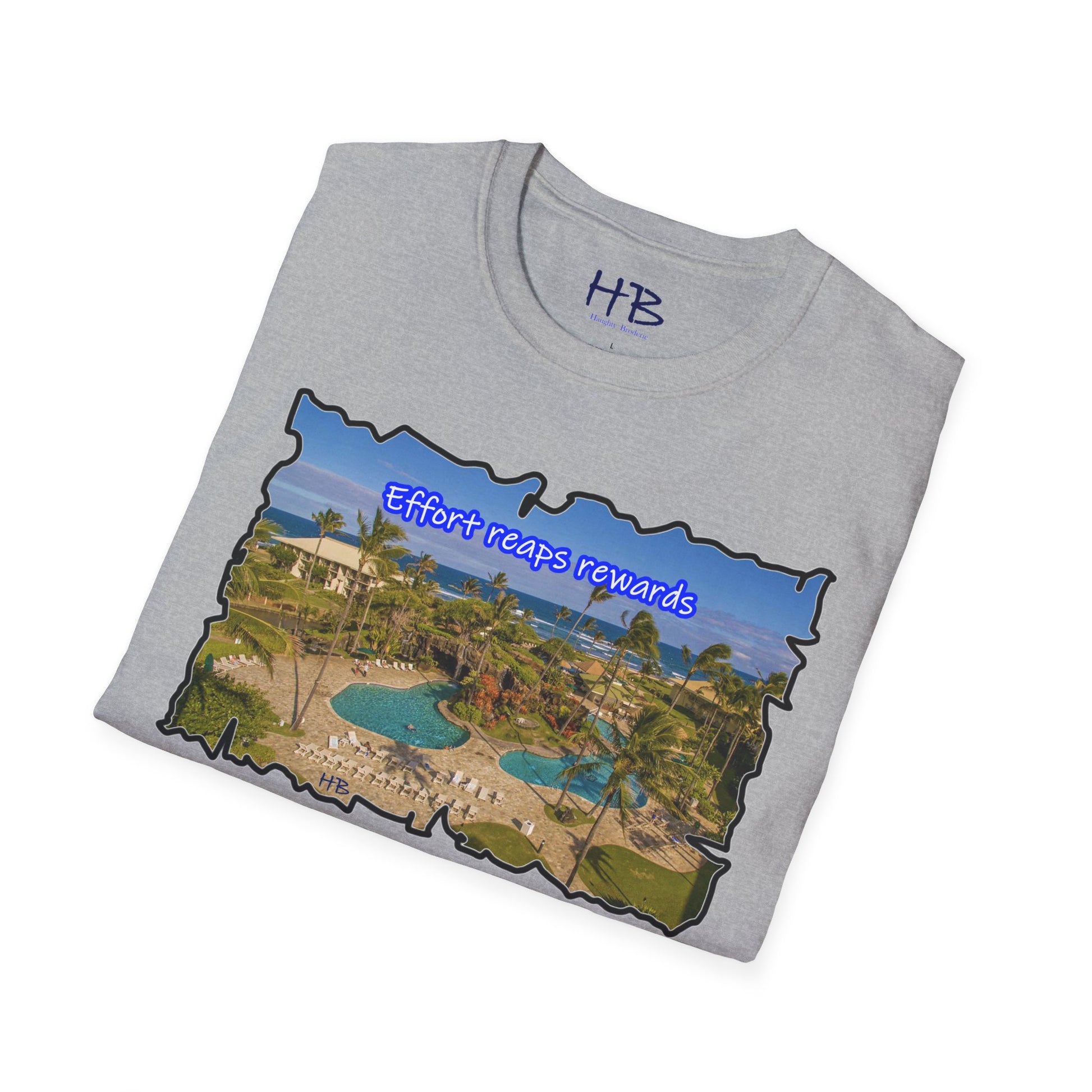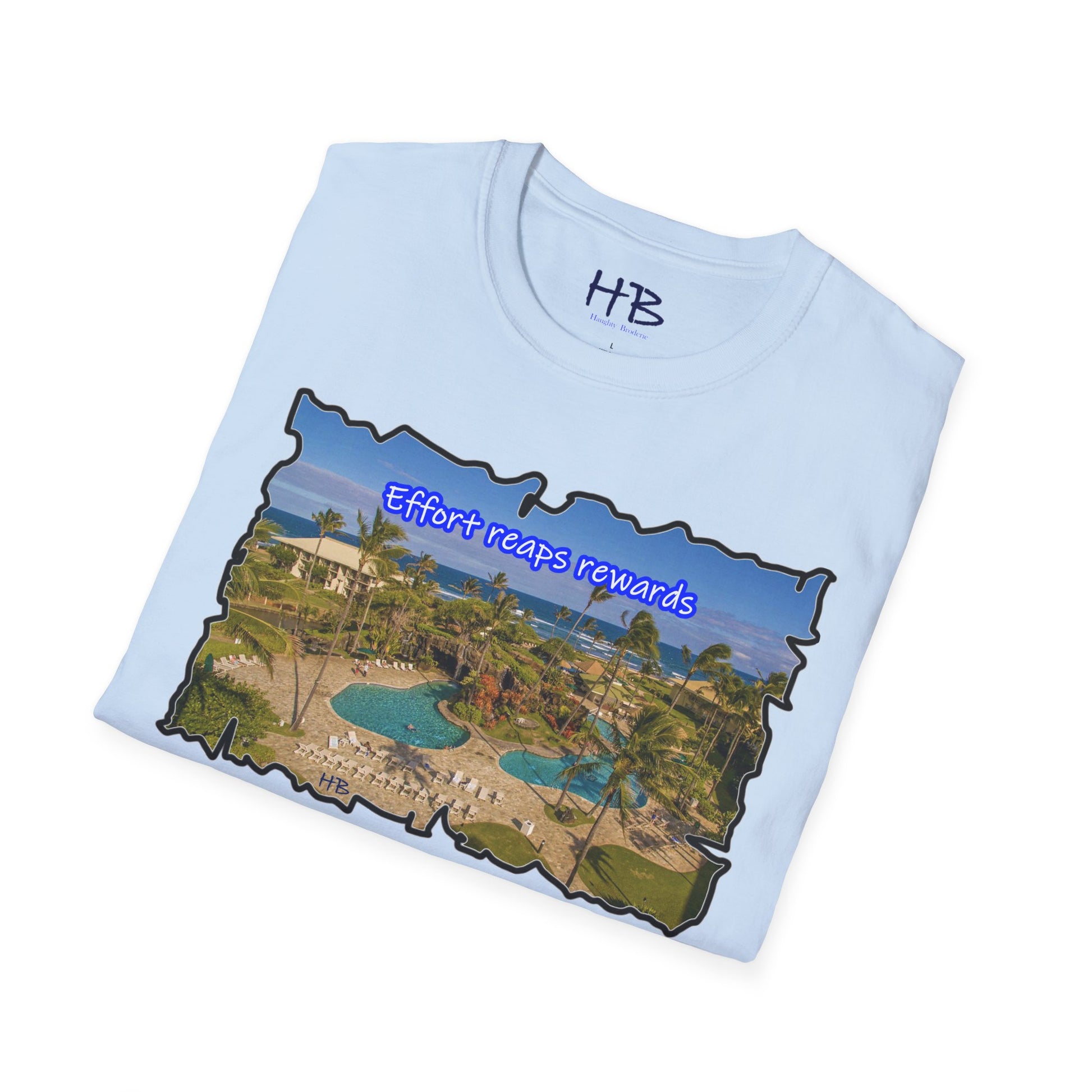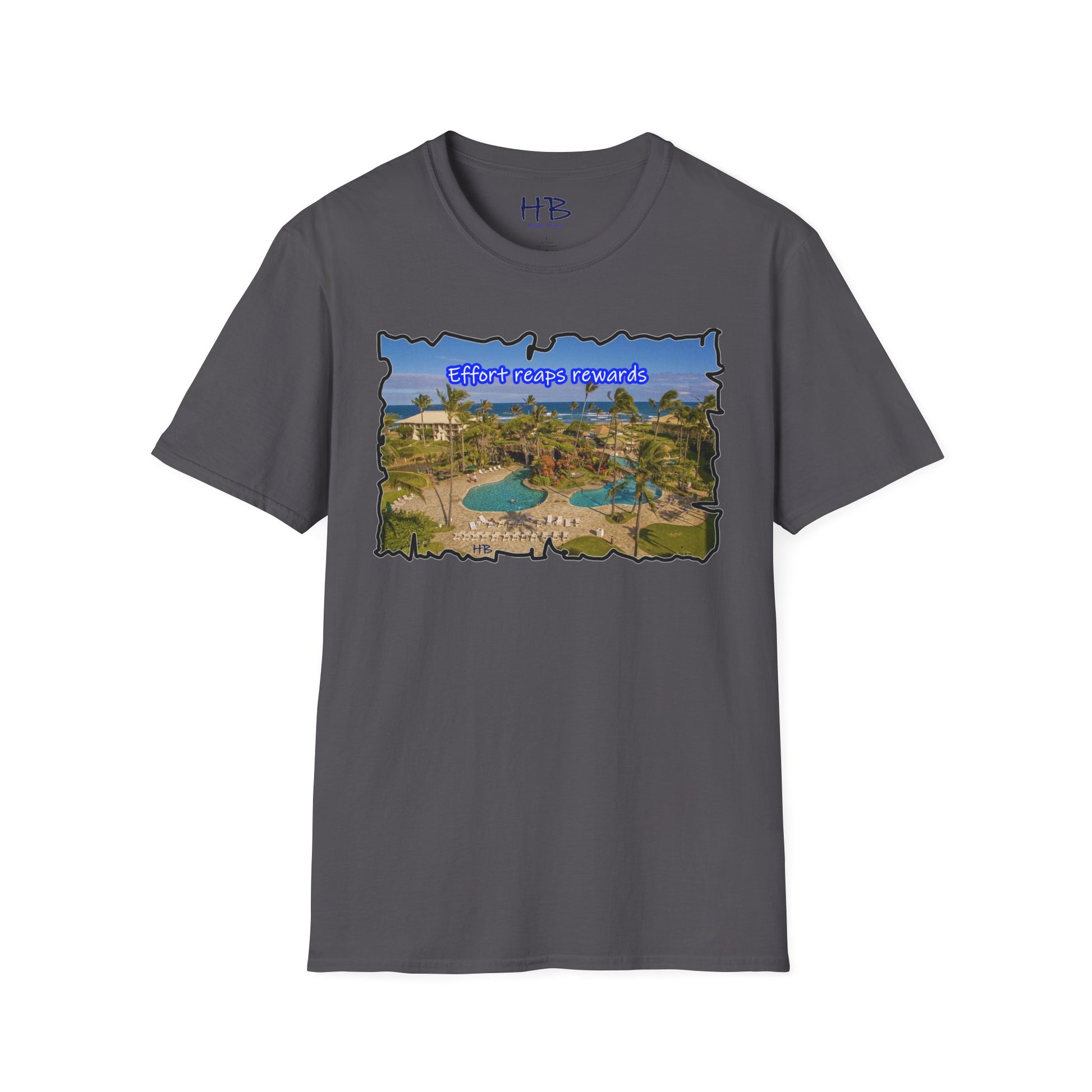 Indulge in the epitome of tranquility with our exclusive Ocean Breeze Bliss T-shirt, a wearable masterpiece that captures the allure of a highly coveted tropical haven. Picture yourself on the sun-kissed shores of a sought-after Hawaiian resort, where pristine white sands meet the gentle caress of a baby blue ocean. The waves, like whispers of motivation, rhythmically embrace the coast, creating a serene melody that echoes the sentiment: "Effort reaps rewards."