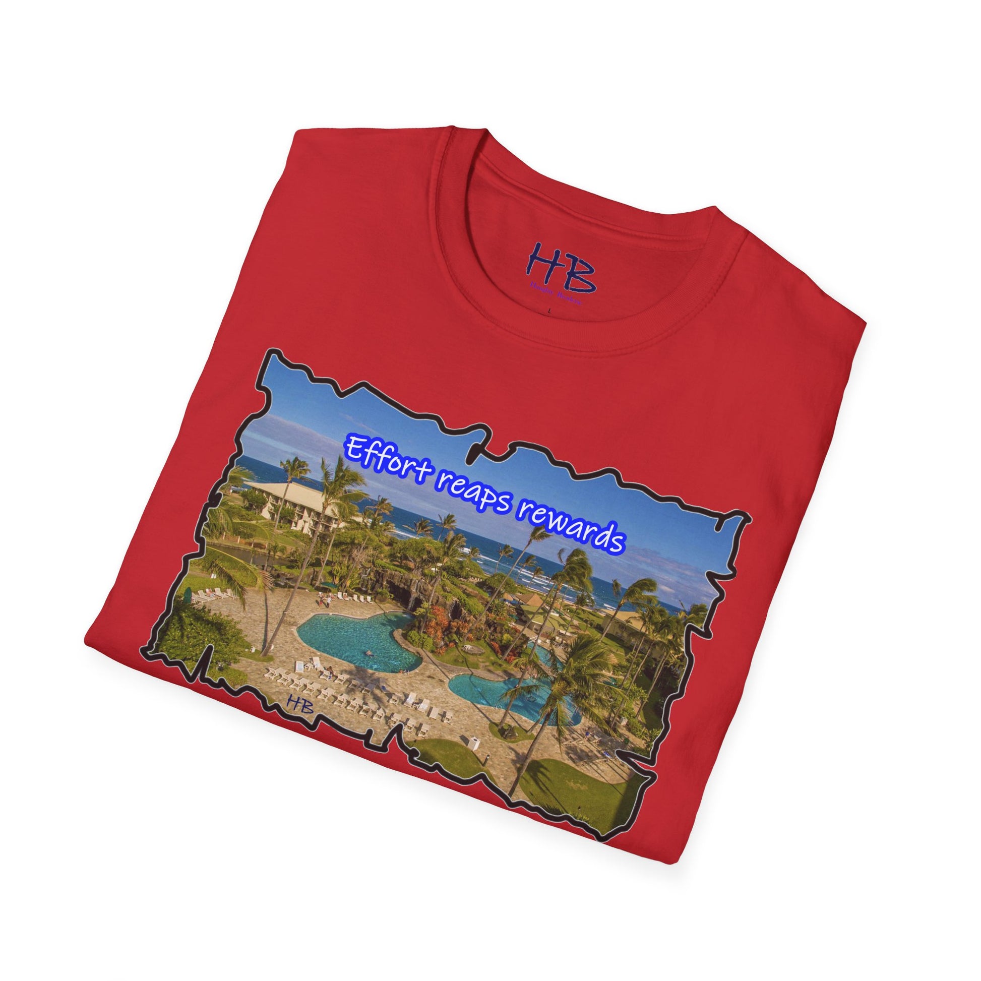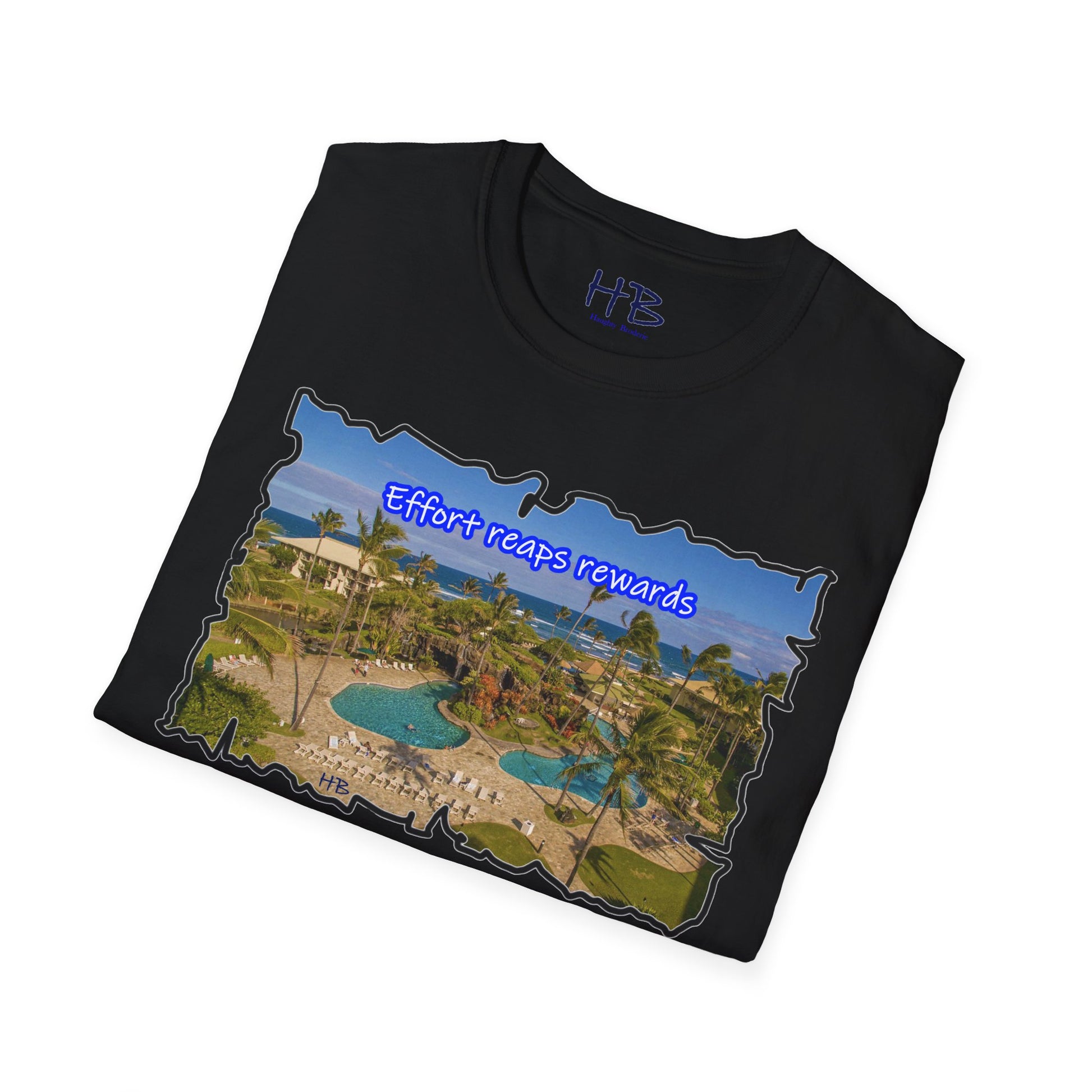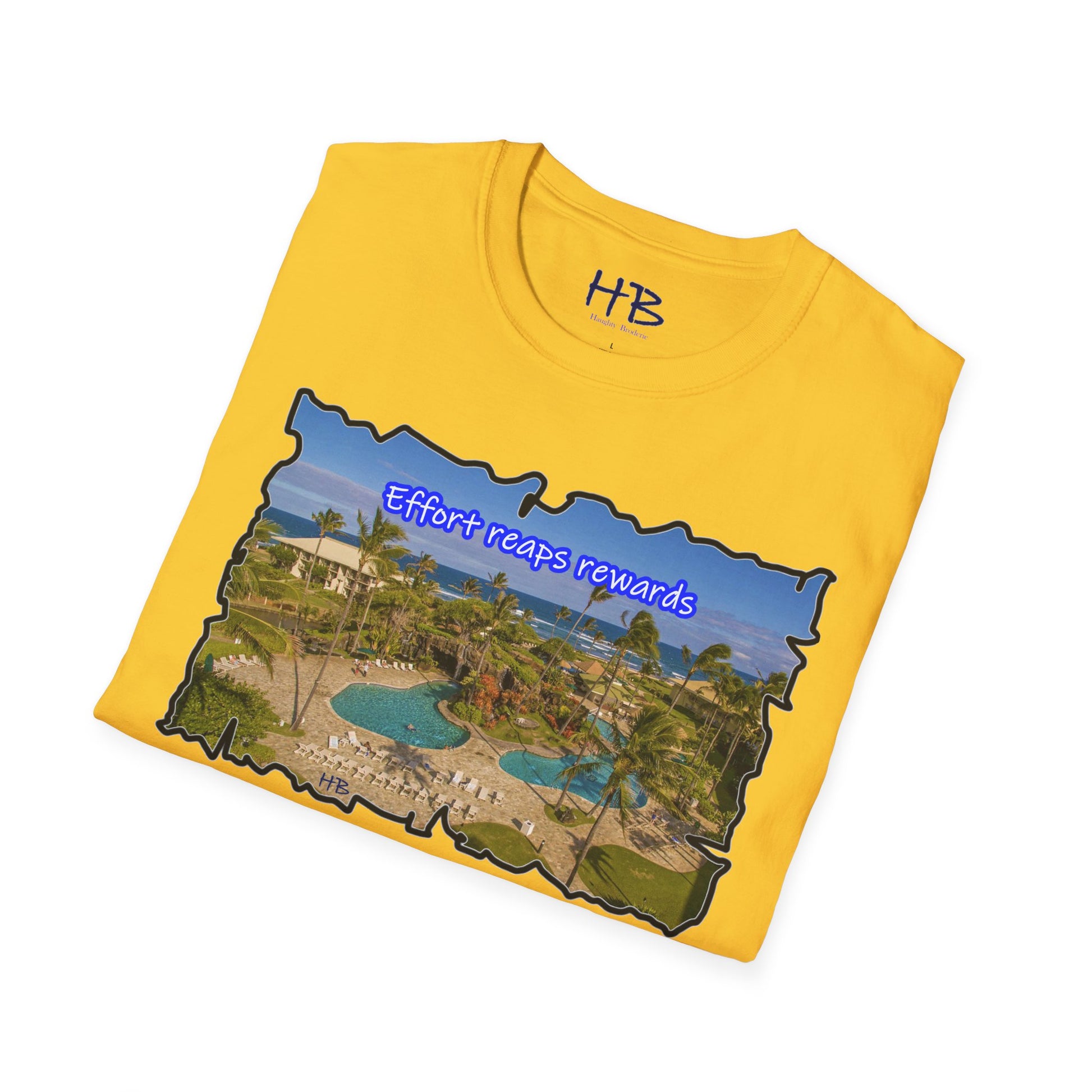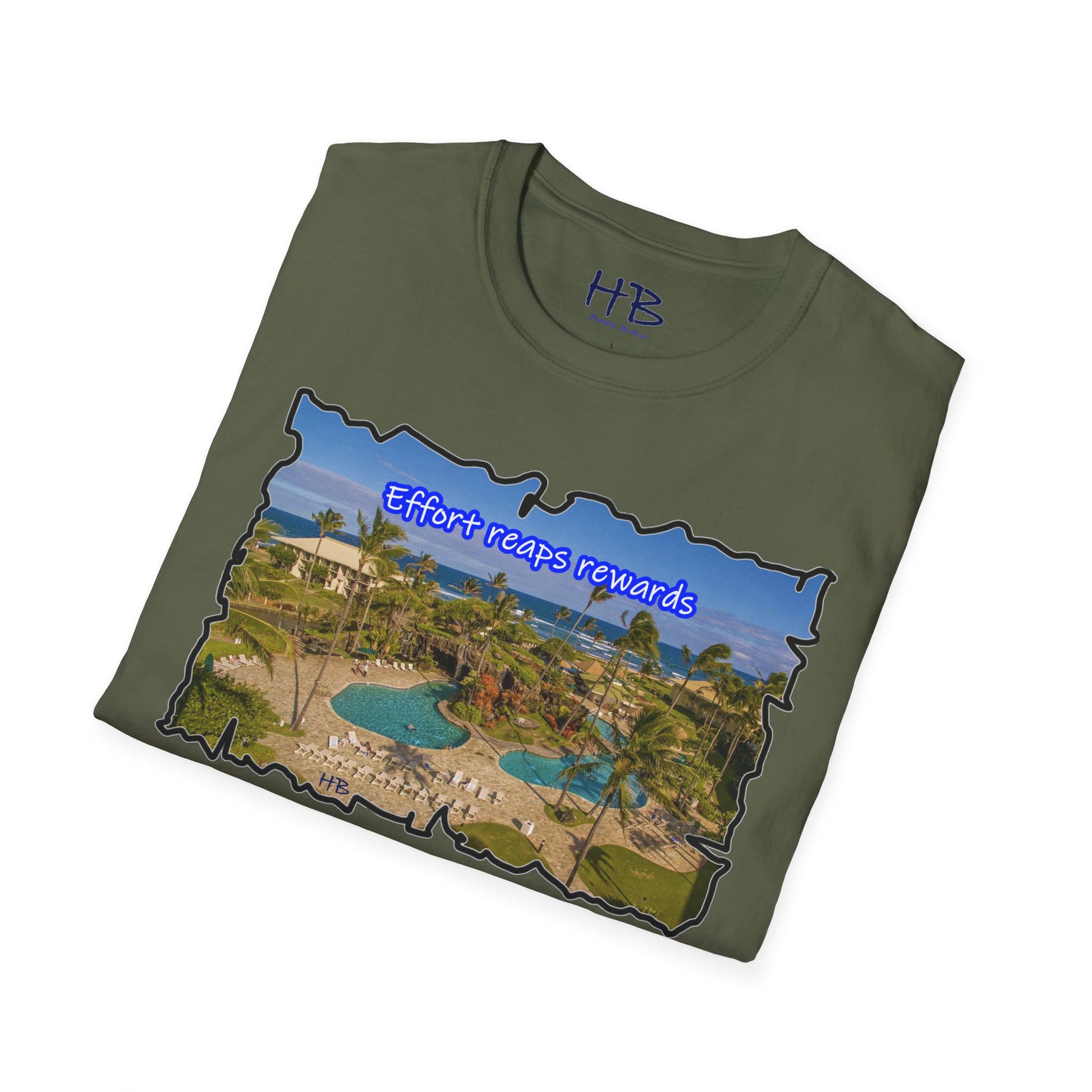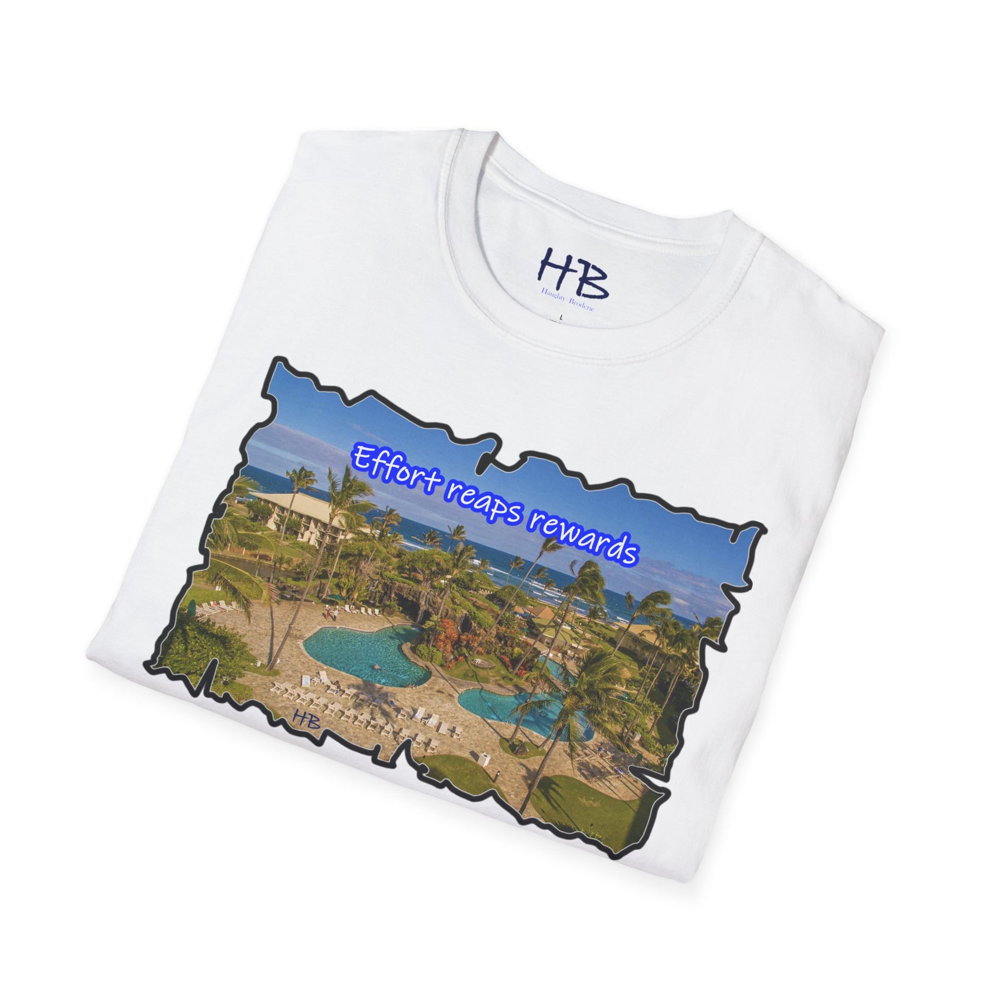 Indulge in the epitome of tranquility with our exclusive Ocean Breeze Bliss T-shirt, a wearable masterpiece that captures the allure of a highly coveted tropical haven. Picture yourself on the sun-kissed shores of a sought-after Hawaiian resort, where pristine white sands meet the gentle caress of a baby blue ocean. The waves, like whispers of motivation, rhythmically embrace the coast, creating a serene melody that echoes the sentiment: "Effort reaps rewards."