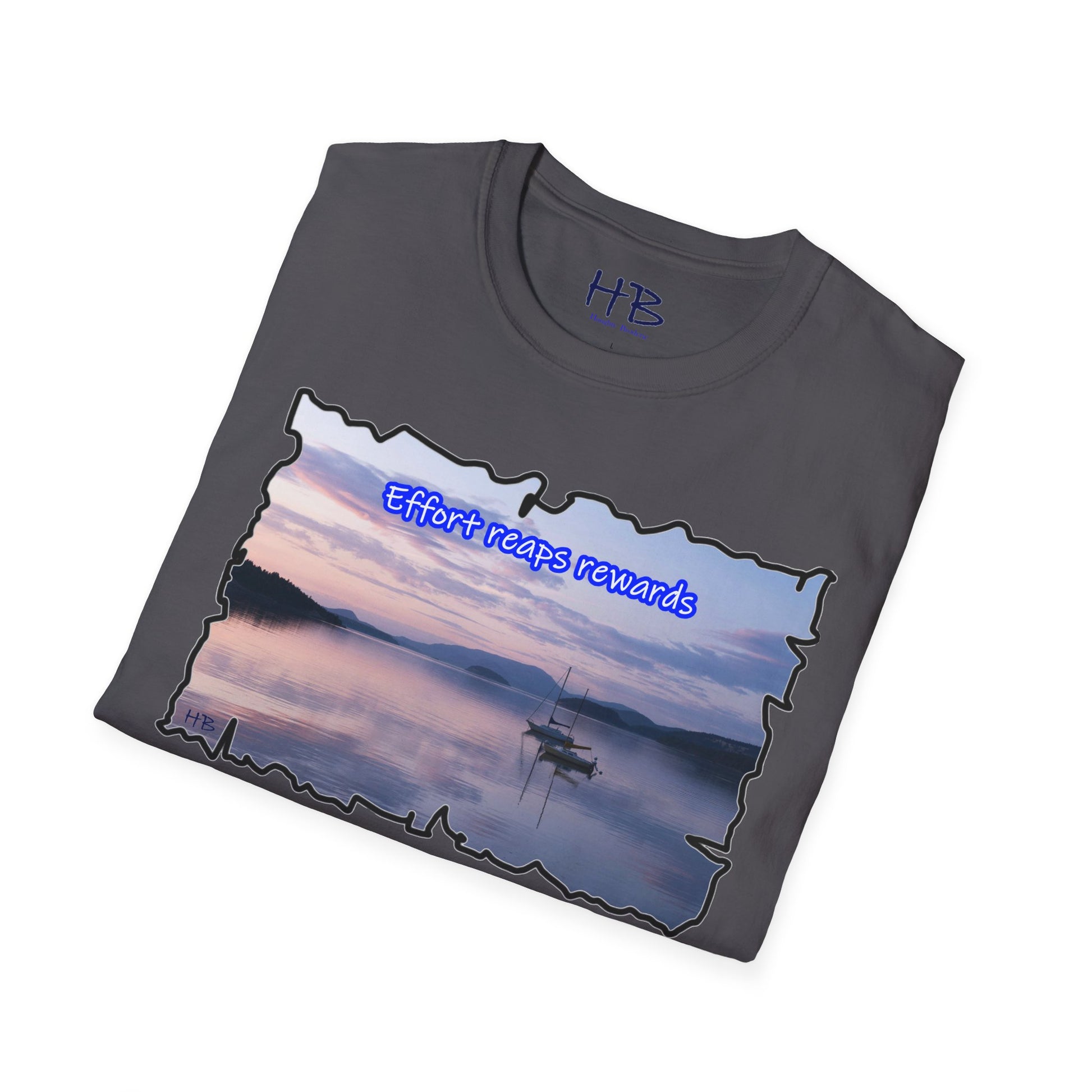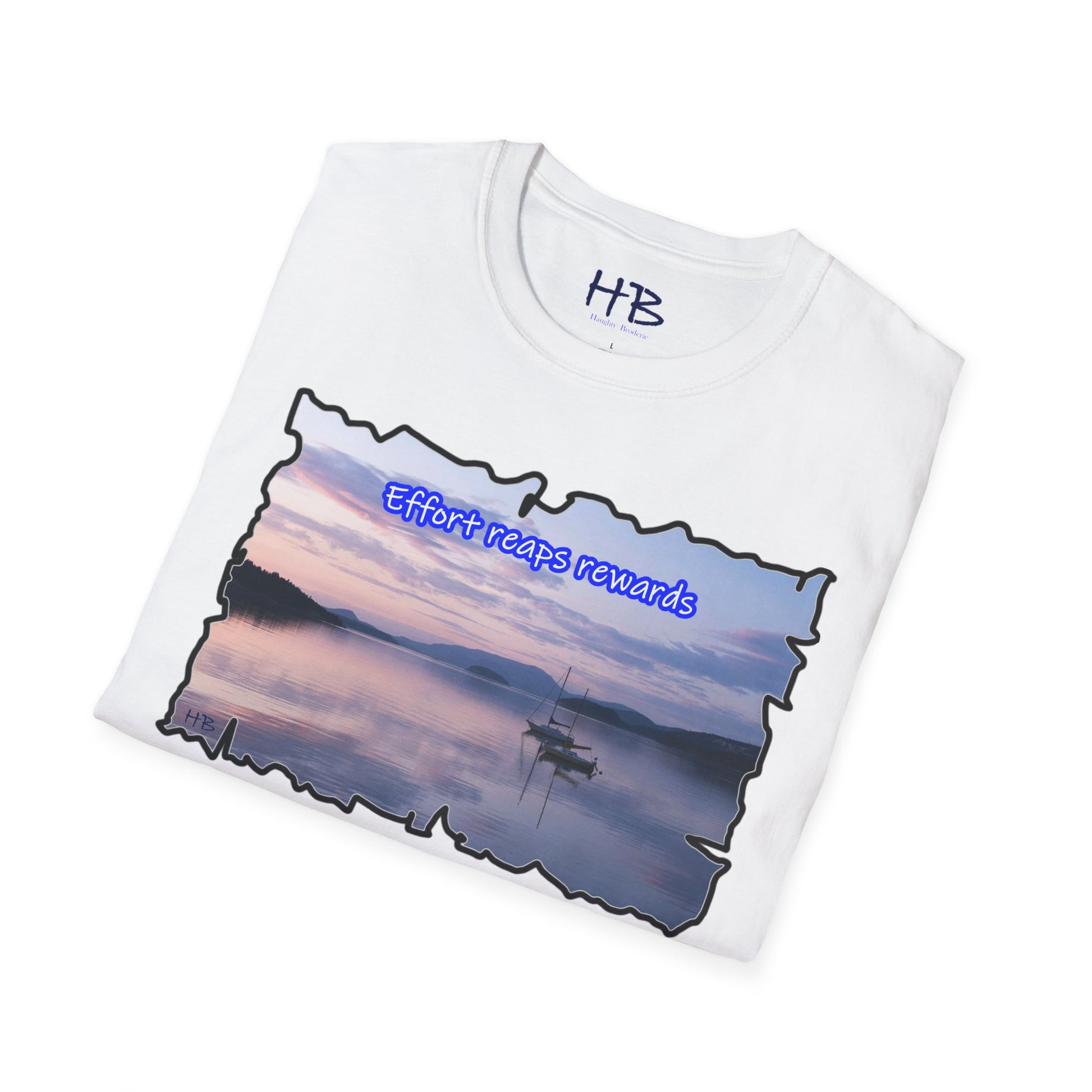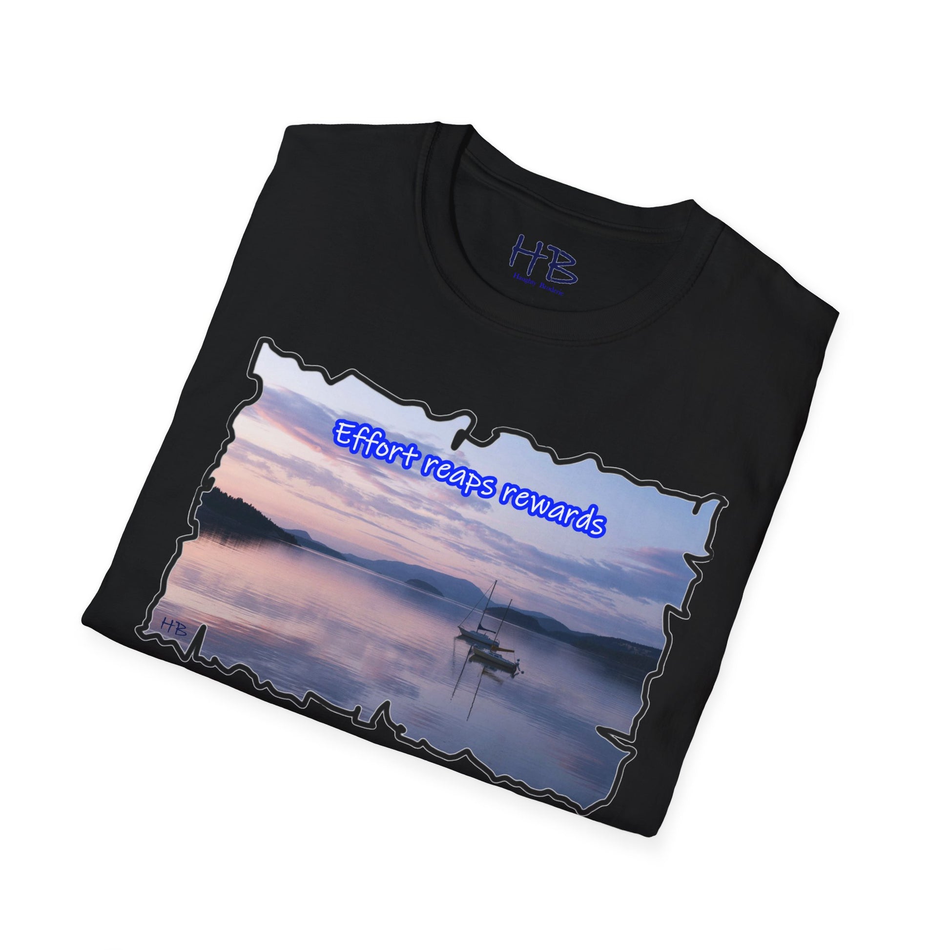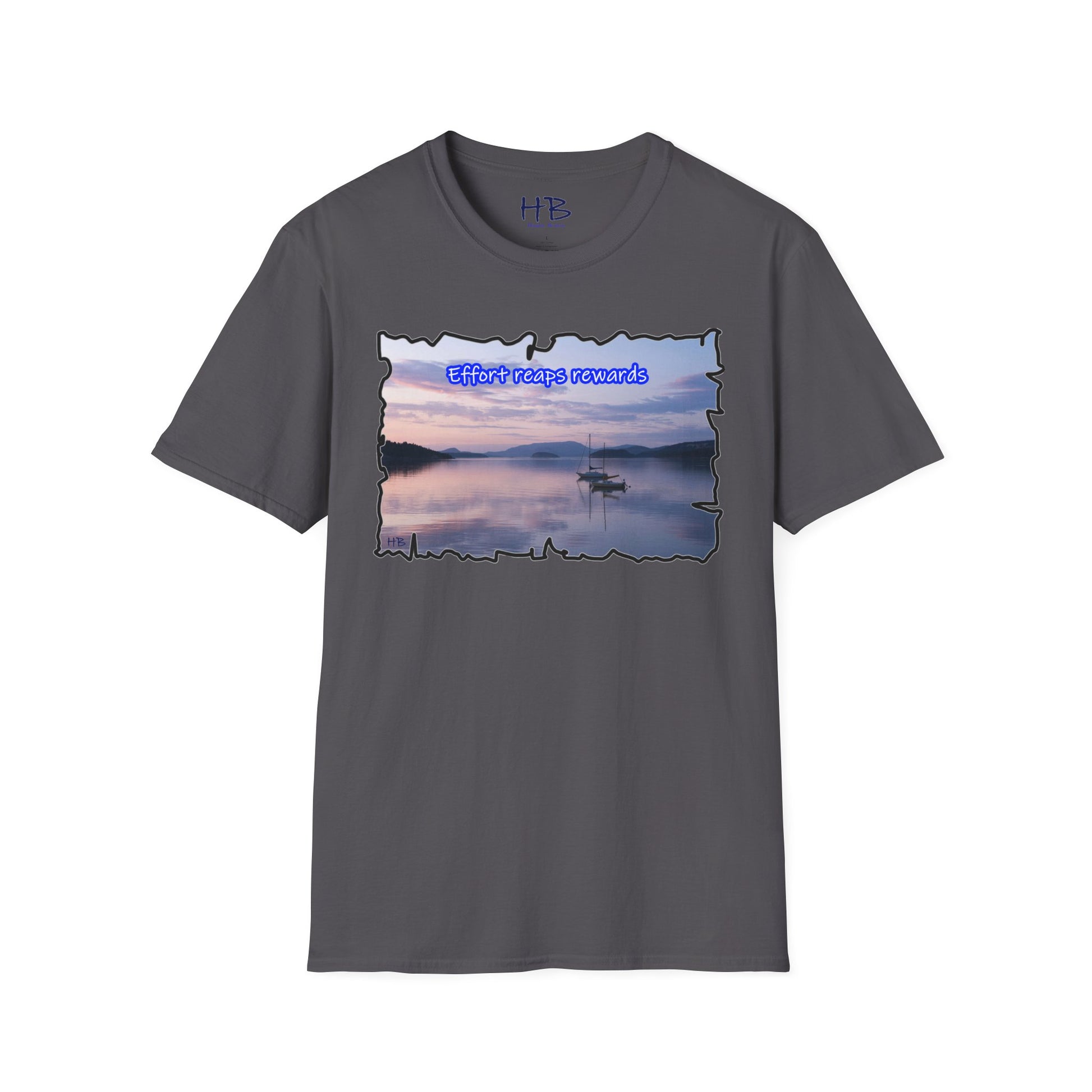 Introducing our newest creation, the epitome of aesthetic allure – a wearable masterpiece that seamlessly fuses fashion with motivation. Picture this: a highly coveted tourist destination unfolds on your chest, capturing the essence of a breathtaking lake bathed in the ethereal hues of a purple sunset. Two sailboats gracefully navigate the mirrored waters, drawing the eye toward the heart of the scene. Above, a profound mantra is inscribed in elegant typography, proclaiming, "Effort reaps rewards."