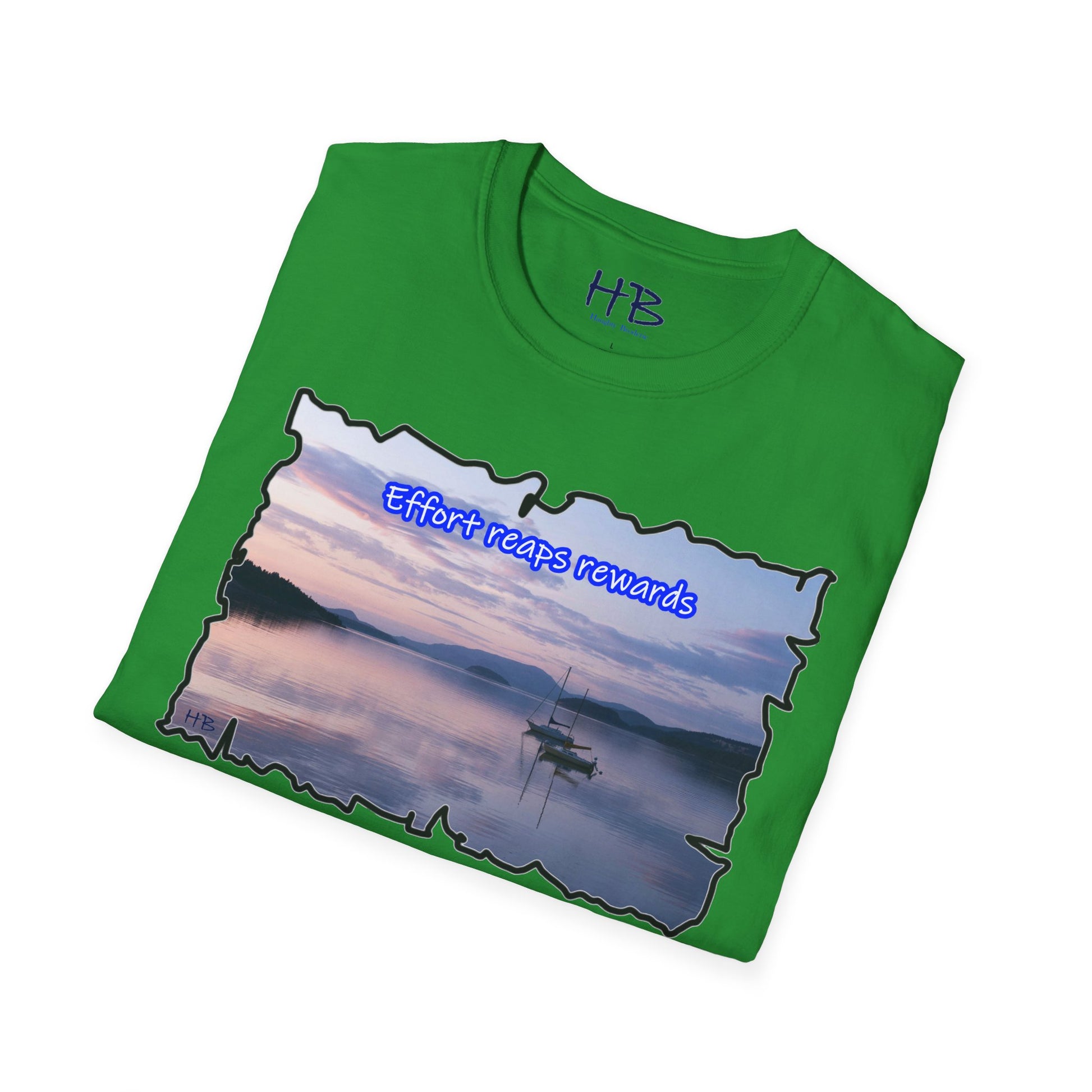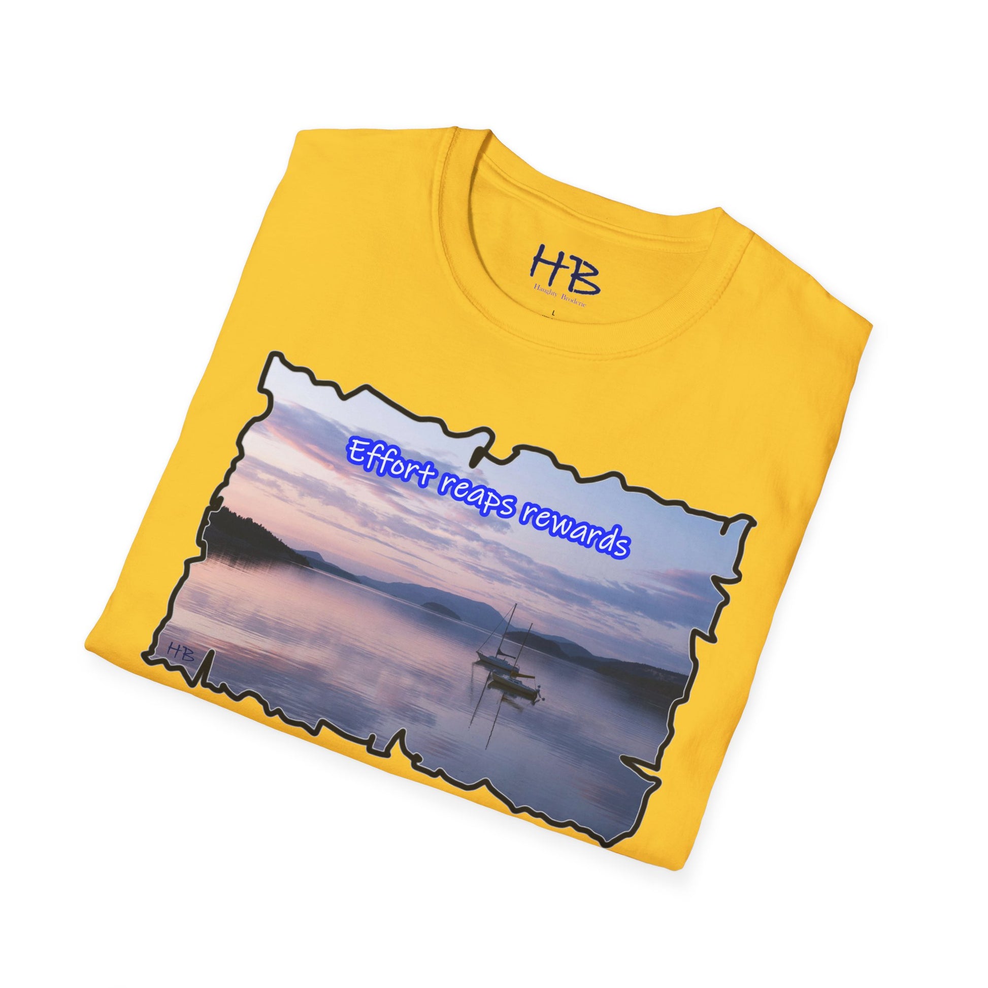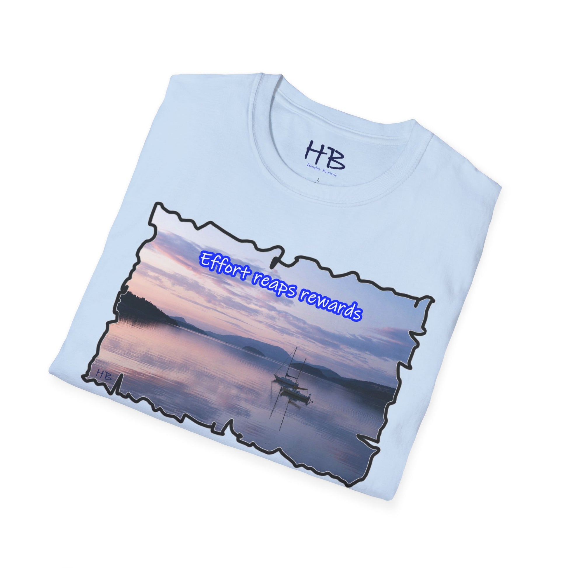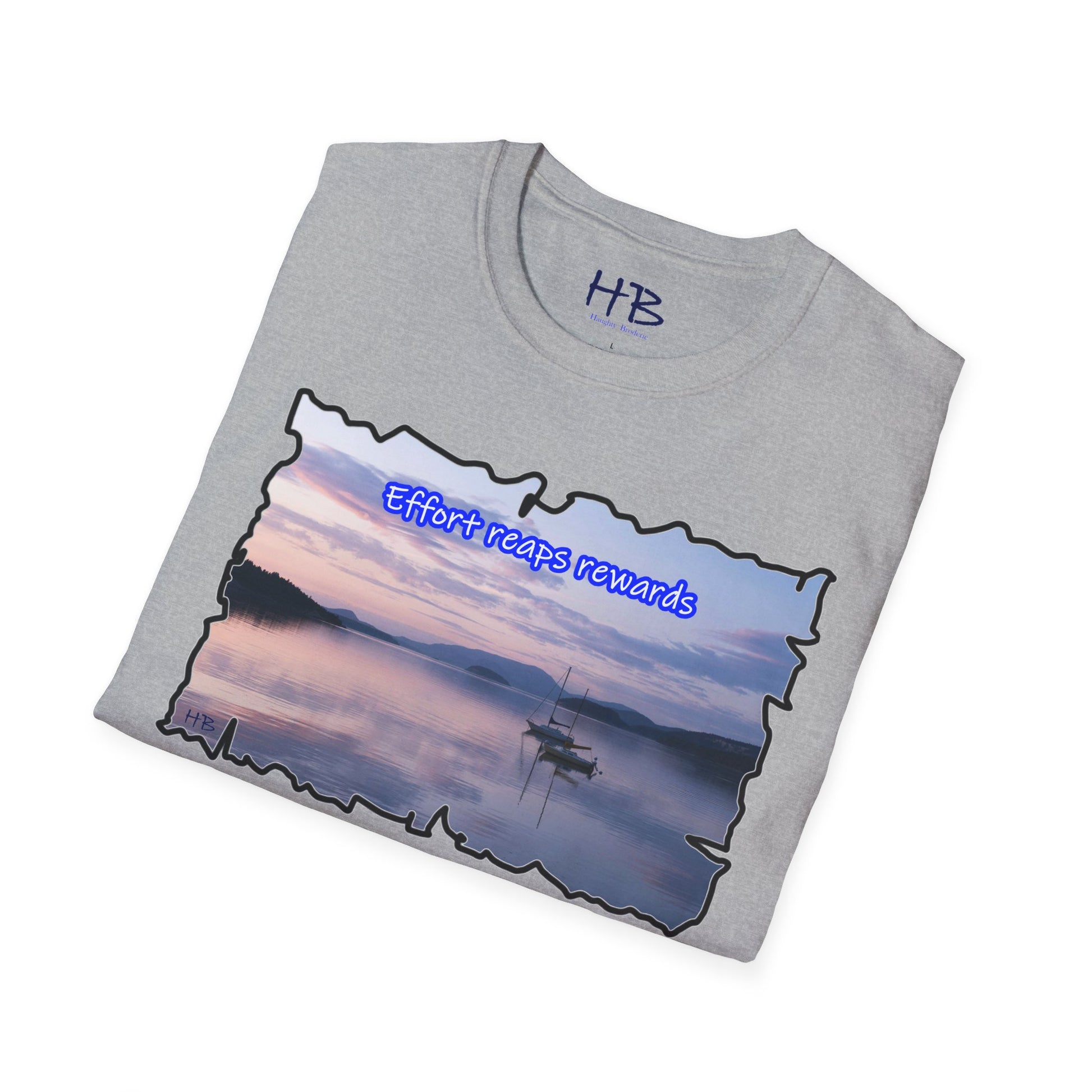 Introducing our newest creation, the epitome of aesthetic allure – a wearable masterpiece that seamlessly fuses fashion with motivation. Picture this: a highly coveted tourist destination unfolds on your chest, capturing the essence of a breathtaking lake bathed in the ethereal hues of a purple sunset. Two sailboats gracefully navigate the mirrored waters, drawing the eye toward the heart of the scene. Above, a profound mantra is inscribed in elegant typography, proclaiming, "Effort reaps rewards."