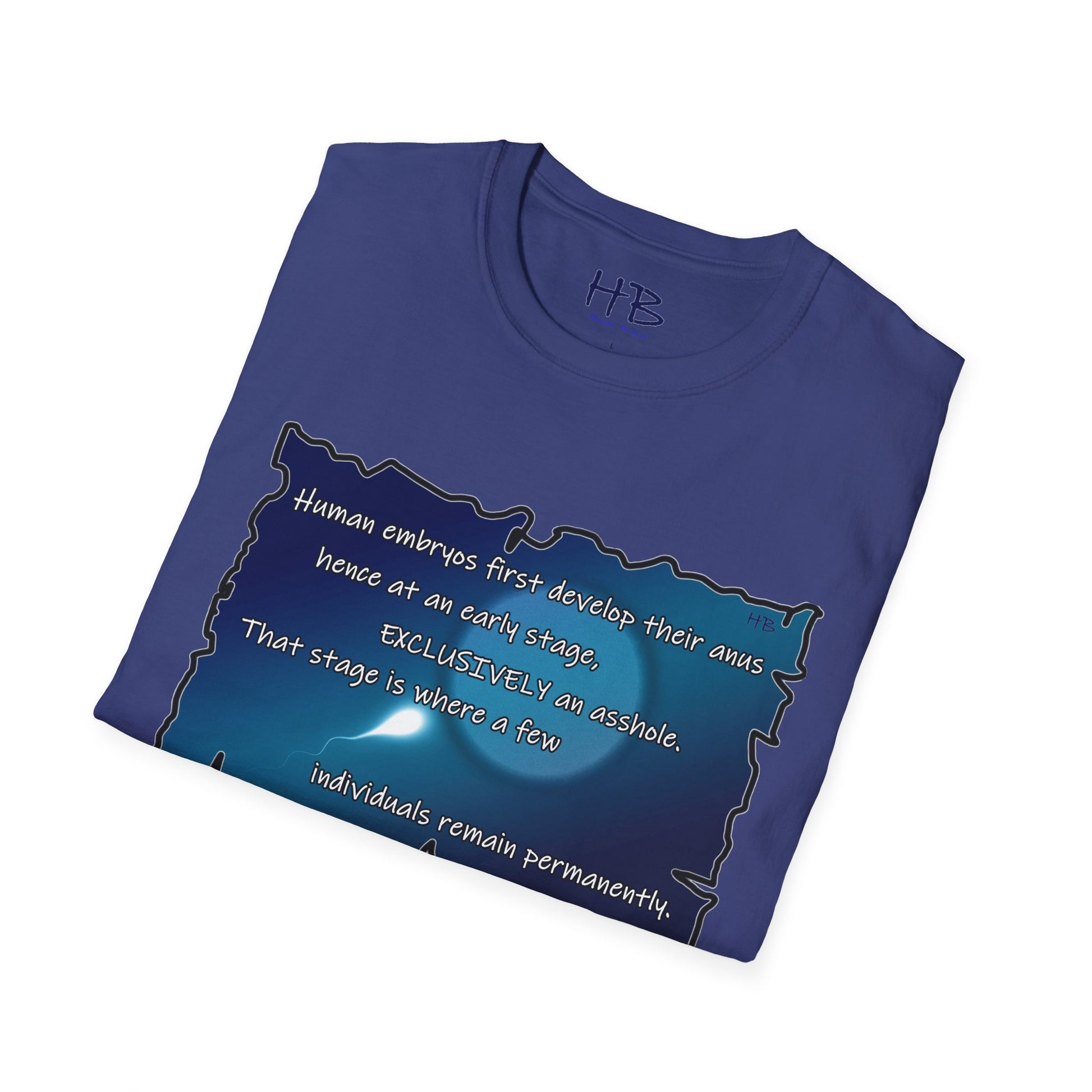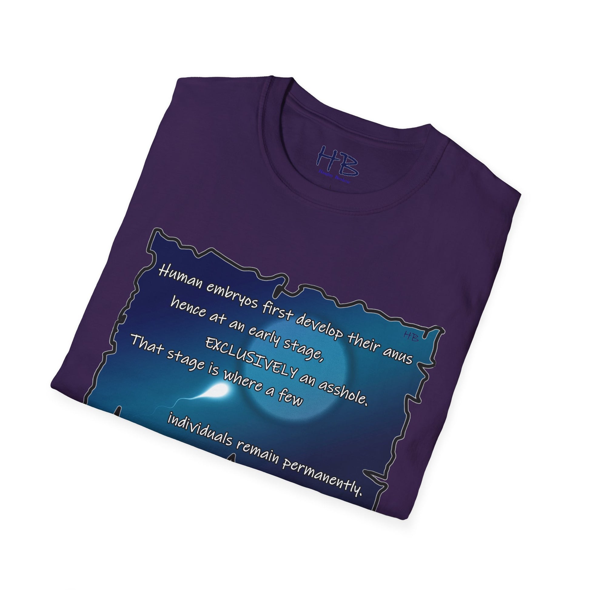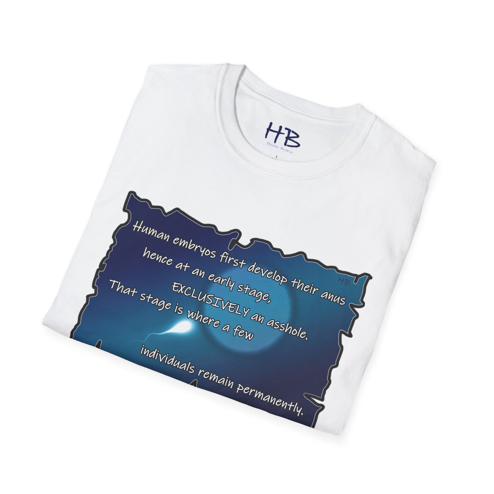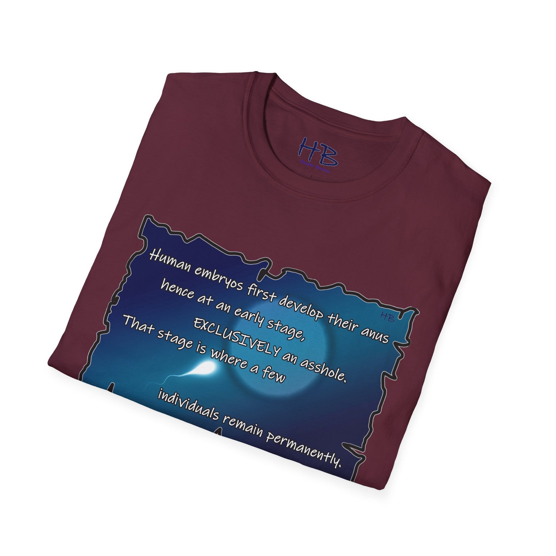 Introducing our exclusive and unique garment featuring an image of a significant moment in human development, captured in a thought-provoking design that's bound to spark conversation. This tee shirt showcases a powerful visual of a sperm cell penetrating an egg, with accompanying text that reads: "Human embryos first develop their anus, hence at an early stage, exclusively an asshole. That stage is where a few individuals remain permanently."