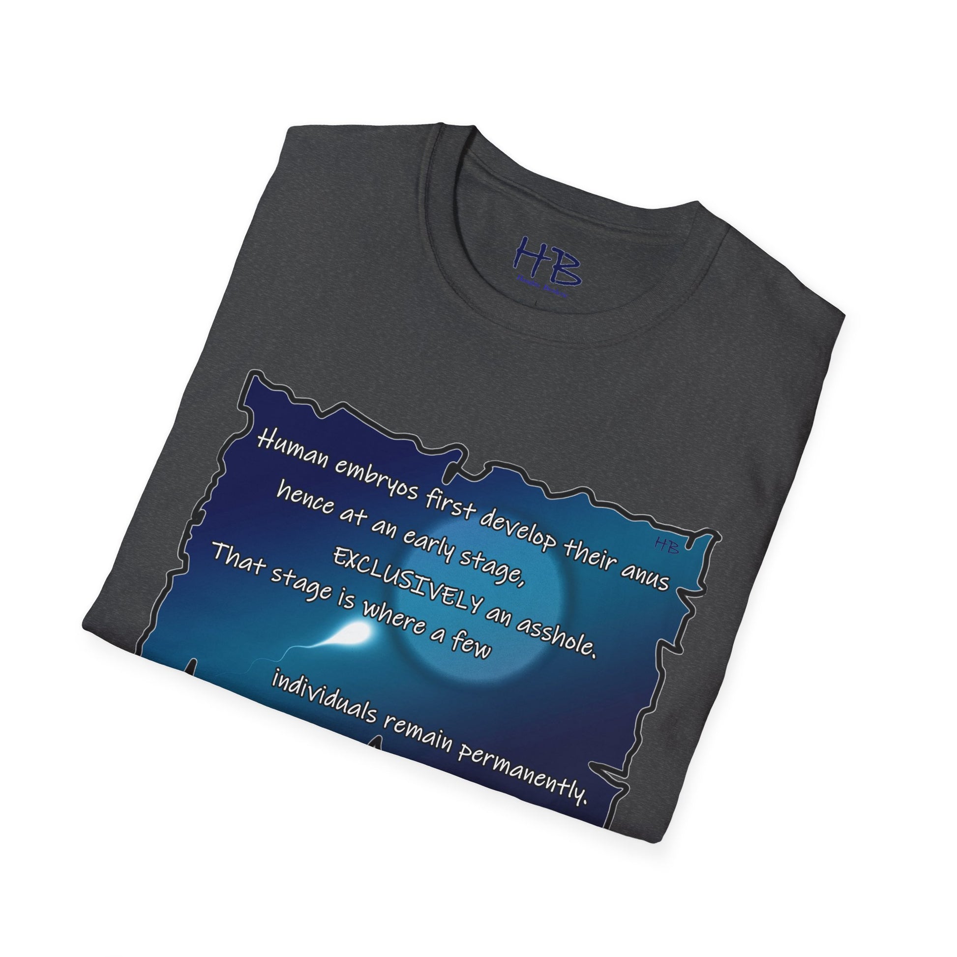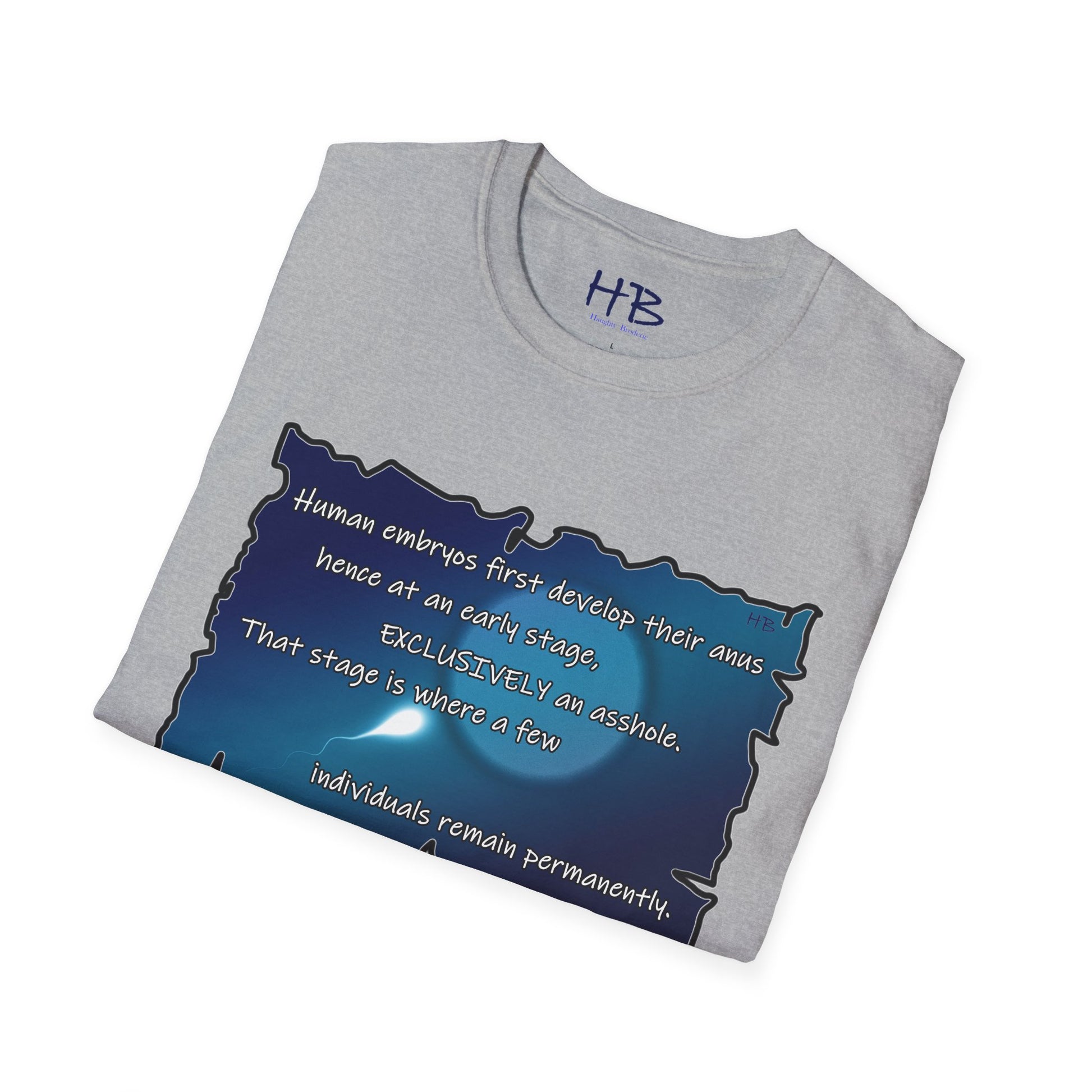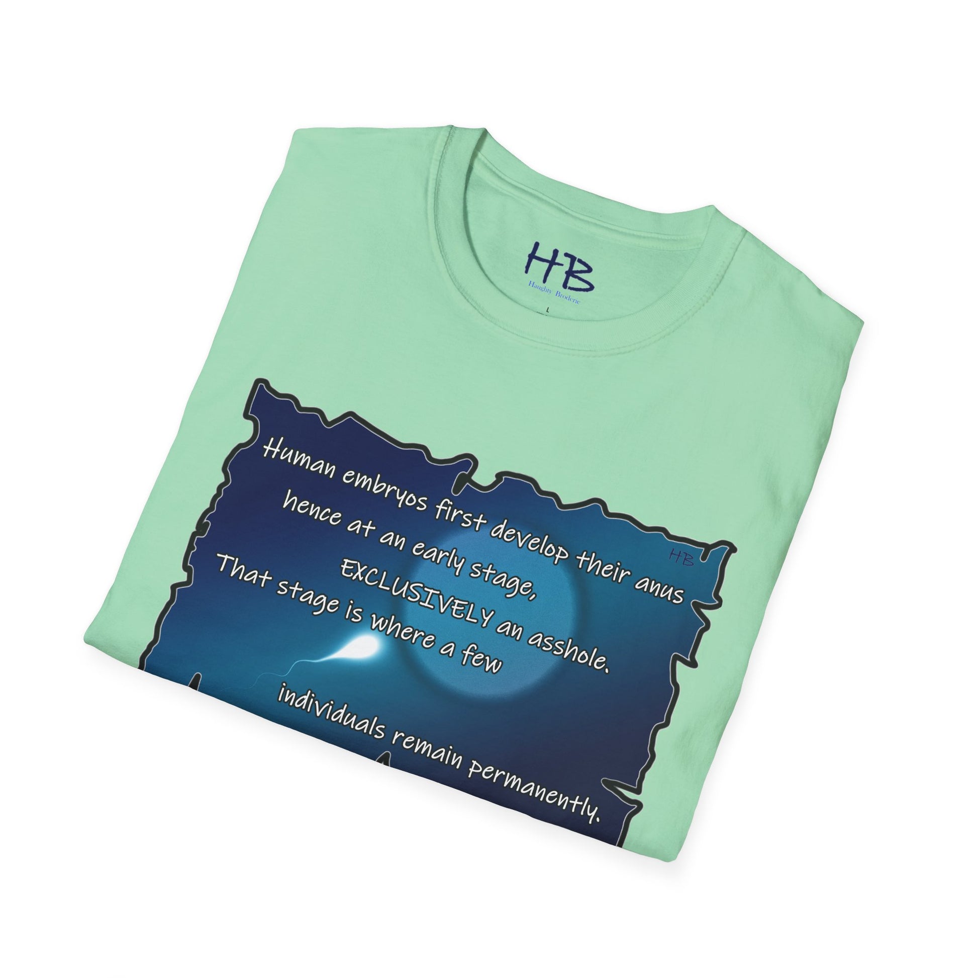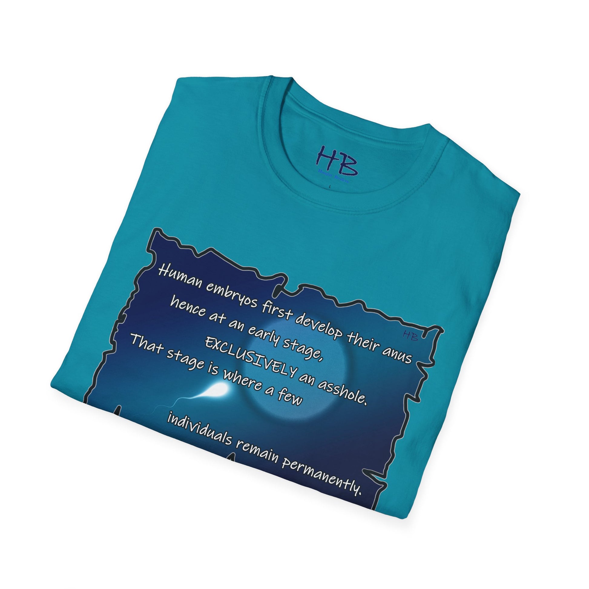 Introducing our exclusive and unique garment featuring an image of a significant moment in human development, captured in a thought-provoking design that's bound to spark conversation. This tee shirt showcases a powerful visual of a sperm cell penetrating an egg, with accompanying text that reads: "Human embryos first develop their anus, hence at an early stage, exclusively an asshole. That stage is where a few individuals remain permanently."