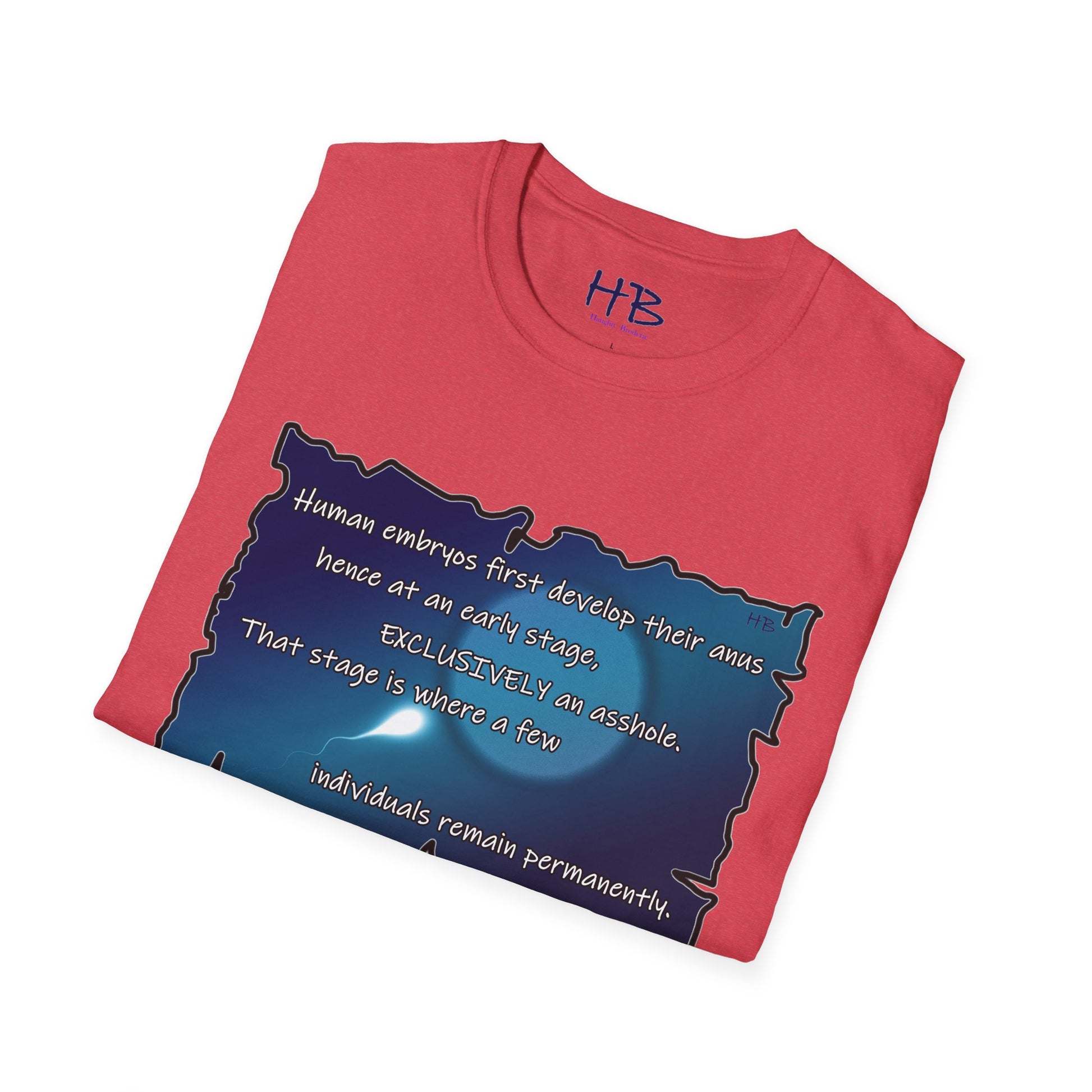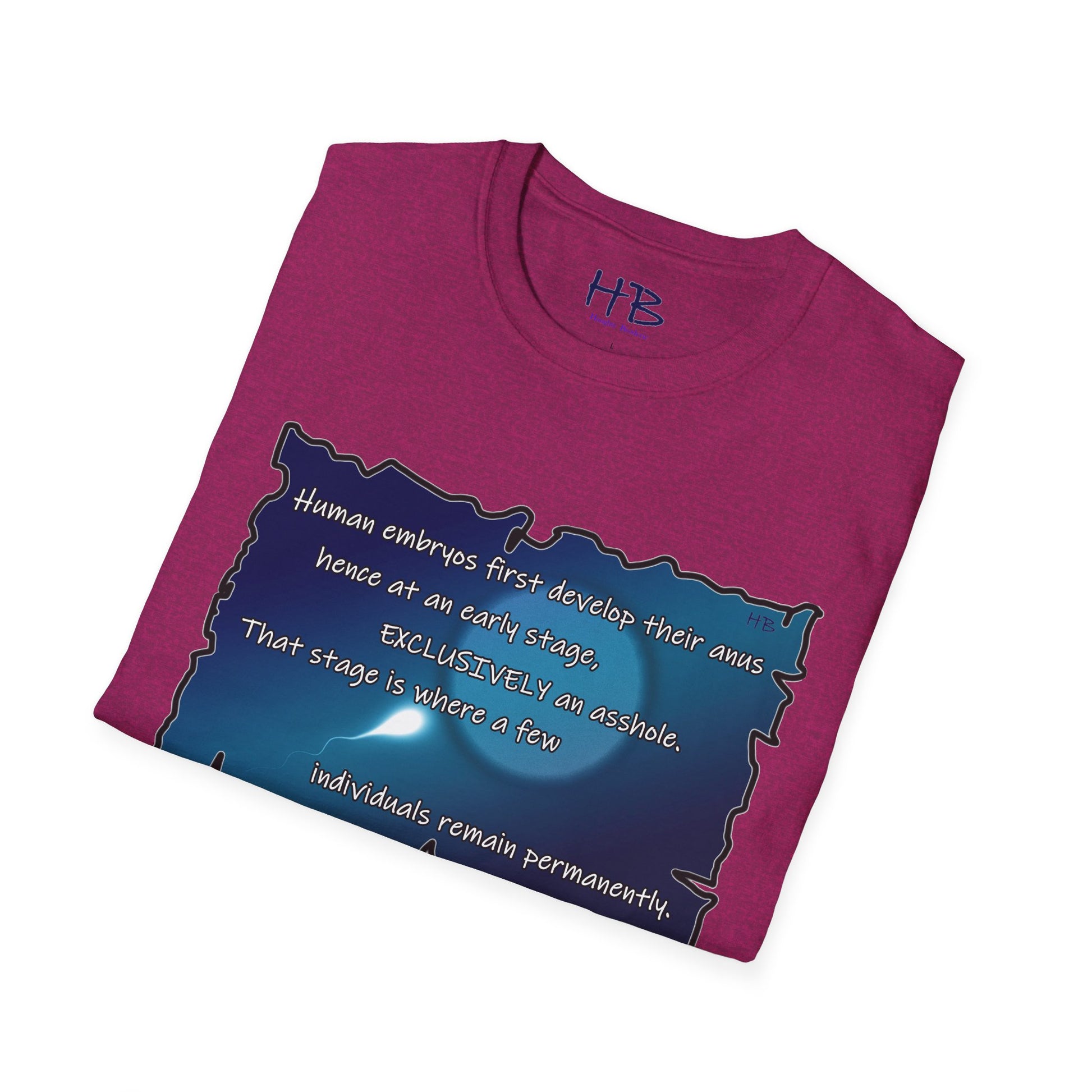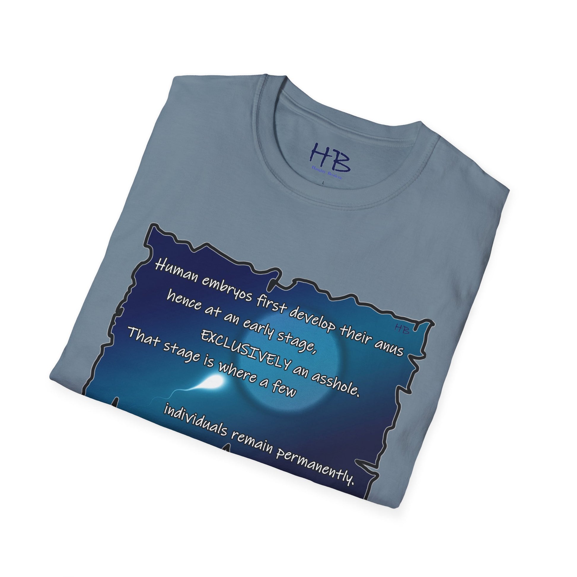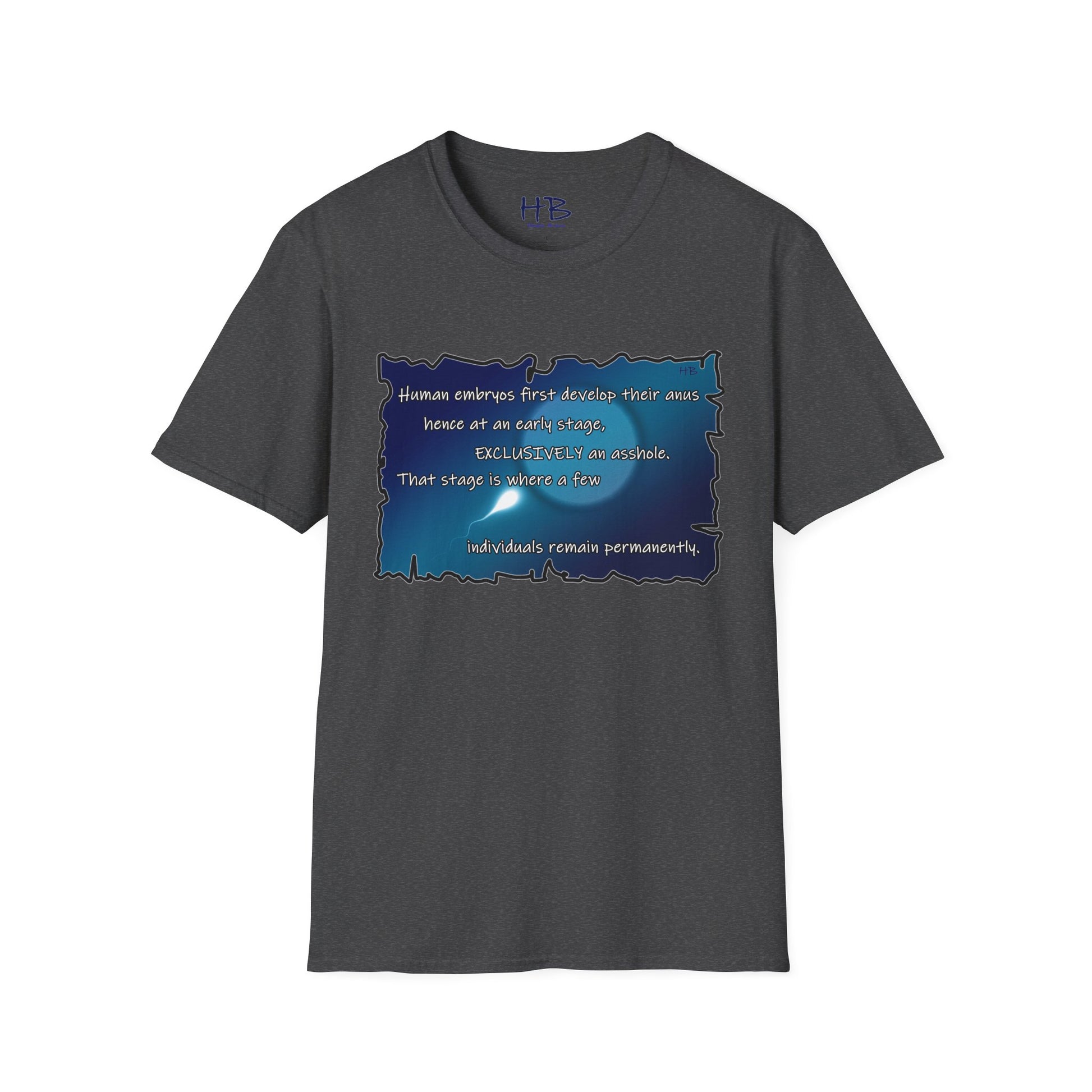 Introducing our exclusive and unique garment featuring an image of a significant moment in human development, captured in a thought-provoking design that's bound to spark conversation. This tee shirt showcases a powerful visual of a sperm cell penetrating an egg, with accompanying text that reads: "Human embryos first develop their anus, hence at an early stage, exclusively an asshole. That stage is where a few individuals remain permanently."