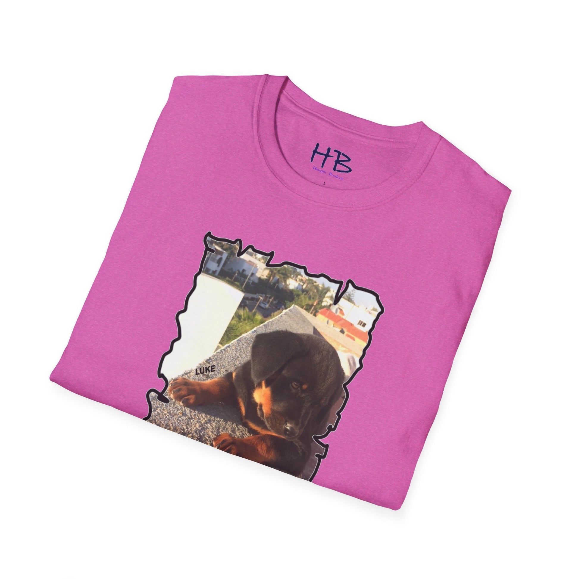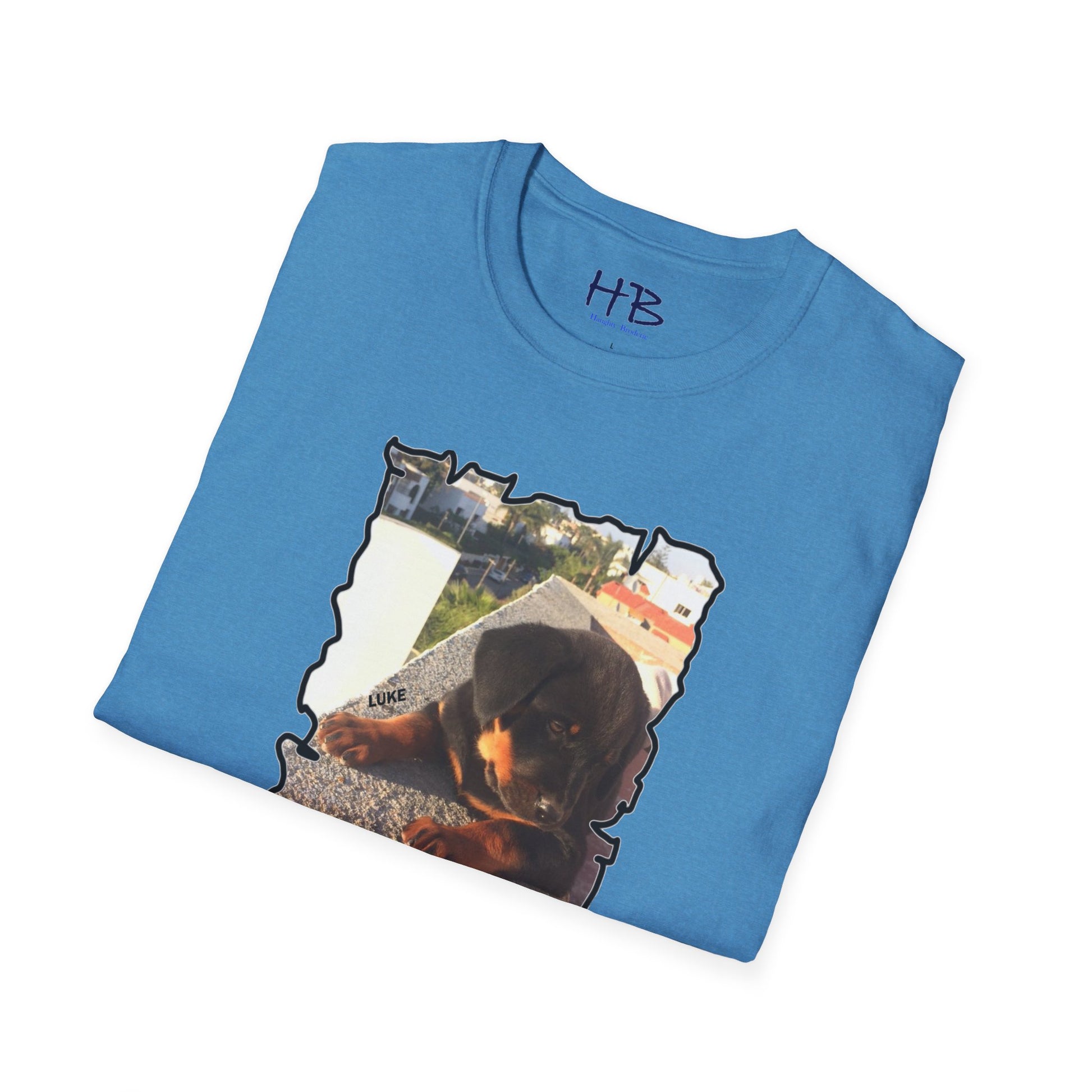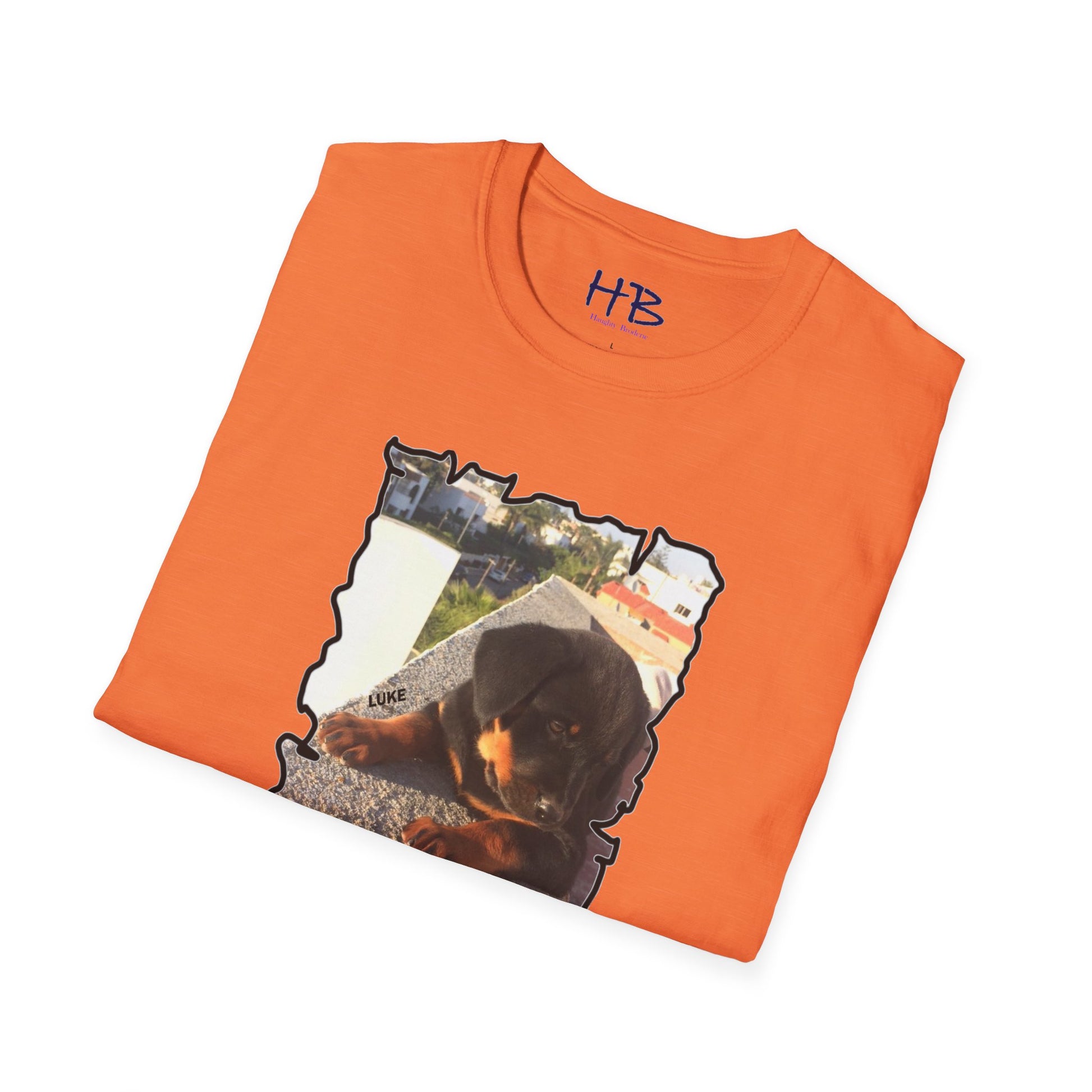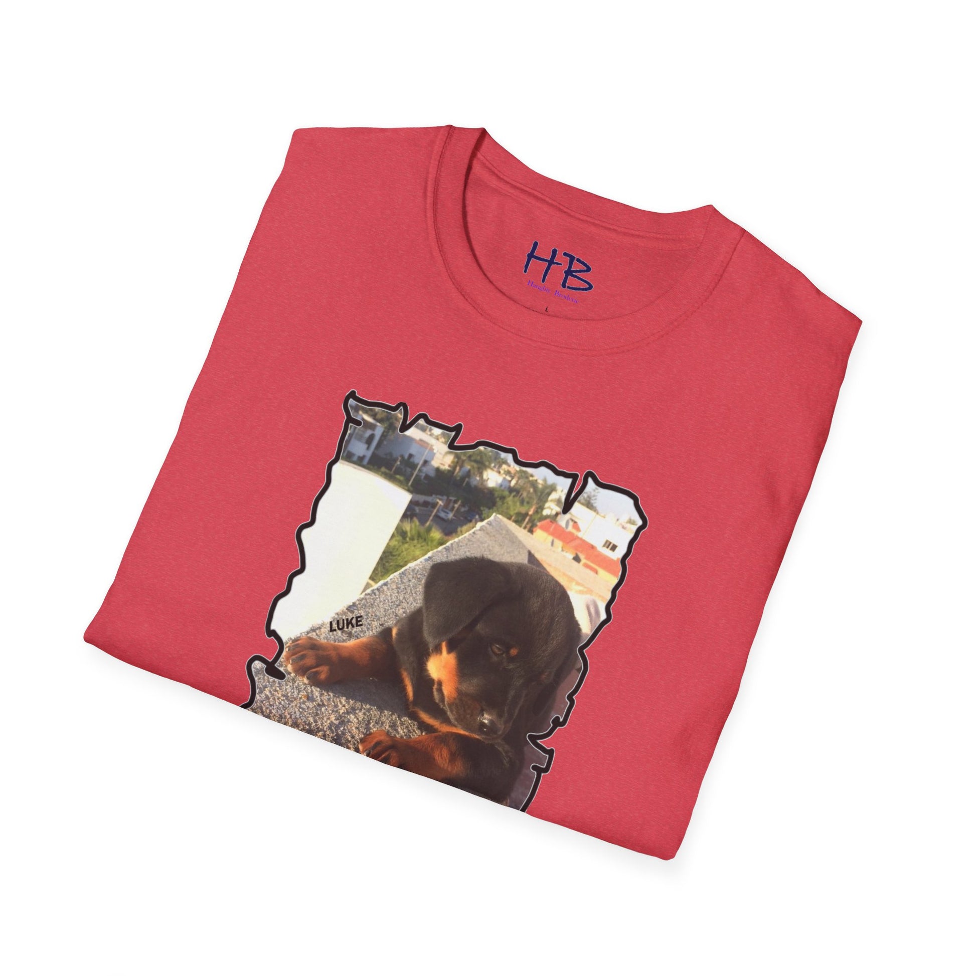 Introducing our exclusive tee shirt featuring the captivating image of Baby Rothweiller Luke, perched on a rooftop, diligently watching over the neighborhood. This extraordinary design showcases the adorable black Rothweiller with distinctive brown markings, depicting its purebred pedigree.