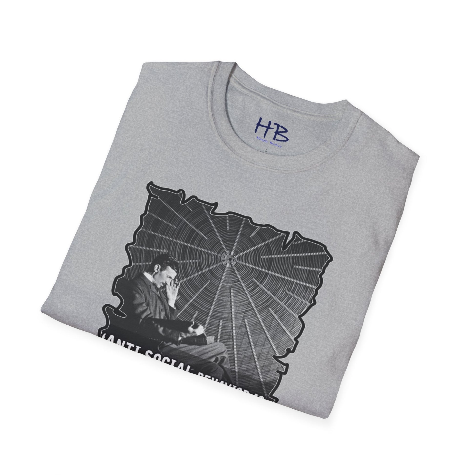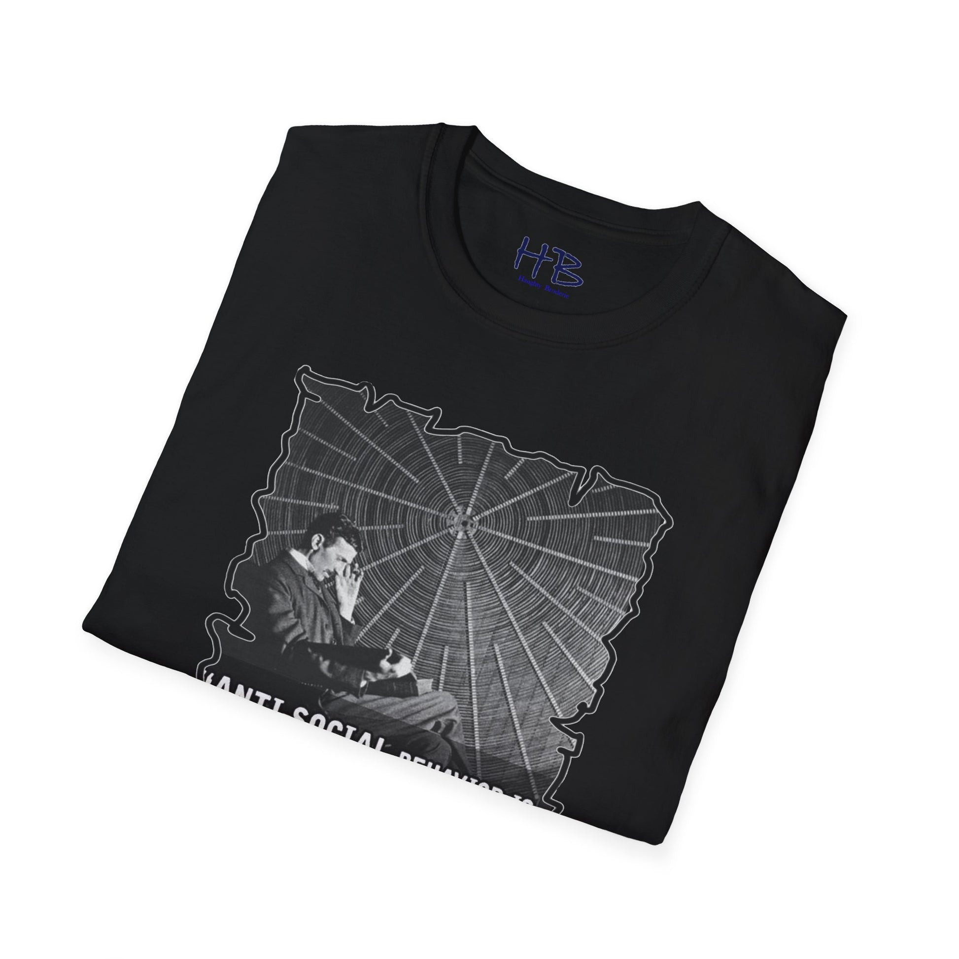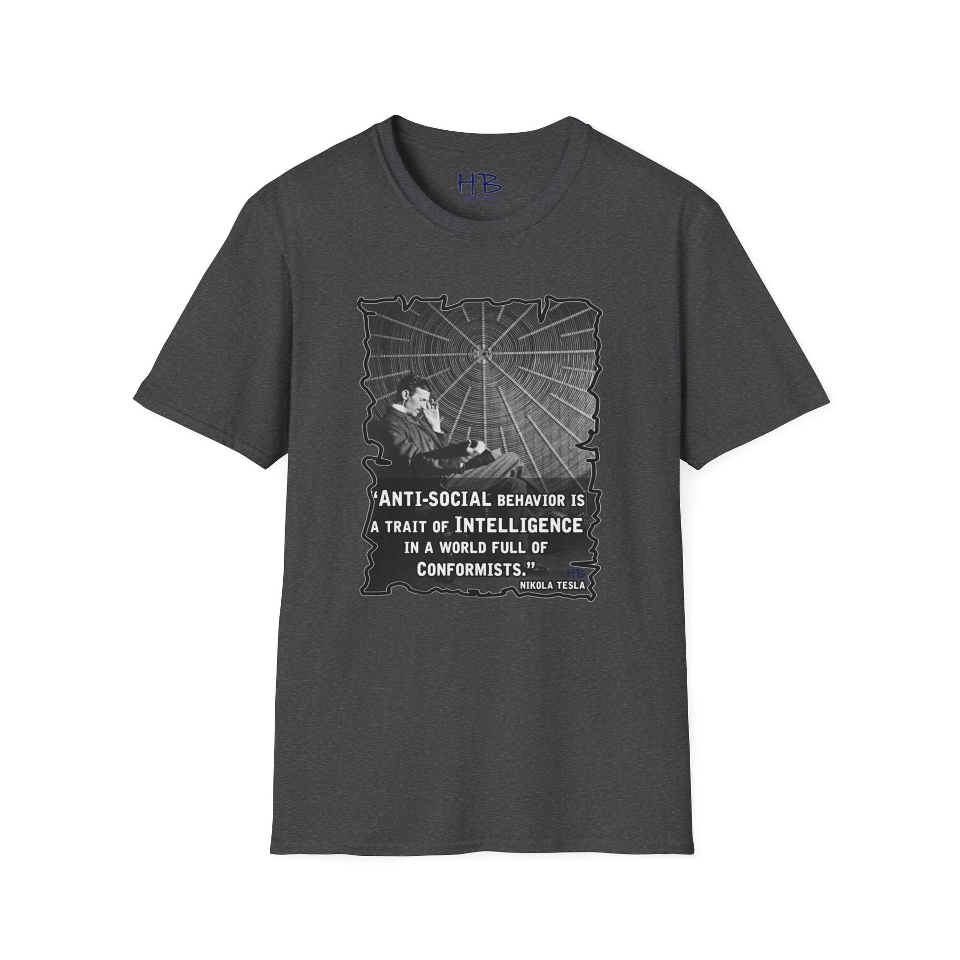 Step into the realm of intellectual rebellion with our captivating tee shirt featuring the legendary Nikola Tesla. Picture this: Tesla, the genius inventor, seated in deep contemplation, engrossed in a book while adorned with his iconic quote, "Anti-social behavior is a trait of intelligence in a world full of conformists."