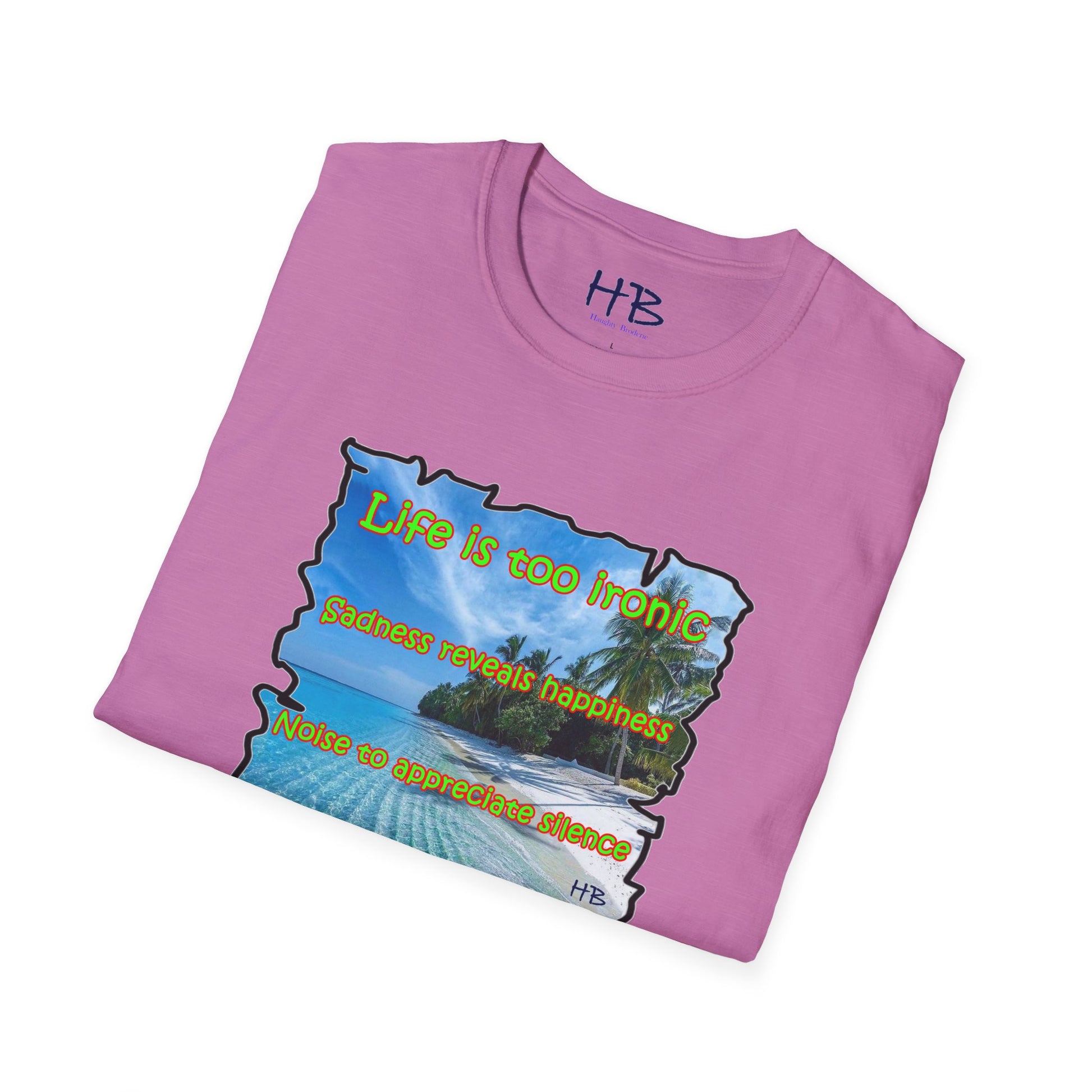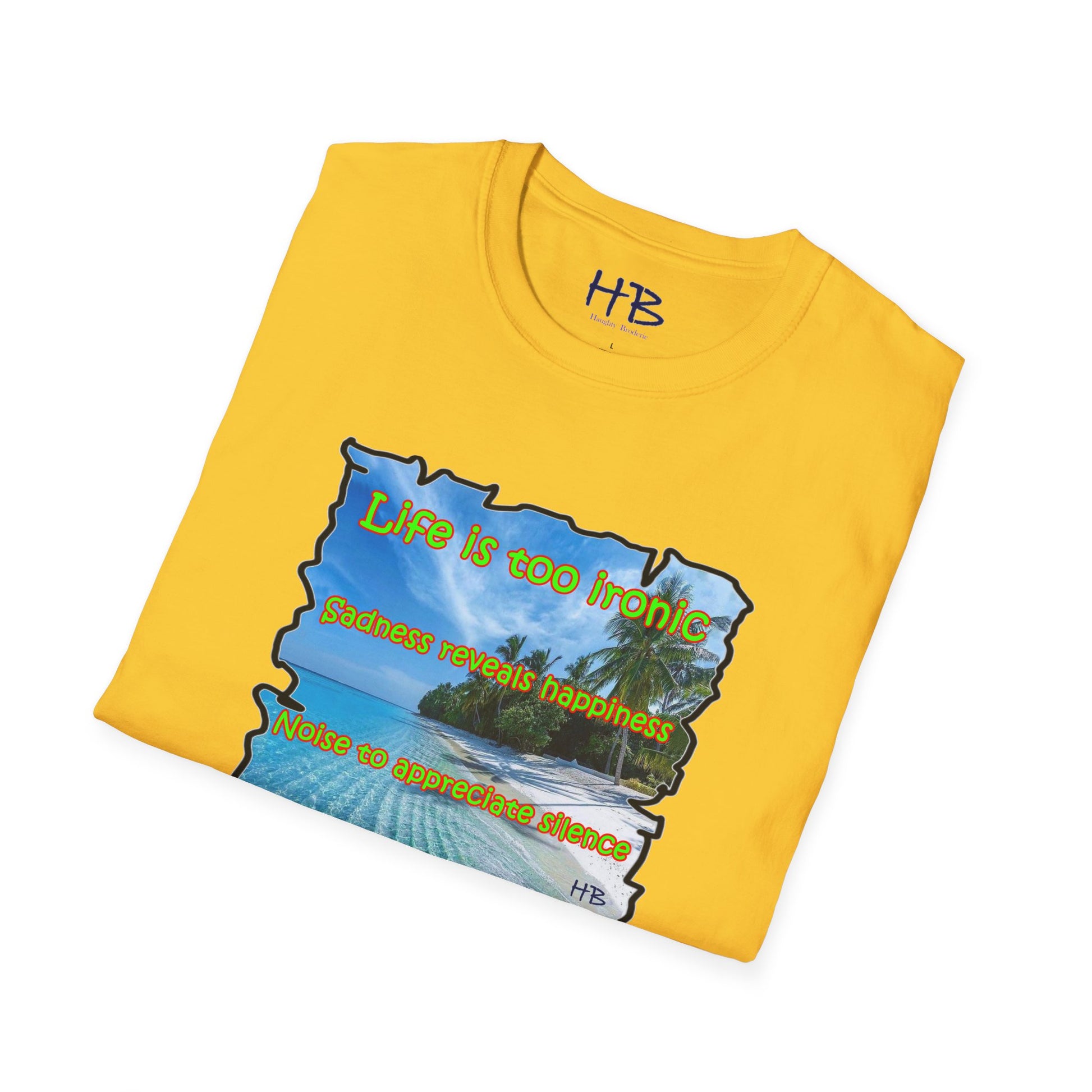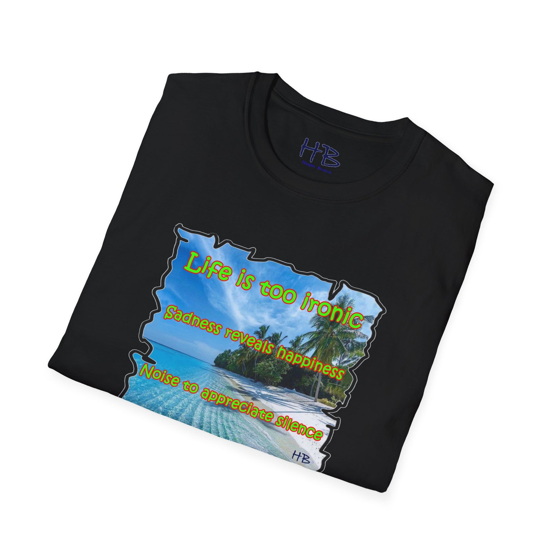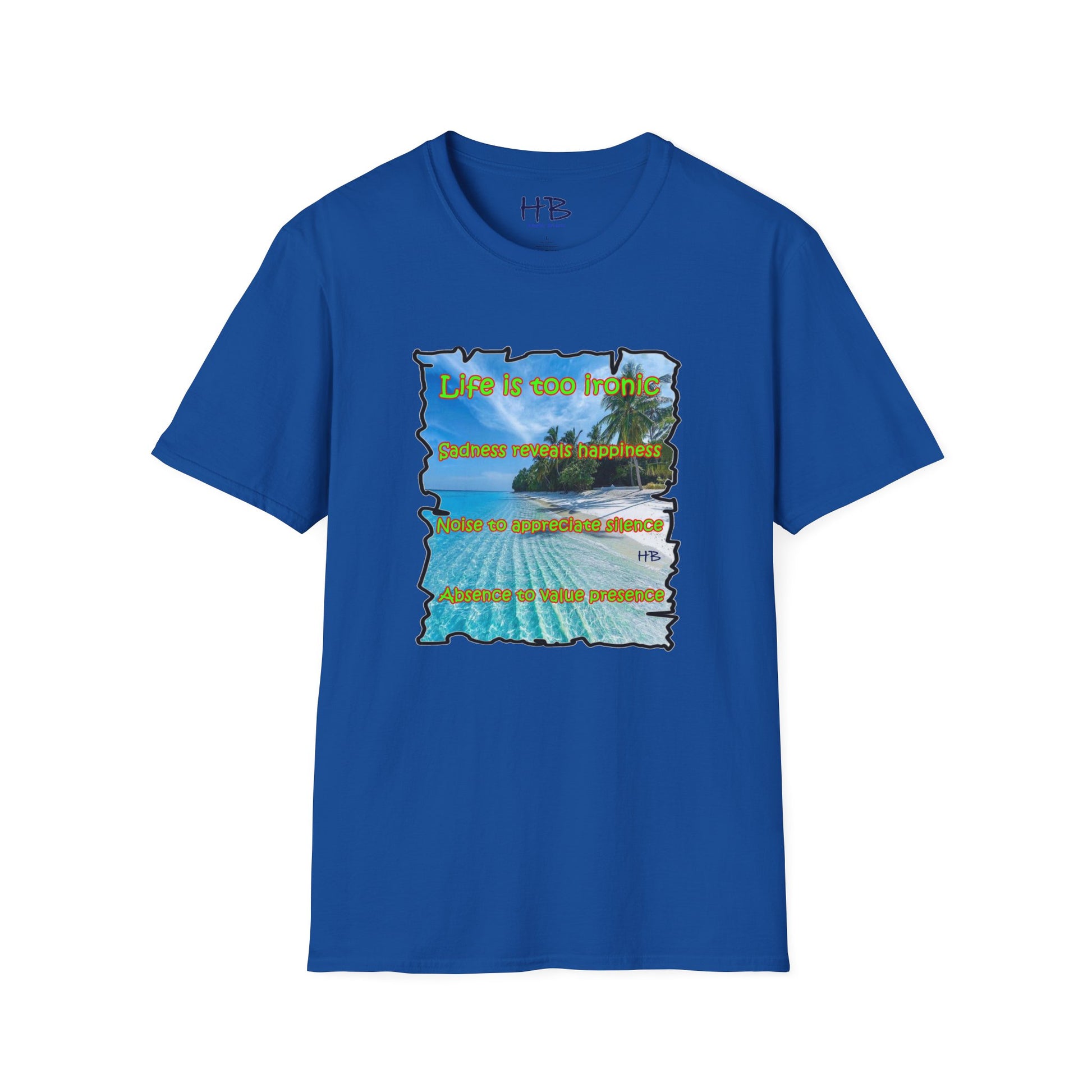 Introducing our latest creation, a stunning piece of wearable art that captures the essence of life's paradoxes and the beauty of self-discovery. Behold the marvelous tee shirt, featuring a breathtaking sandy beach with crystal-clear blue waters, gently swaying palm trees, and a profound message that reads: