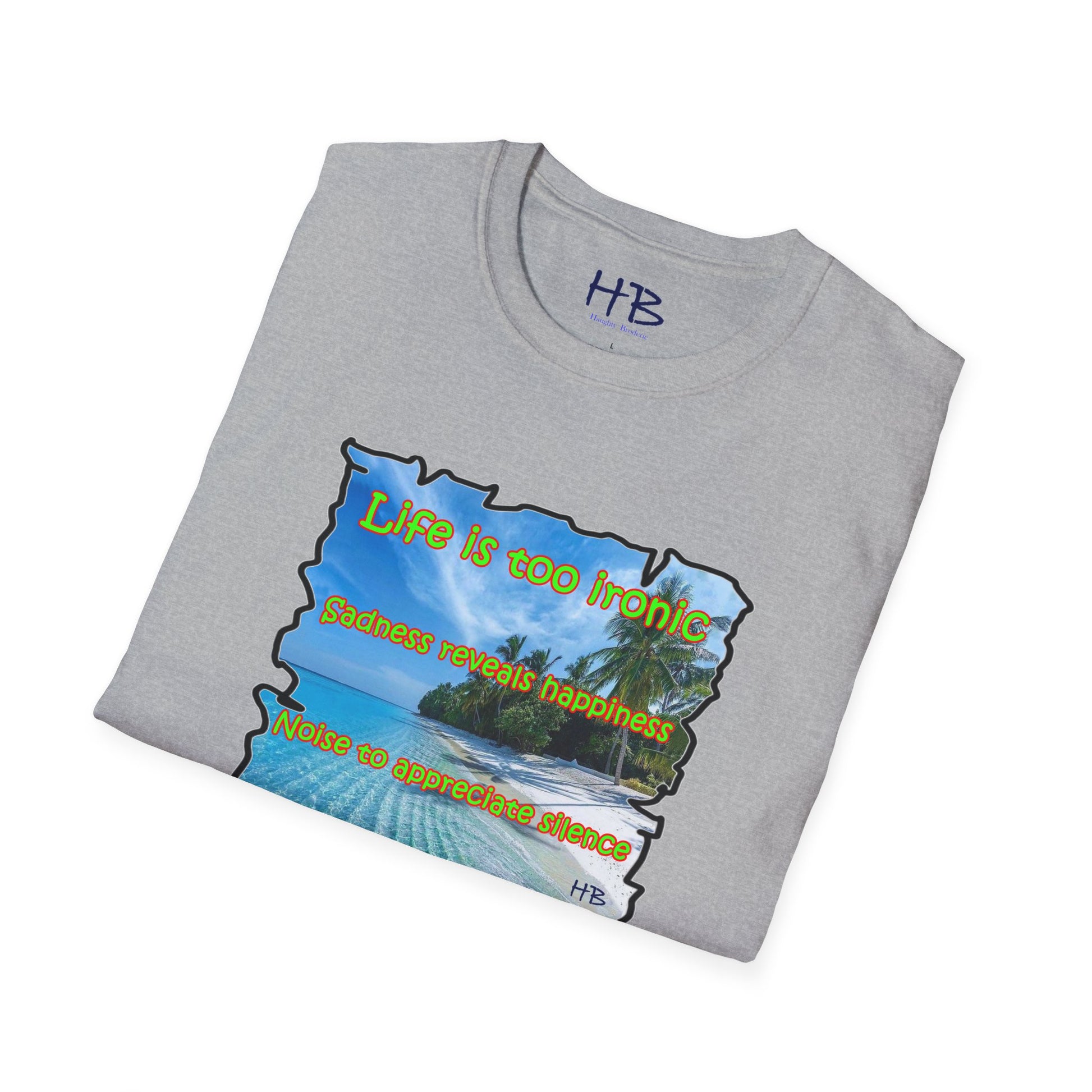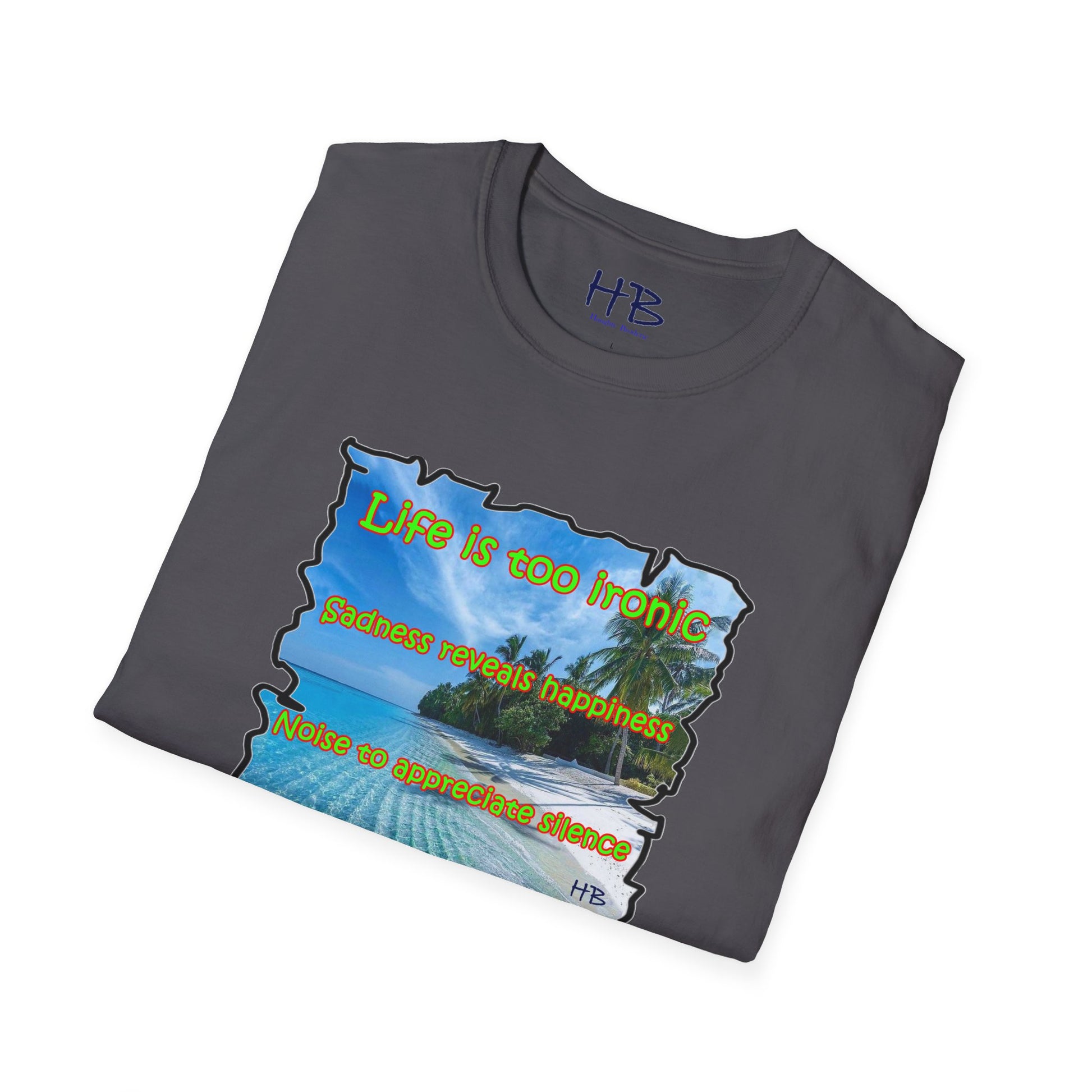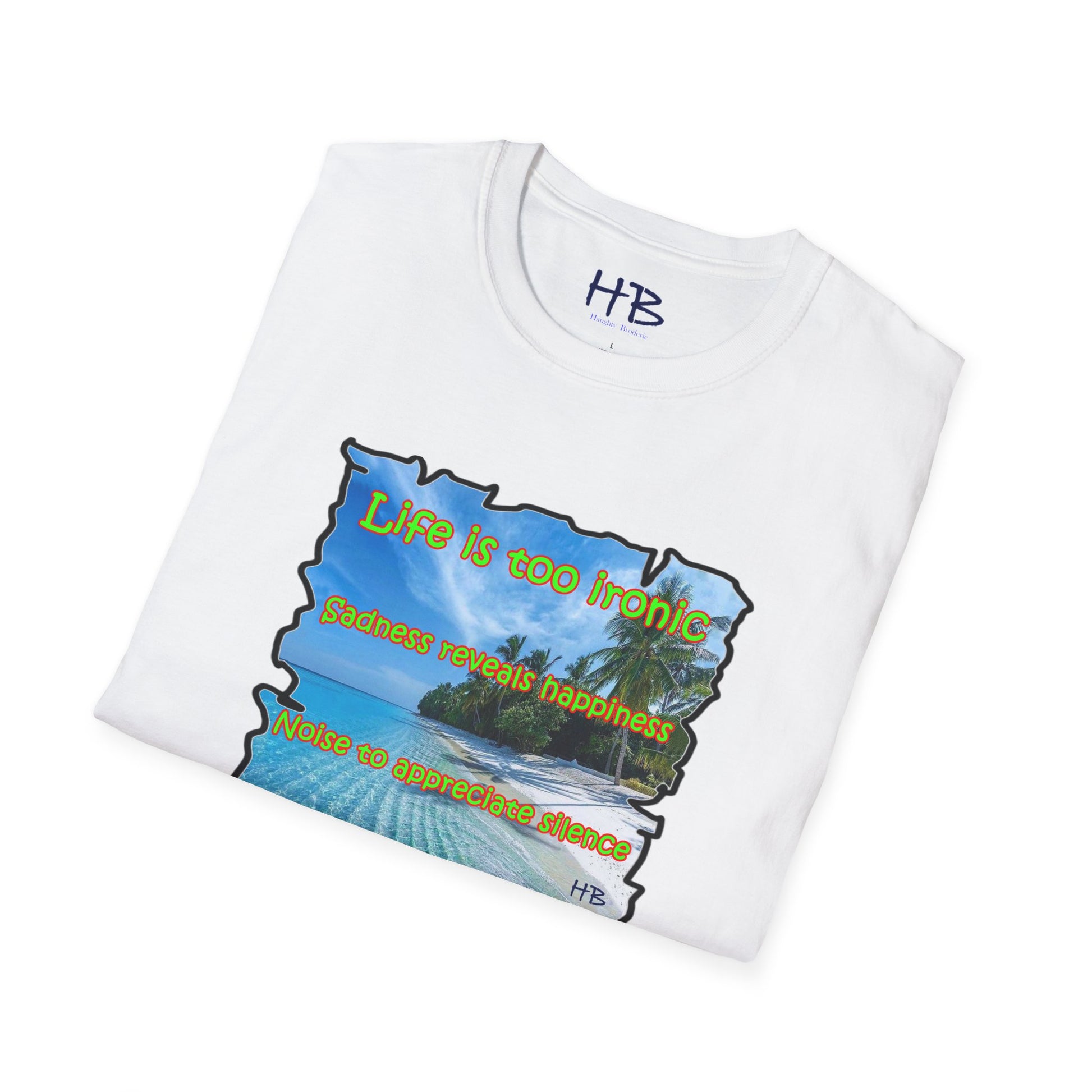 Introducing our latest creation, a stunning piece of wearable art that captures the essence of life's paradoxes and the beauty of self-discovery. Behold the marvelous tee shirt, featuring a breathtaking sandy beach with crystal-clear blue waters, gently swaying palm trees, and a profound message that reads: