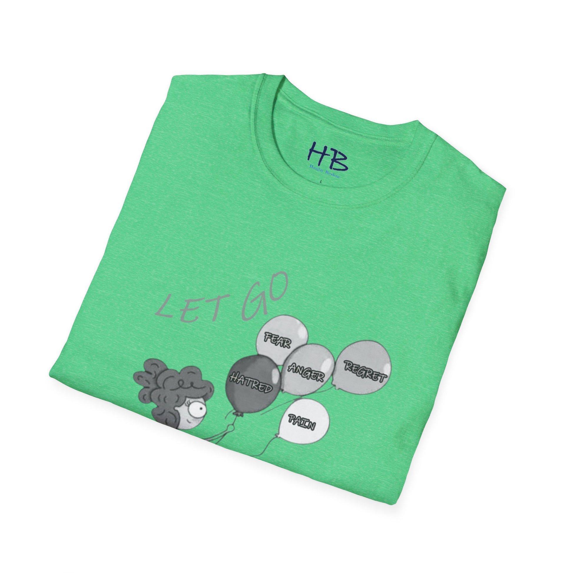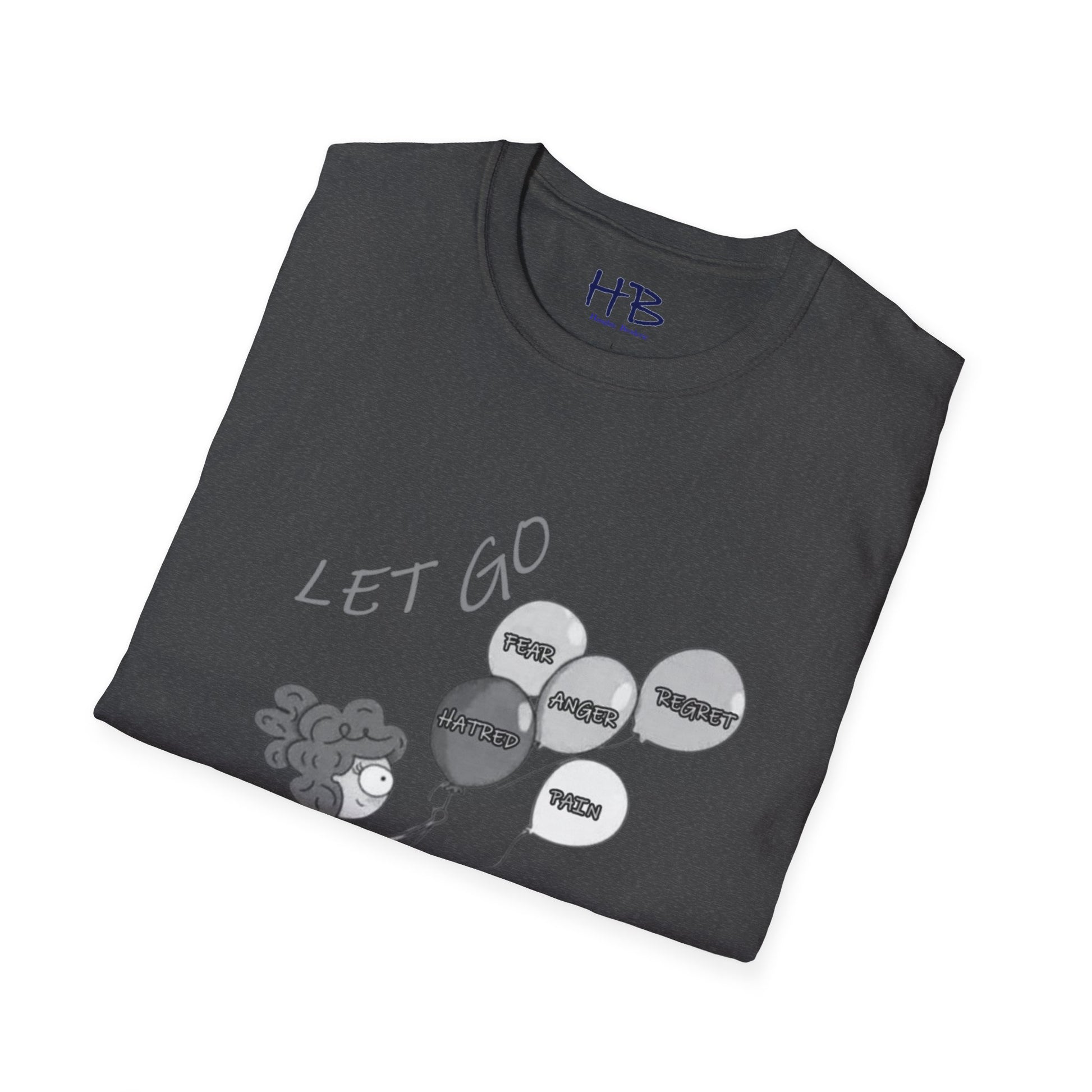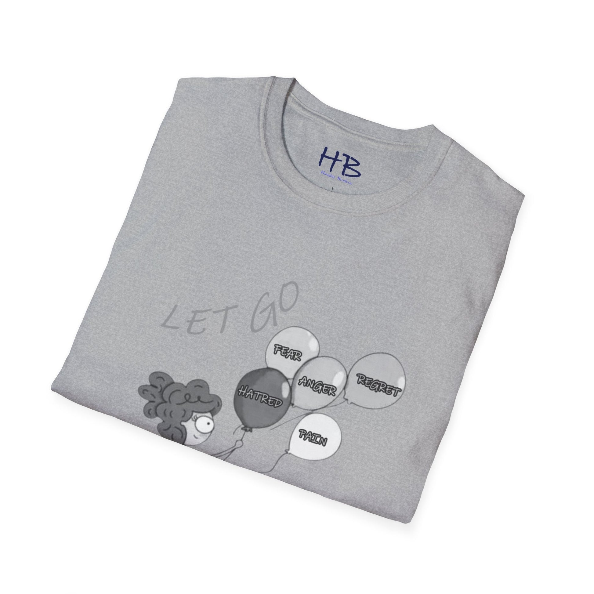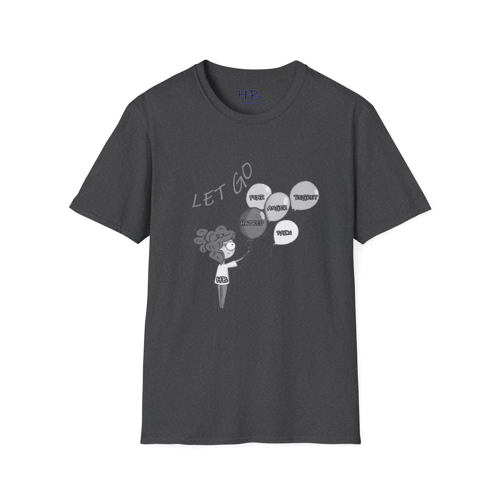 Introducing our transformative masterpiece, the "LET GO" T-shirt, a profound narrative woven into fabric. Picture this: a courageous young girl stands on the edge of a cliff, clutching five balloons tethered to the shadows of the past—Fear, Anger, Hatred, Regret, and Pain.