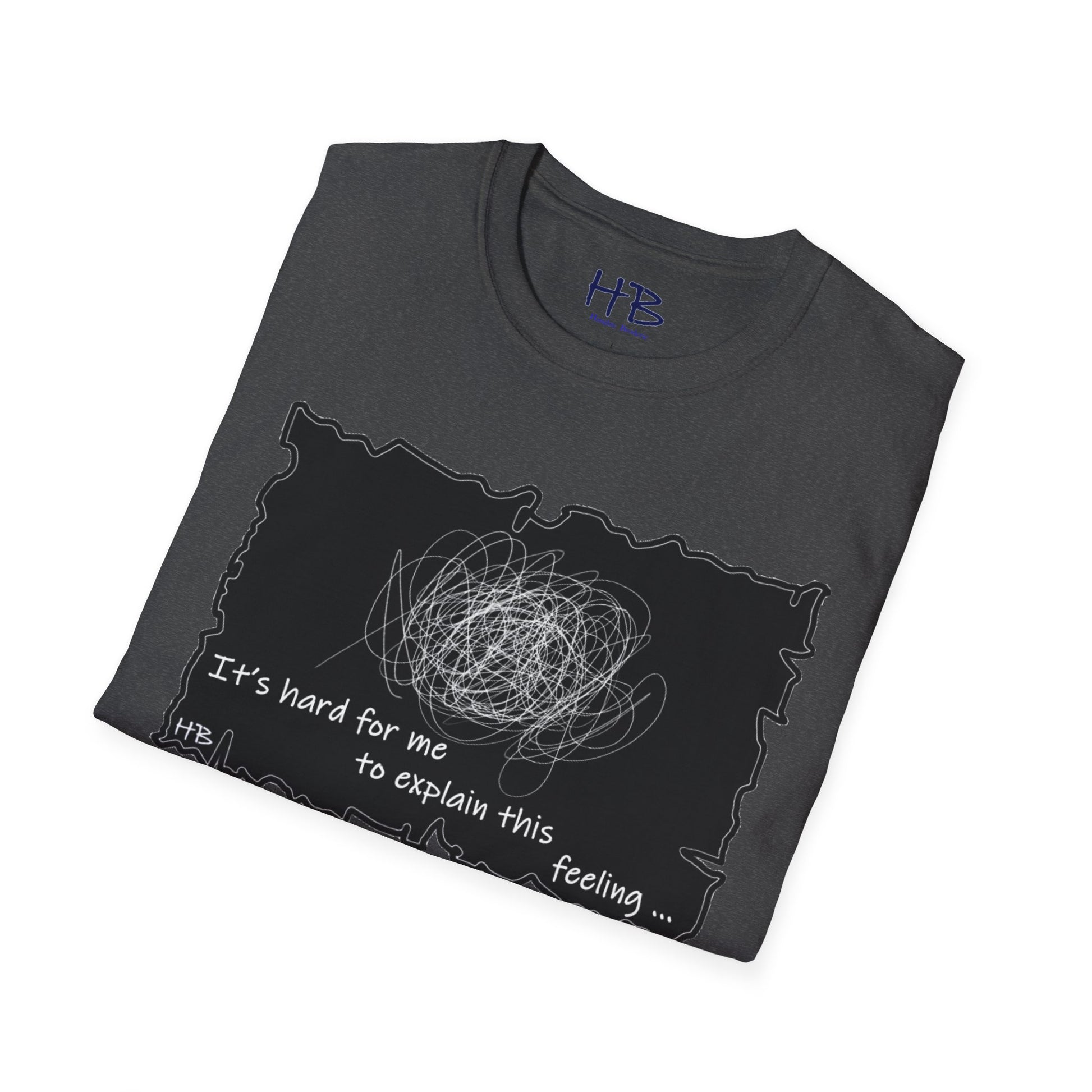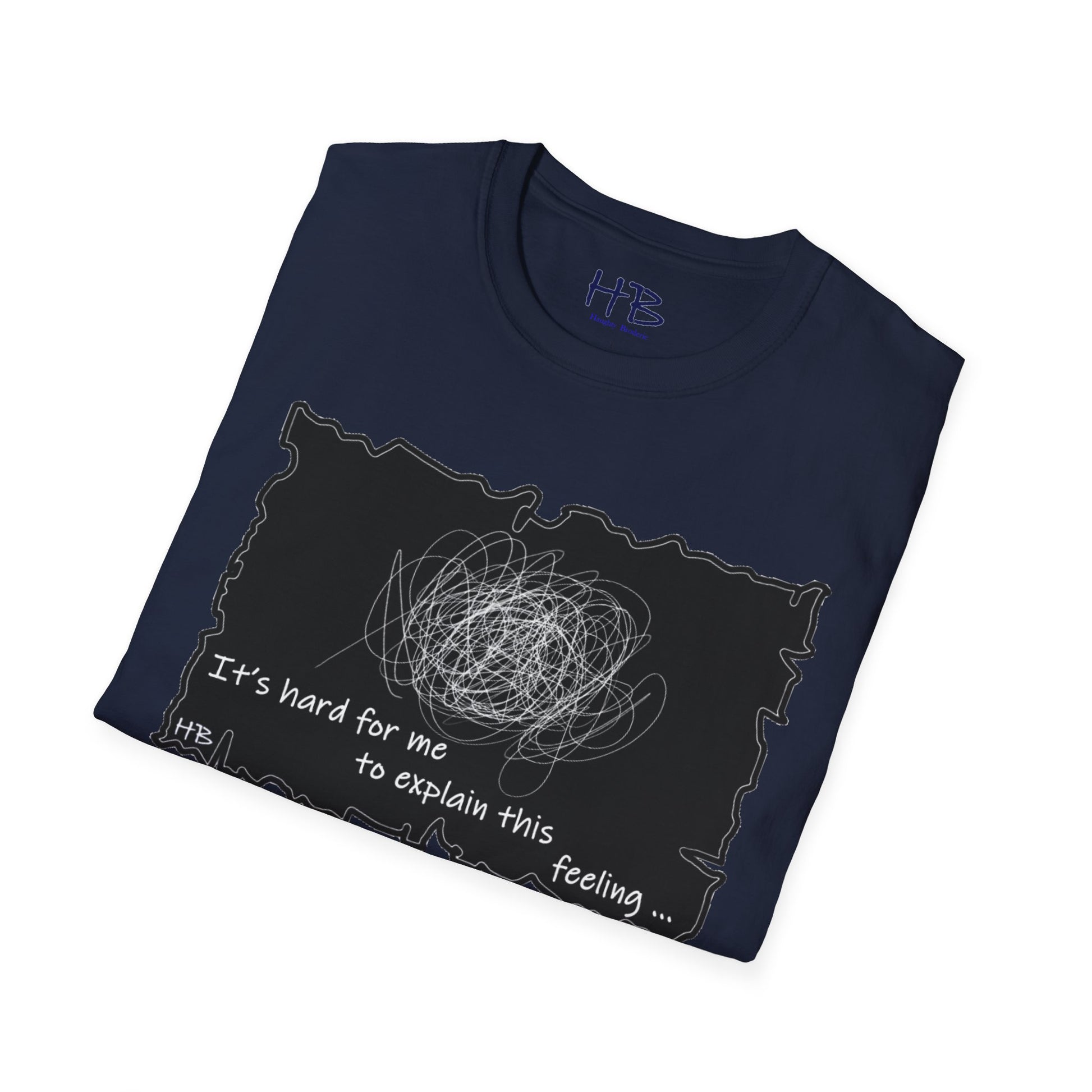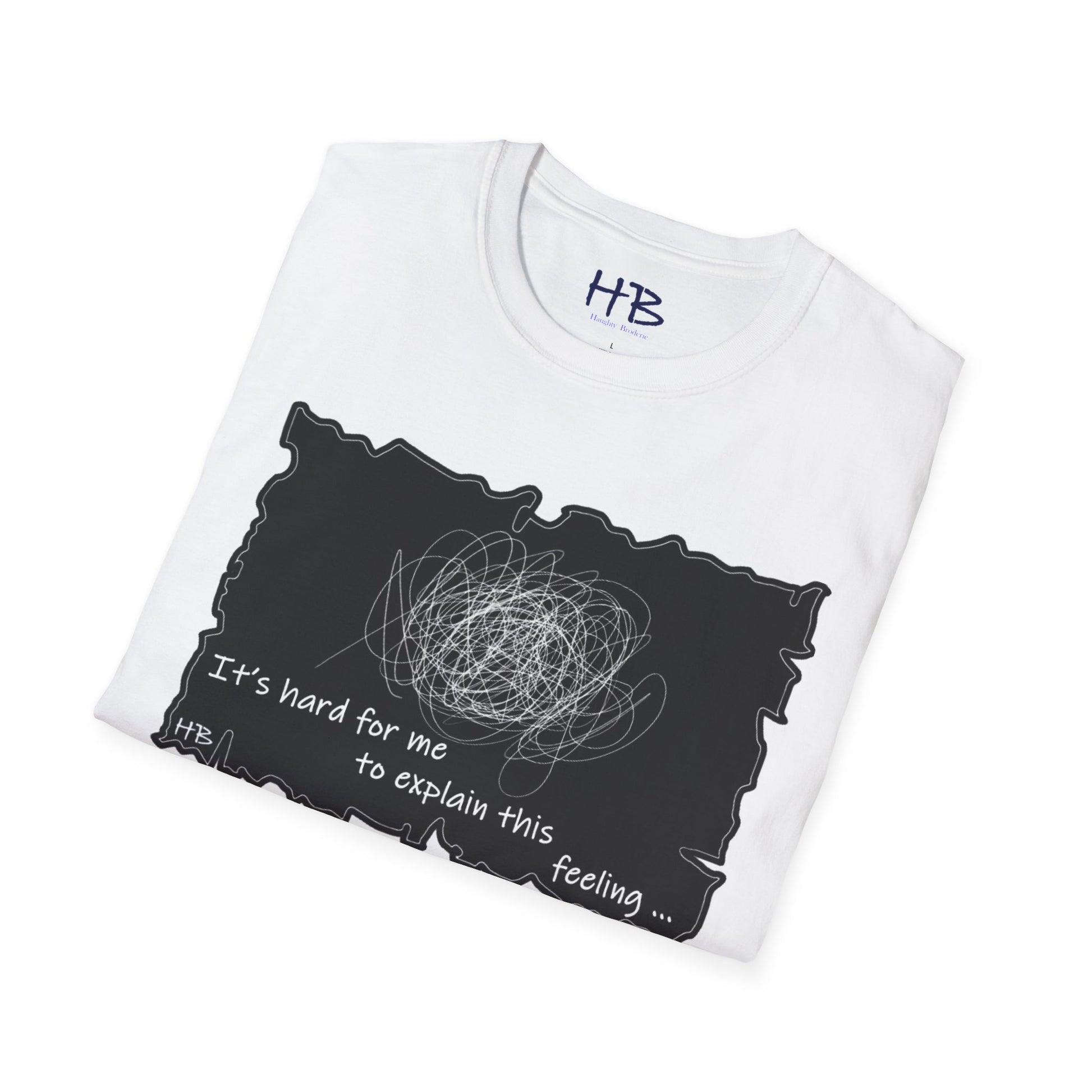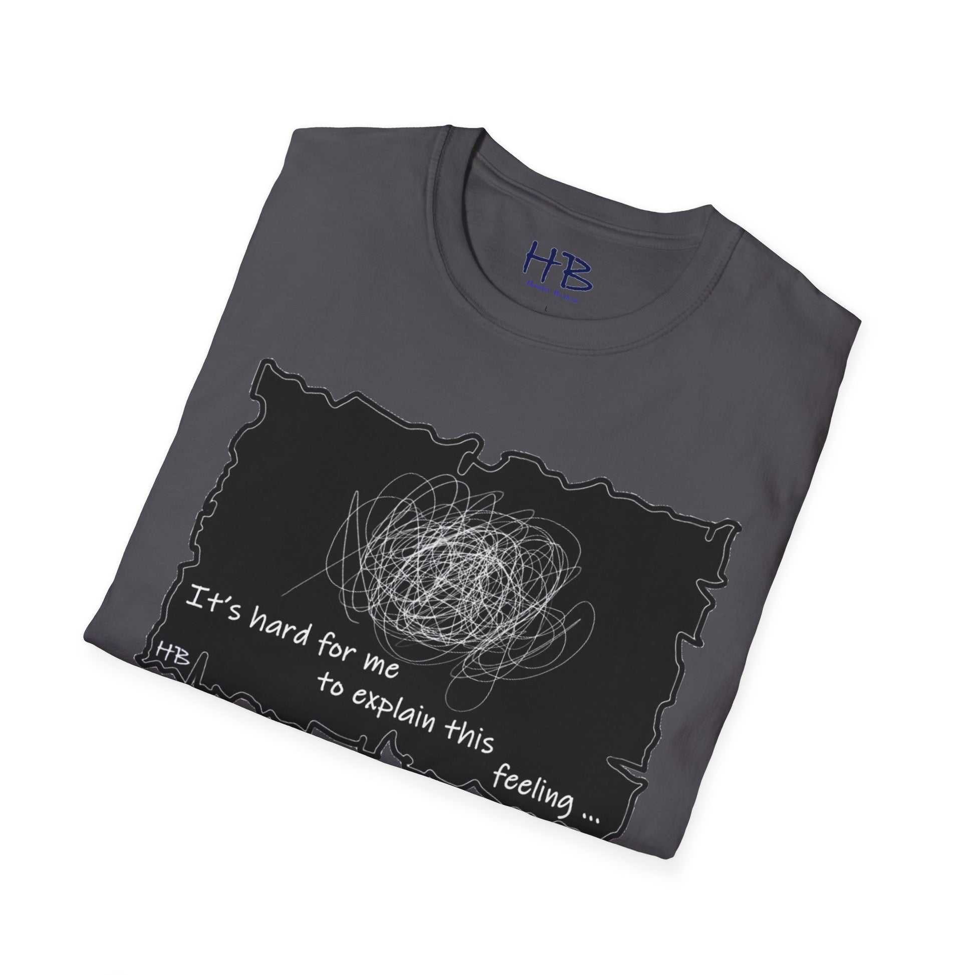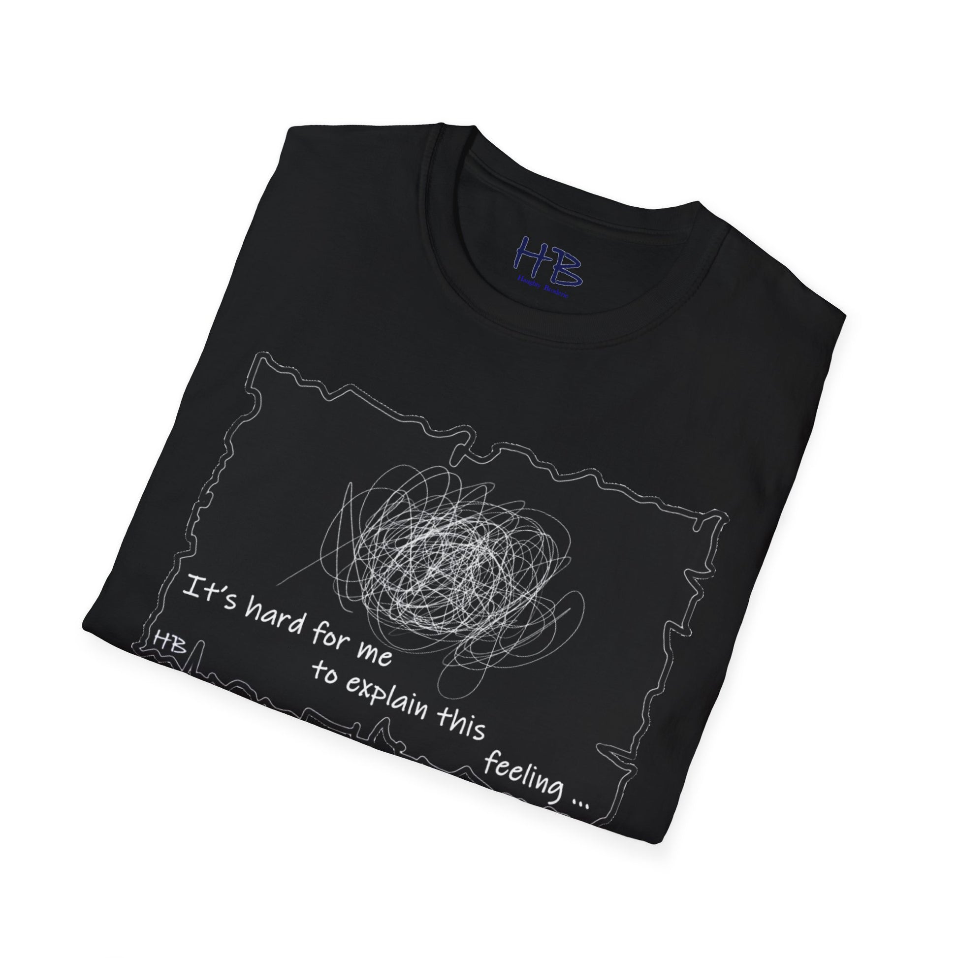 Introducing our unique and one-of-a-kind garment, a wearable work of art that encapsulates the indescribable emotions we all experience. This extraordinary piece features a prominent, intricate scribble with lines that meander in every direction, accompanied by the powerful statement, "It's hard for me to explain this feeling..."