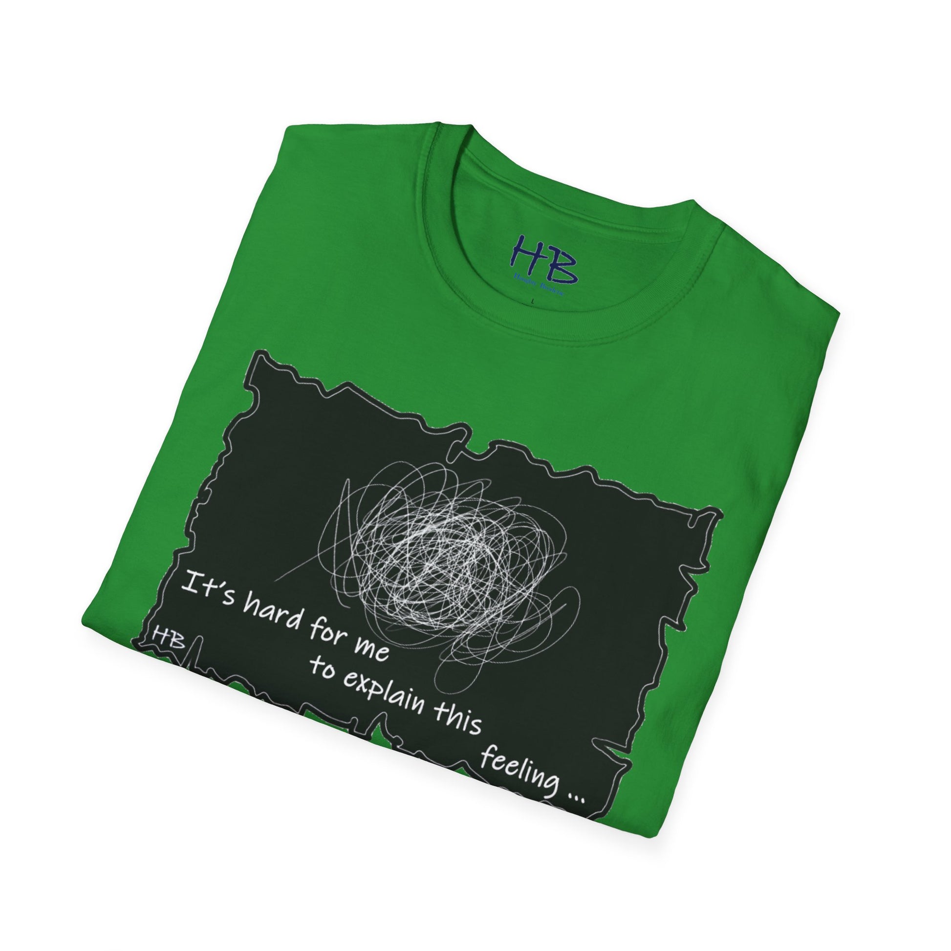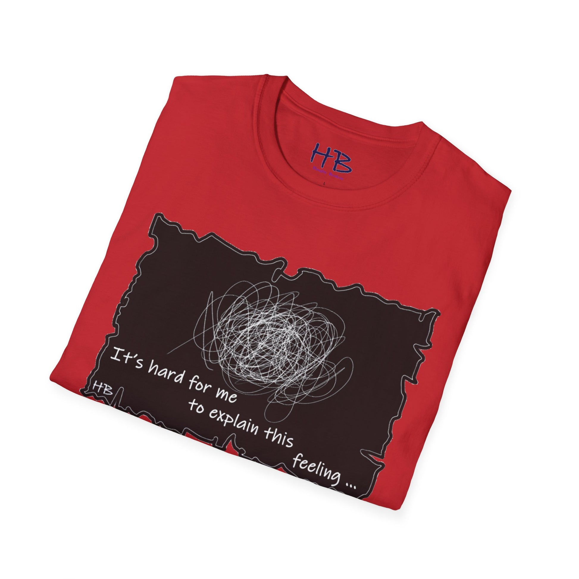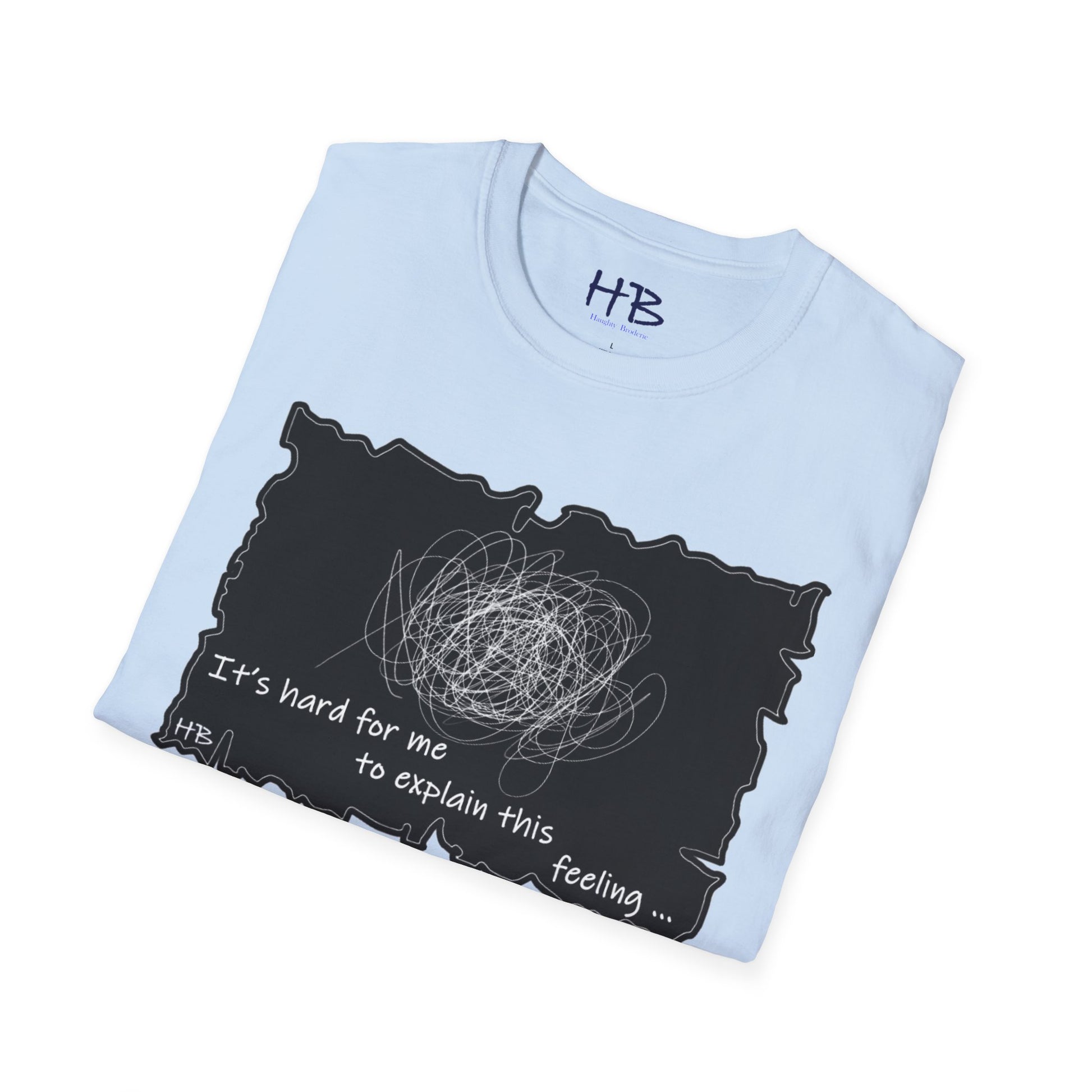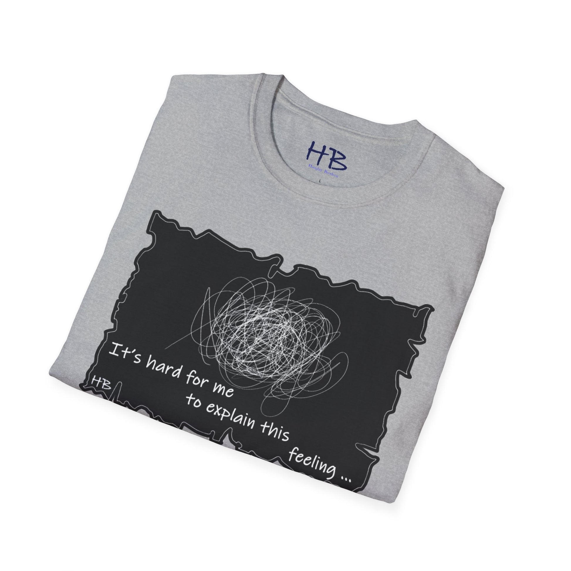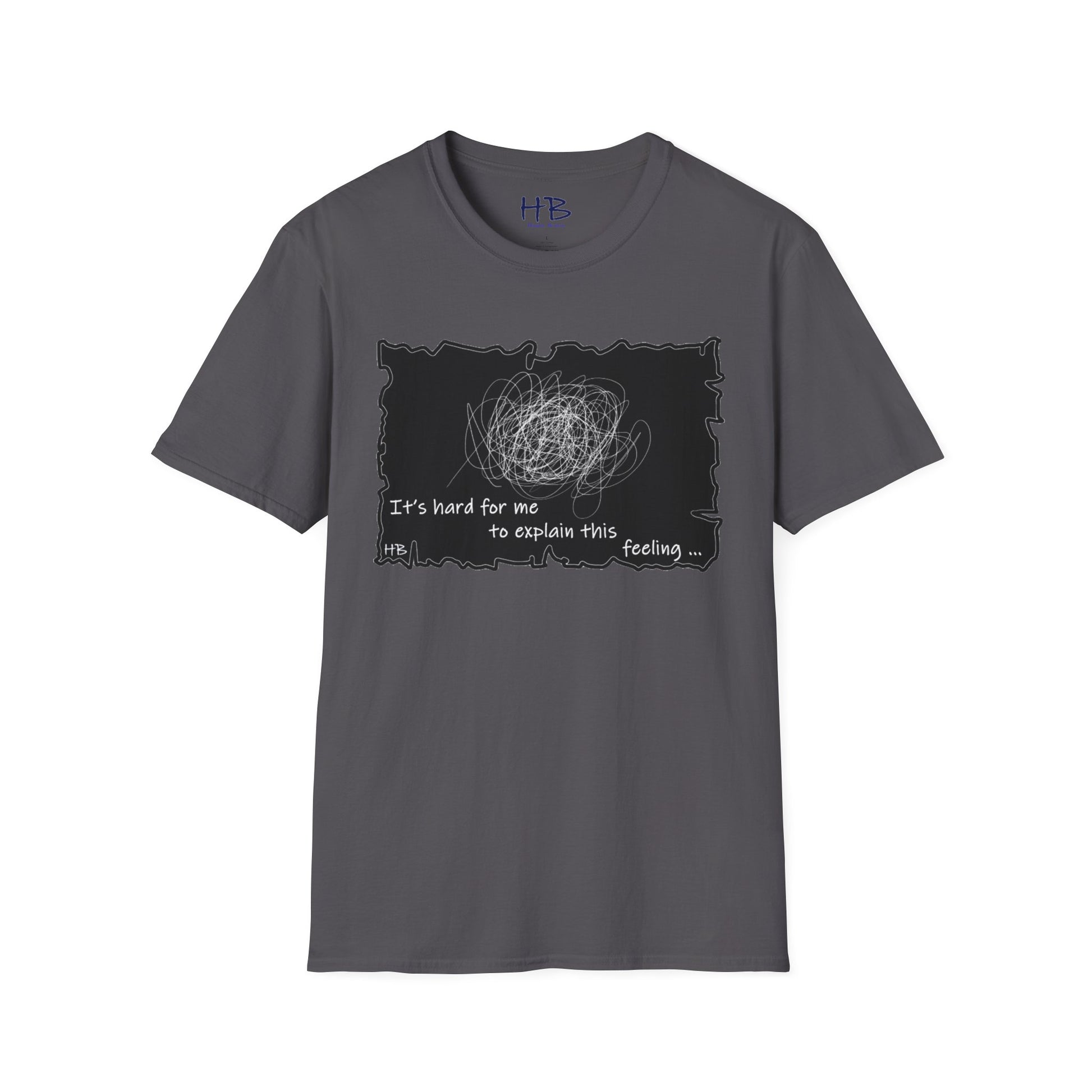 Introducing our unique and one-of-a-kind garment, a wearable work of art that encapsulates the indescribable emotions we all experience. This extraordinary piece features a prominent, intricate scribble with lines that meander in every direction, accompanied by the powerful statement, "It's hard for me to explain this feeling..."