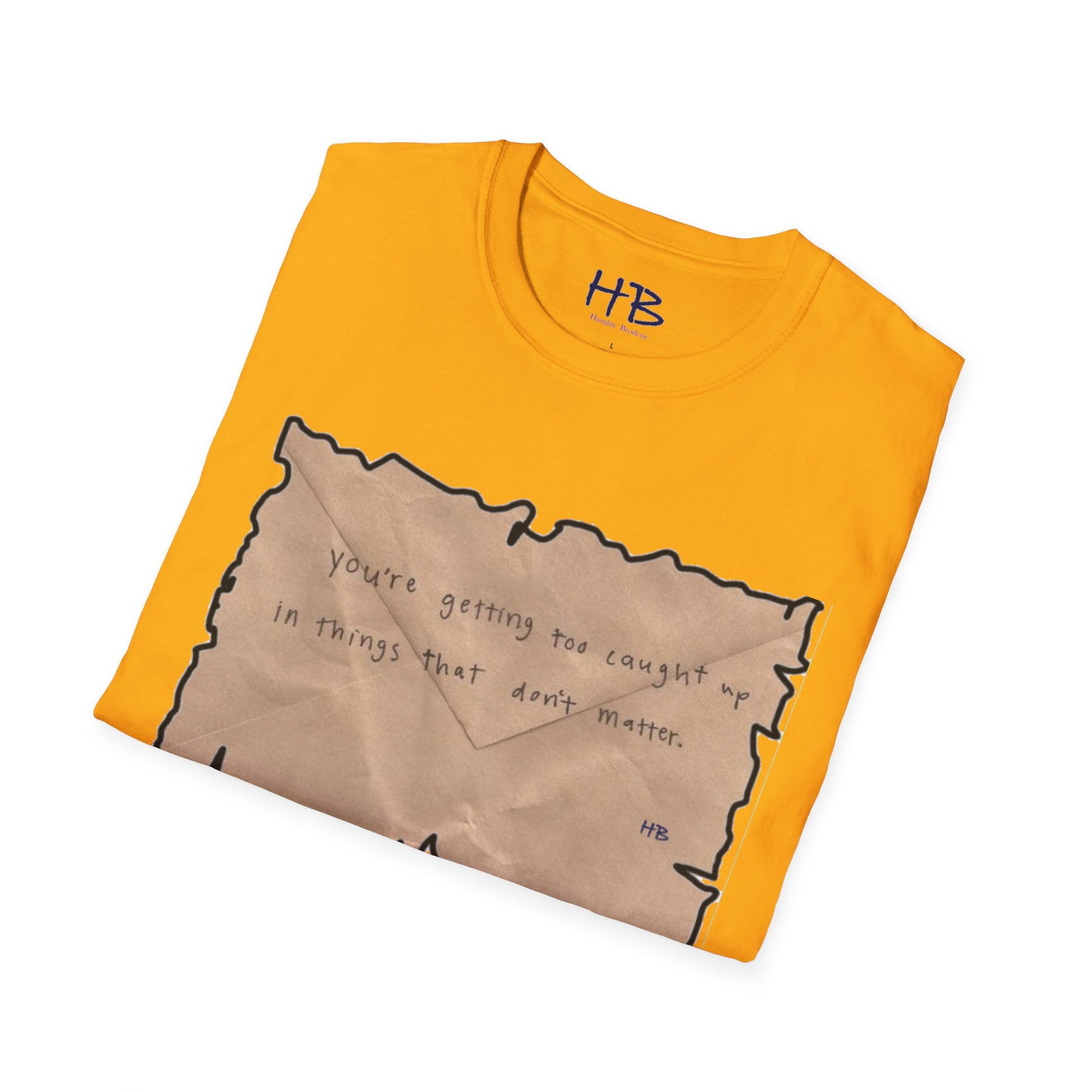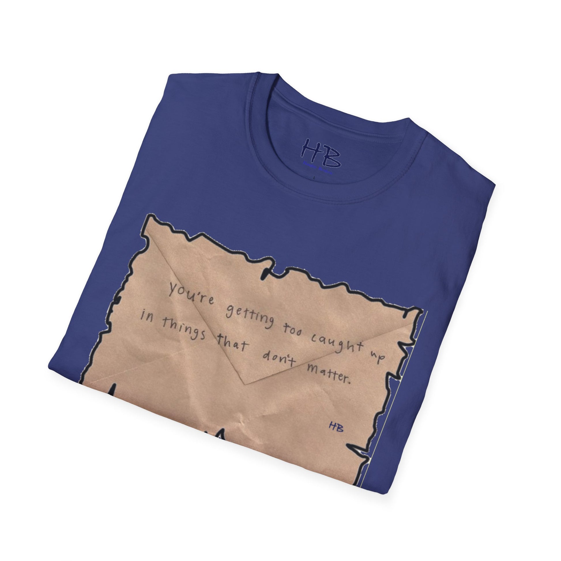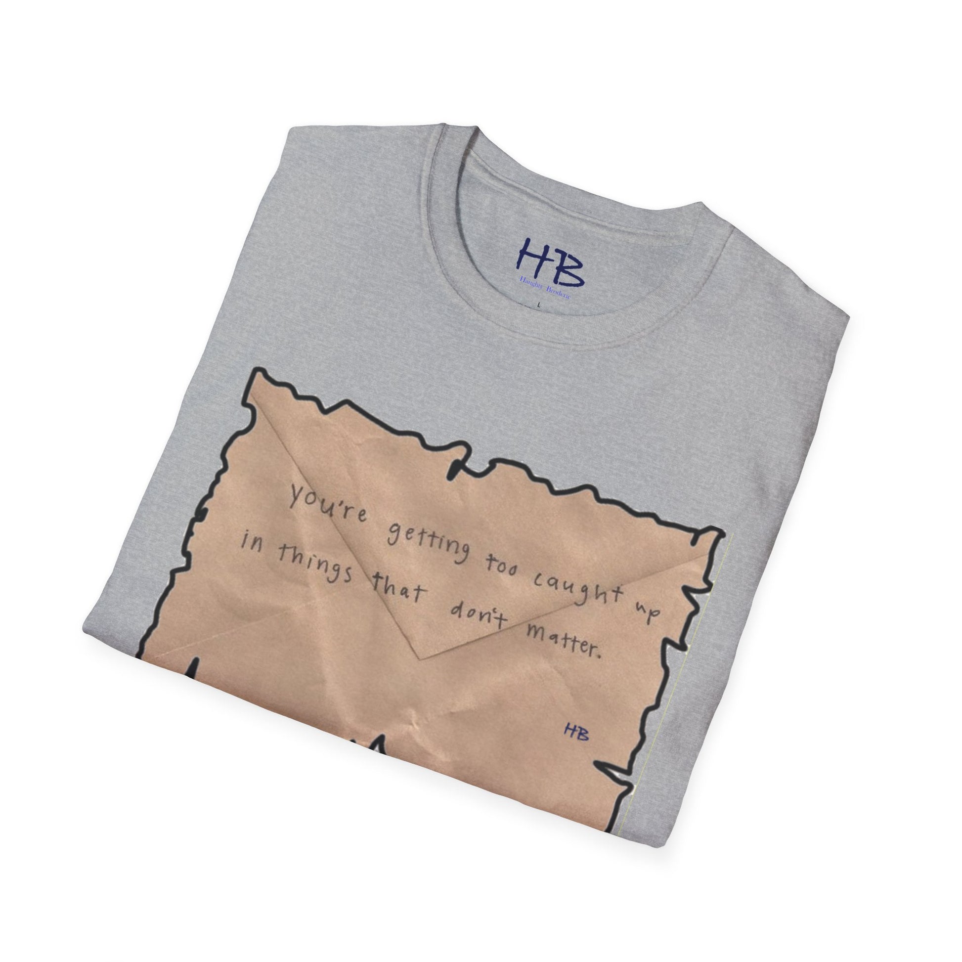 Introducing our thought-provoking tee shirt, designed to make a bold statement and ignite introspection within every individual. Adorned with an image of a handwritten message, prominently displayed on the front of an envelope, this tee shirt serves as a powerful reminder: "You're getting too caught up in things that don't matter."