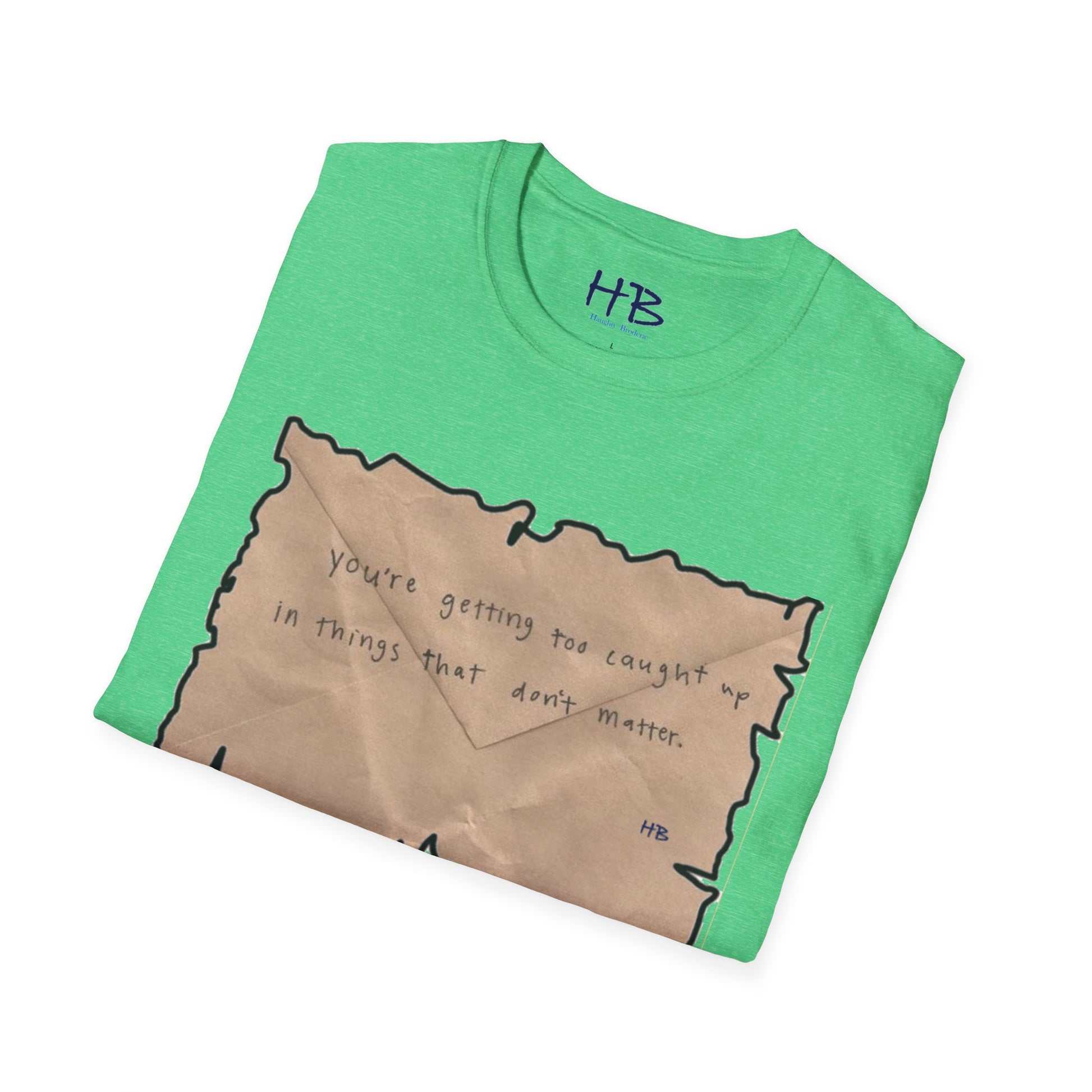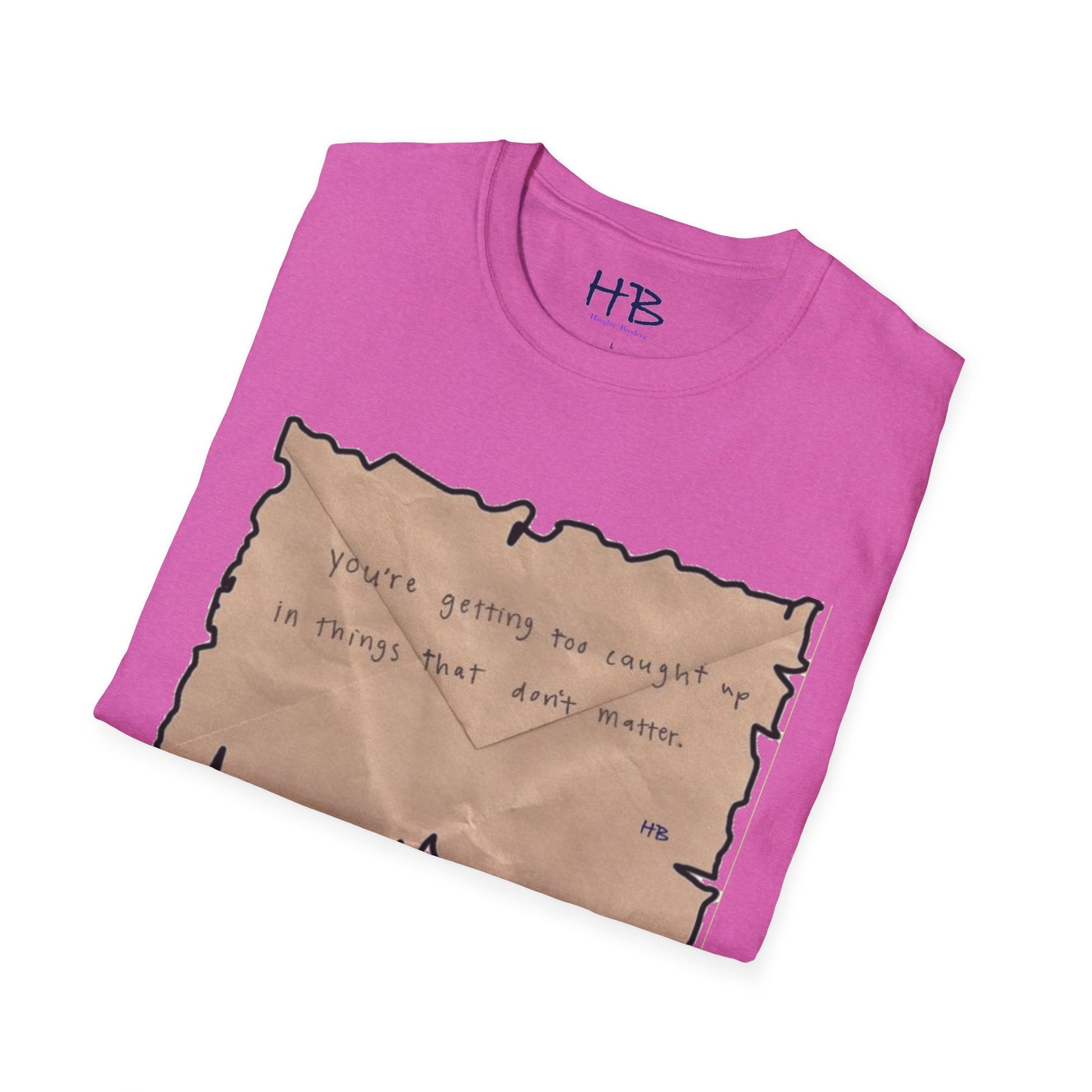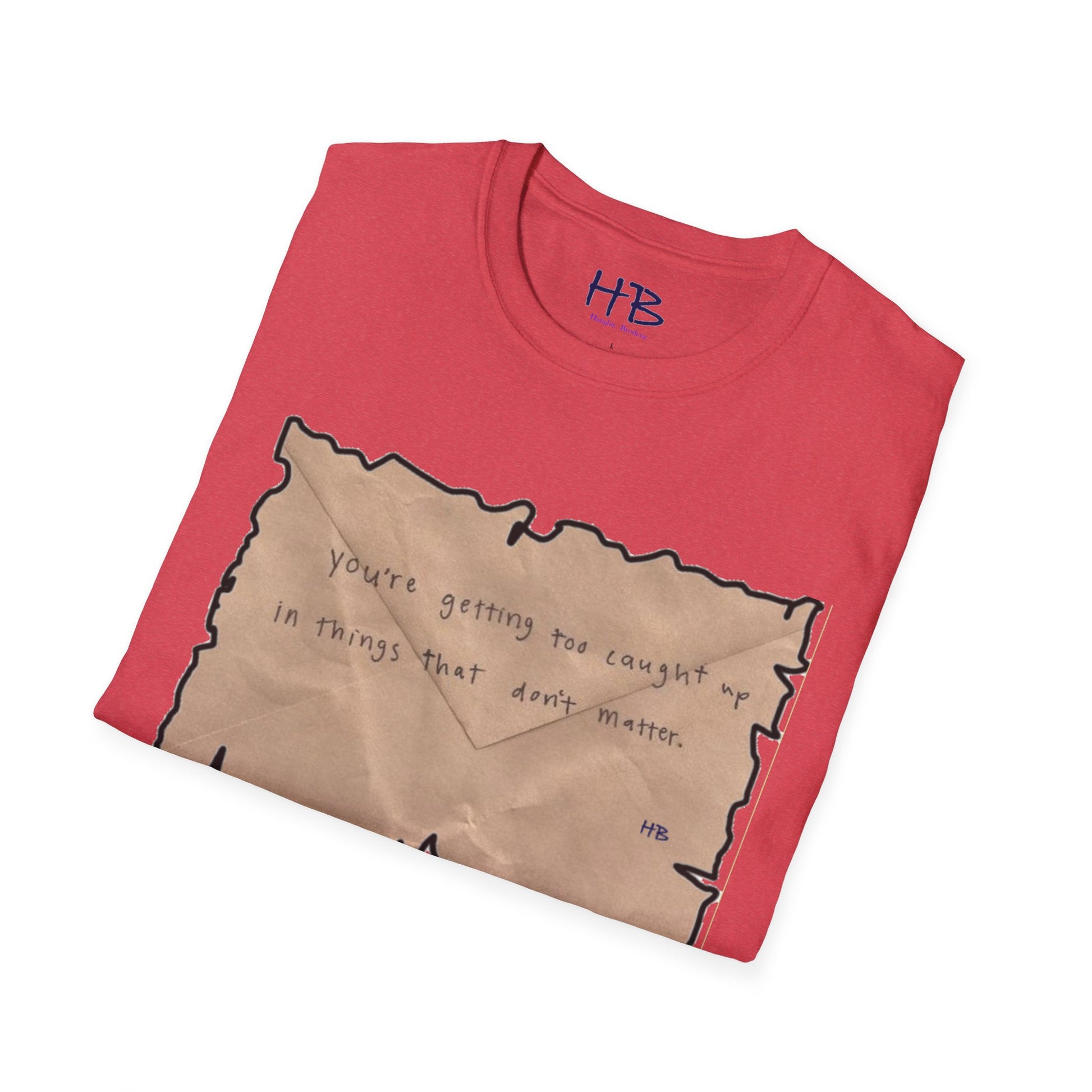 Introducing our thought-provoking tee shirt, designed to make a bold statement and ignite introspection within every individual. Adorned with an image of a handwritten message, prominently displayed on the front of an envelope, this tee shirt serves as a powerful reminder: "You're getting too caught up in things that don't matter."