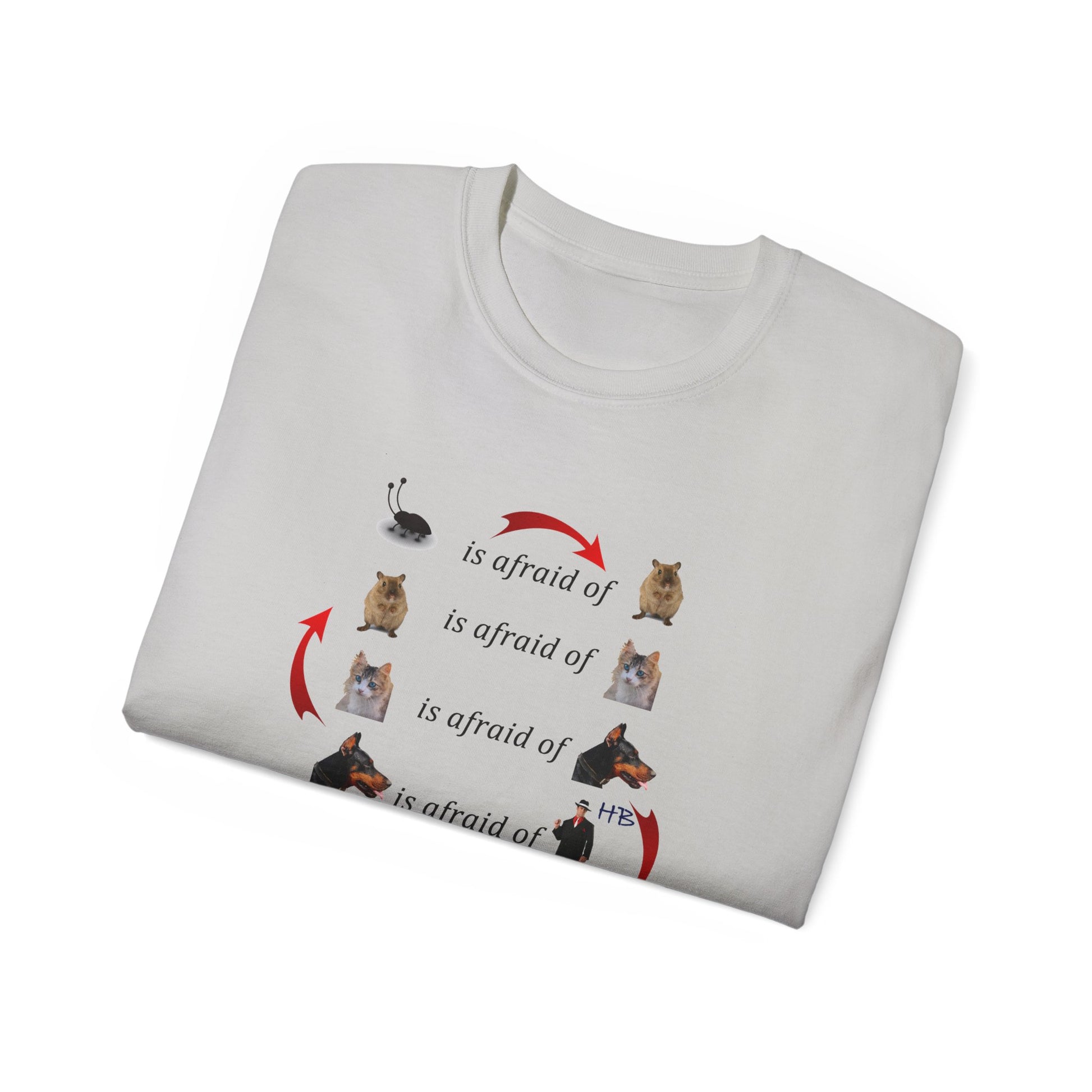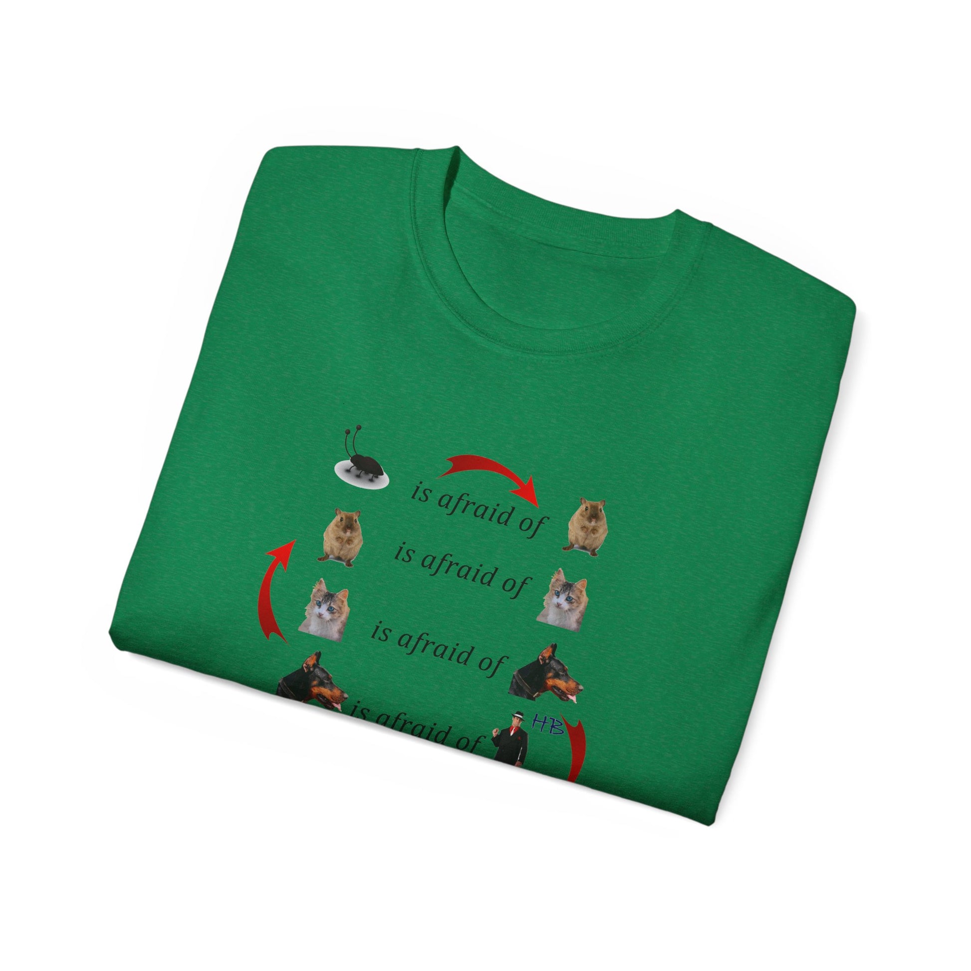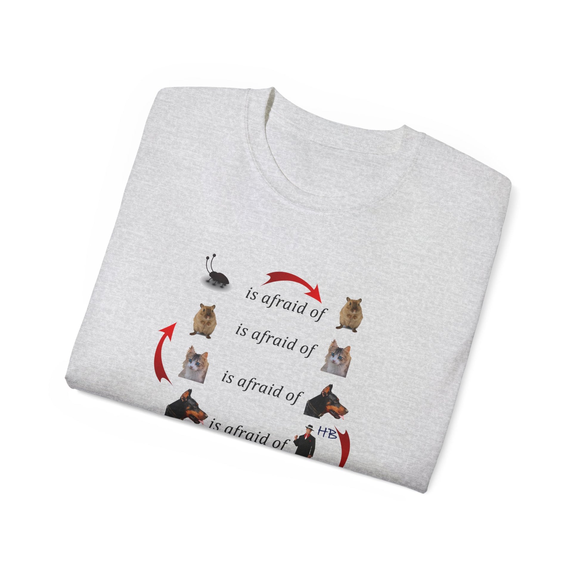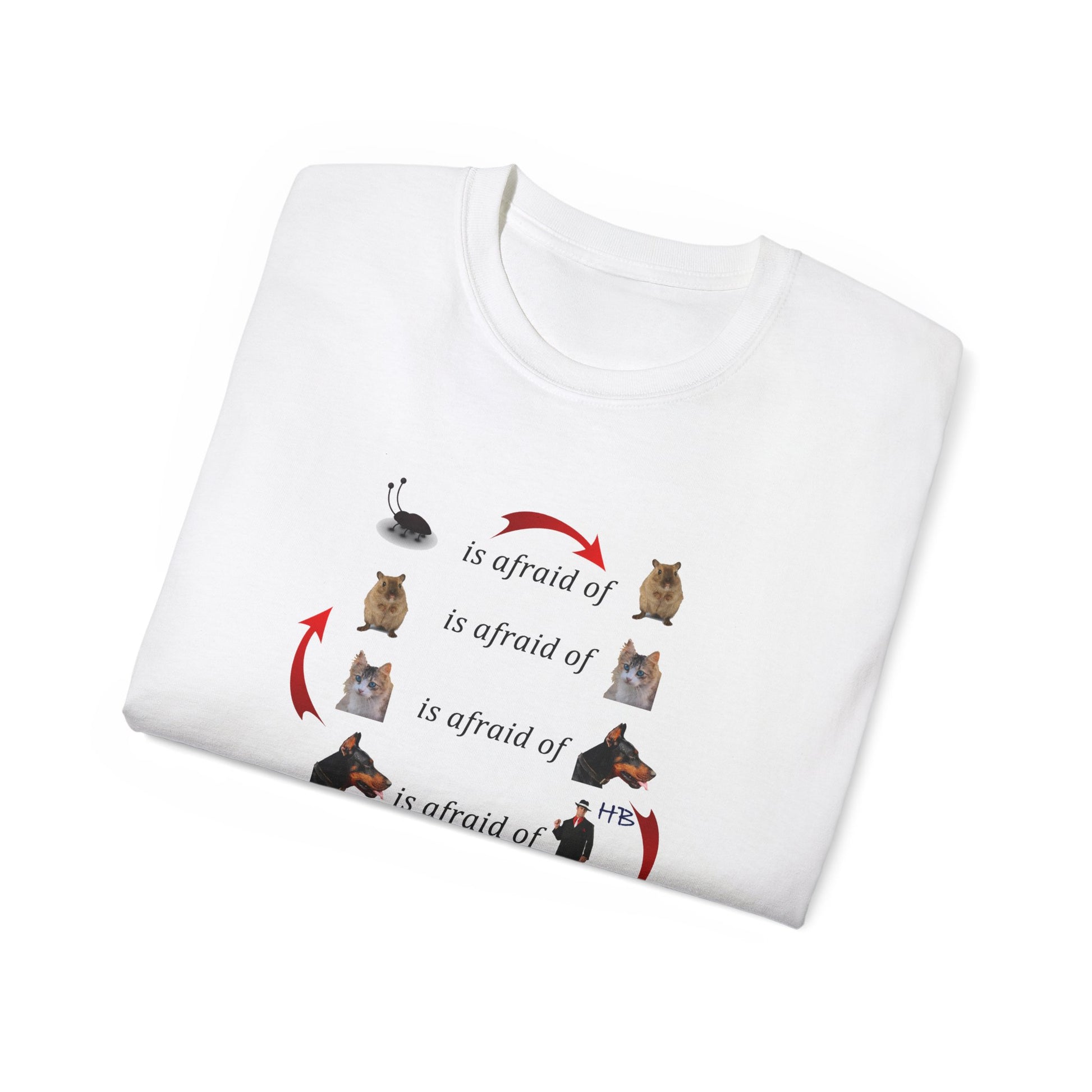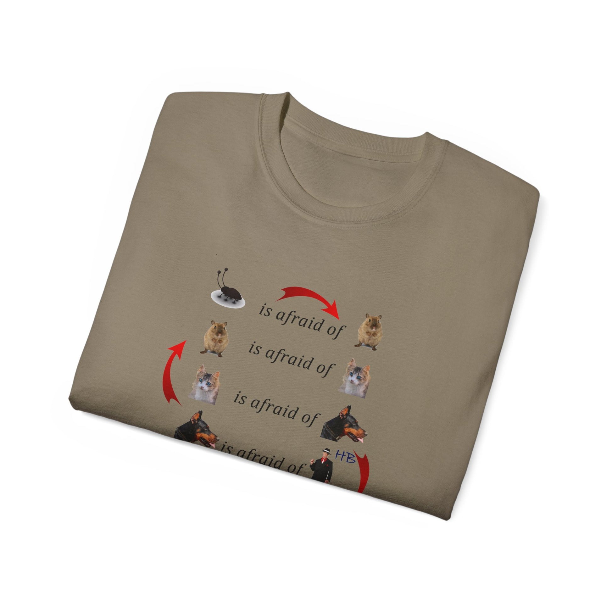 Introducing our hilarious tee shirt with a comical illustration of a never-ending cycle of fear. The image shows a scared cockroach, followed by a frightened mouse, and a timid cat, which is then followed by a fearful dog, and finally, a terrified man who is frightened of a woman who, in turn, is scared of a cockroach, completing the vicious circle. This design highlights the absurdity of fear and how it can create a never-ending cycle. Get your hands on this tee shirt to add some humor to your wardrobe and remind yourself not to get caught up in the never-ending cycle of fear. Up to you and your friends to decide who is king of the jungle.