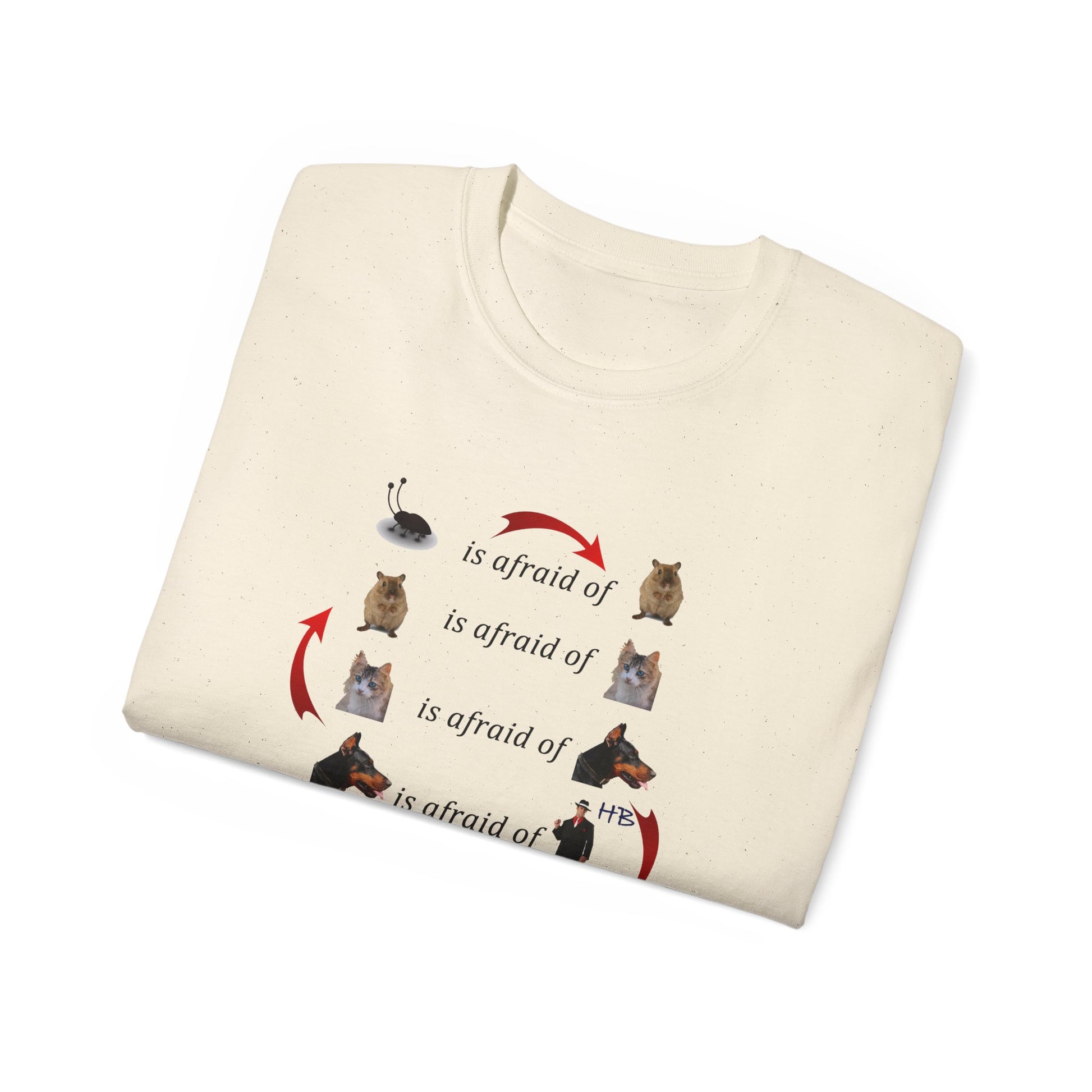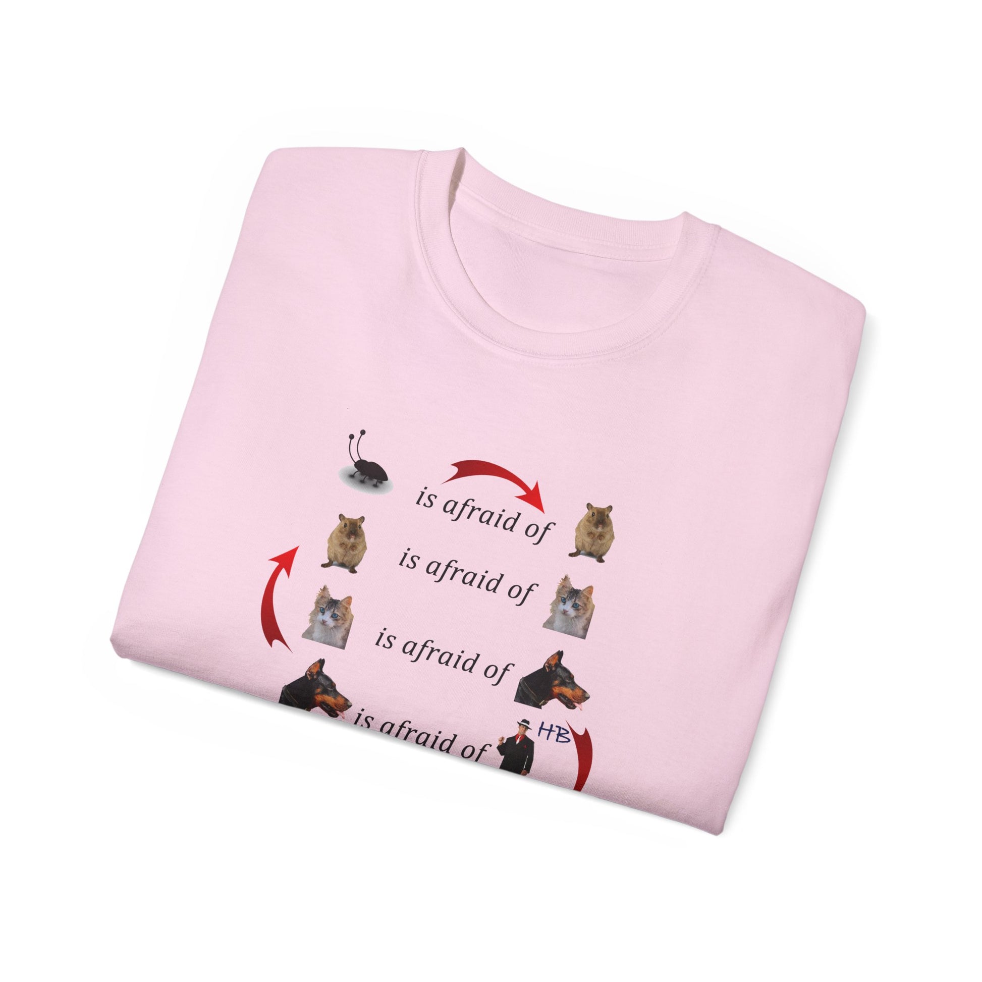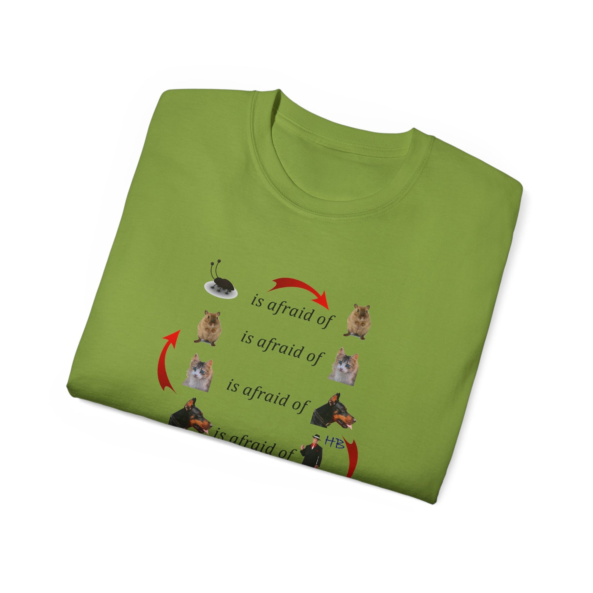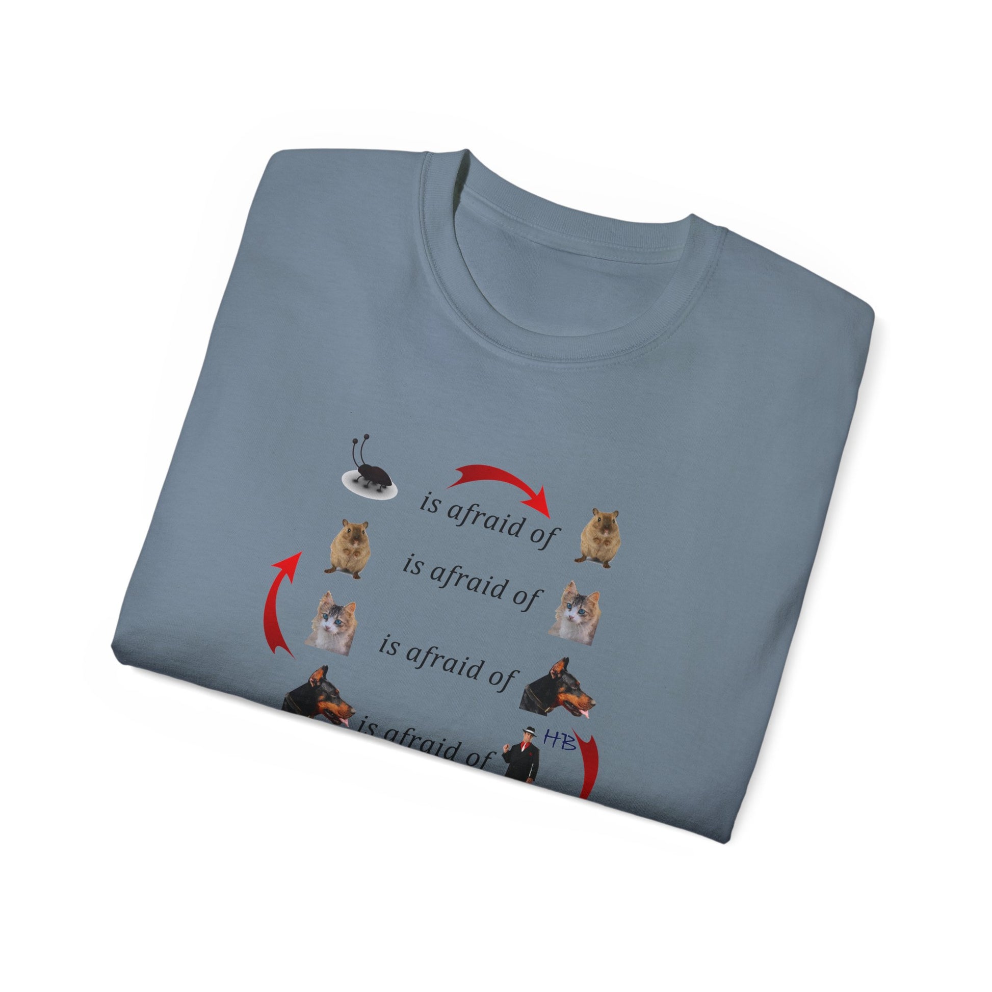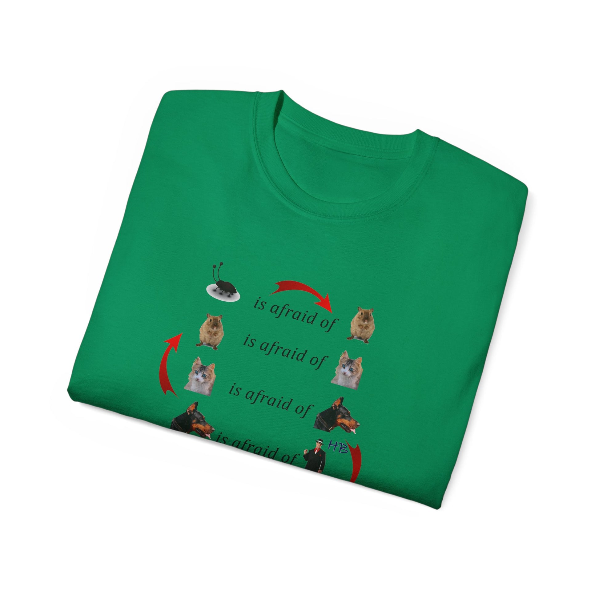 Introducing our hilarious tee shirt with a comical illustration of a never-ending cycle of fear. The image shows a scared cockroach, followed by a frightened mouse, and a timid cat, which is then followed by a fearful dog, and finally, a terrified man who is frightened of a woman who, in turn, is scared of a cockroach, completing the vicious circle. This design highlights the absurdity of fear and how it can create a never-ending cycle. Get your hands on this tee shirt to add some humor to your wardrobe and remind yourself not to get caught up in the never-ending cycle of fear. Up to you and your friends to decide who is king of the jungle.