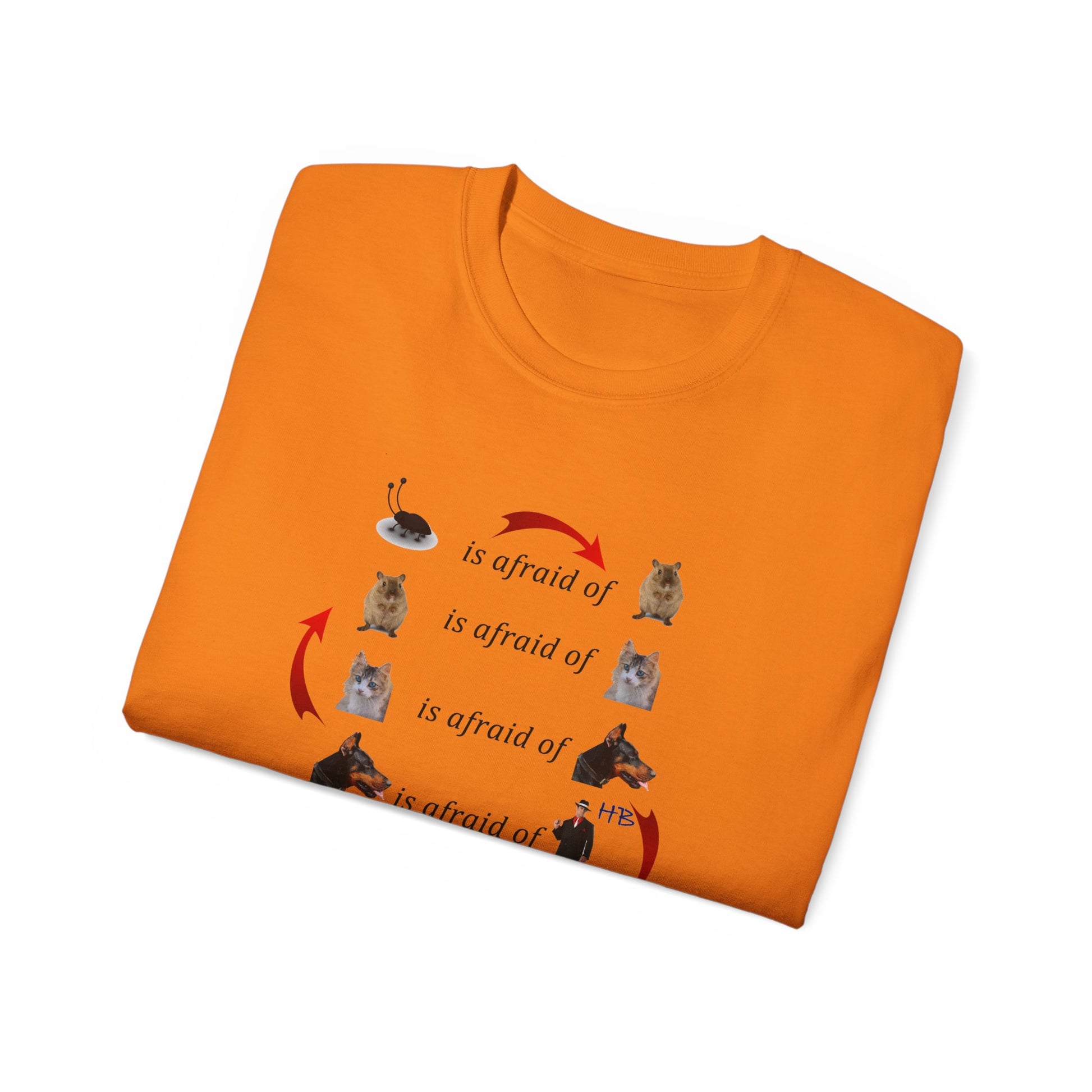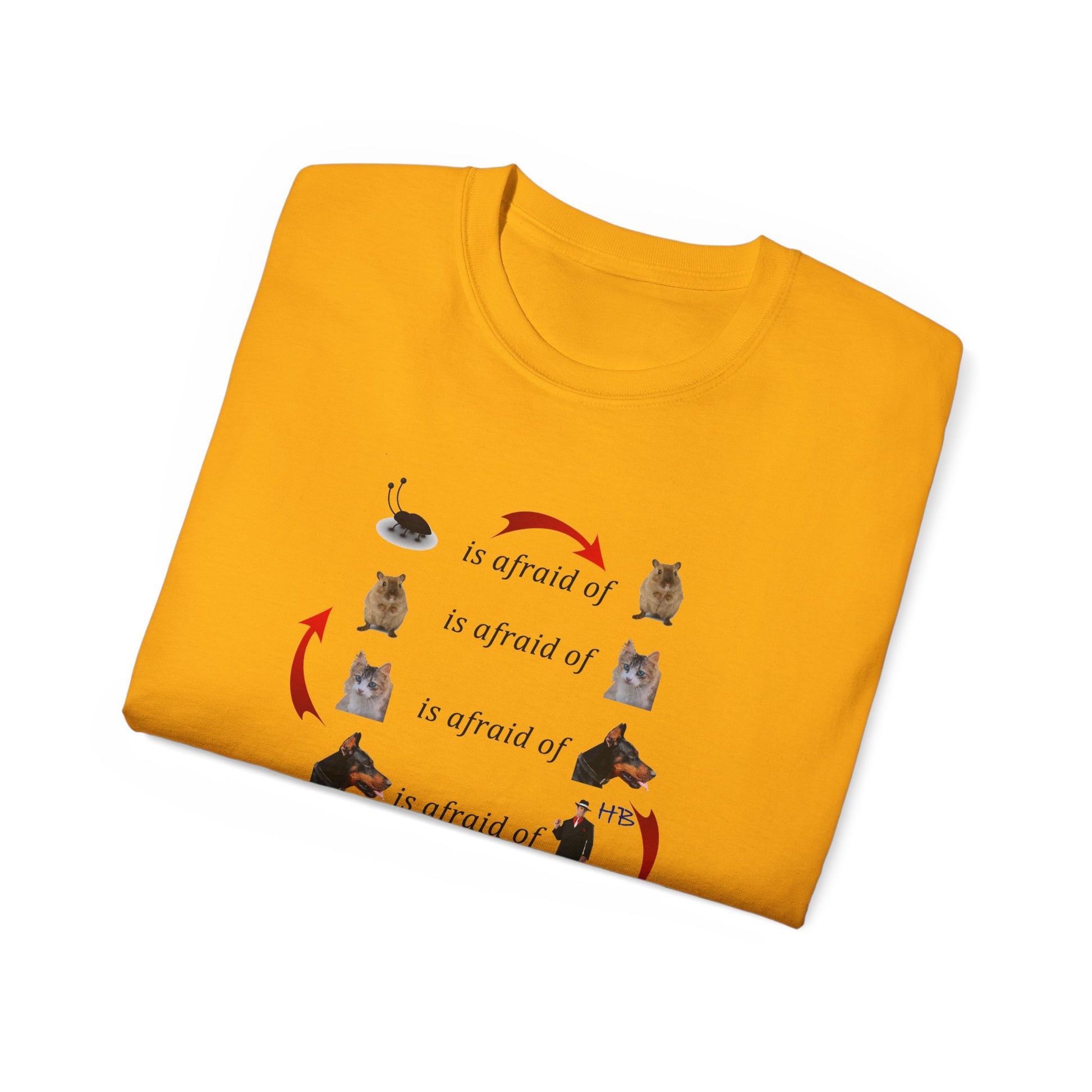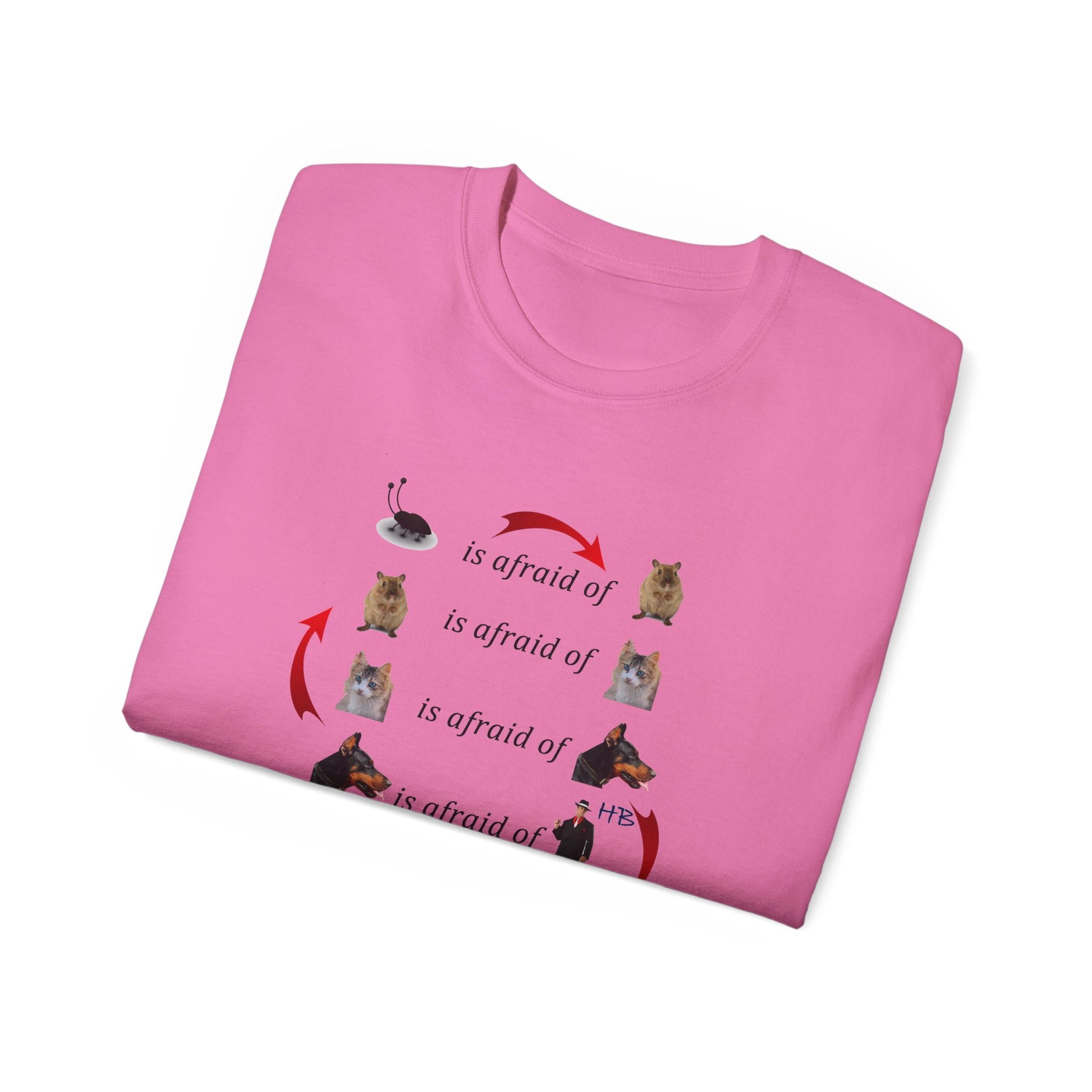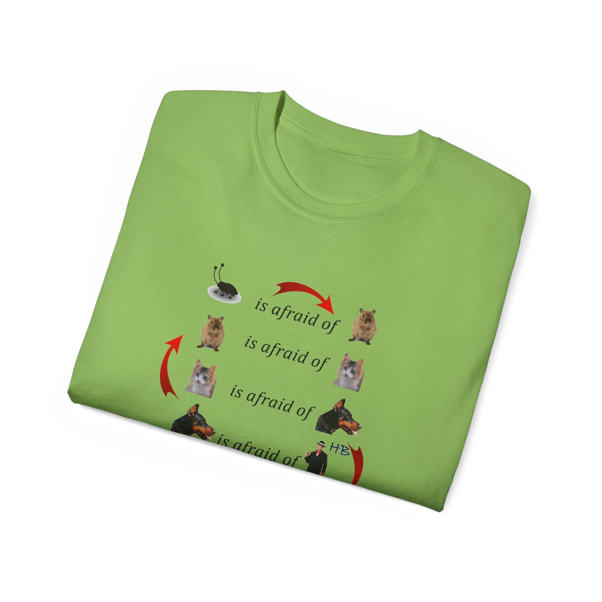 Introducing our hilarious tee shirt with a comical illustration of a never-ending cycle of fear. The image shows a scared cockroach, followed by a frightened mouse, and a timid cat, which is then followed by a fearful dog, and finally, a terrified man who is frightened of a woman who, in turn, is scared of a cockroach, completing the vicious circle. This design highlights the absurdity of fear and how it can create a never-ending cycle. Get your hands on this tee shirt to add some humor to your wardrobe and remind yourself not to get caught up in the never-ending cycle of fear. Up to you and your friends to decide who is king of the jungle.