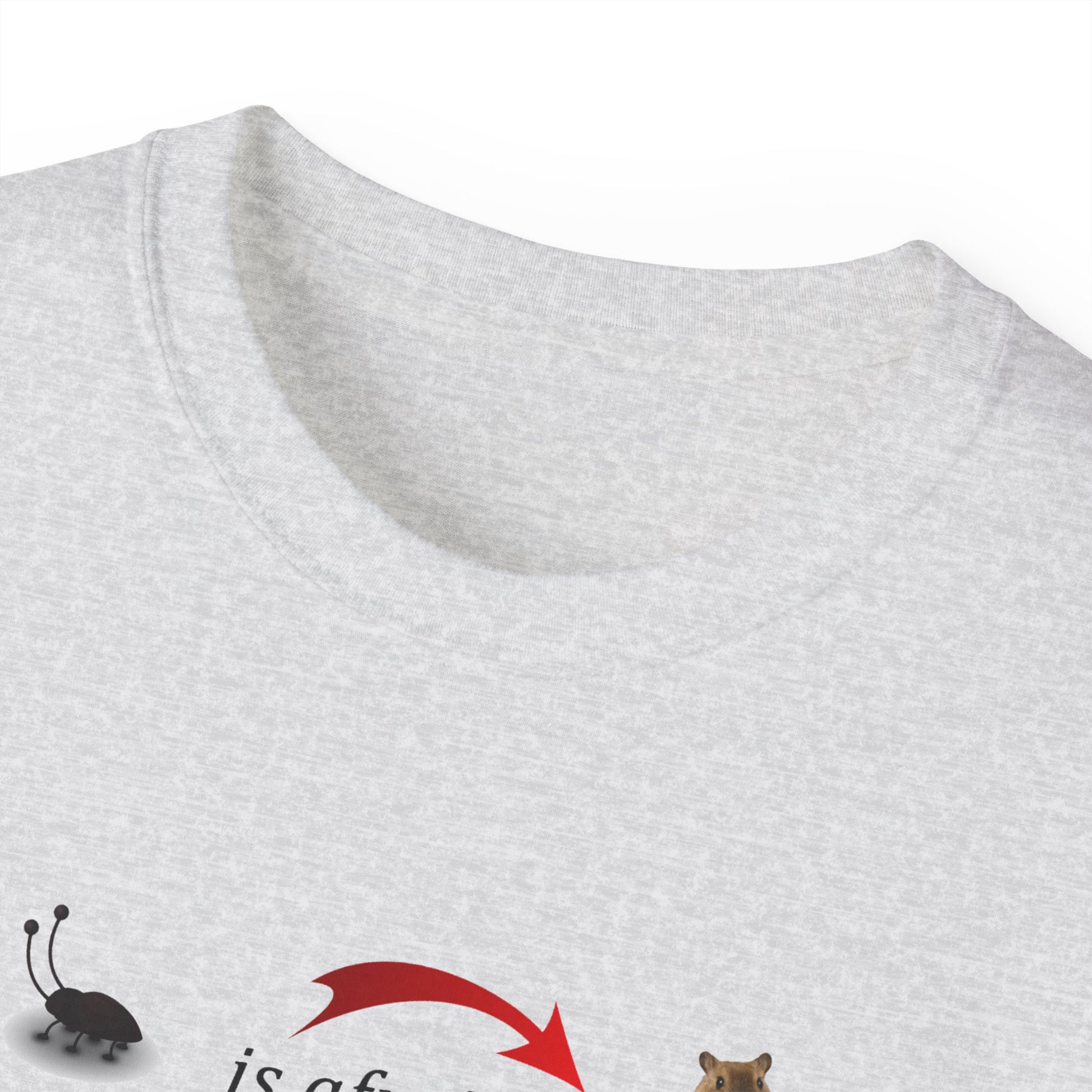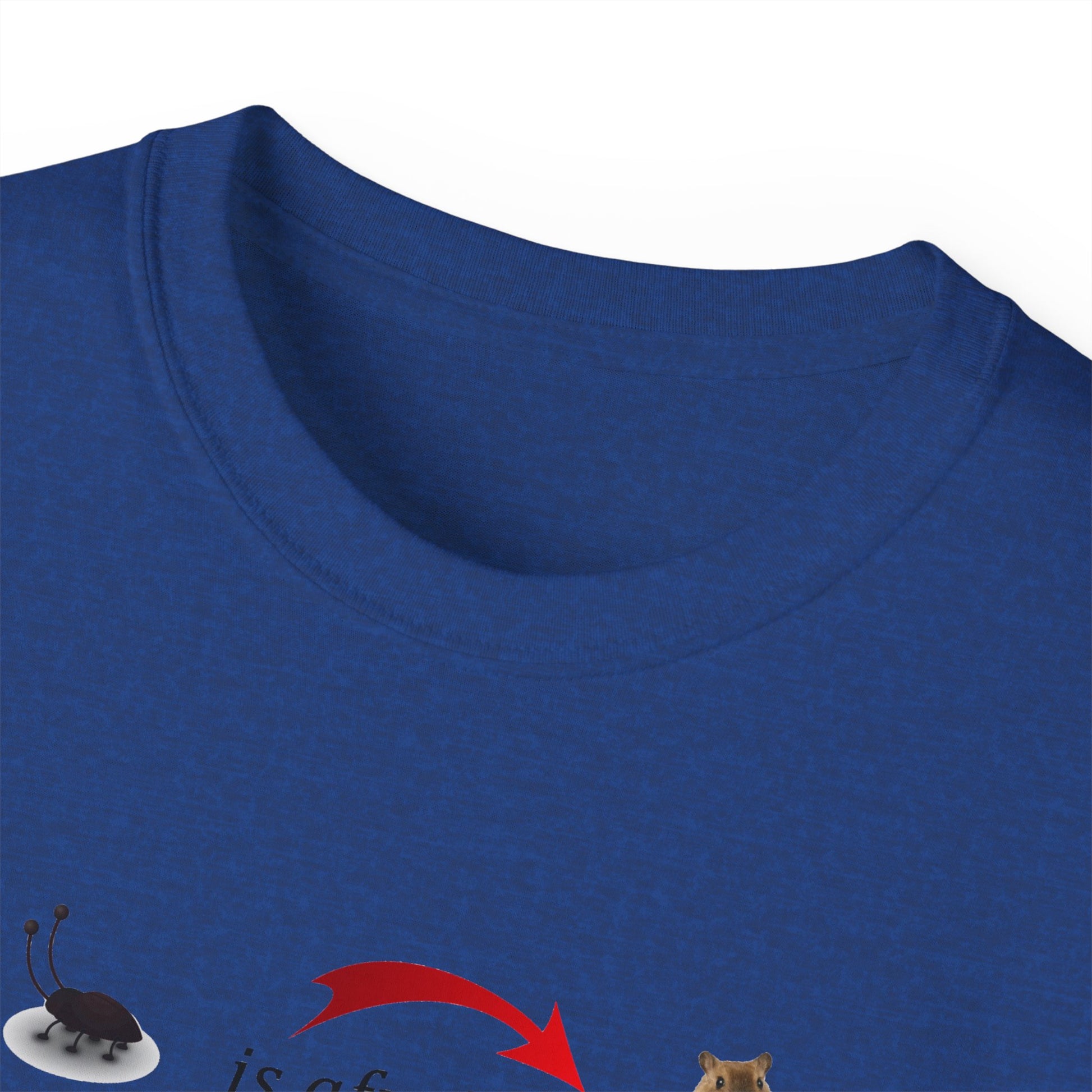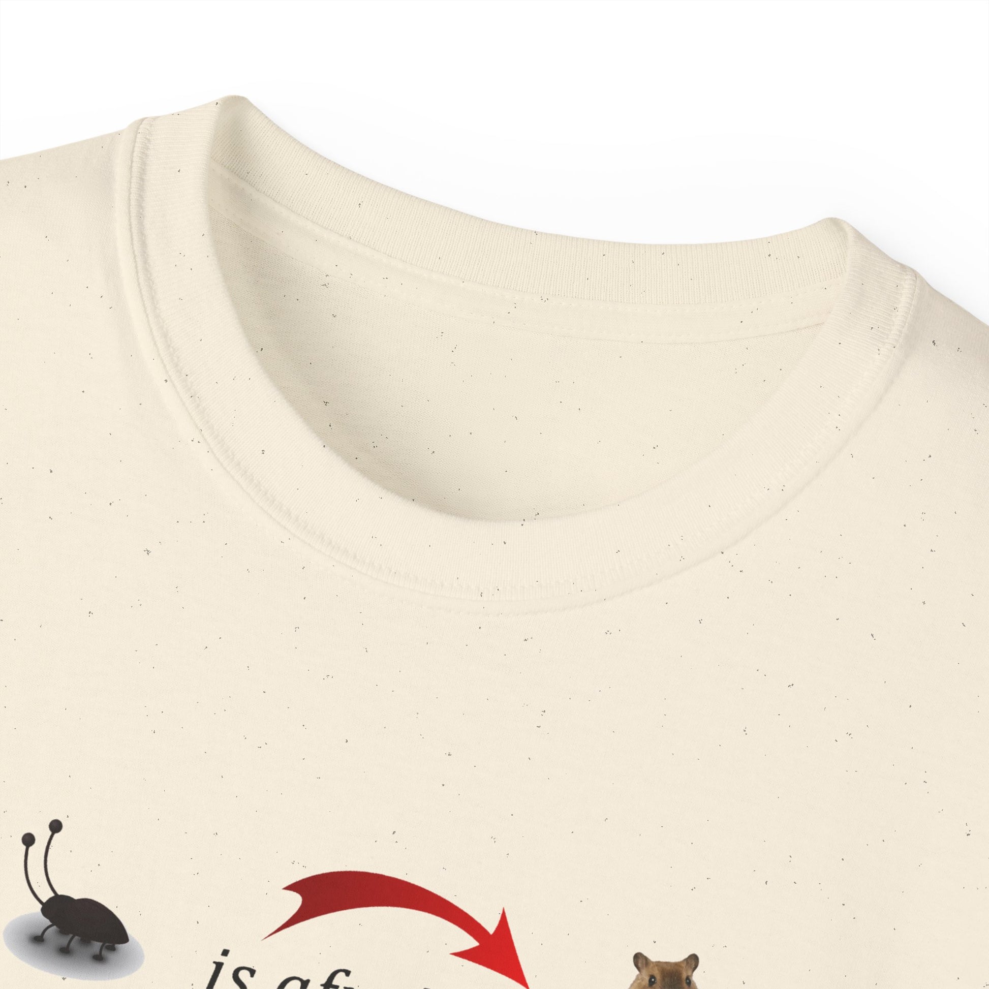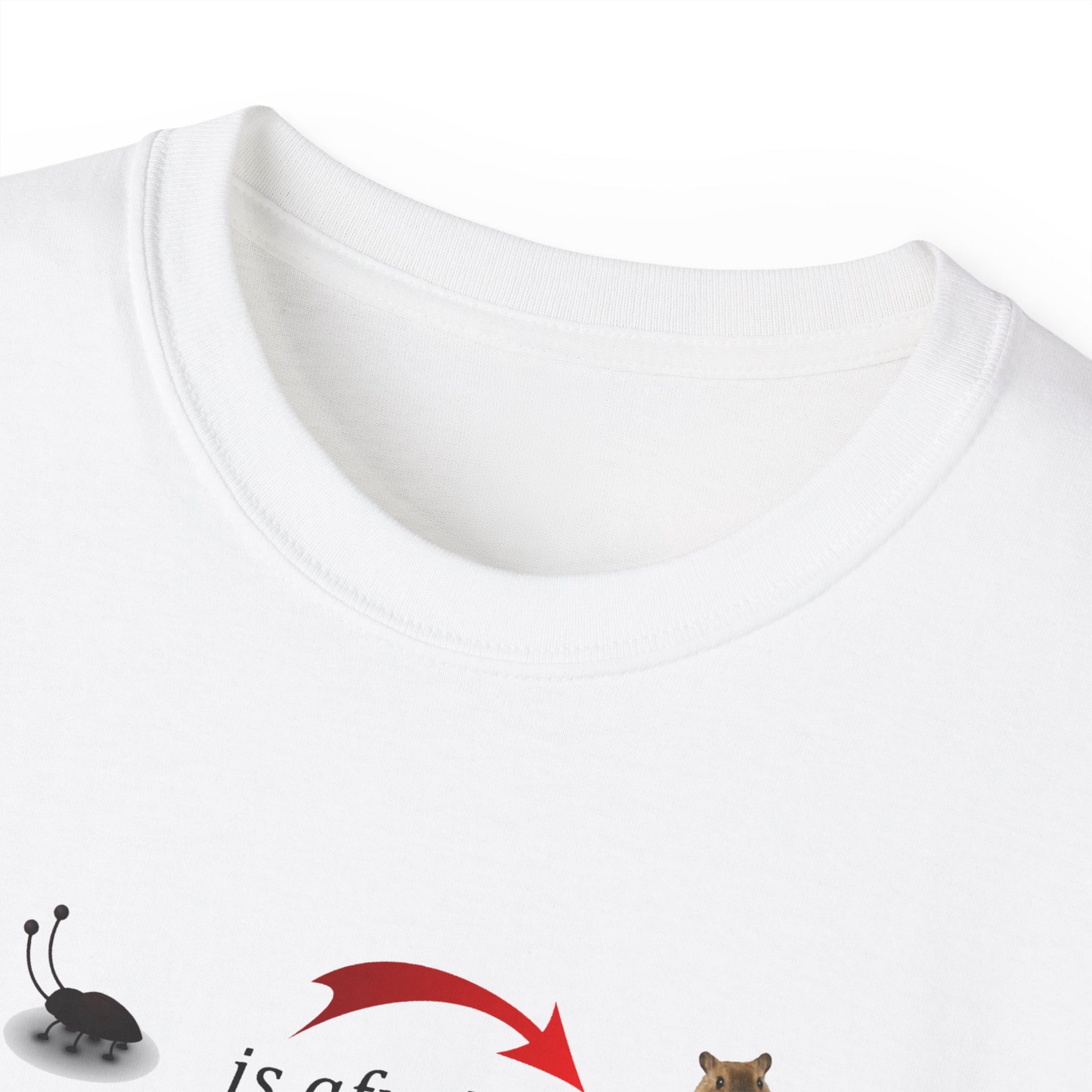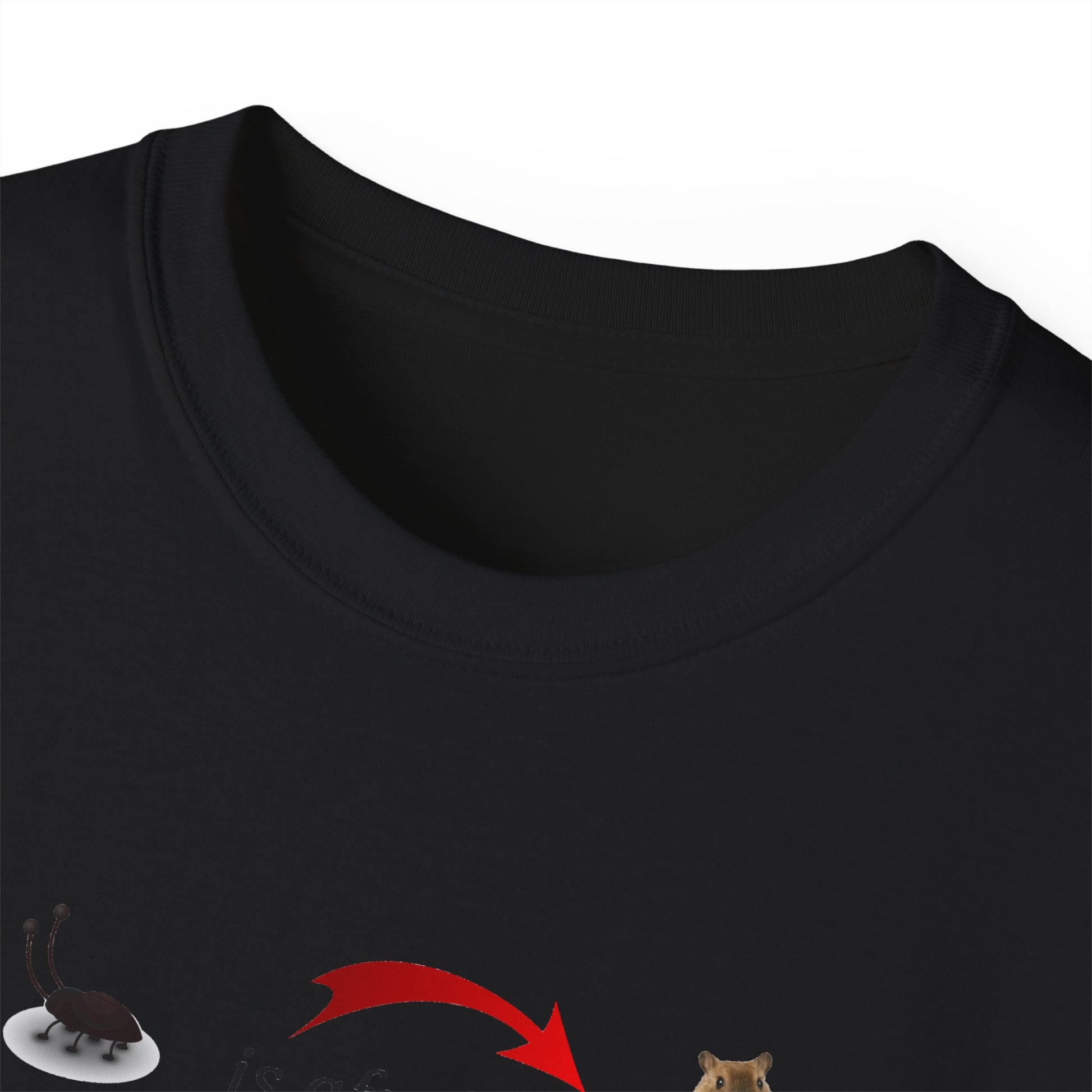 Introducing our hilarious tee shirt with a comical illustration of a never-ending cycle of fear. The image shows a scared cockroach, followed by a frightened mouse, and a timid cat, which is then followed by a fearful dog, and finally, a terrified man who is frightened of a woman who, in turn, is scared of a cockroach, completing the vicious circle. This design highlights the absurdity of fear and how it can create a never-ending cycle. Get your hands on this tee shirt to add some humor to your wardrobe and remind yourself not to get caught up in the never-ending cycle of fear. Up to you and your friends to decide who is king of the jungle.