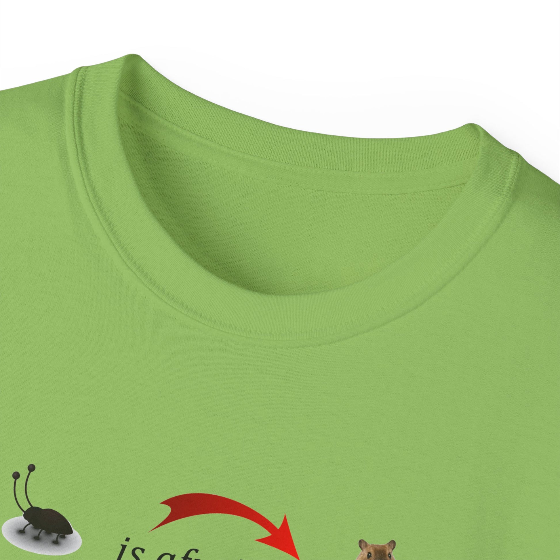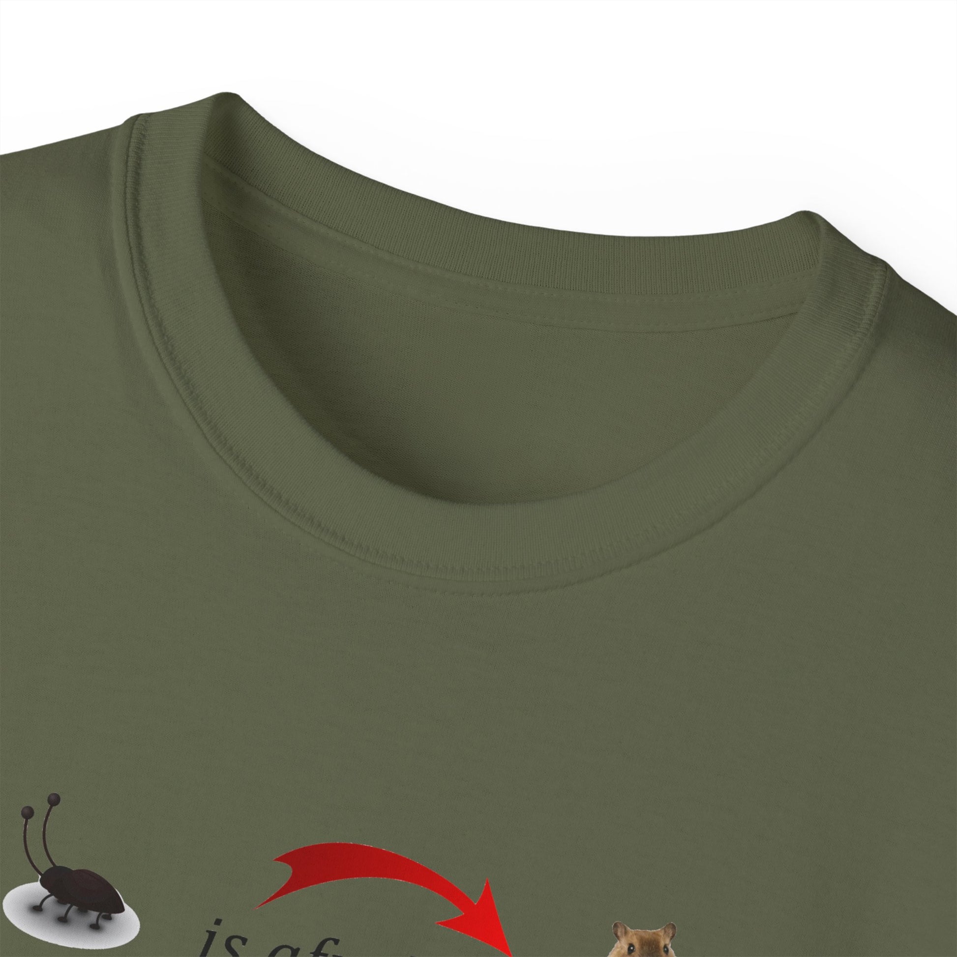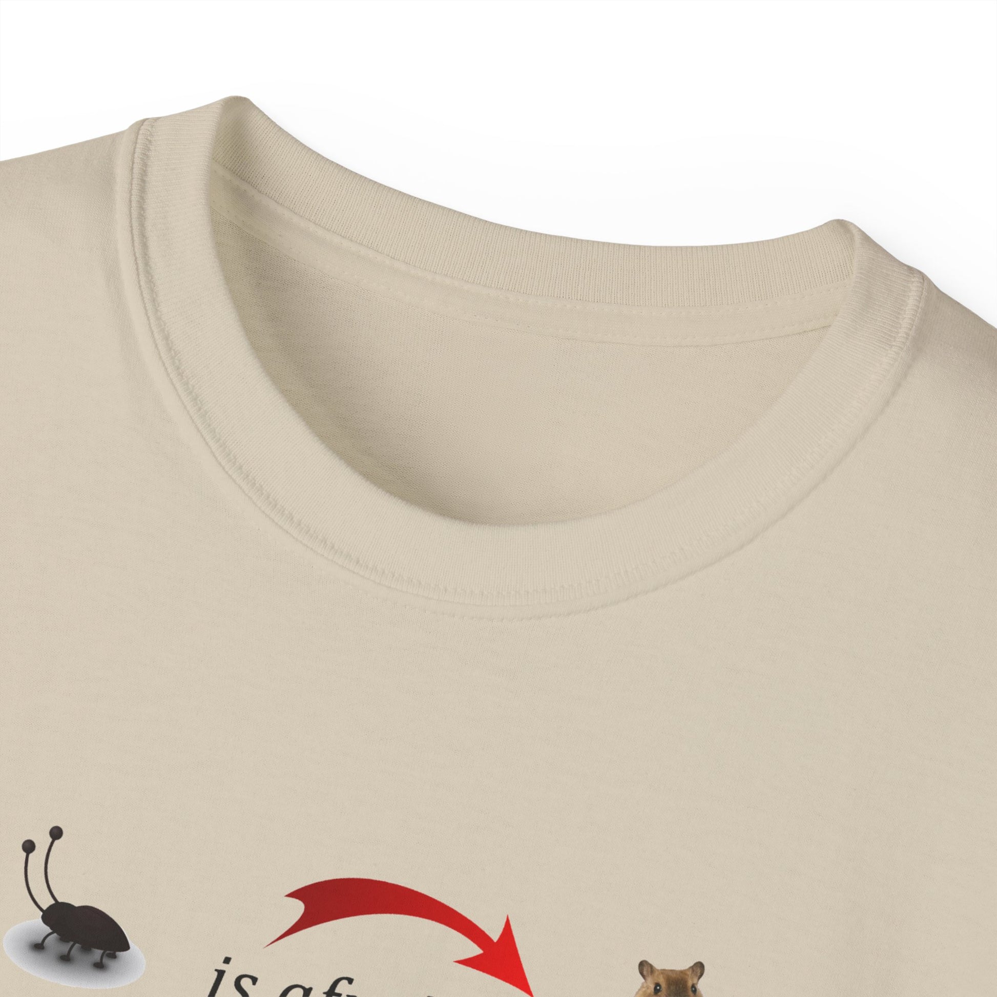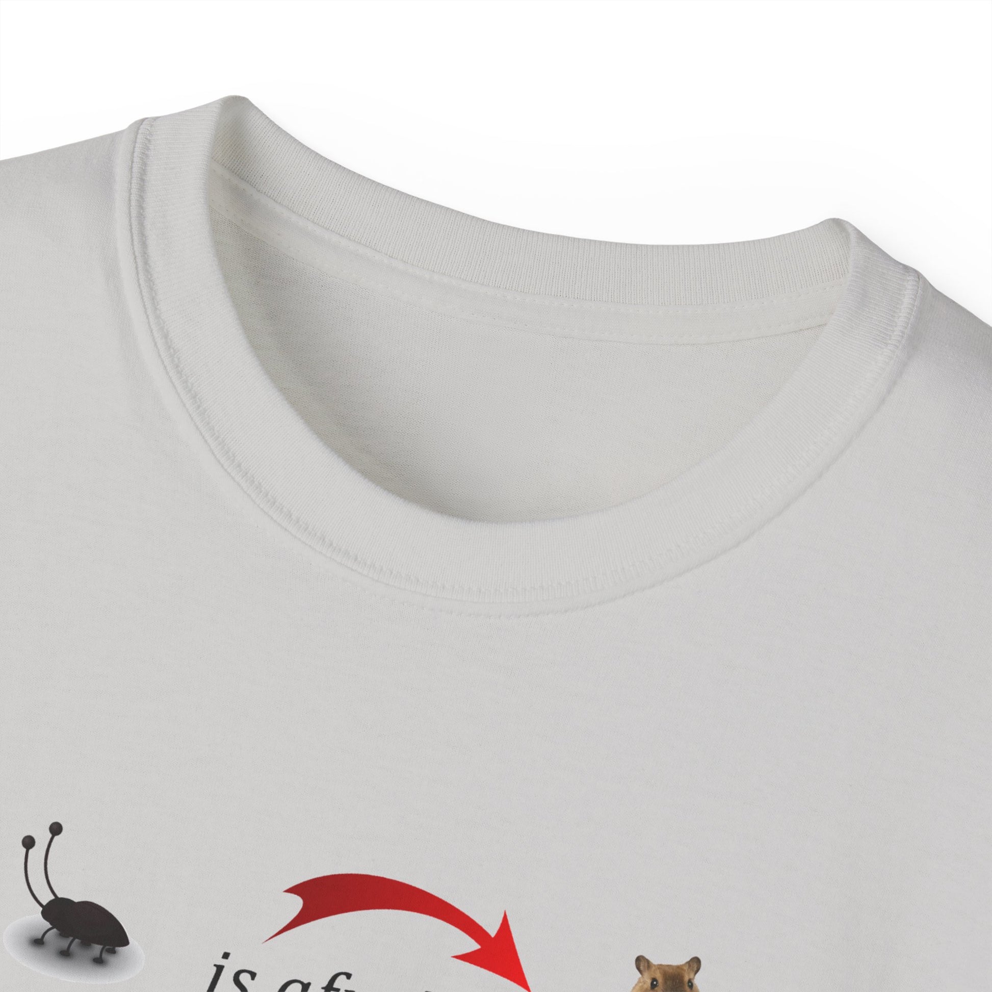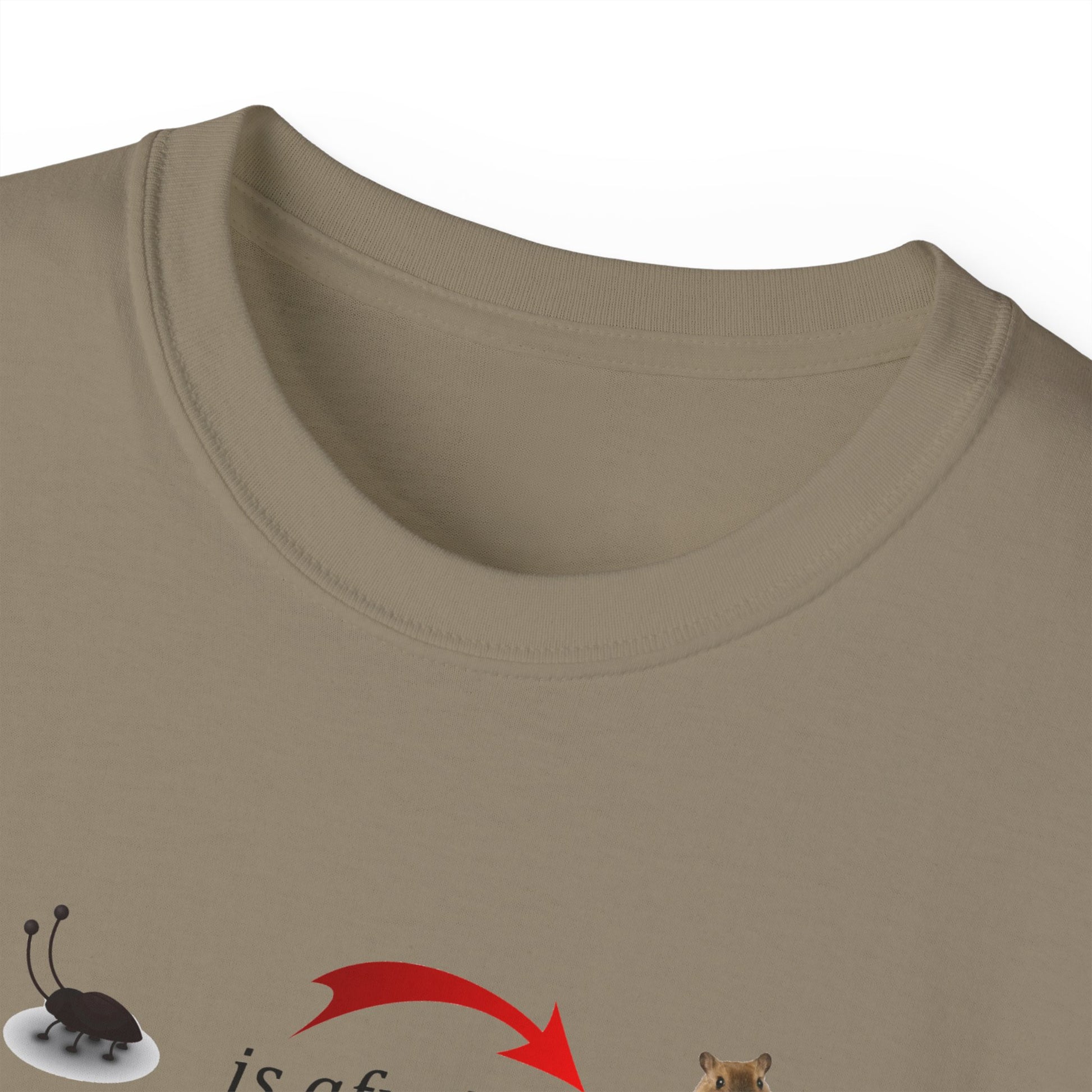 Introducing our hilarious tee shirt with a comical illustration of a never-ending cycle of fear. The image shows a scared cockroach, followed by a frightened mouse, and a timid cat, which is then followed by a fearful dog, and finally, a terrified man who is frightened of a woman who, in turn, is scared of a cockroach, completing the vicious circle. This design highlights the absurdity of fear and how it can create a never-ending cycle. Get your hands on this tee shirt to add some humor to your wardrobe and remind yourself not to get caught up in the never-ending cycle of fear. Up to you and your friends to decide who is king of the jungle.