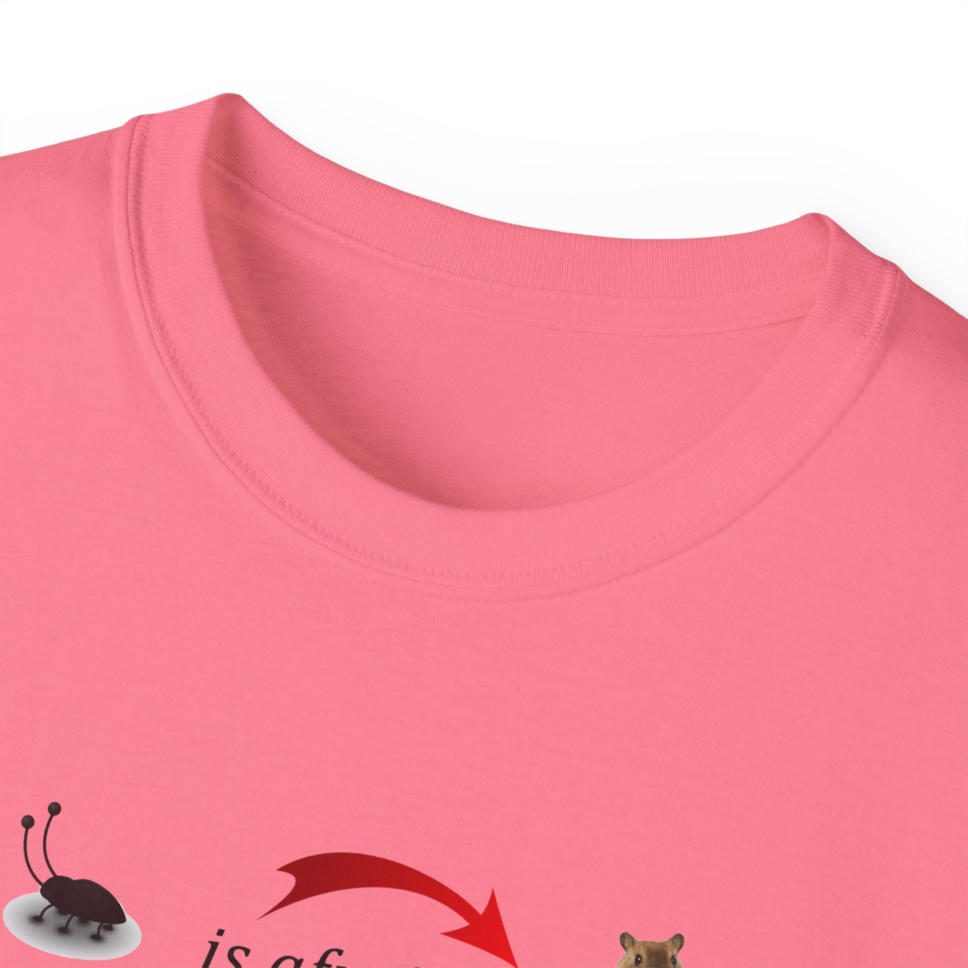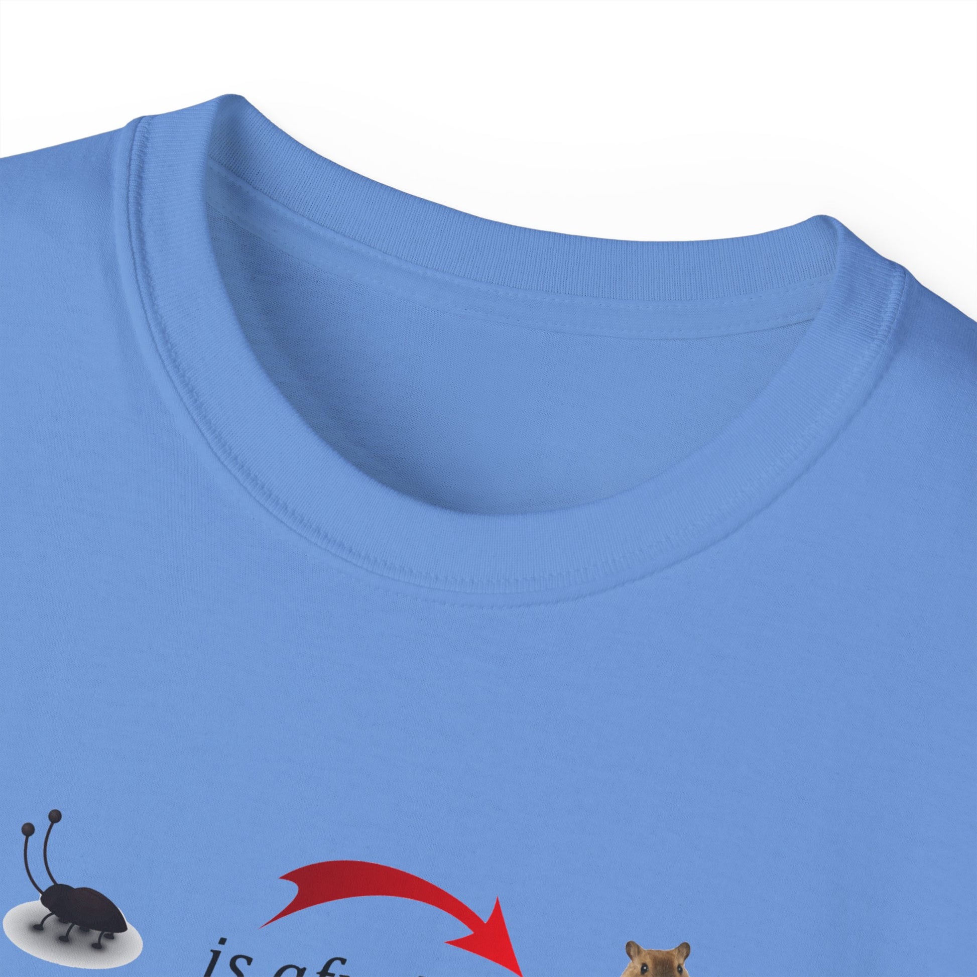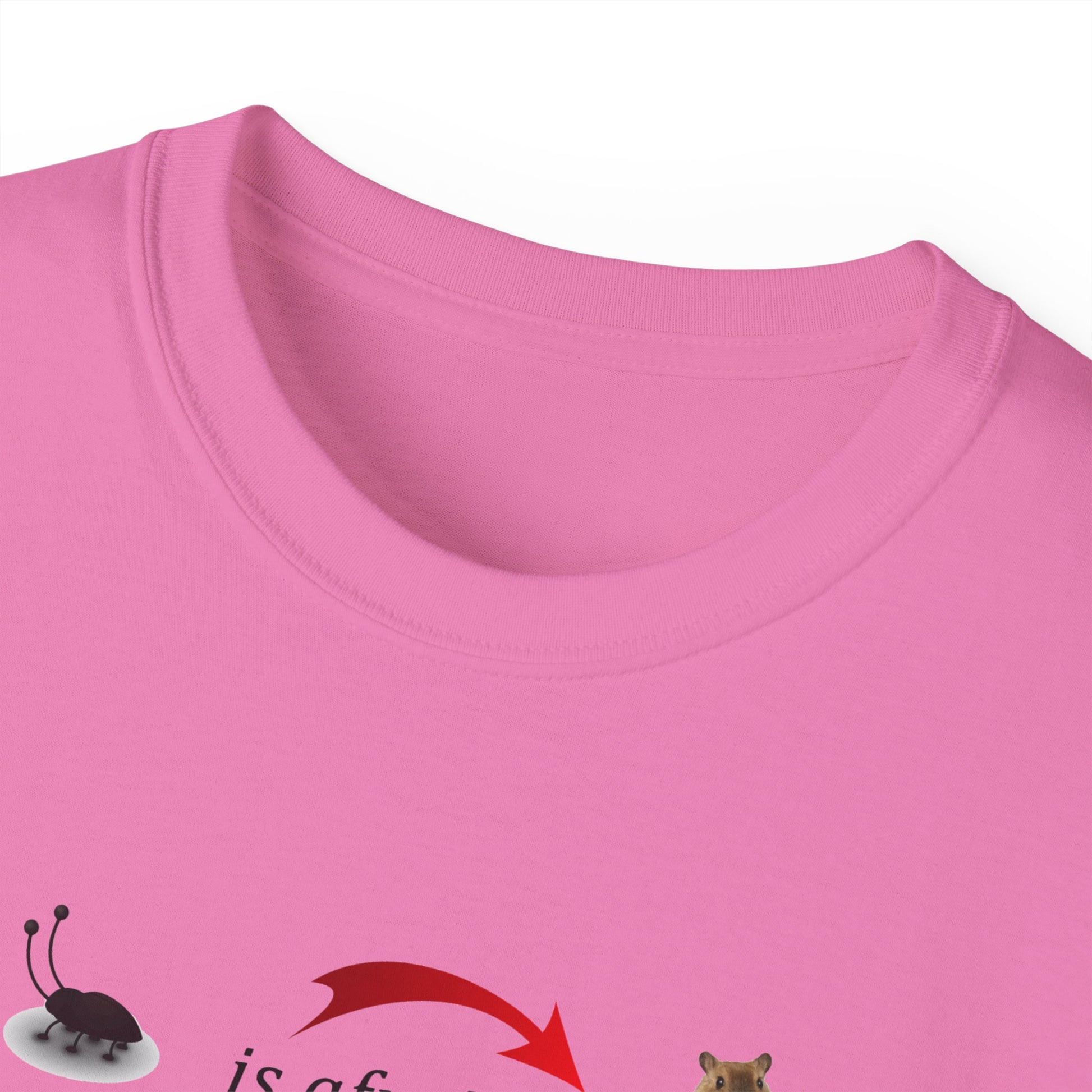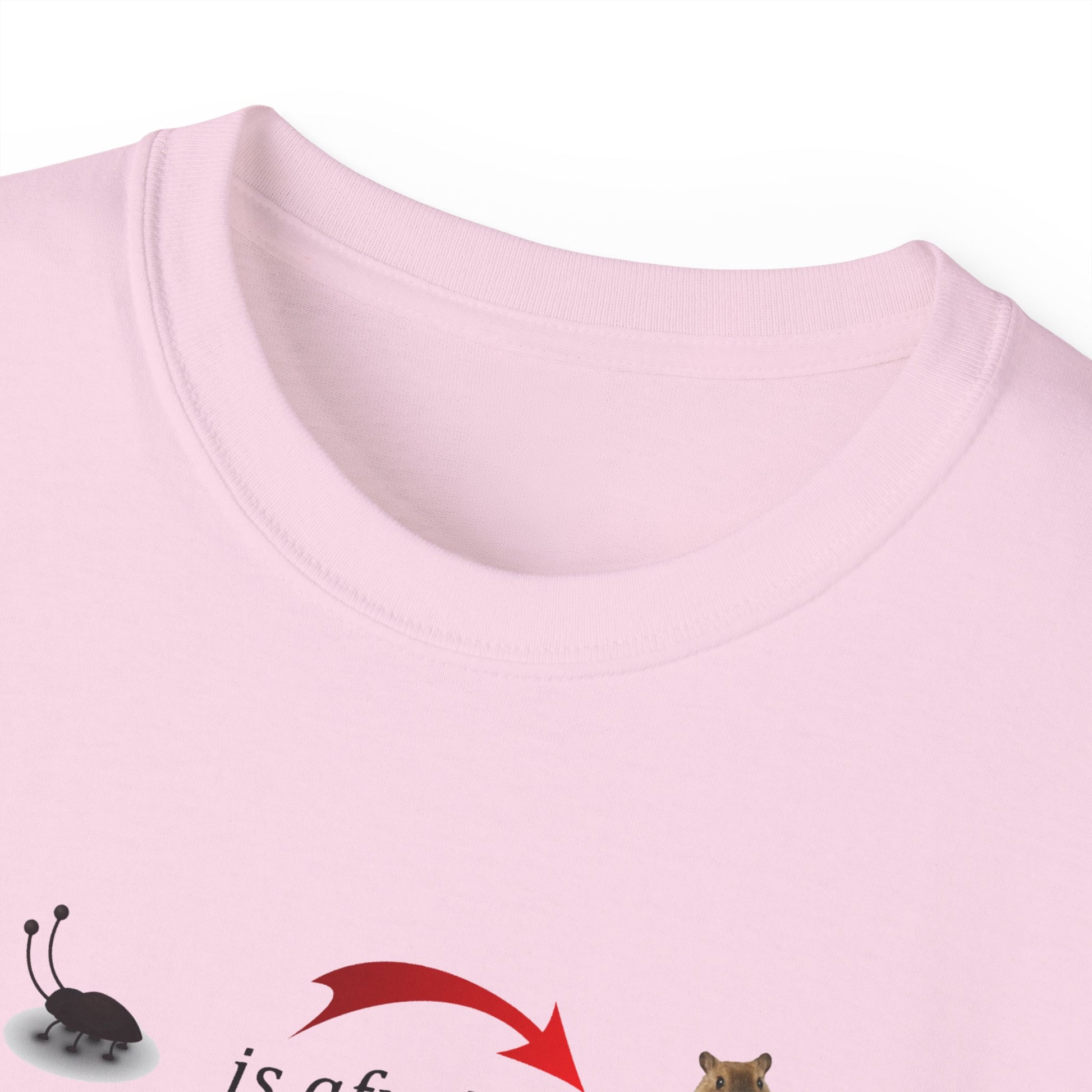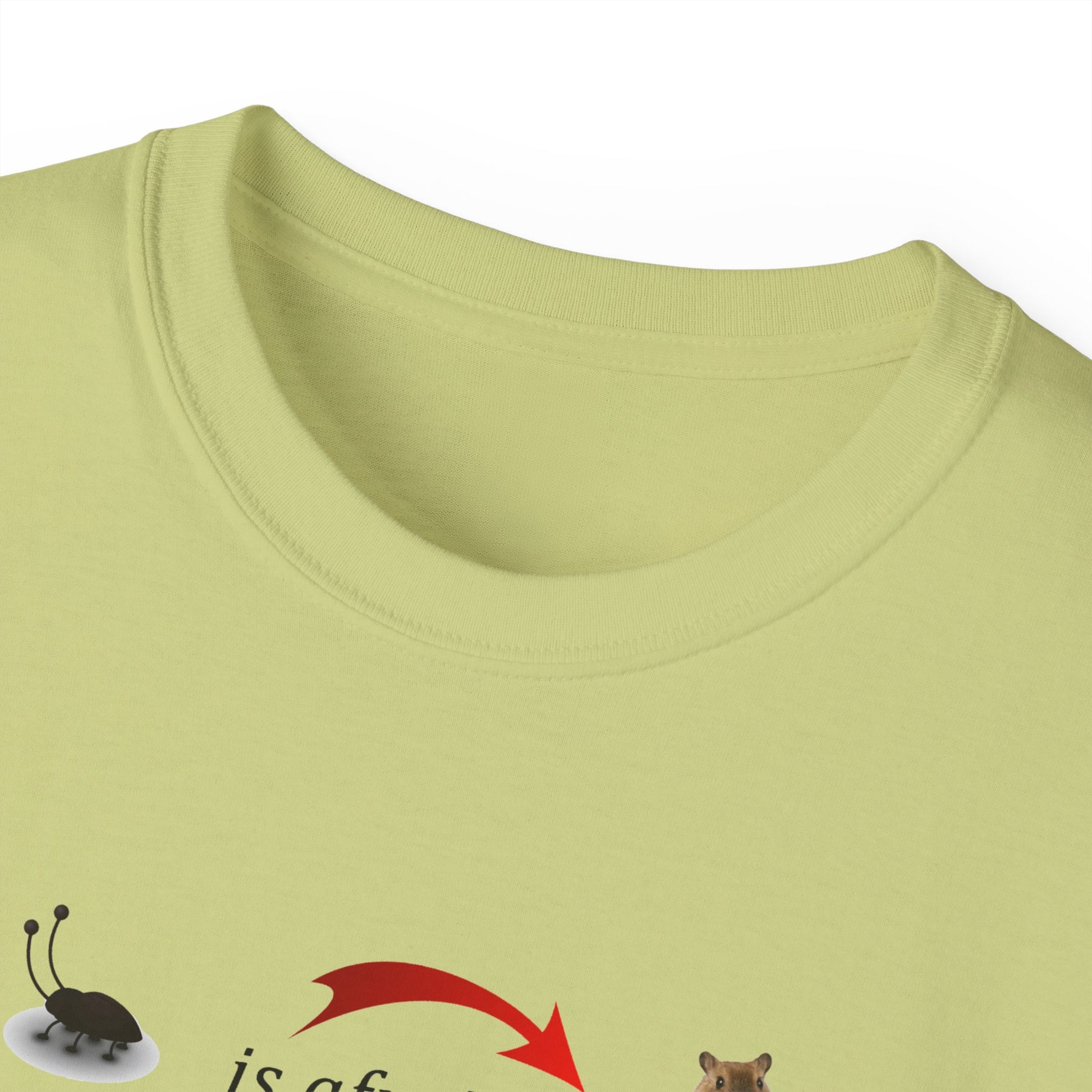 Introducing our hilarious tee shirt with a comical illustration of a never-ending cycle of fear. The image shows a scared cockroach, followed by a frightened mouse, and a timid cat, which is then followed by a fearful dog, and finally, a terrified man who is frightened of a woman who, in turn, is scared of a cockroach, completing the vicious circle. This design highlights the absurdity of fear and how it can create a never-ending cycle. Get your hands on this tee shirt to add some humor to your wardrobe and remind yourself not to get caught up in the never-ending cycle of fear. Up to you and your friends to decide who is king of the jungle.