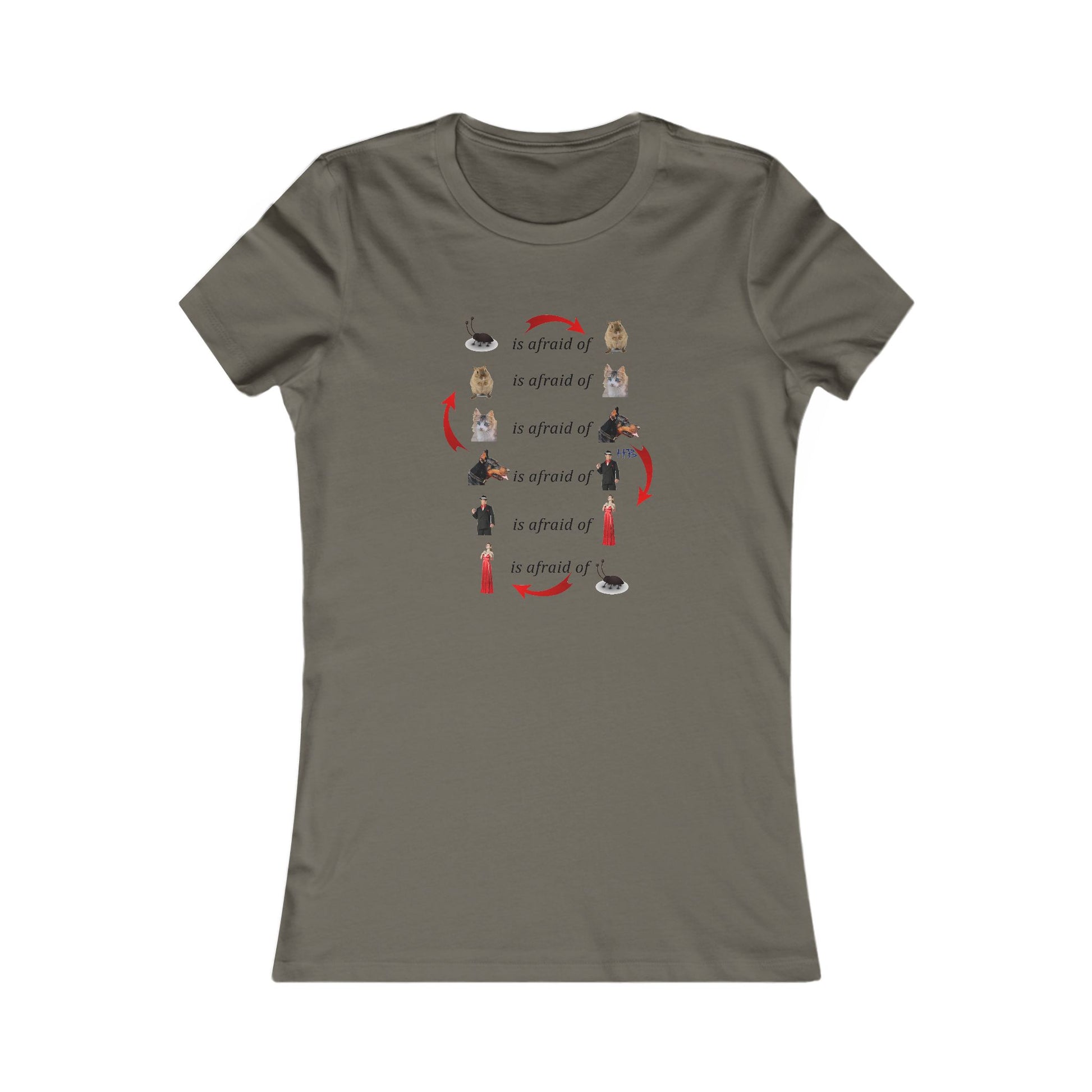 Introducing our hilarious tee shirt with a comical illustration of a never-ending cycle of fear. The image shows a scared cockroach, followed by a frightened mouse, and a timid cat, which is then followed by a fearful dog, and finally, a terrified man who is frightened of a woman who, in turn, is scared of a cockroach, completing the vicious circle. This design highlights the absurdity of fear and how it can create a never-ending cycle. Get your hands on this tee shirt to add some humor to your wardrobe and remind yourself not to get caught up in the never-ending cycle of fear. Up to you and your friends to decide who is king of the jungle.