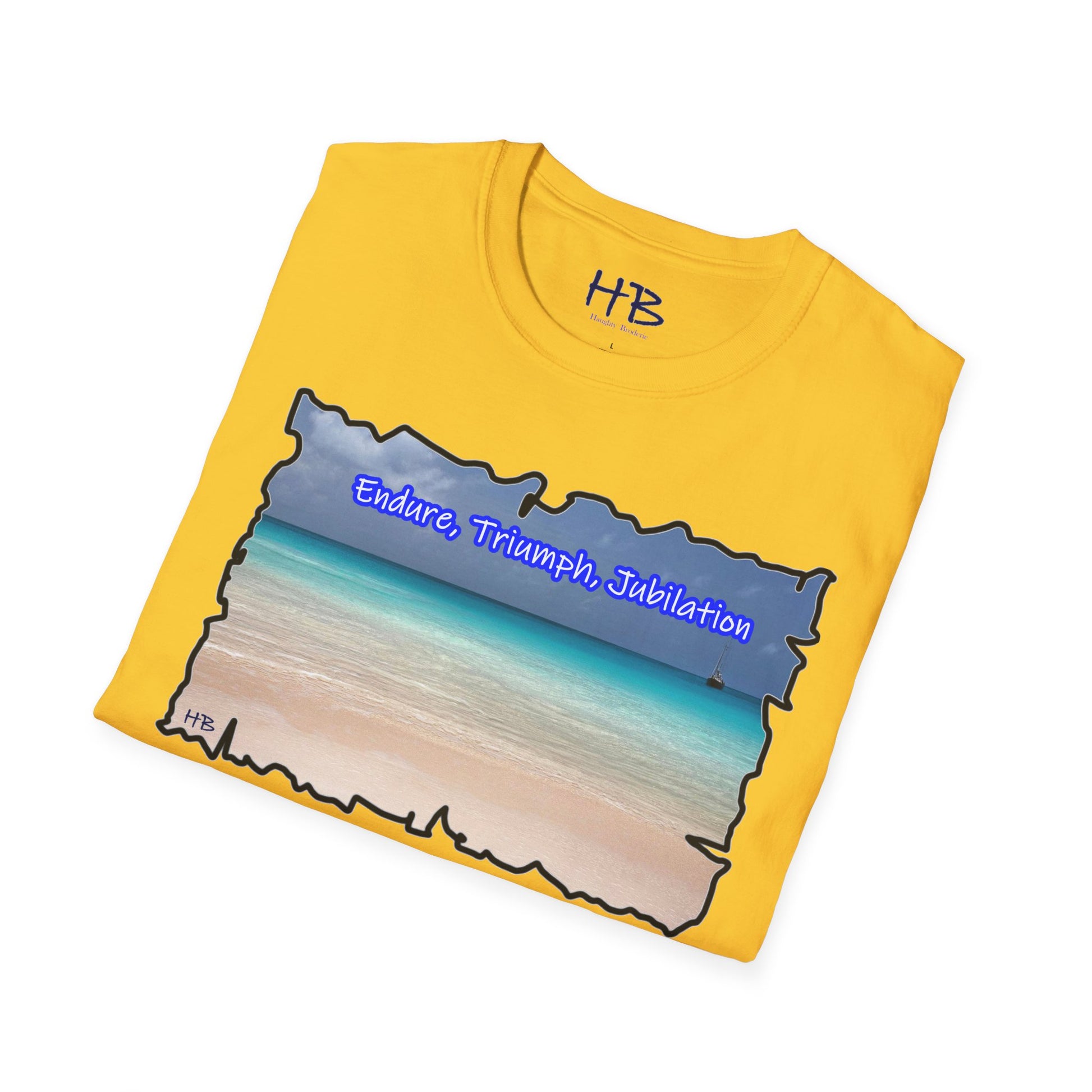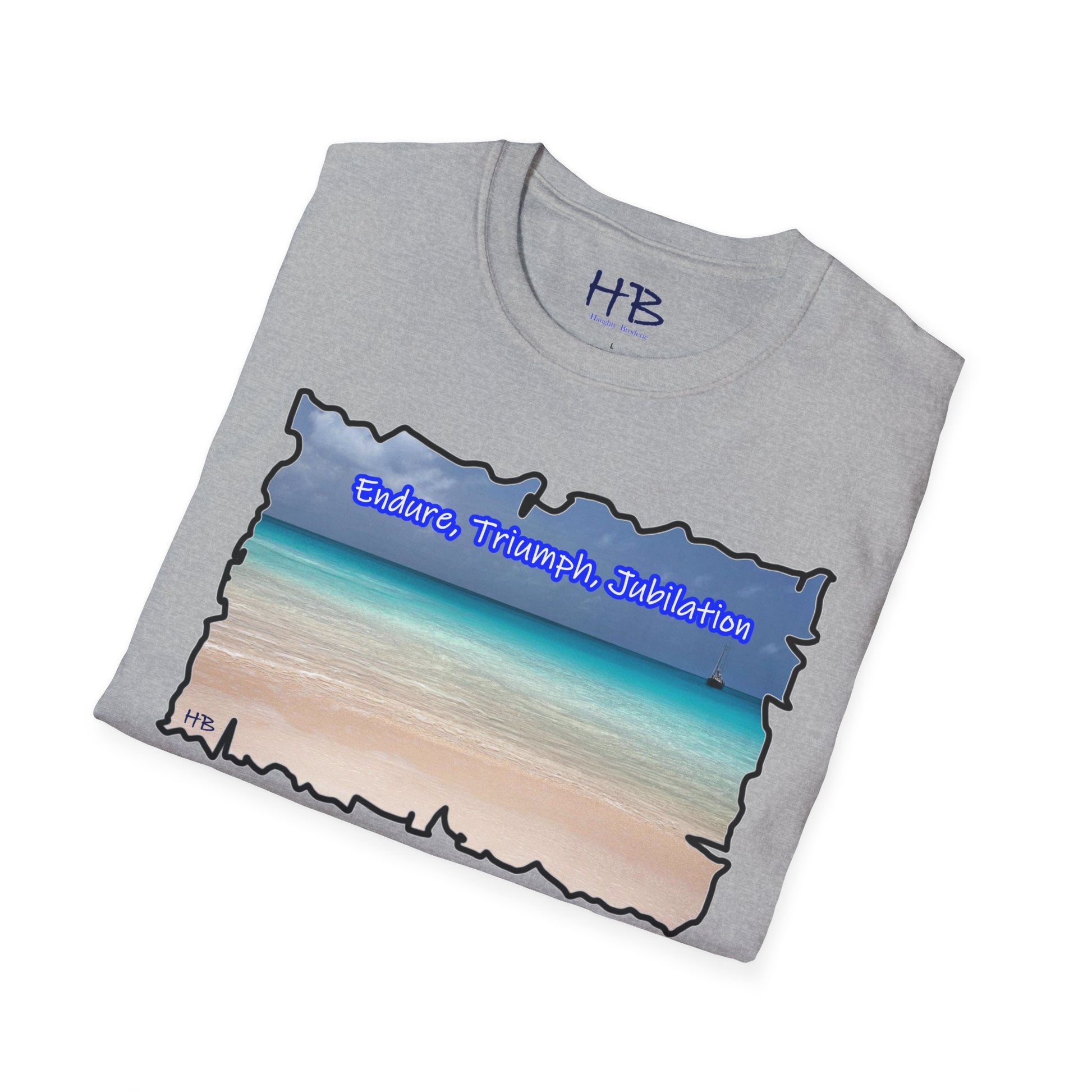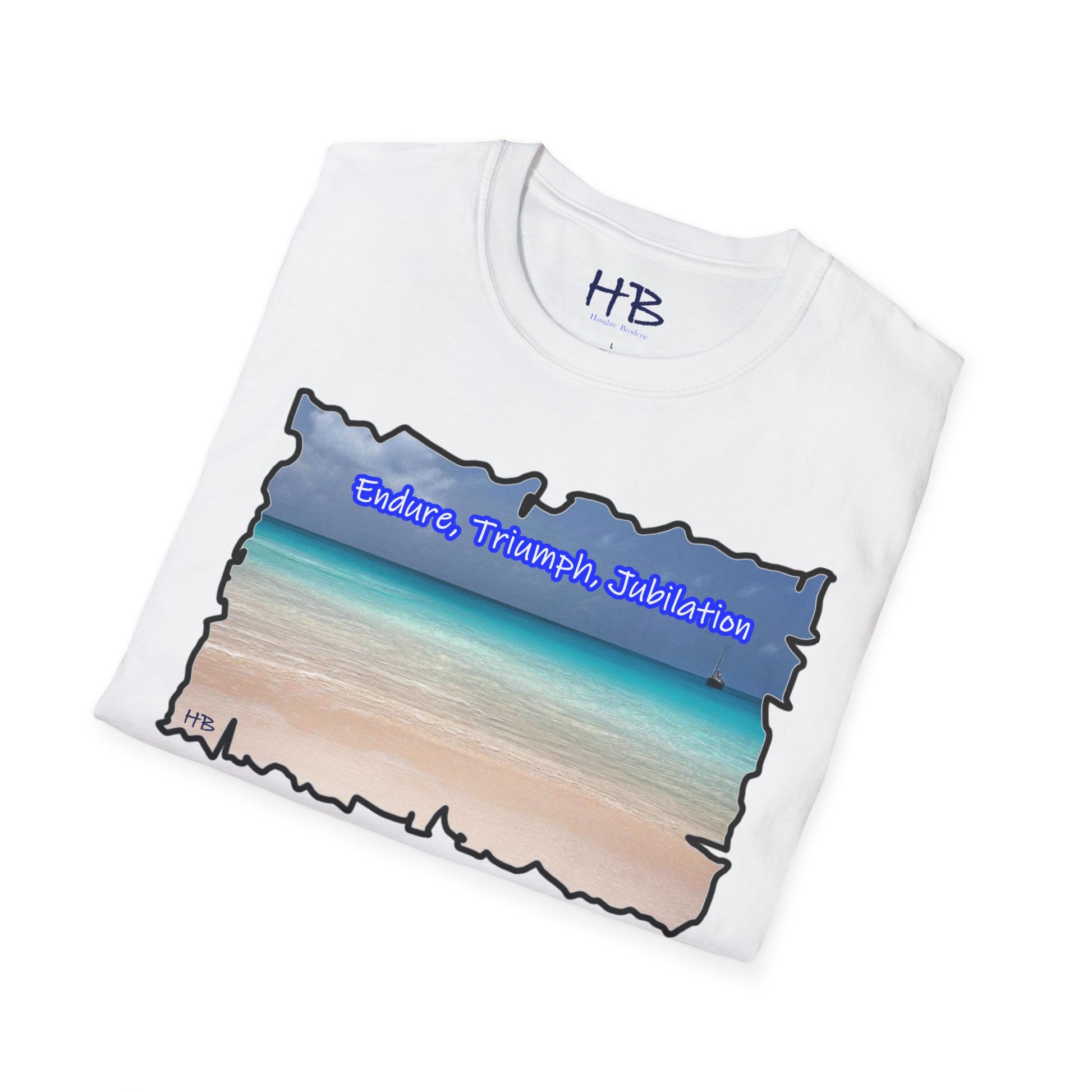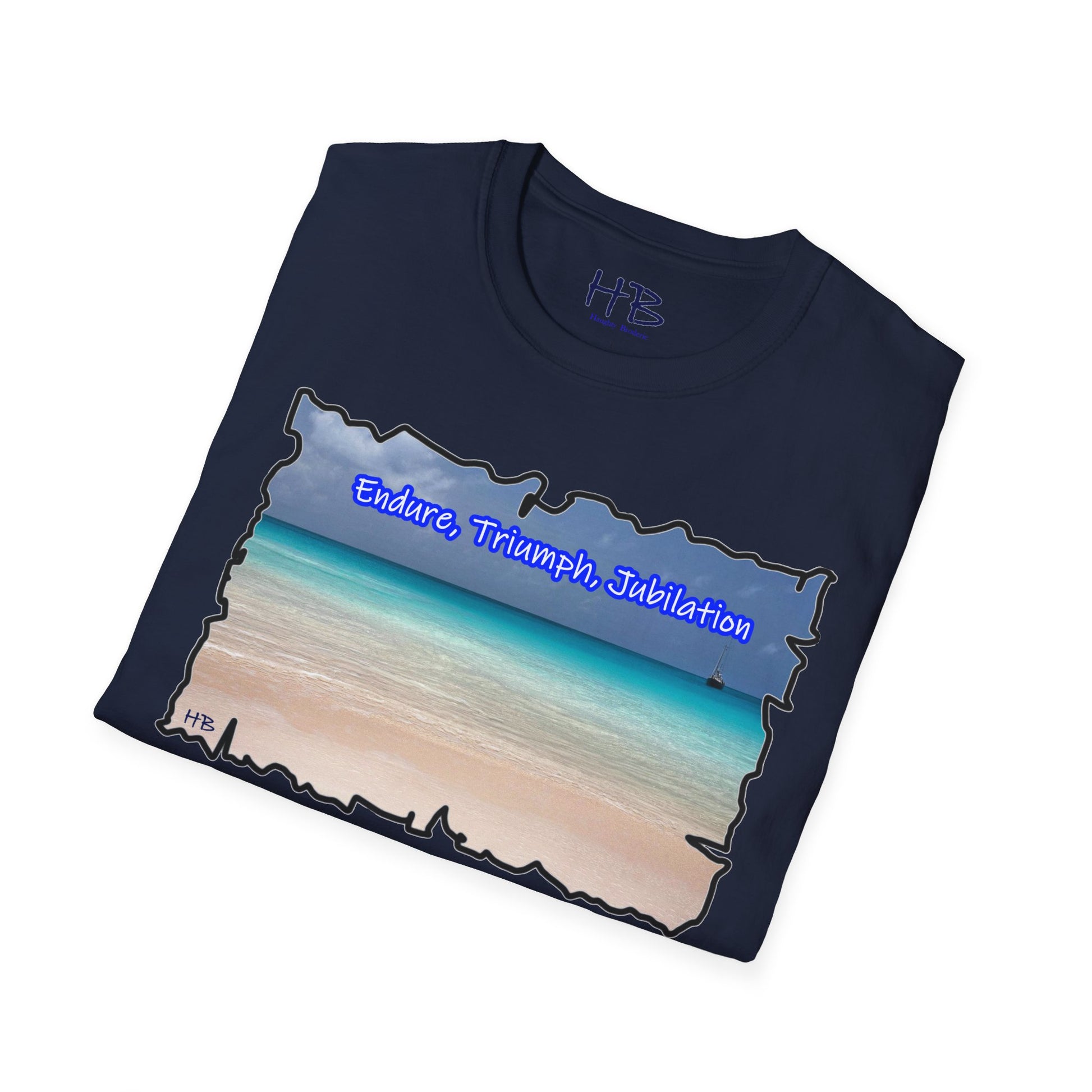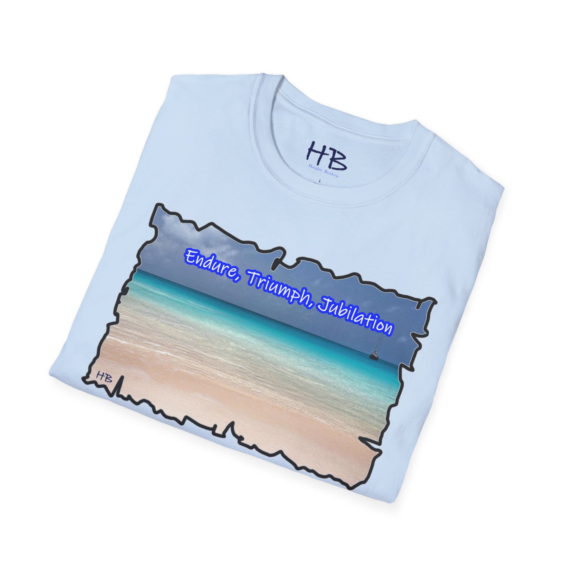Drape yourself in the epitome of paradise with our exclusive Tidal Triumph T-shirt, an embodiment of the breathtaking allure found in the most coveted touristic haven—the resplendent Bahamas. Behold the captivating image of the baby blue heavens seamlessly blending into the crystal-clear ocean, an aquatic masterpiece that mirrors serenity and tranquility. The ethereal scene is punctuated by the empowering mantra, "Endure, Triumph, Jubilation," an ode to the relentless pursuit of one's dreams.