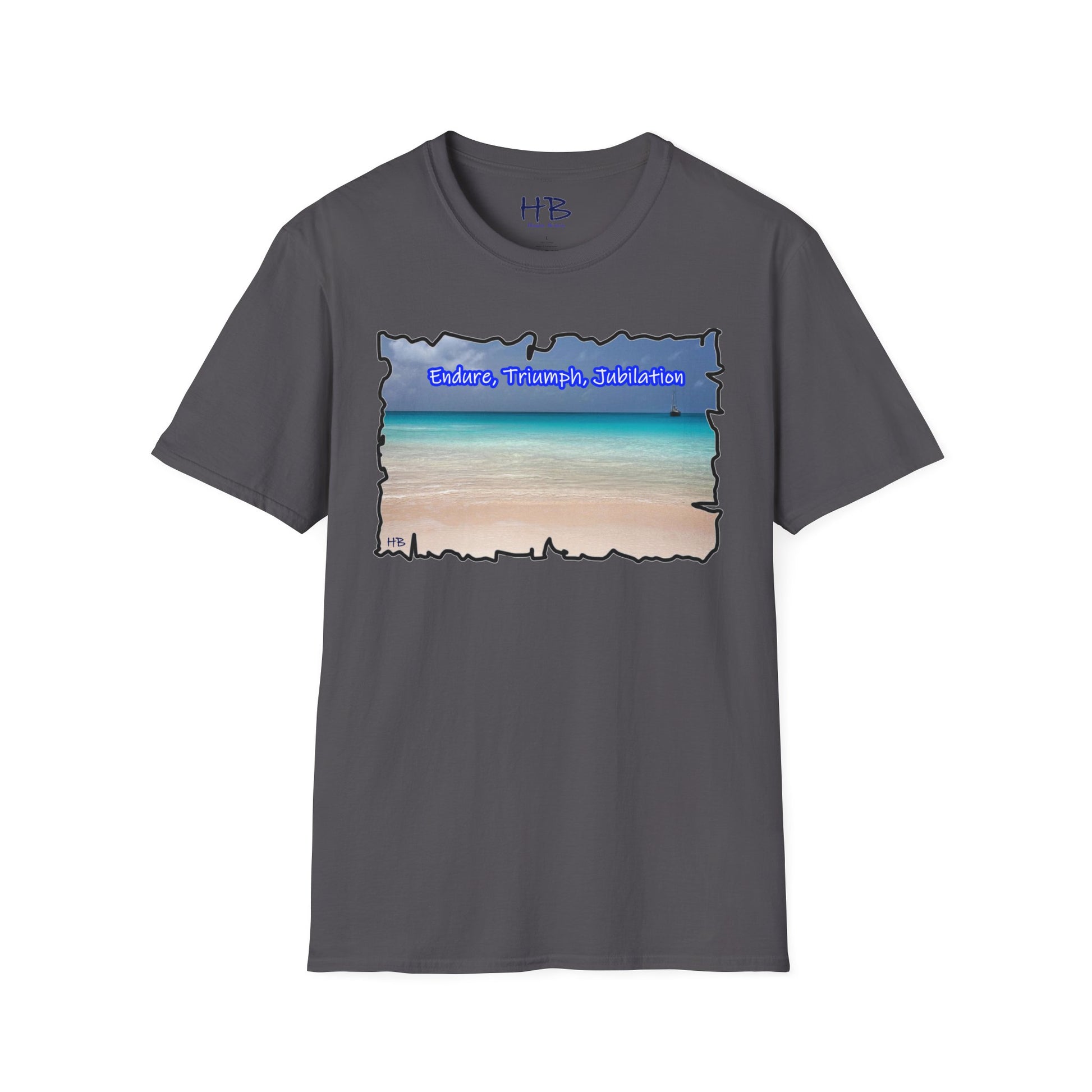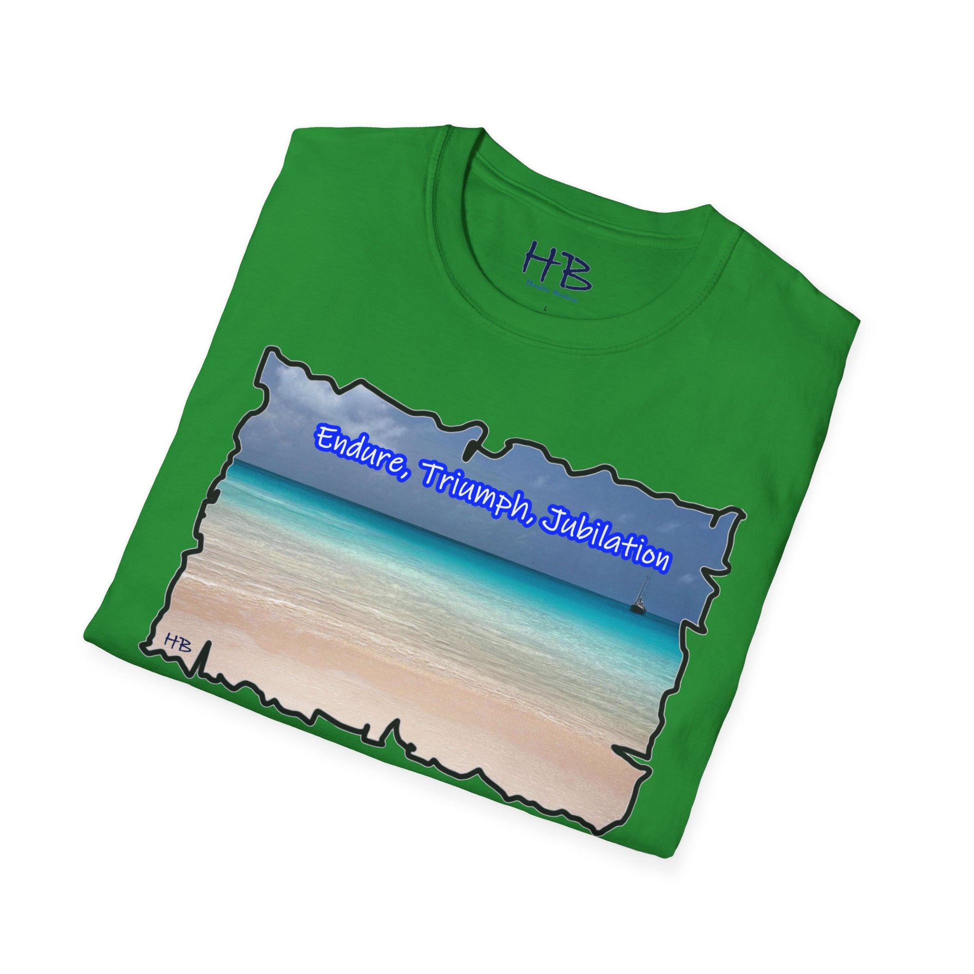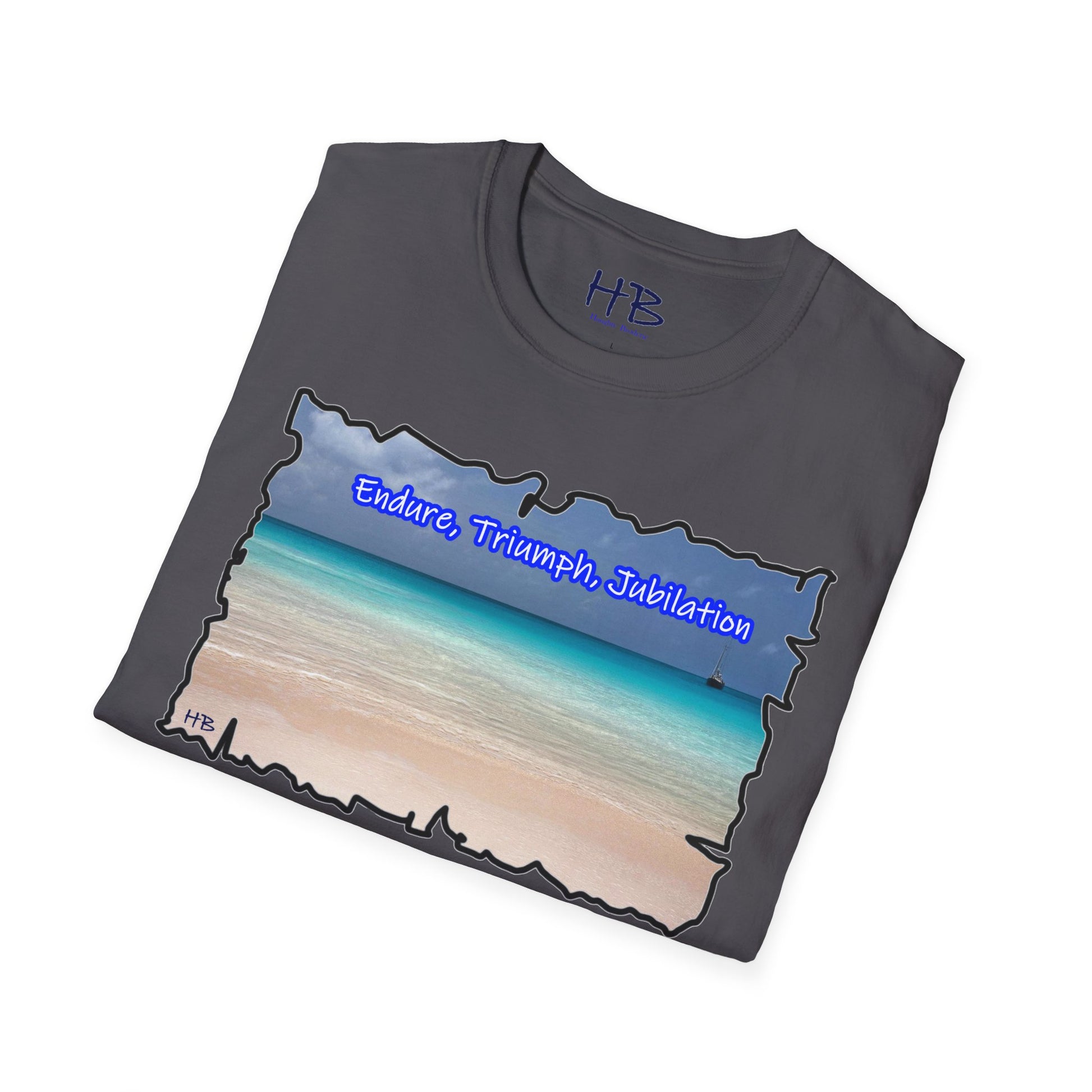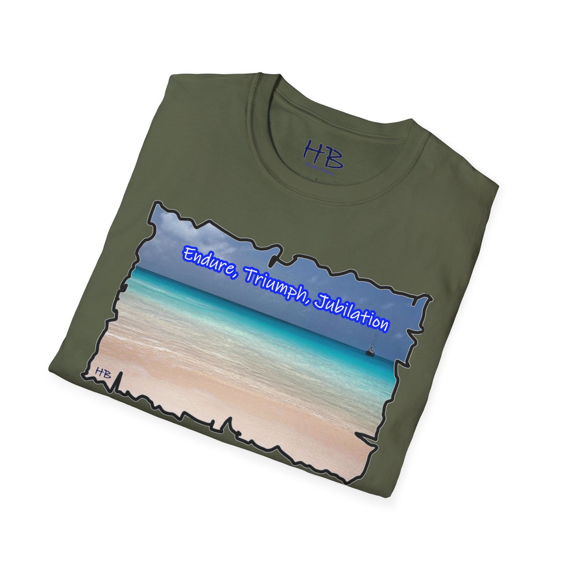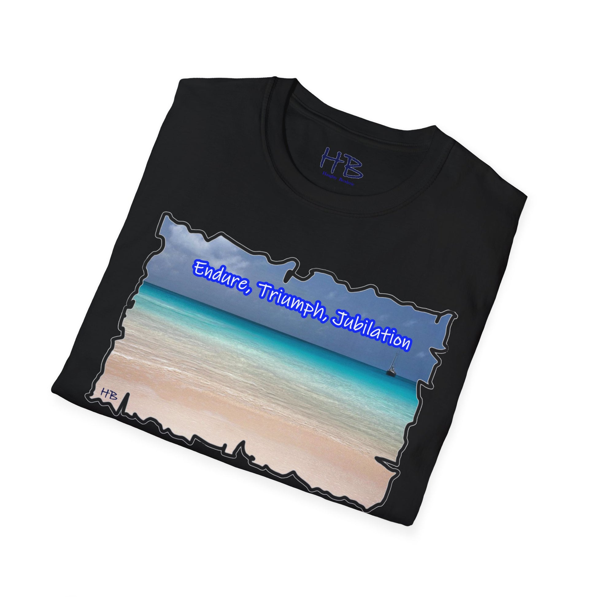 Drape yourself in the epitome of paradise with our exclusive Tidal Triumph T-shirt, an embodiment of the breathtaking allure found in the most coveted touristic haven—the resplendent Bahamas. Behold the captivating image of the baby blue heavens seamlessly blending into the crystal-clear ocean, an aquatic masterpiece that mirrors serenity and tranquility. The ethereal scene is punctuated by the empowering mantra, "Endure, Triumph, Jubilation," an ode to the relentless pursuit of one's dreams.