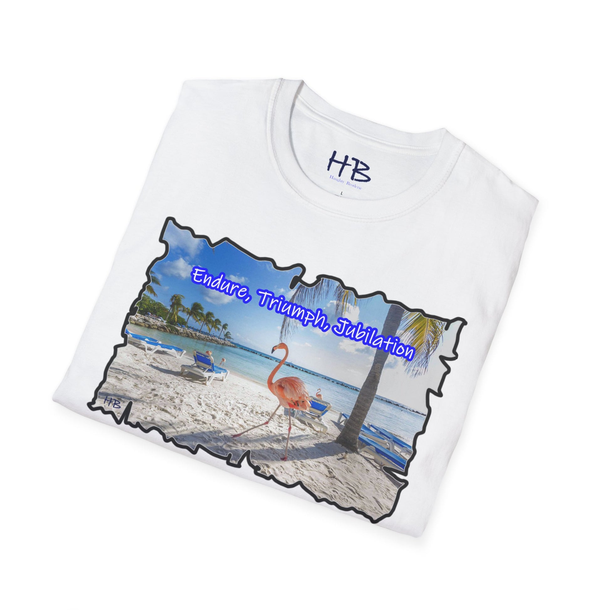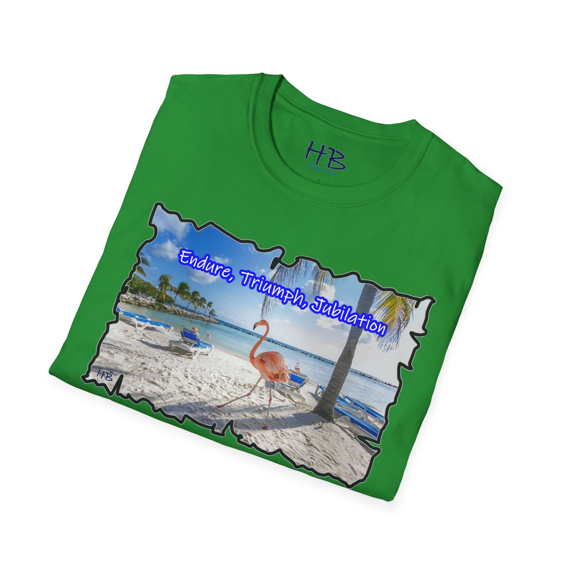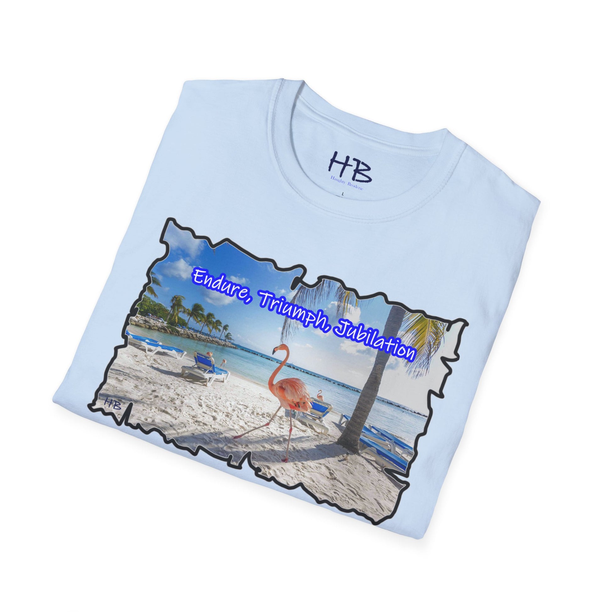 But there's more than meets the eye – a profound message is etched into the fabric of this shirt: "Endure, Triumph, Jubilation." This isn't just a shirt; it's a mantra, a reminder that the challenges we endure are the stepping stones to triumph, leading us to the jubilation of well-earned moments of respite. The picturesque setting becomes a metaphor for the hard work put into obtaining the idyllic islands of our dreams.