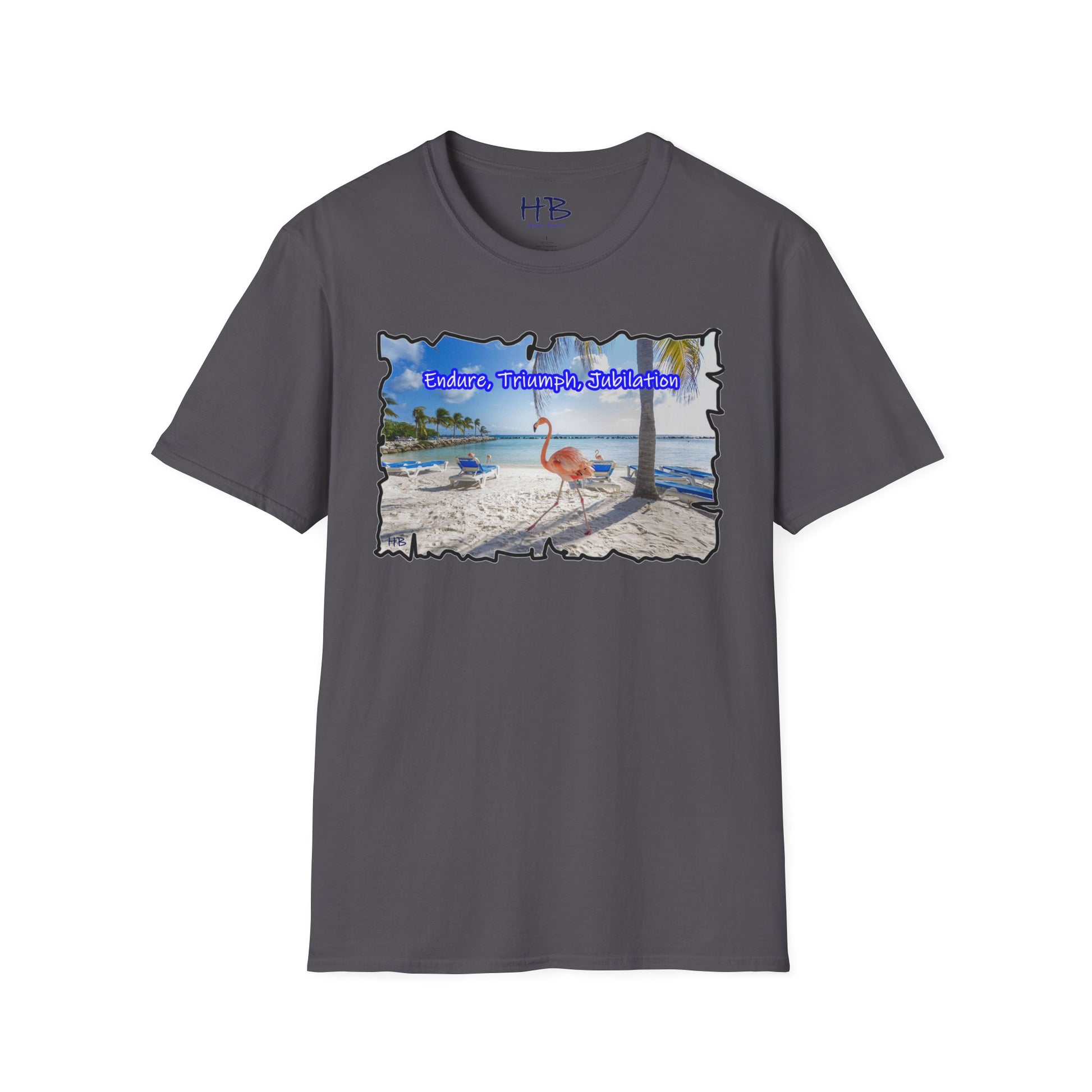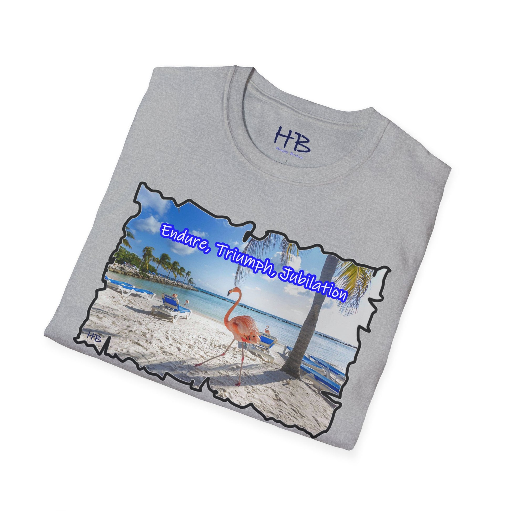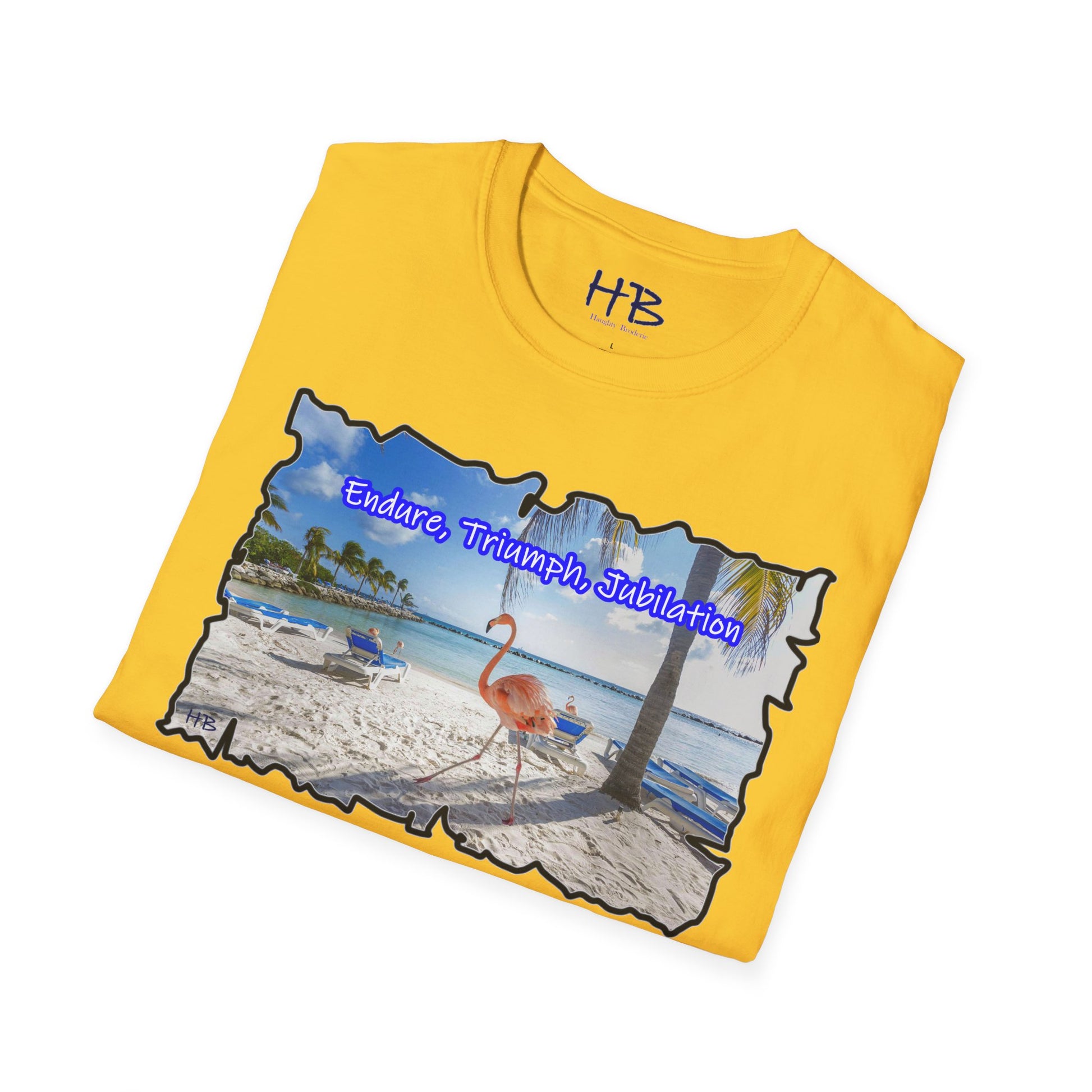 But there's more than meets the eye – a profound message is etched into the fabric of this shirt: "Endure, Triumph, Jubilation." This isn't just a shirt; it's a mantra, a reminder that the challenges we endure are the stepping stones to triumph, leading us to the jubilation of well-earned moments of respite. The picturesque setting becomes a metaphor for the hard work put into obtaining the idyllic islands of our dreams.