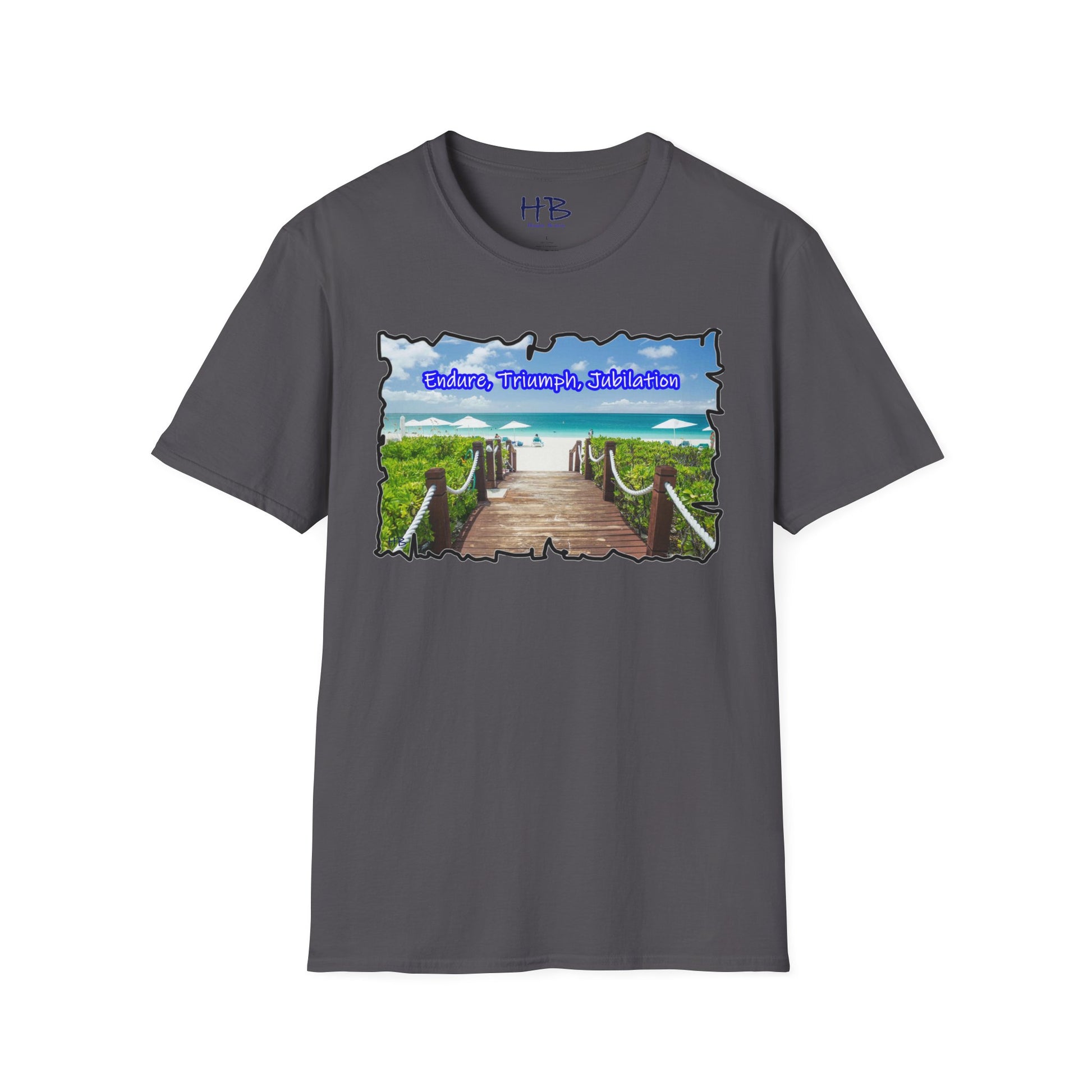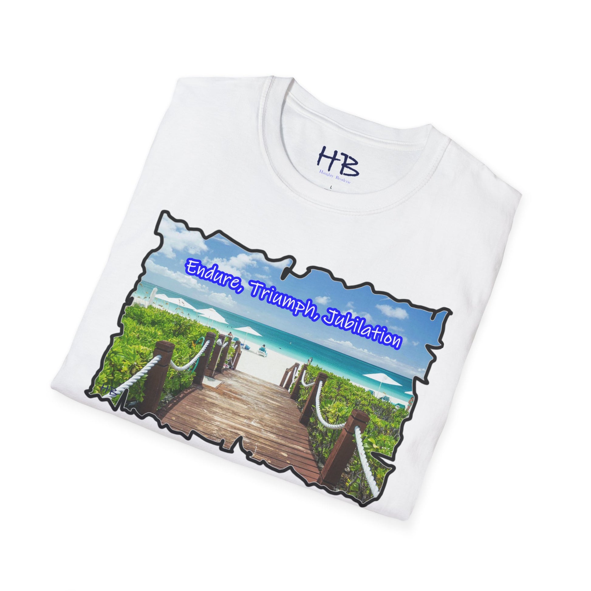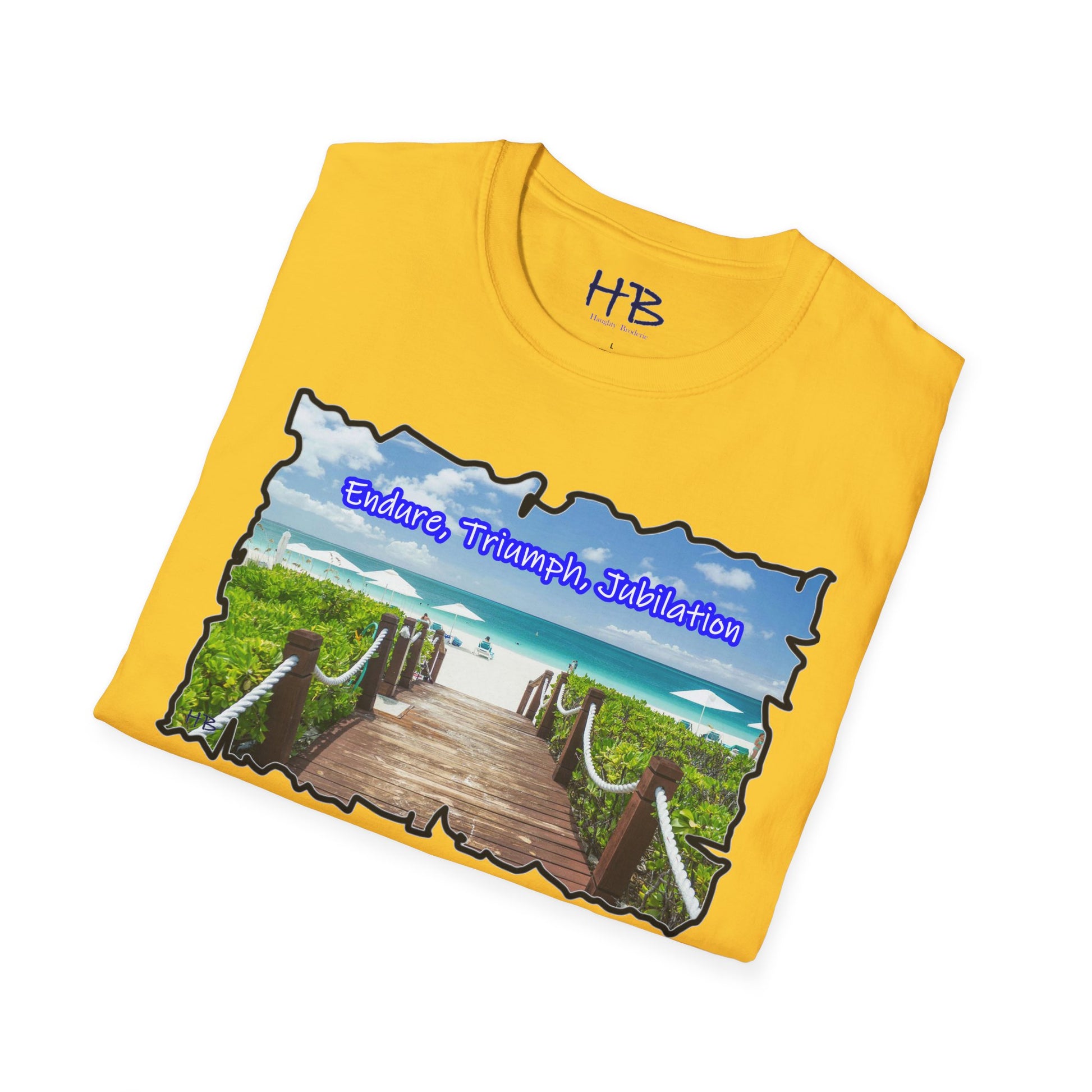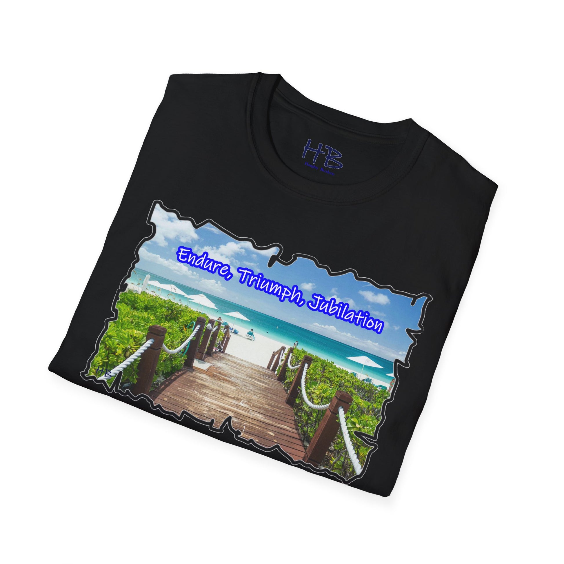 But it's not just a picturesque panorama; it's a philosophy etched in the very fabric of this T-shirt. Amidst the tranquil beauty, three powerful words emerge, like a mantra echoing through the gentle waves: "Endure, Triumph, Jubilation." These words are a testament to the journey – the hard work endured throughout the year, the trials faced, the obstacles conquered. They speak of the triumph achieved through perseverance and dedication, leading to the ultimate jubilation of a well-deserved vacation in paradise.