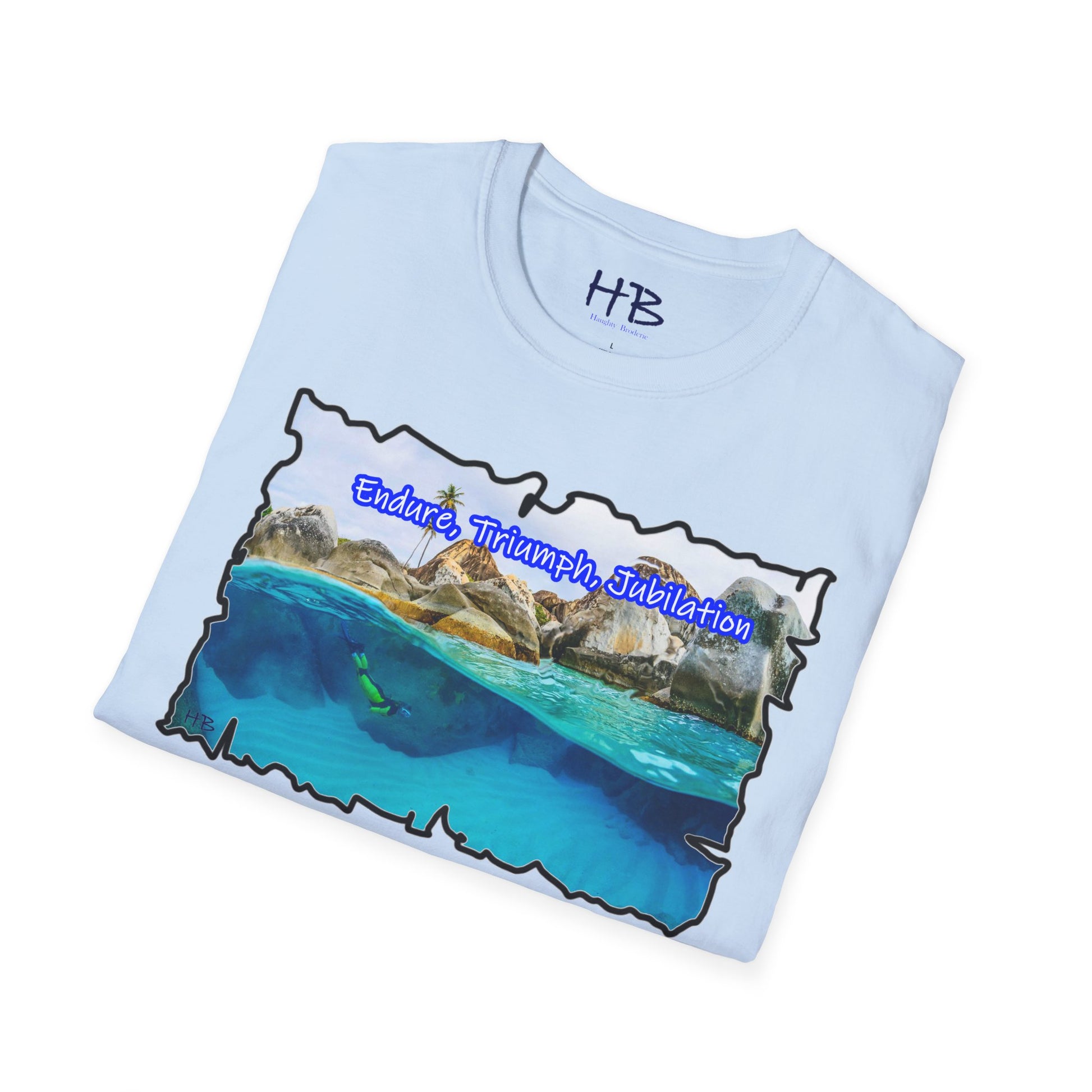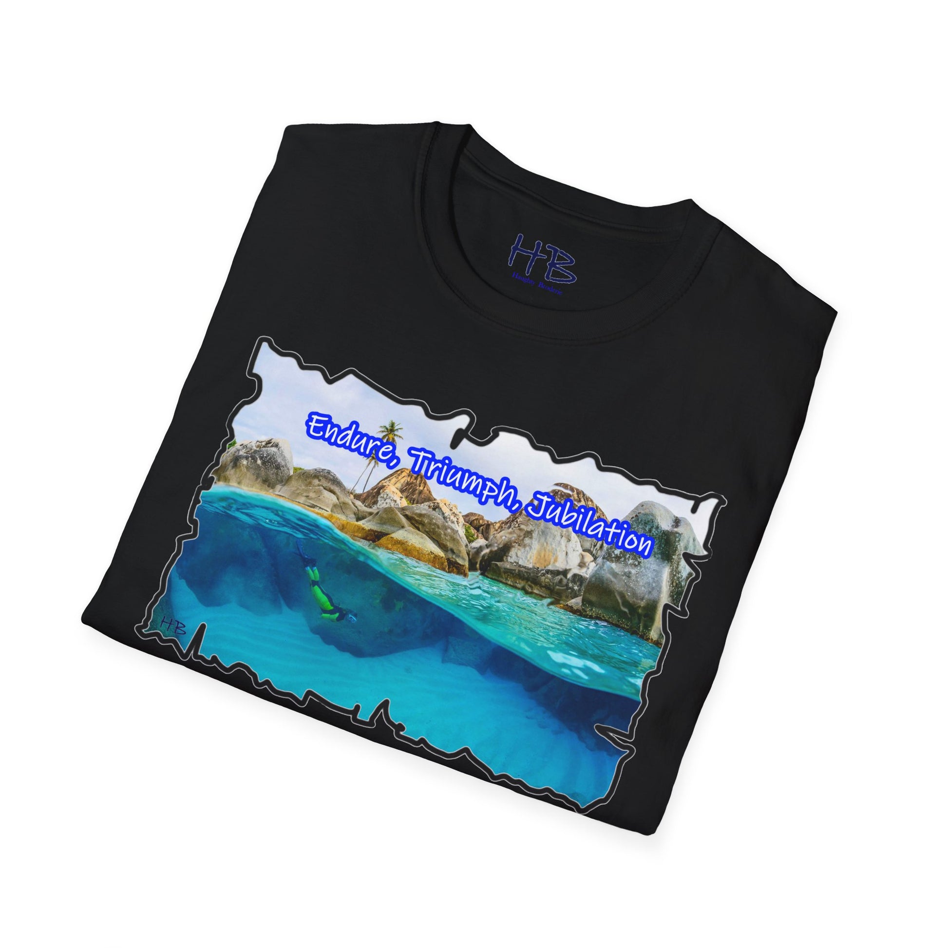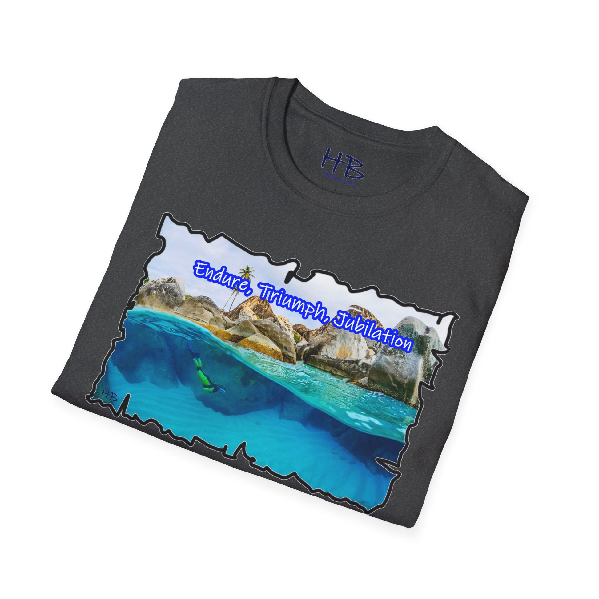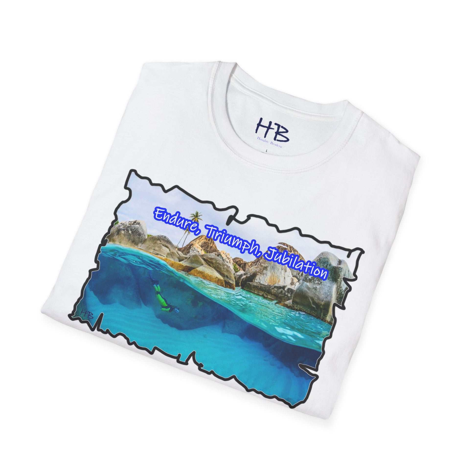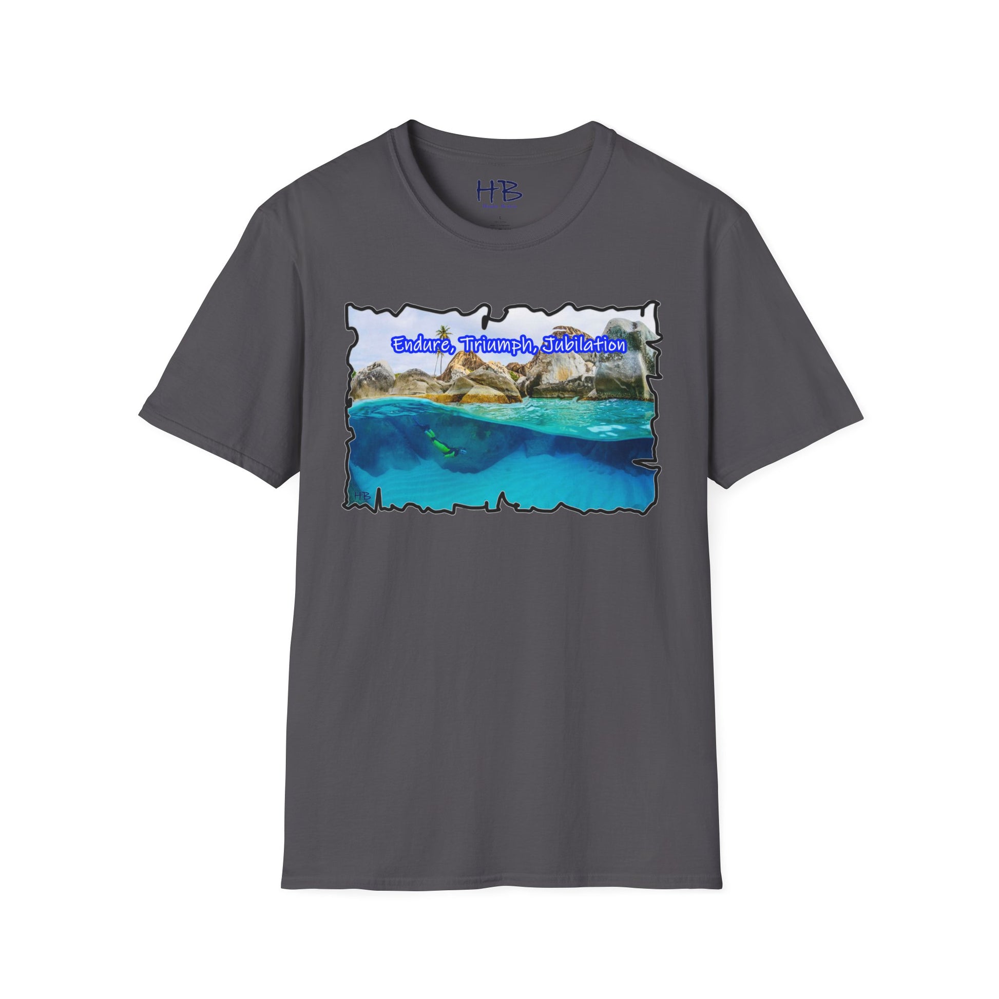 Embark on a visual odyssey with our exclusive "Endure, Triumph, Jubilation" t-shirt, a wearable masterpiece that immerses you in the allure of a paradisiacal getaway. Picture yourself snorkeling in the enchanting, baby blue embrace of the crystal-clear Bahamas ocean, where serenity and peace intertwine beneath the surface. The image captures a sought-after touristic haven, a testament to the idyllic islands that beckon weary souls to their shores.