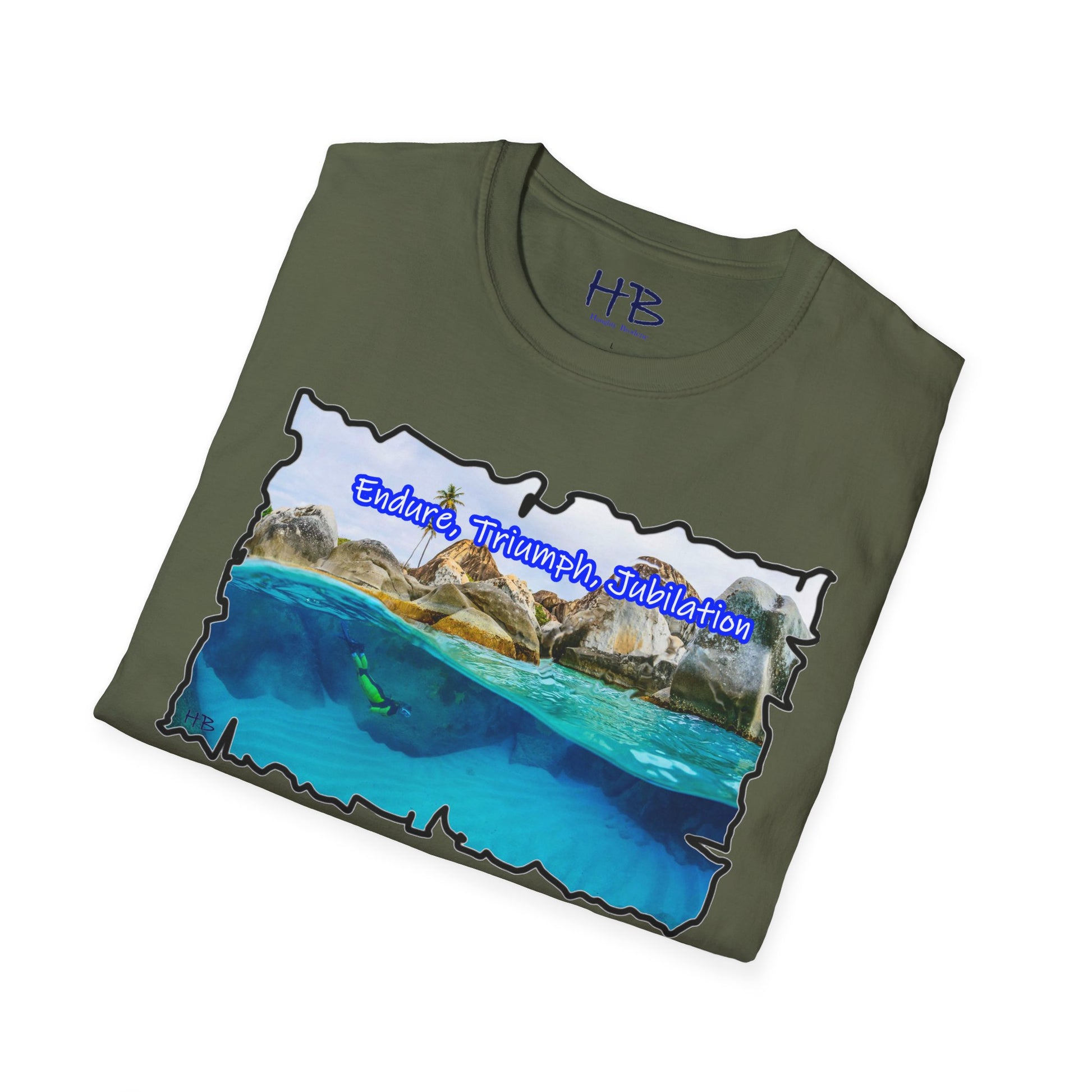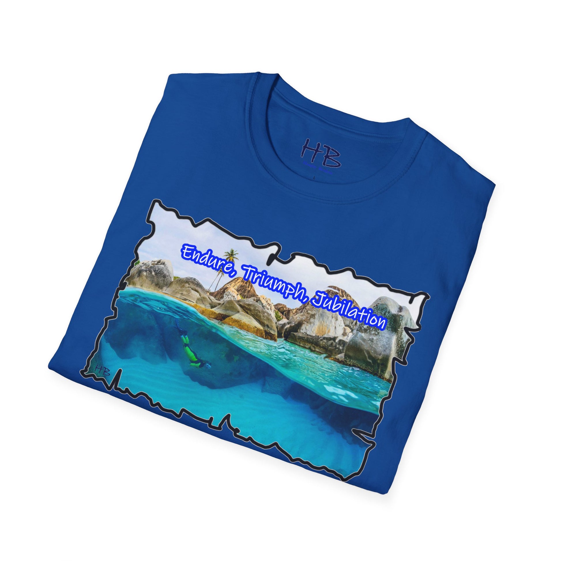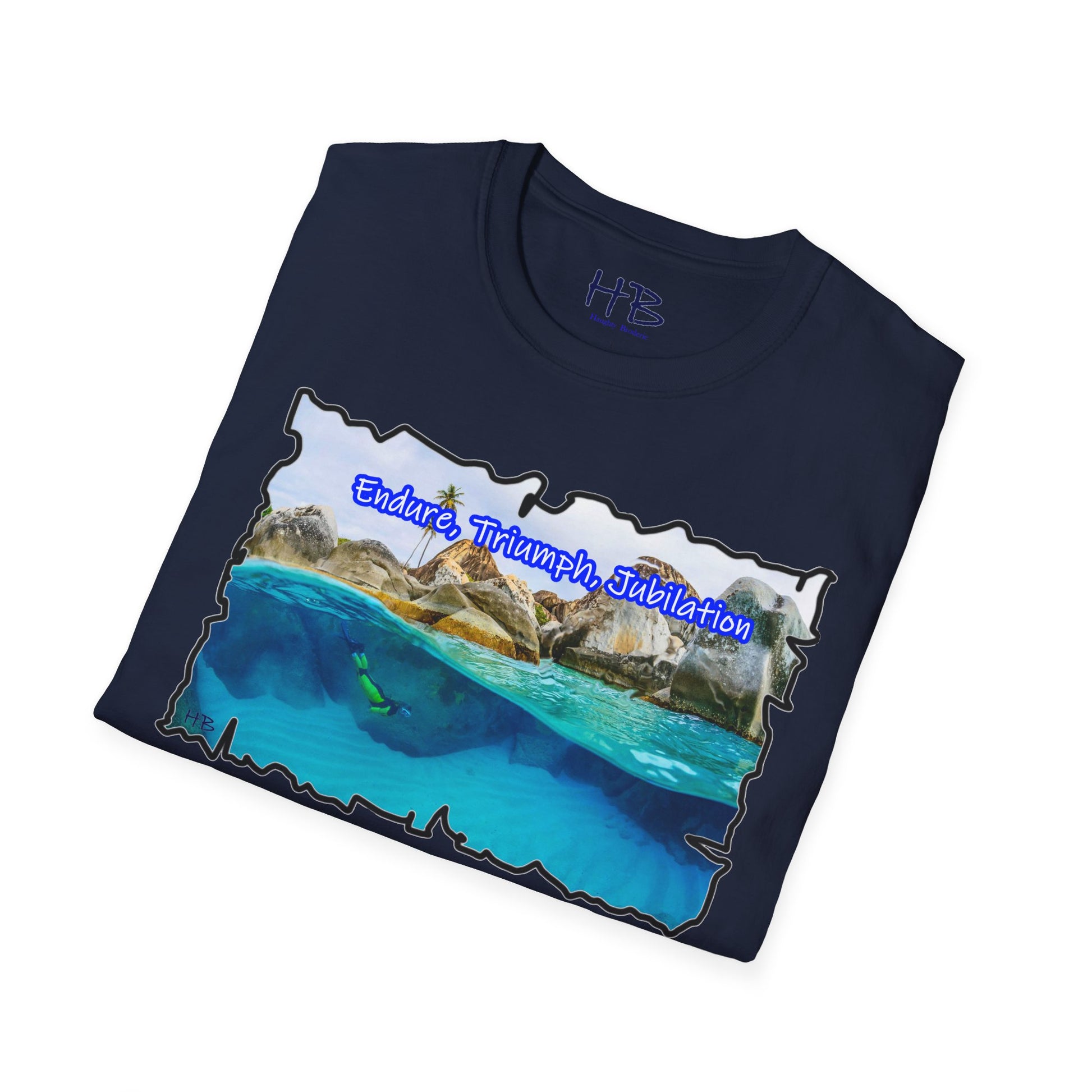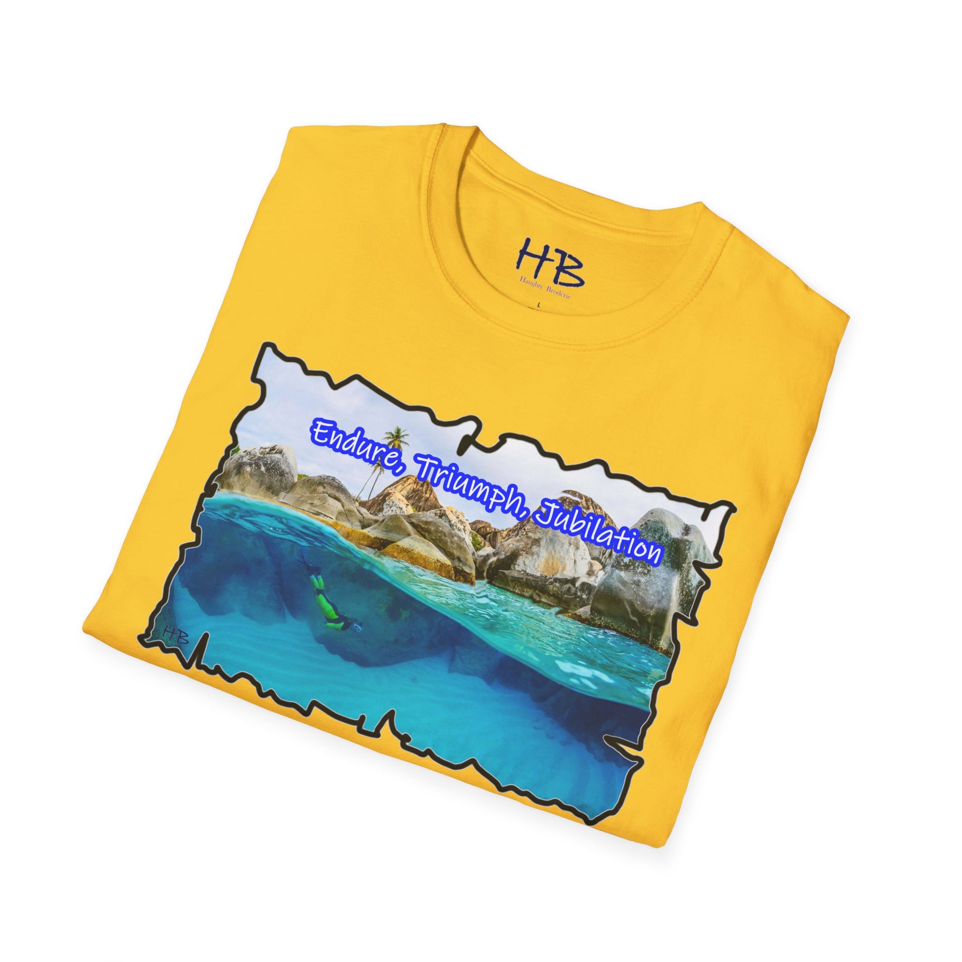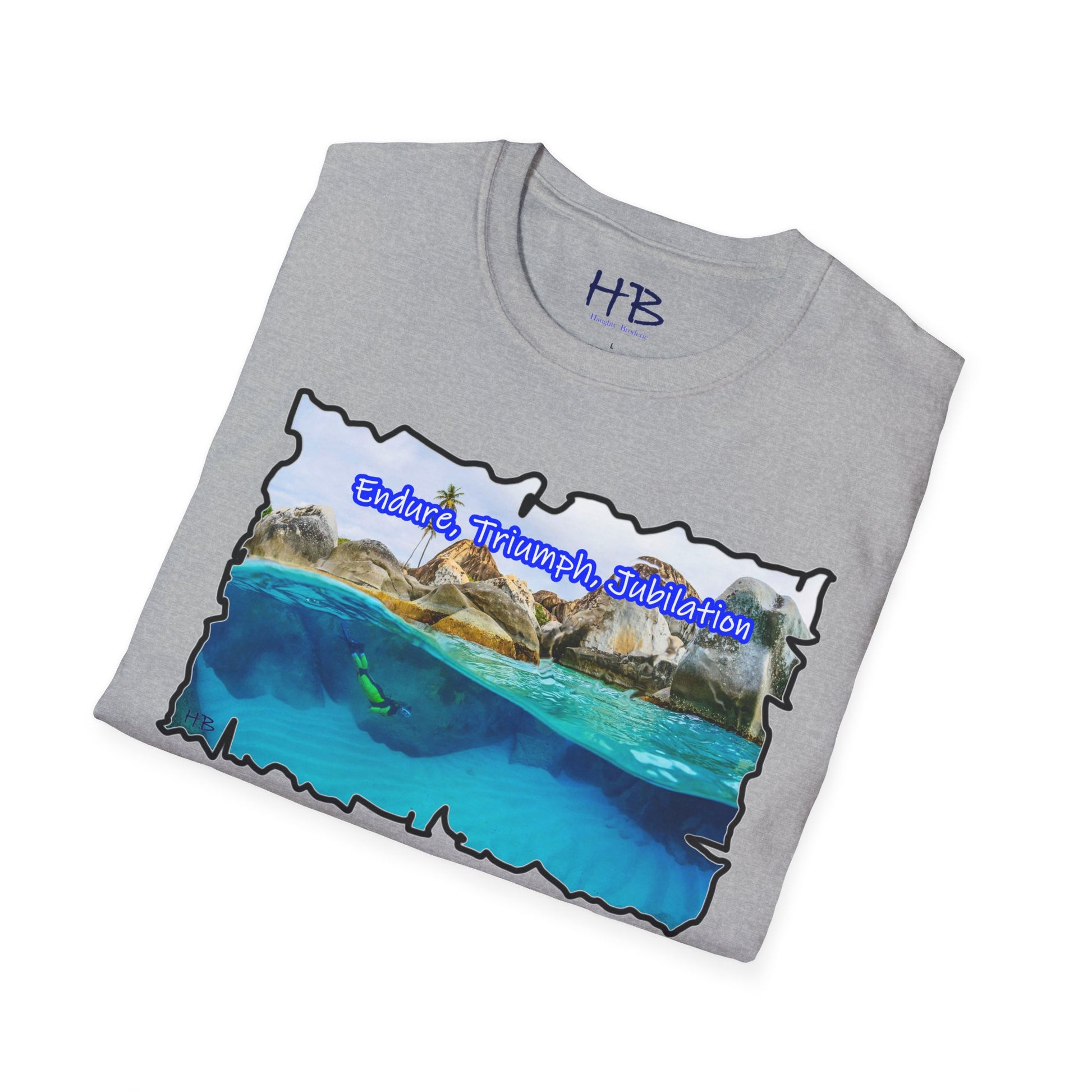 Embark on a visual odyssey with our exclusive "Endure, Triumph, Jubilation" t-shirt, a wearable masterpiece that immerses you in the allure of a paradisiacal getaway. Picture yourself snorkeling in the enchanting, baby blue embrace of the crystal-clear Bahamas ocean, where serenity and peace intertwine beneath the surface. The image captures a sought-after touristic haven, a testament to the idyllic islands that beckon weary souls to their shores.