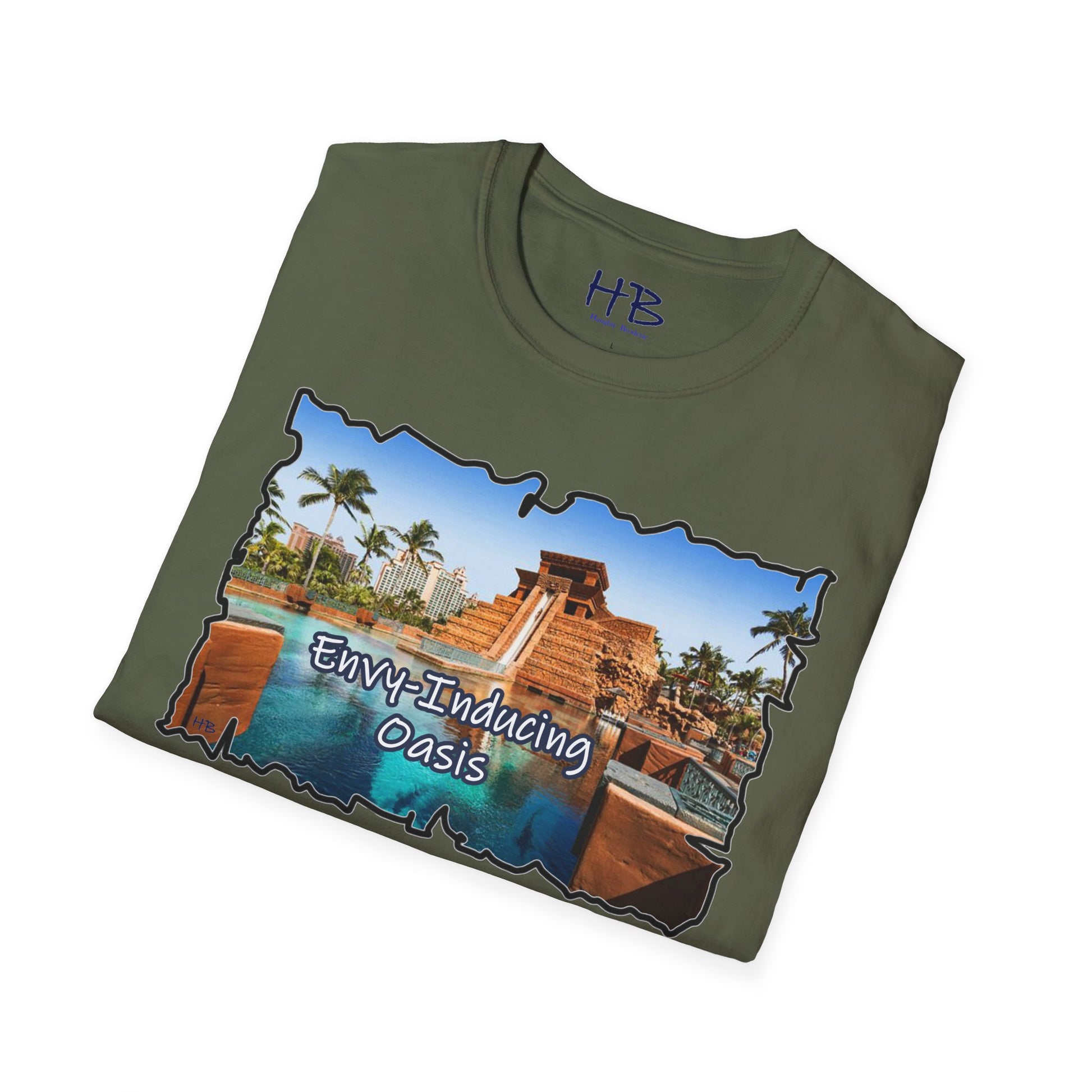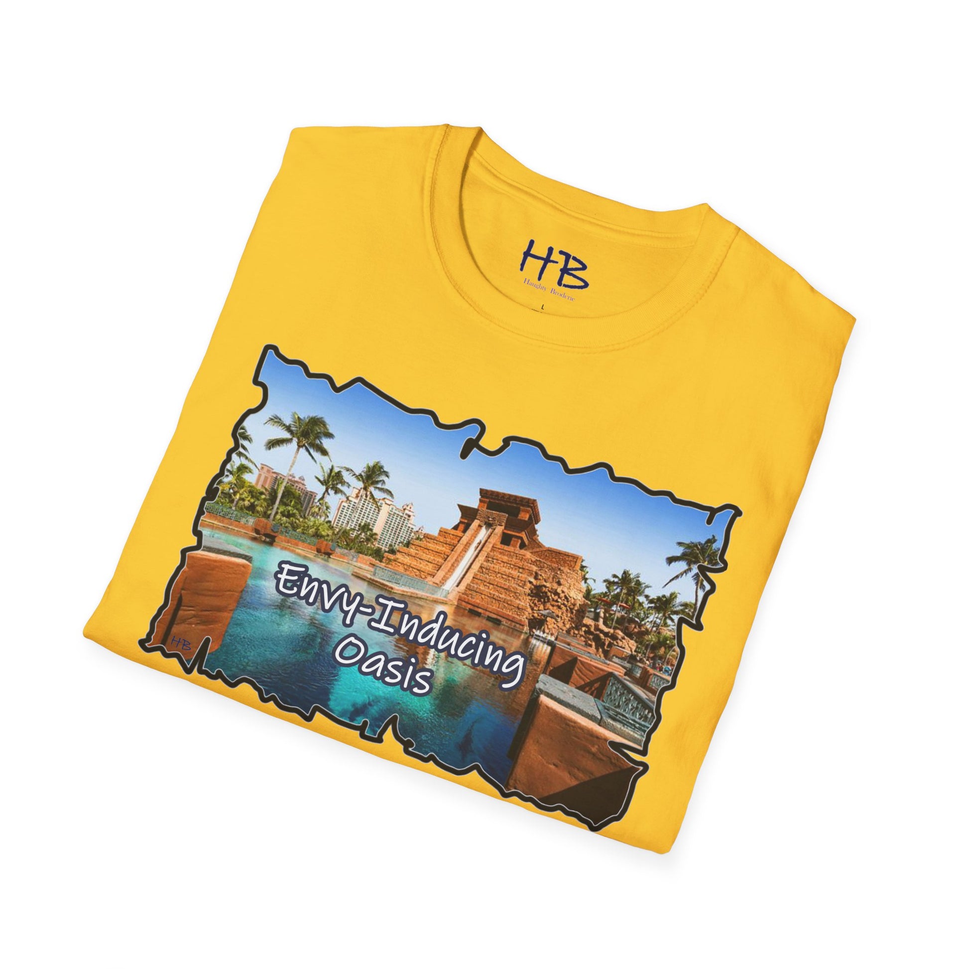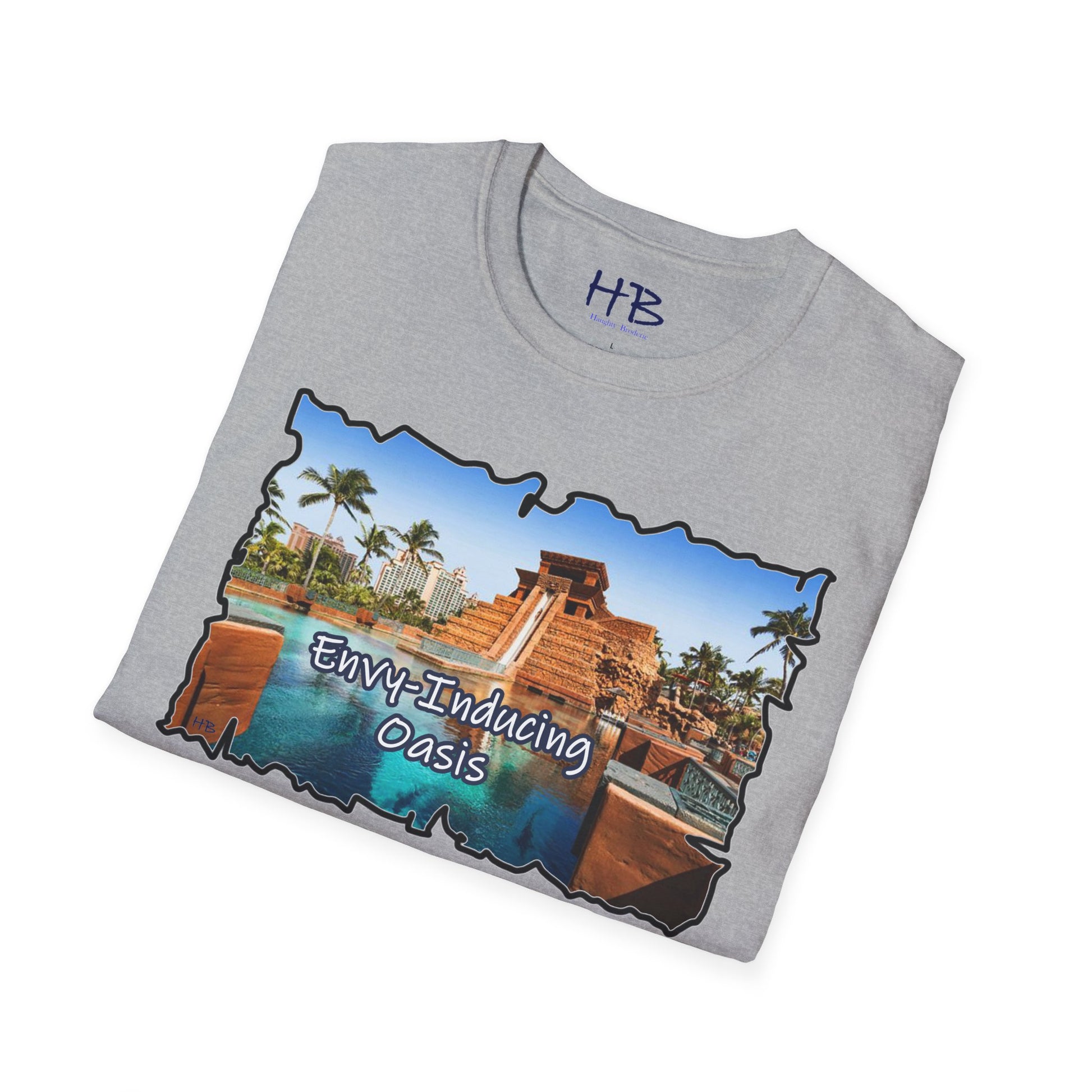 The awe-inspiring portrayal of this highly coveted destination, coupled with the bold proclamation "Envy-Inducing Oasis," serves as a powerful testament to the wearer's discerning taste and appreciation for life's luxuries. The imagery captures the essence of exclusivity, making this garment a symbol of aspiration and achievement.