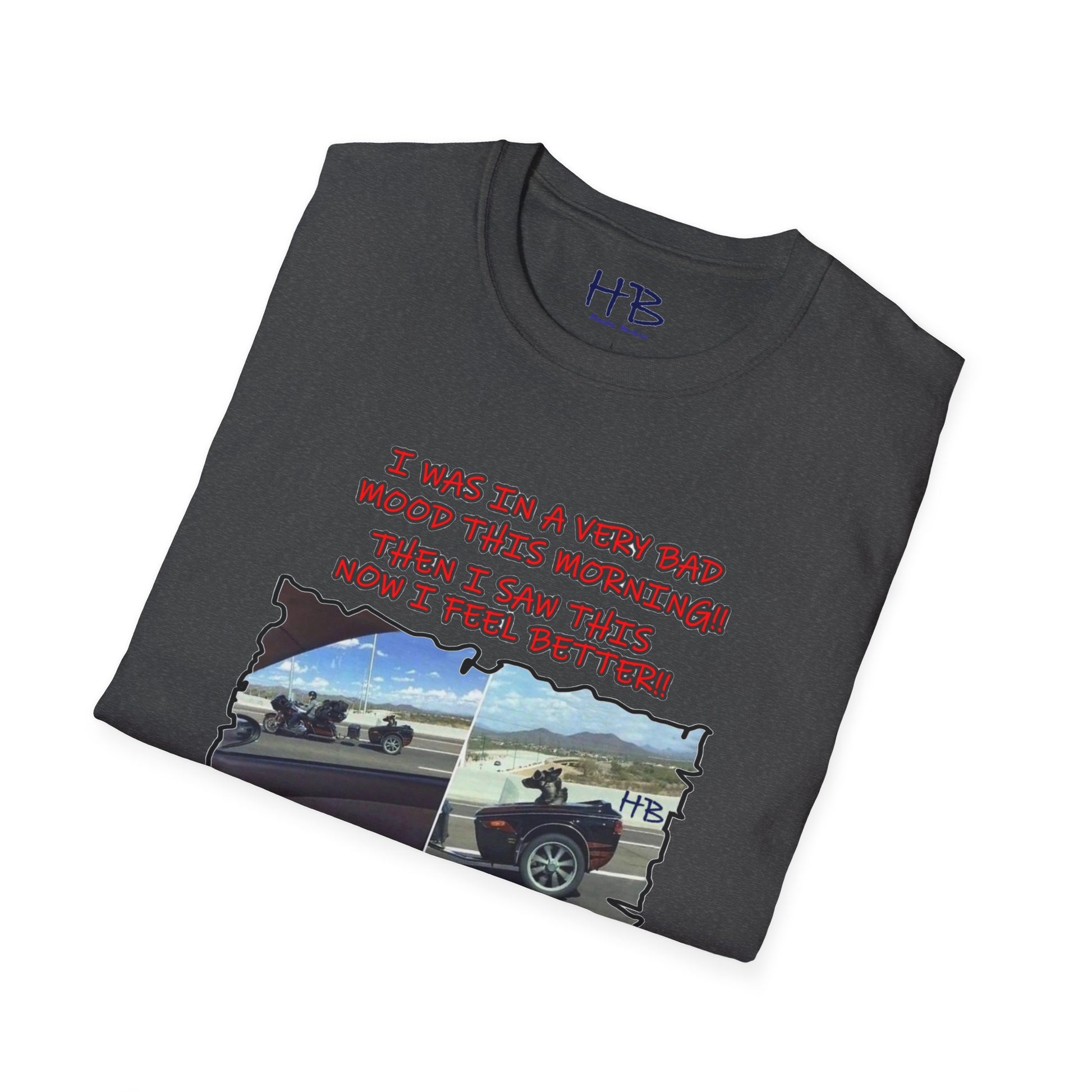 Introducing our captivating "Freedom on Wheels" T-shirt, an embodiment of joy and spontaneity that transcends the mundane. Picture this: a man capturing a moment of pure bliss as he photographs another gentleman cruising on his motorcycle. But there's a twist – trailing behind is a customized half-back vehicle, defying expectations on two wheels, with a four-legged companion sporting adorable eye goggles and a windscreen, embracing the open air with sheer delight.