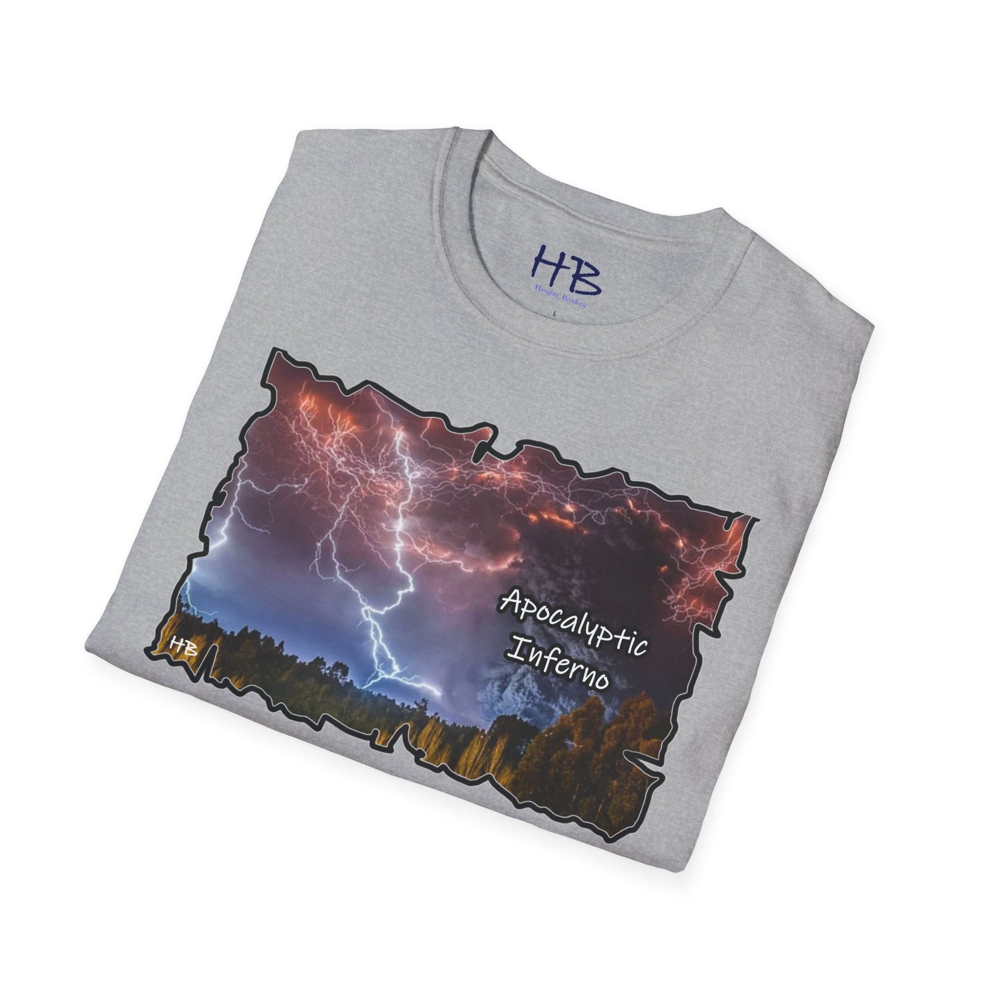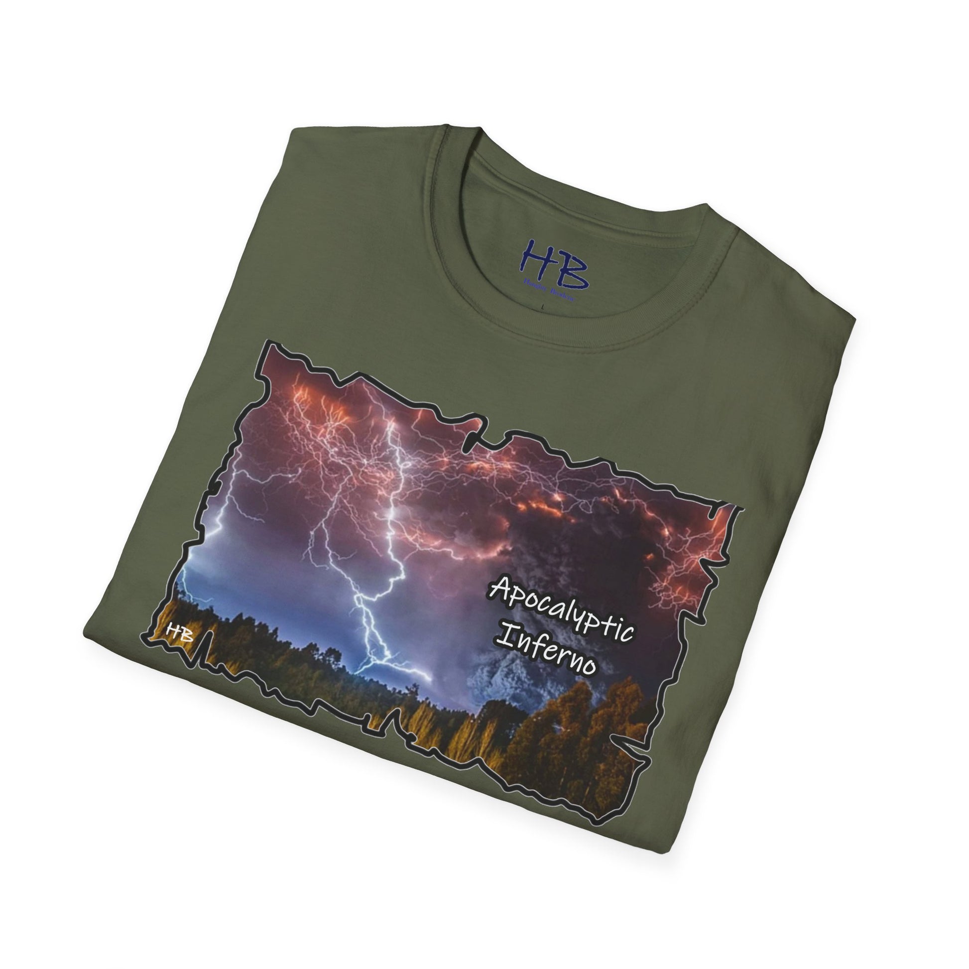 Step into the realm of elemental chaos with our mesmerizing "Apocalyptic Inferno" t-shirt, where the raw power of nature is vividly captured in a symphony of fiery hues and tumultuous energy. This wearable masterpiece features a roaring volcano, its molten heart spewing forth flames and smoke, a visual crescendo echoing the primal forces that shape our world. Above, a vast expanse of the sky is electrified with thunder, a celestial dance of power and awe.