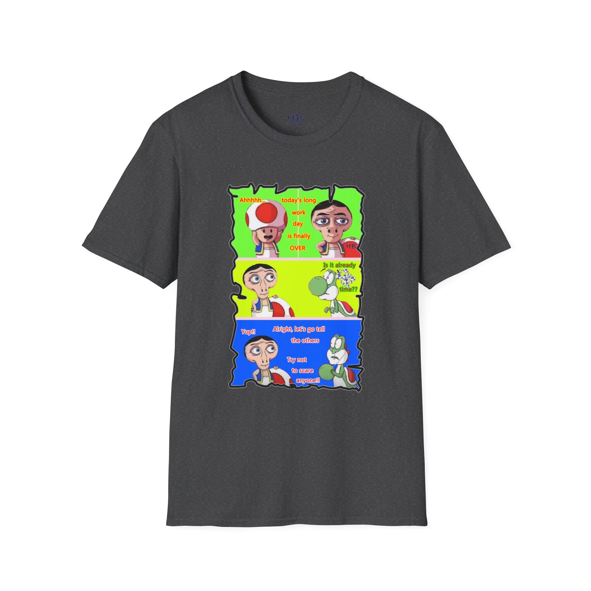 The subsequent portrayal exhibits Yogi in sheer disbelief as he gazes at Toad, accompanied by the caption "Is it already time???" Finally, in the third image, Toad and Yogi exchange stares, with Toad confirming "Yup," while Yogi discards his massive green nose to reveal a diminutive nose and a dauntingly flat countenance, accompanied by the message "Alright, let's go tell the others. Try not to scare anyone." Undoubtedly, these whimsical and comical expressions promise abundant laughter and enjoyable moments with friends and family. Seize the opportunity to enrich your collection with this exceptional and humorous tee shirt today!