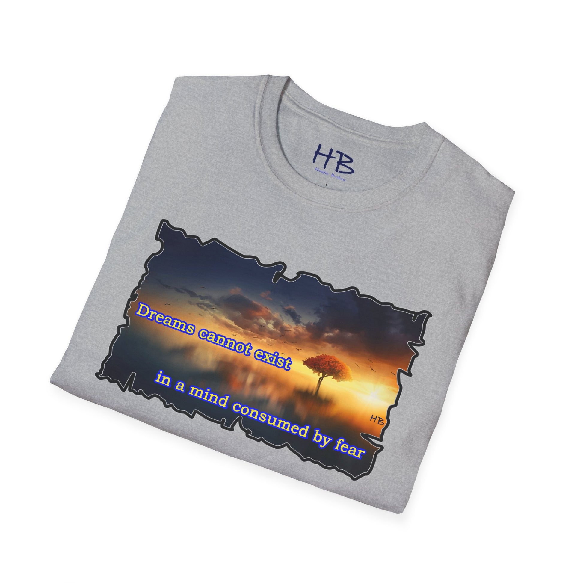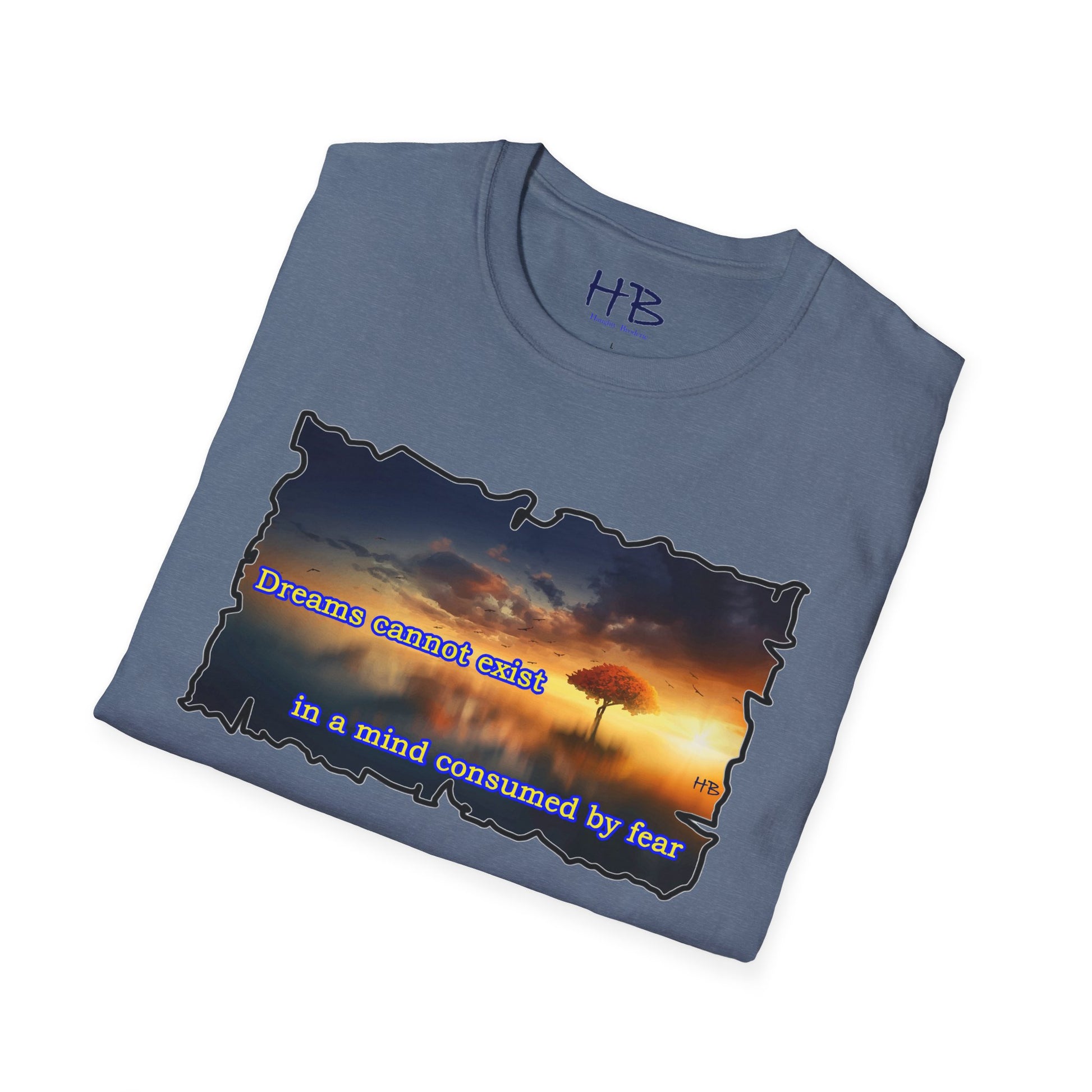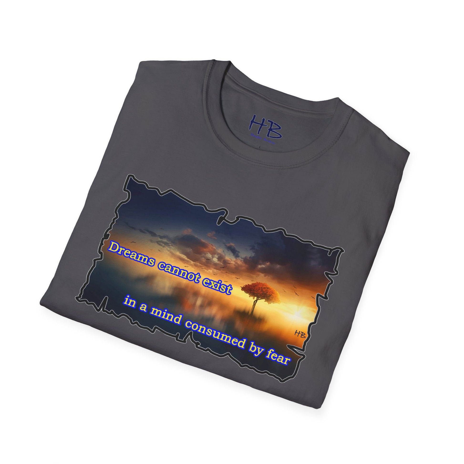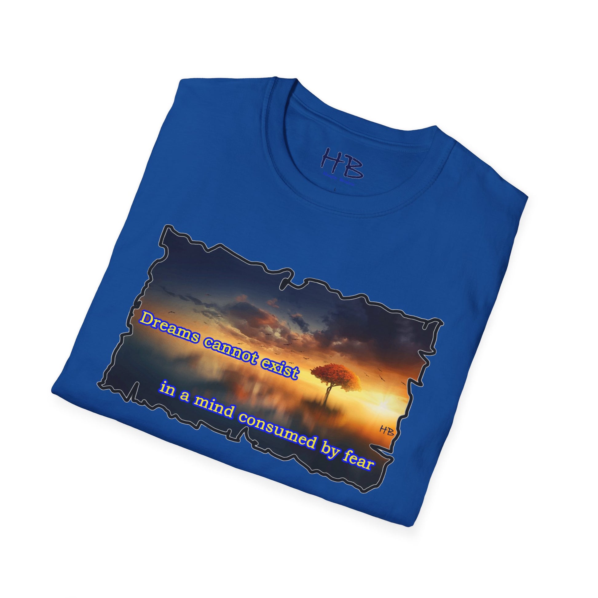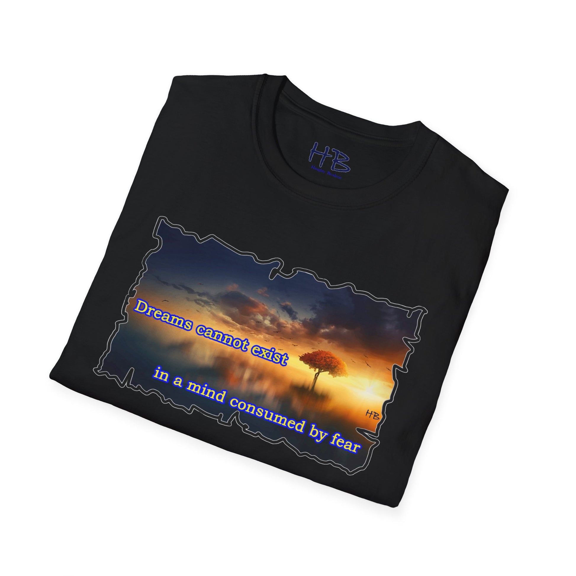 Introducing our new tee shirt featuring a breathtaking image of a single tree emerging from the surface of water with the radiant colors of sunset in the background, and birds soaring through the sky. This inspiring image is paired with the powerful message, "Dreams cannot exist in a mind consumed by fear." Our tee shirt design echoes this sentiment, reminding you that fear is the arch-nemesis of your dreams. Fear smothers the flame of your hopes, restricts your mind and limits your potential. Don't let fear hold you back from achieving your dreams. Our tee shirt is made from high-quality material and is comfortable to wear, making it perfect for everyday wear. Wear it as a reminder to push past your fears and embrace the beauty of hopeful dreams. Order now and take the first step towards overcoming your fears and realizing your full potential.
