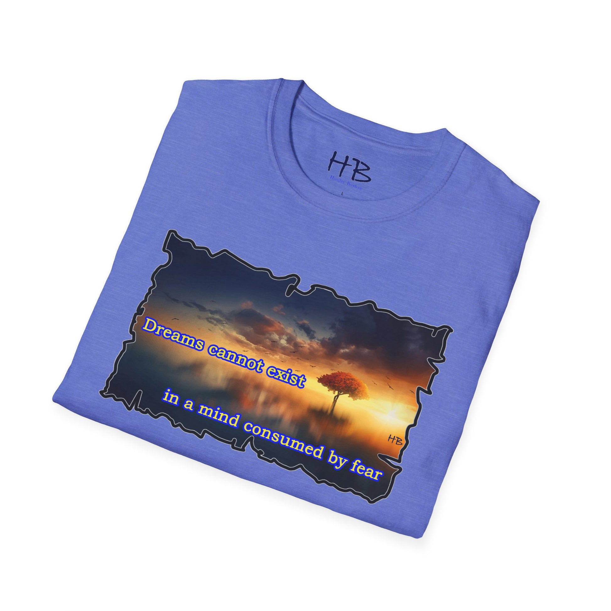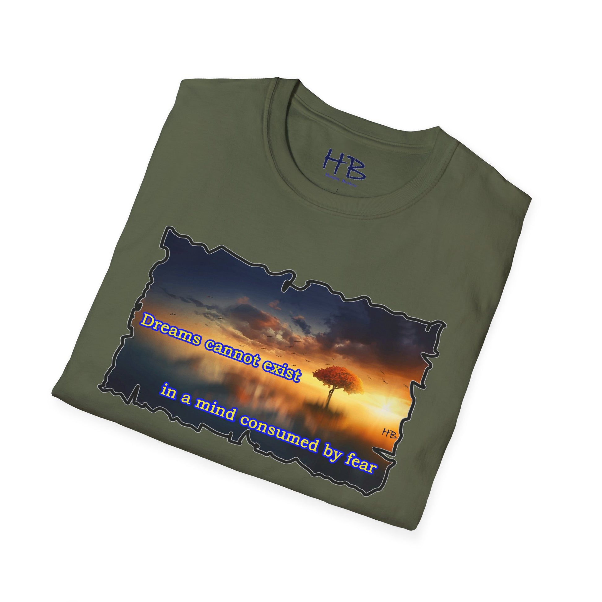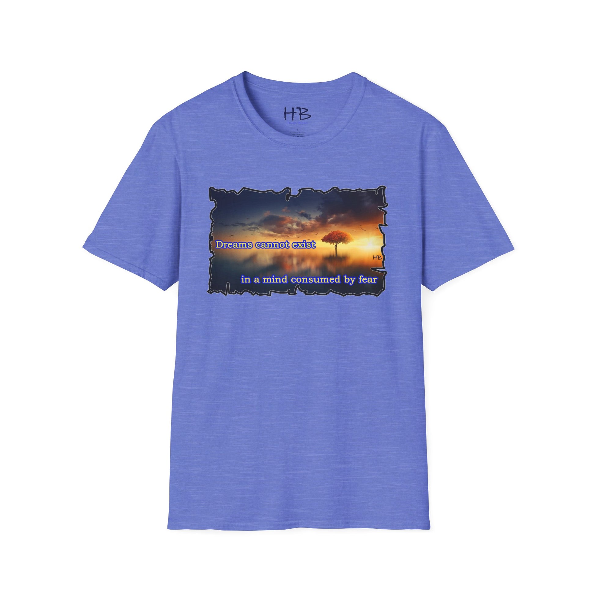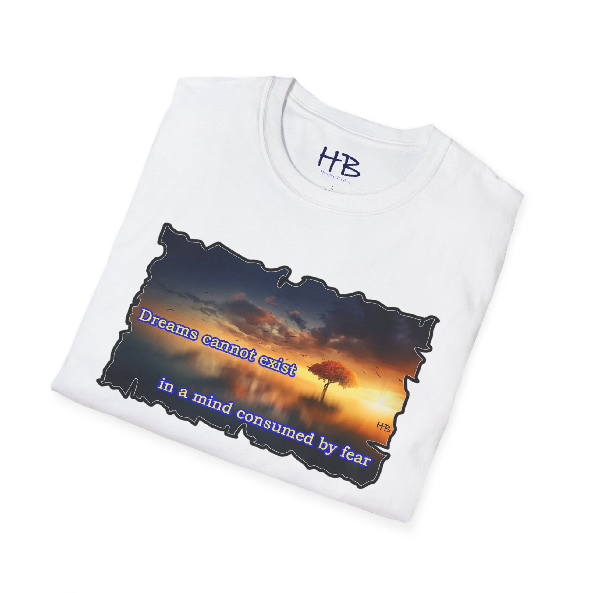 Introducing our new tee shirt featuring a breathtaking image of a single tree emerging from the surface of water with the radiant colors of sunset in the background, and birds soaring through the sky. This inspiring image is paired with the powerful message, "Dreams cannot exist in a mind consumed by fear." Our tee shirt design echoes this sentiment, reminding you that fear is the arch-nemesis of your dreams. Fear smothers the flame of your hopes, restricts your mind and limits your potential. Don't let fear hold you back from achieving your dreams. Our tee shirt is made from high-quality material and is comfortable to wear, making it perfect for everyday wear. Wear it as a reminder to push past your fears and embrace the beauty of hopeful dreams. Order now and take the first step towards overcoming your fears and realizing your full potential.