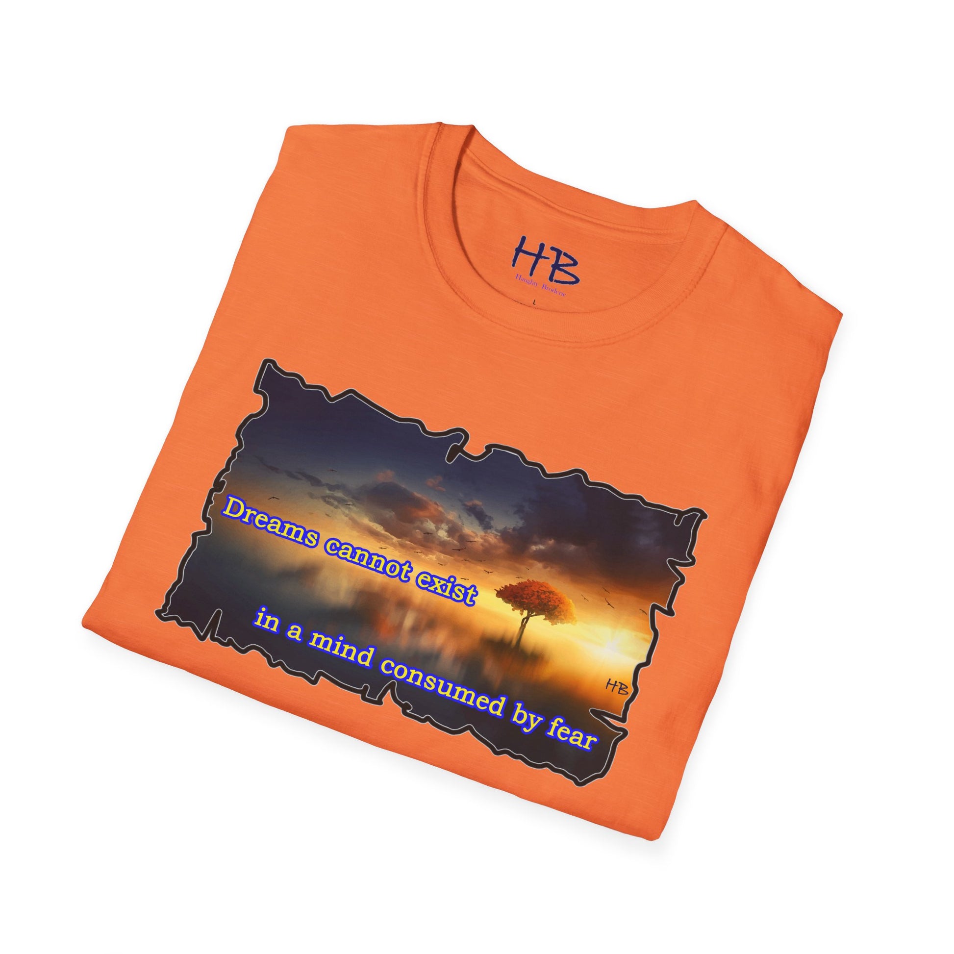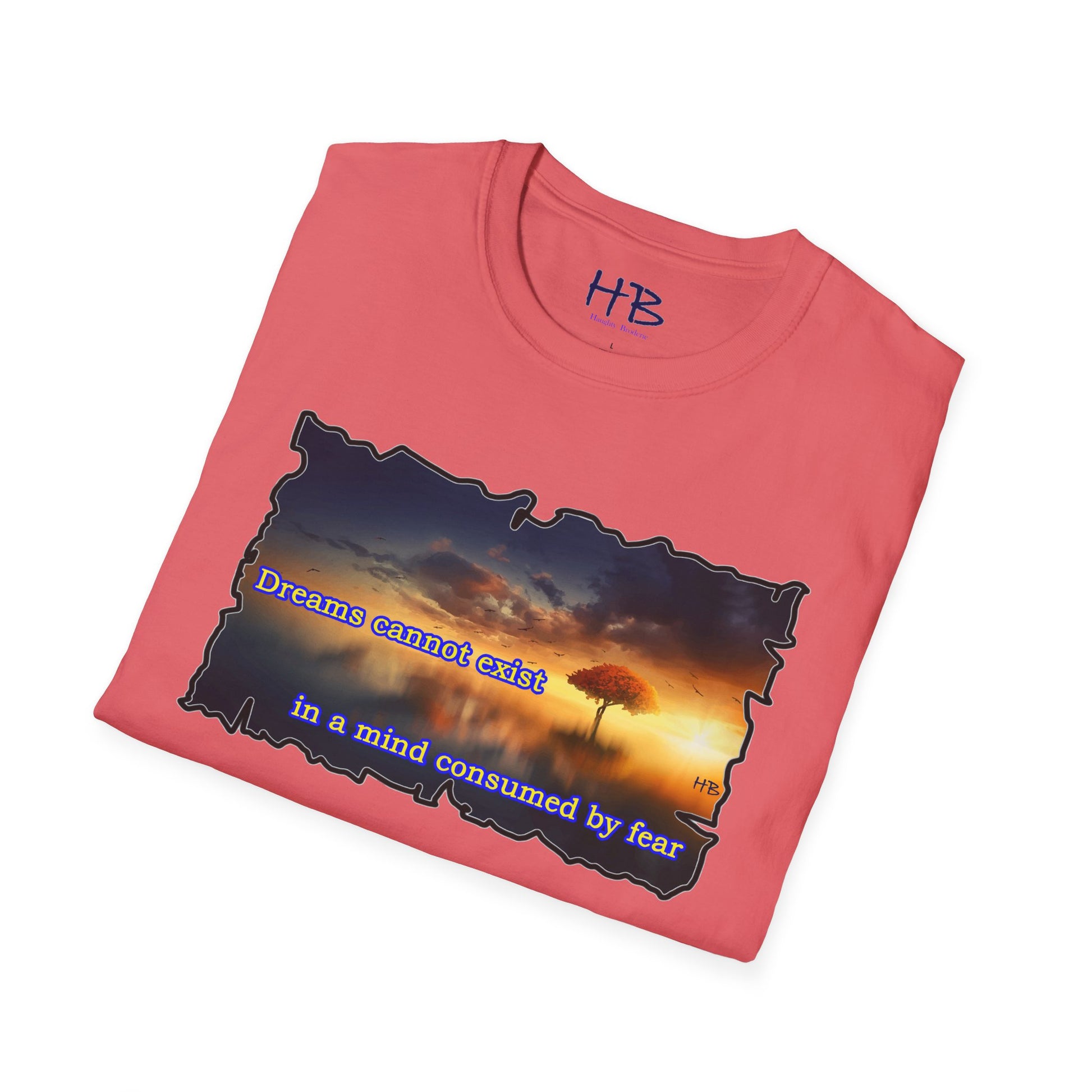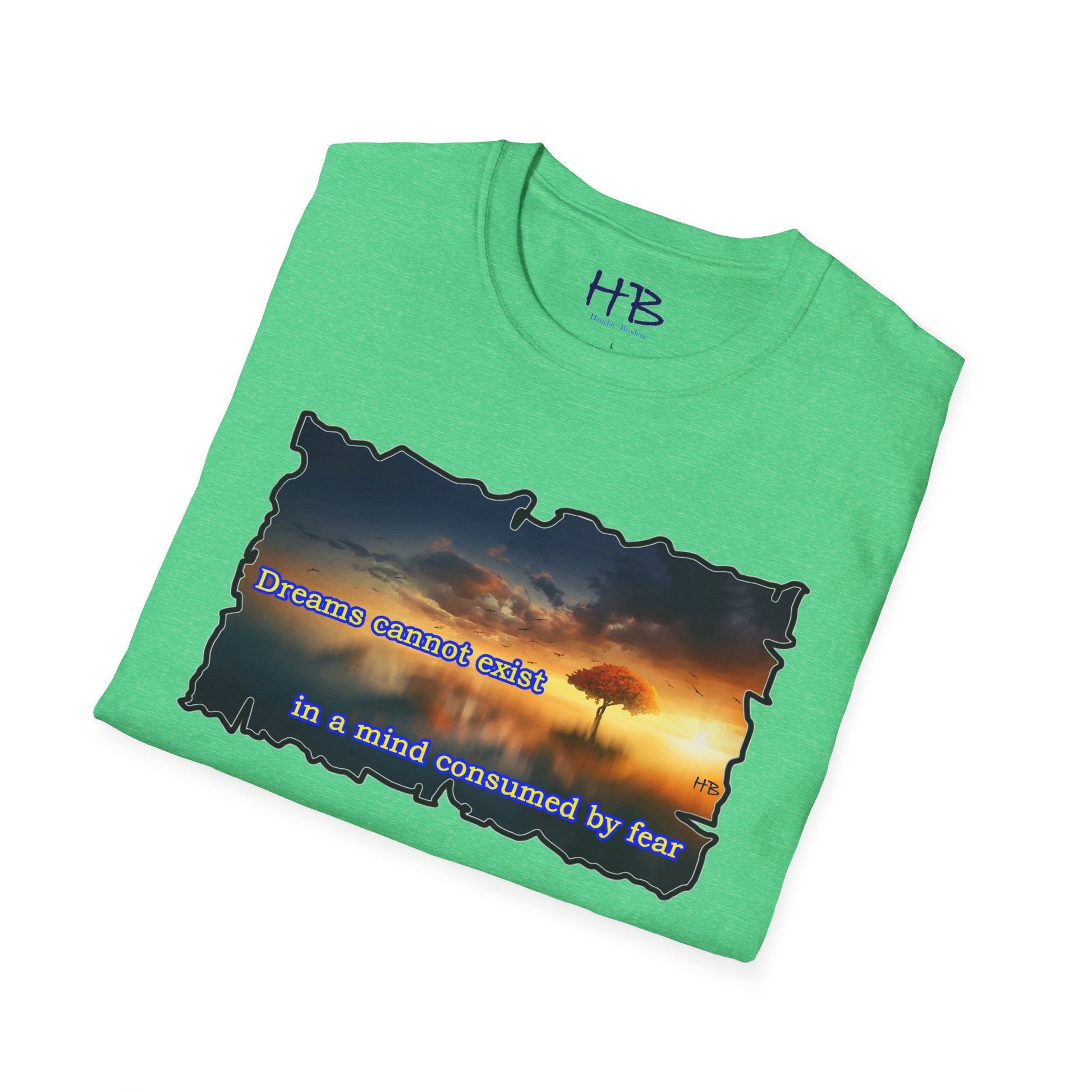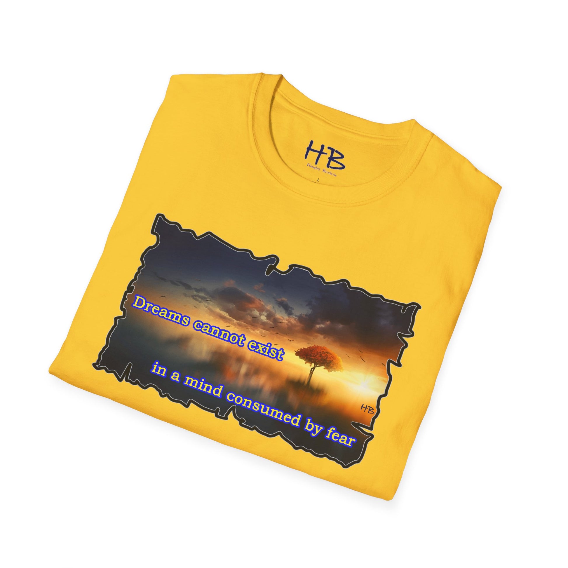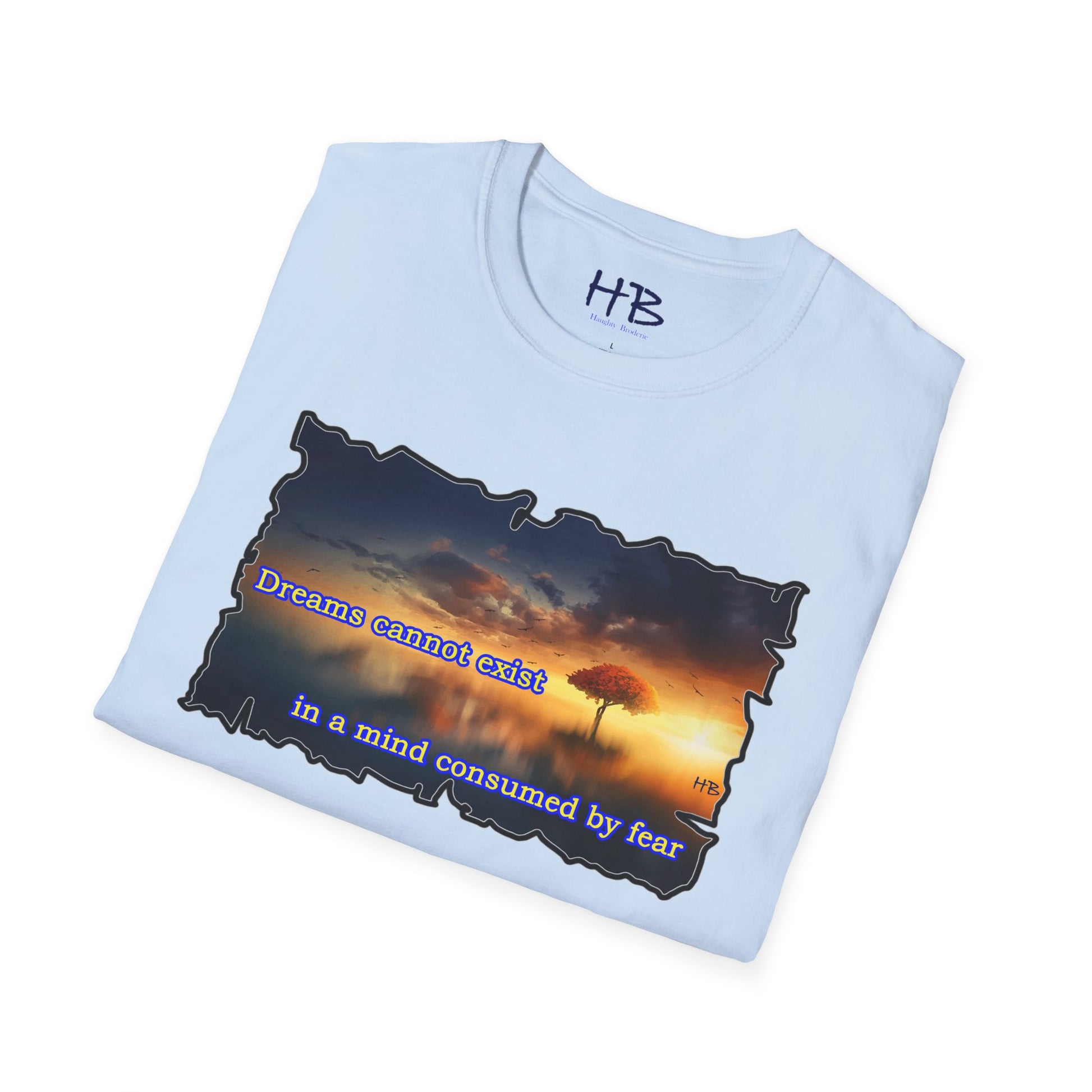Introducing our new tee shirt featuring a breathtaking image of a single tree emerging from the surface of water with the radiant colors of sunset in the background, and birds soaring through the sky. This inspiring image is paired with the powerful message, "Dreams cannot exist in a mind consumed by fear." Our tee shirt design echoes this sentiment, reminding you that fear is the arch-nemesis of your dreams. Fear smothers the flame of your hopes, restricts your mind and limits your potential. Don't let fear hold you back from achieving your dreams. Our tee shirt is made from high-quality material and is comfortable to wear, making it perfect for everyday wear. Wear it as a reminder to push past your fears and embrace the beauty of hopeful dreams. Order now and take the first step towards overcoming your fears and realizing your full potential.