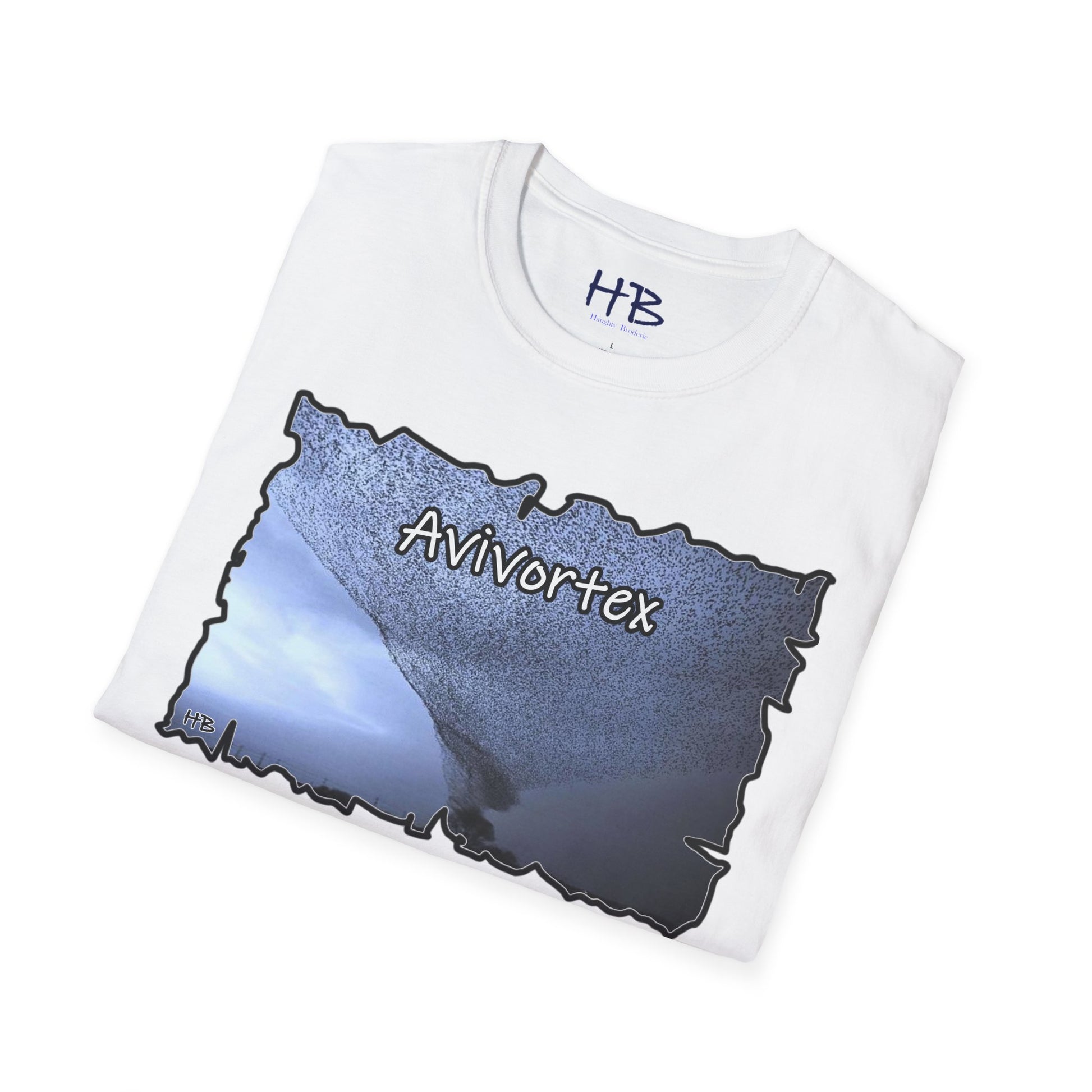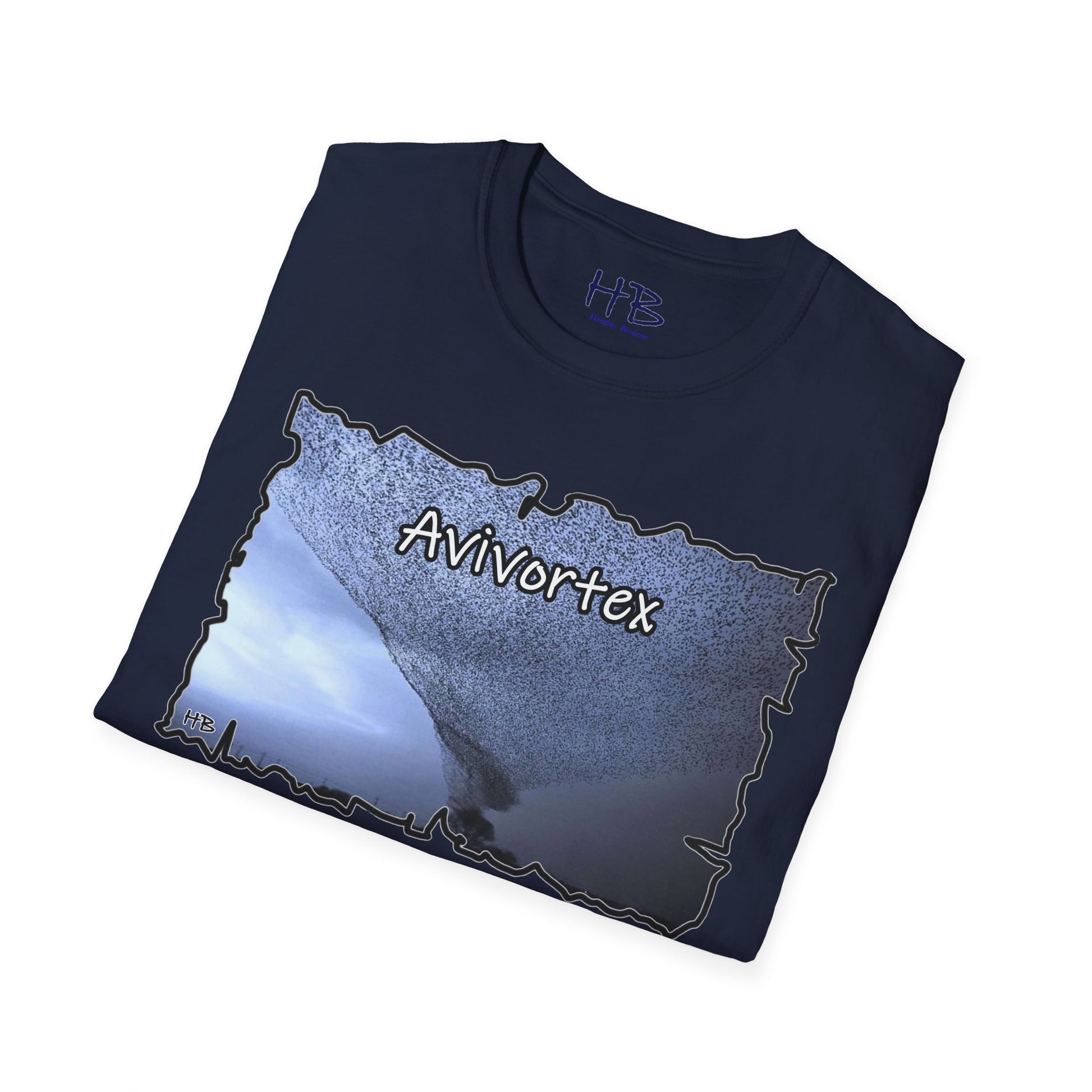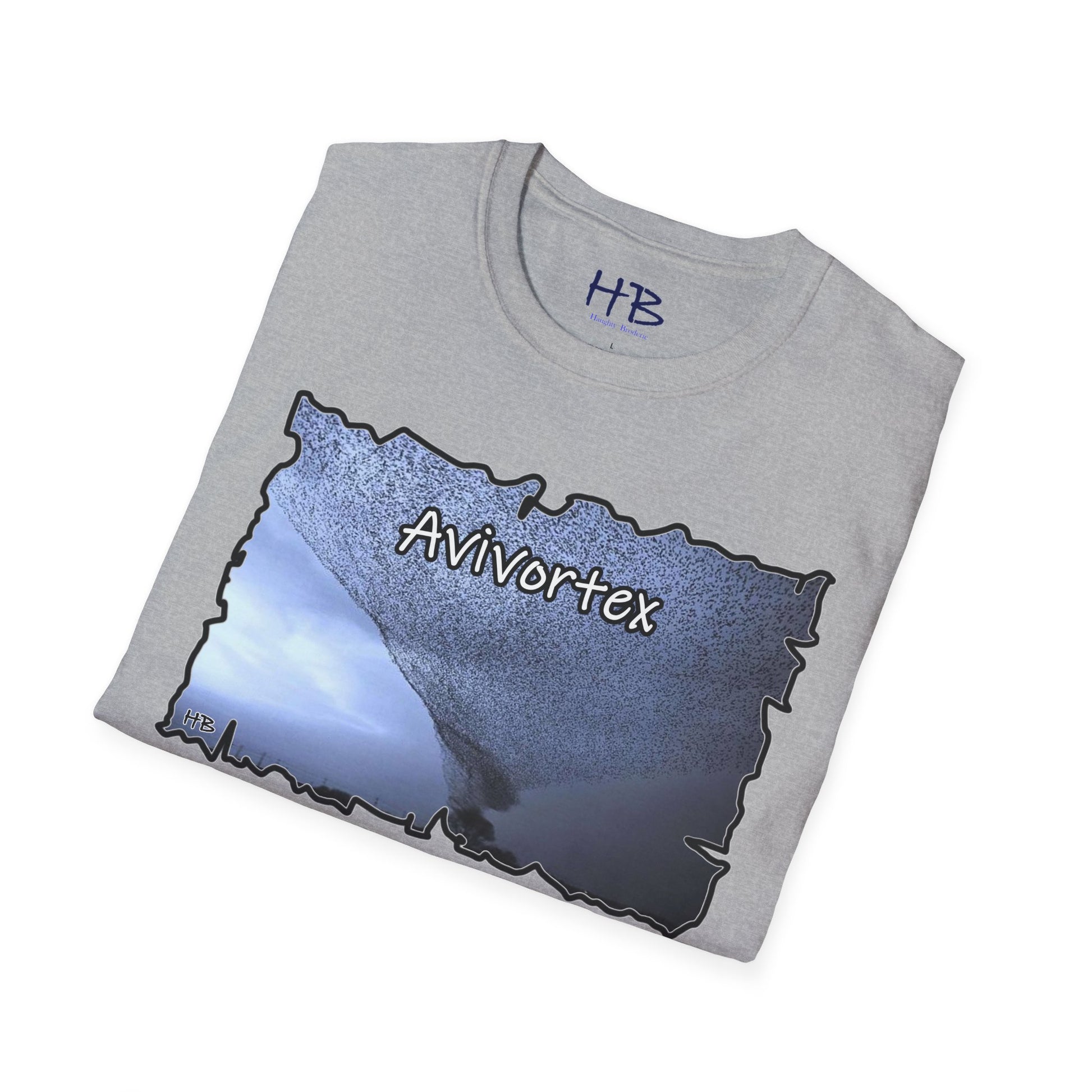 Introducing our extraordinary creation, the "Avivortex" T-Shirt—a mesmerizing blend of avian elegance and elemental force. Picture this: a celestial tornado formed not of turbulent winds, but a symphony of birds, all twirling around each other in a breathtaking dance of flight. This dynamic masterpiece captures the essence of an aviary meeting a vortex, birthing an awe-inspiring phenomenon that defies the ordinary.