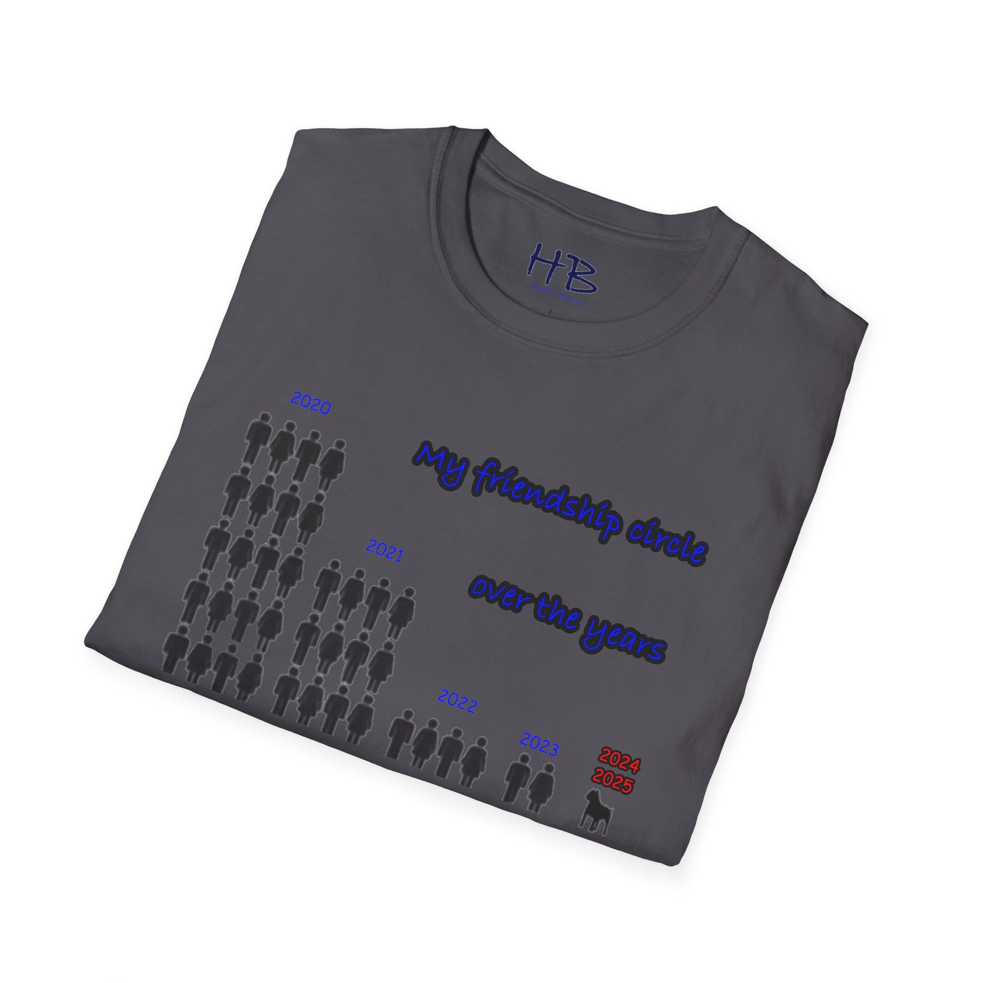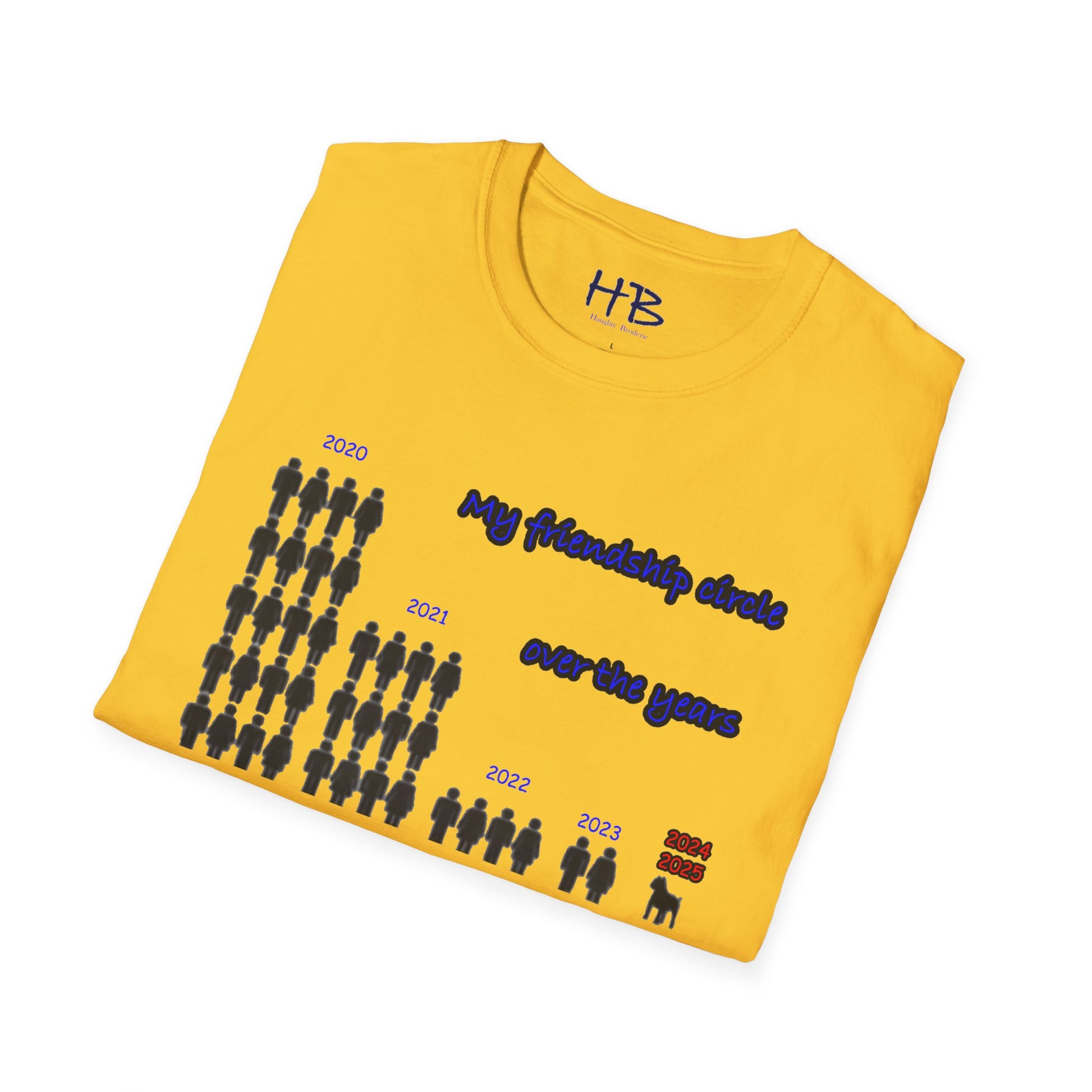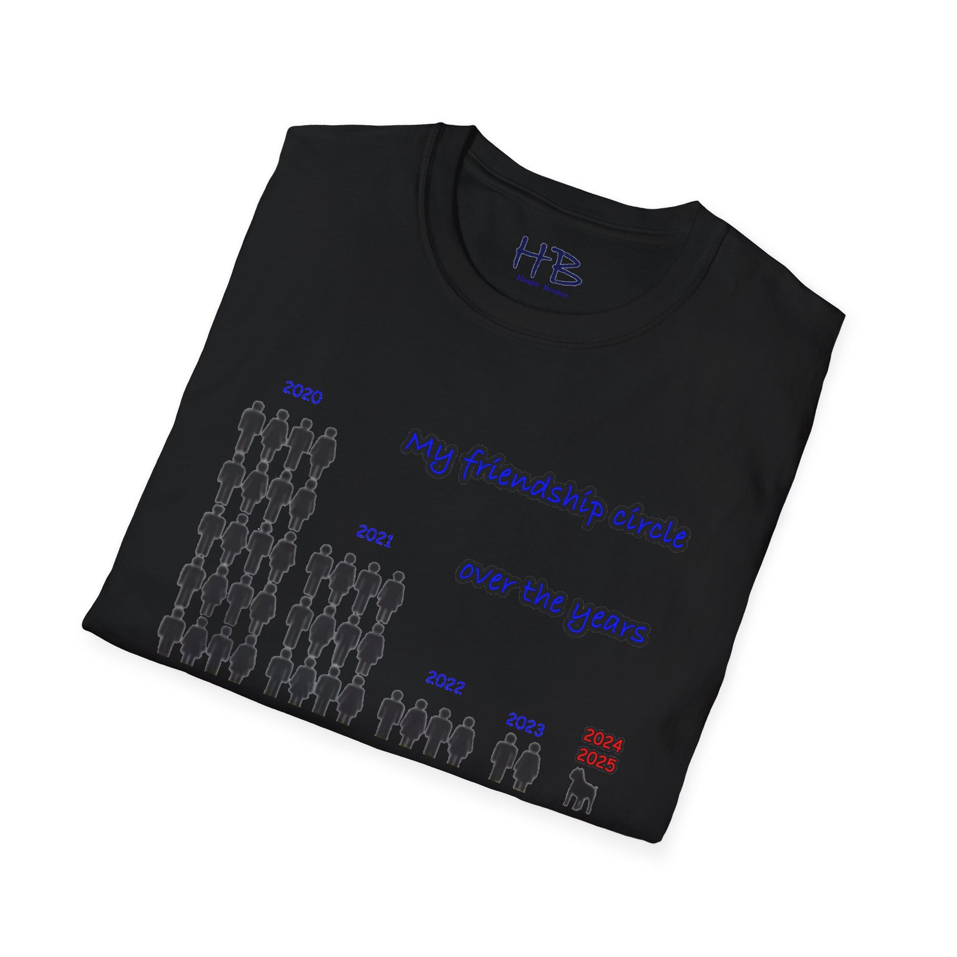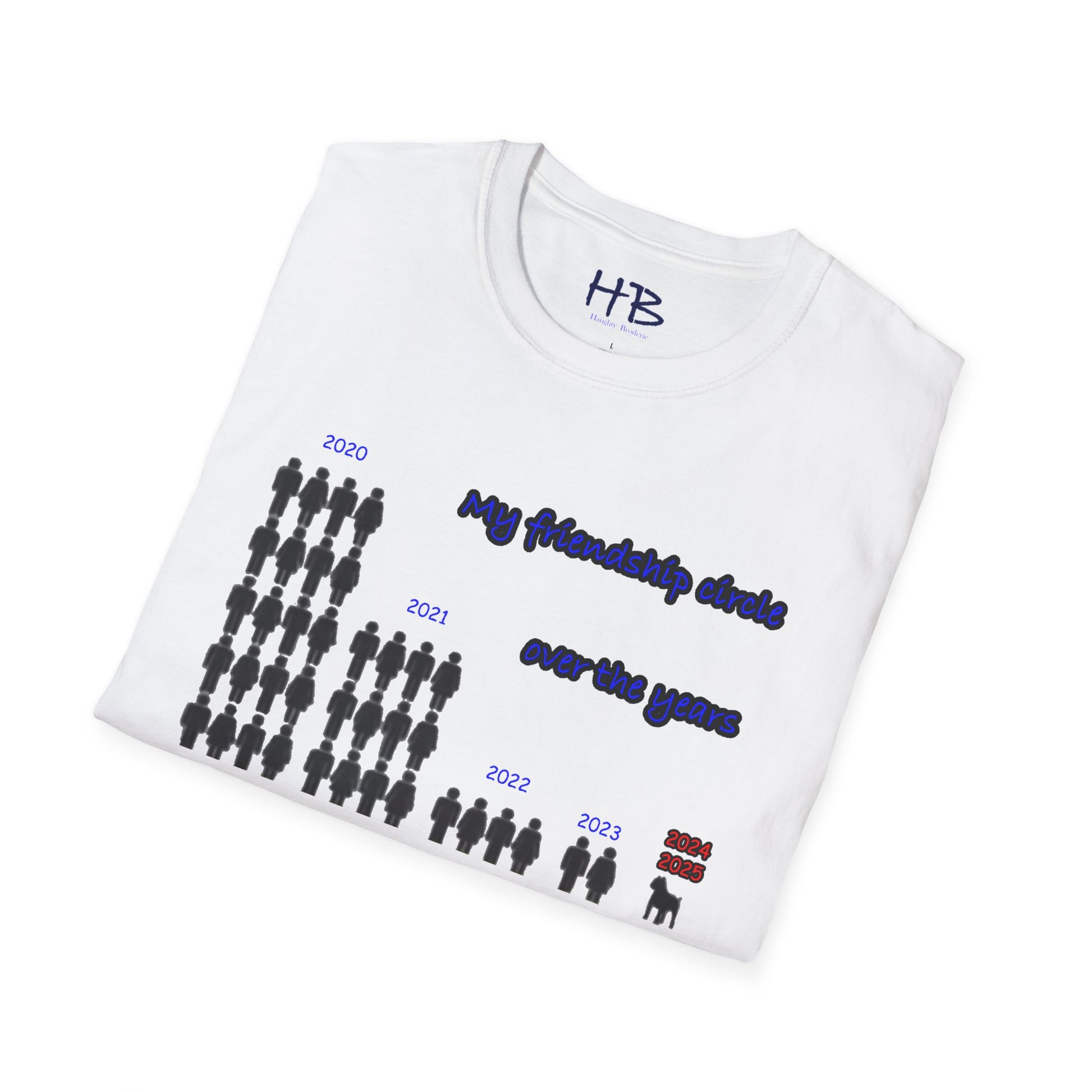 Introducing our newest tee shirt design, perfect for those searching for a visual representation of their changing friend groups over the years. This shirt features a striking image of stick figures arranged in a column format, each column representing a different year starting from 2019 and ending in 2023.