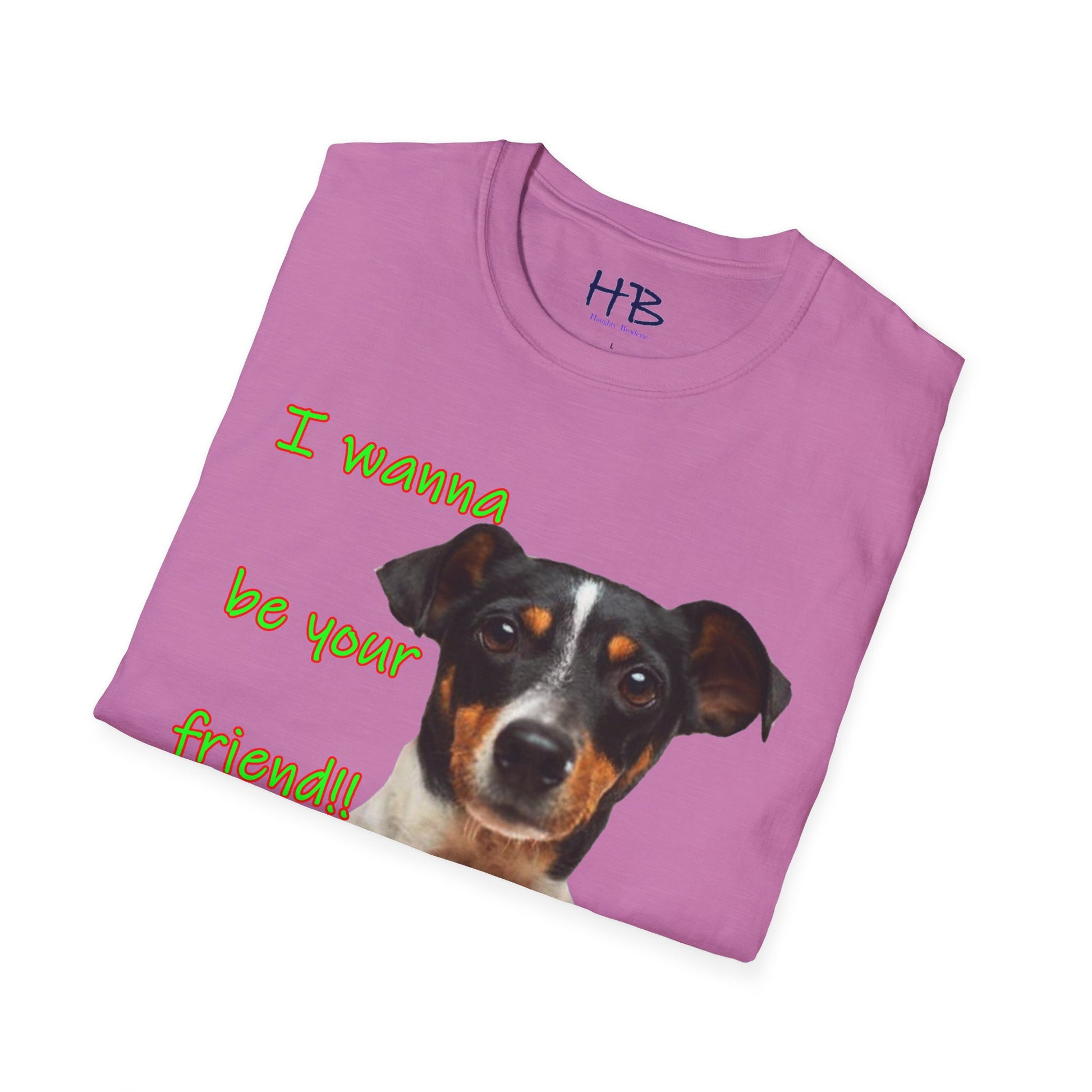 Introducing a captivating apparel piece that combines style, charm, and a powerful message for today's world. This remarkable garment showcases a striking image featuring an exceptionally handsome Russell Terrier, whose captivating gaze pierces through the lens, creating an instant connection with anyone who beholds it. The accompanying text, boldly emblazoned in elegant fonts, declares, "I wanna be your friend."