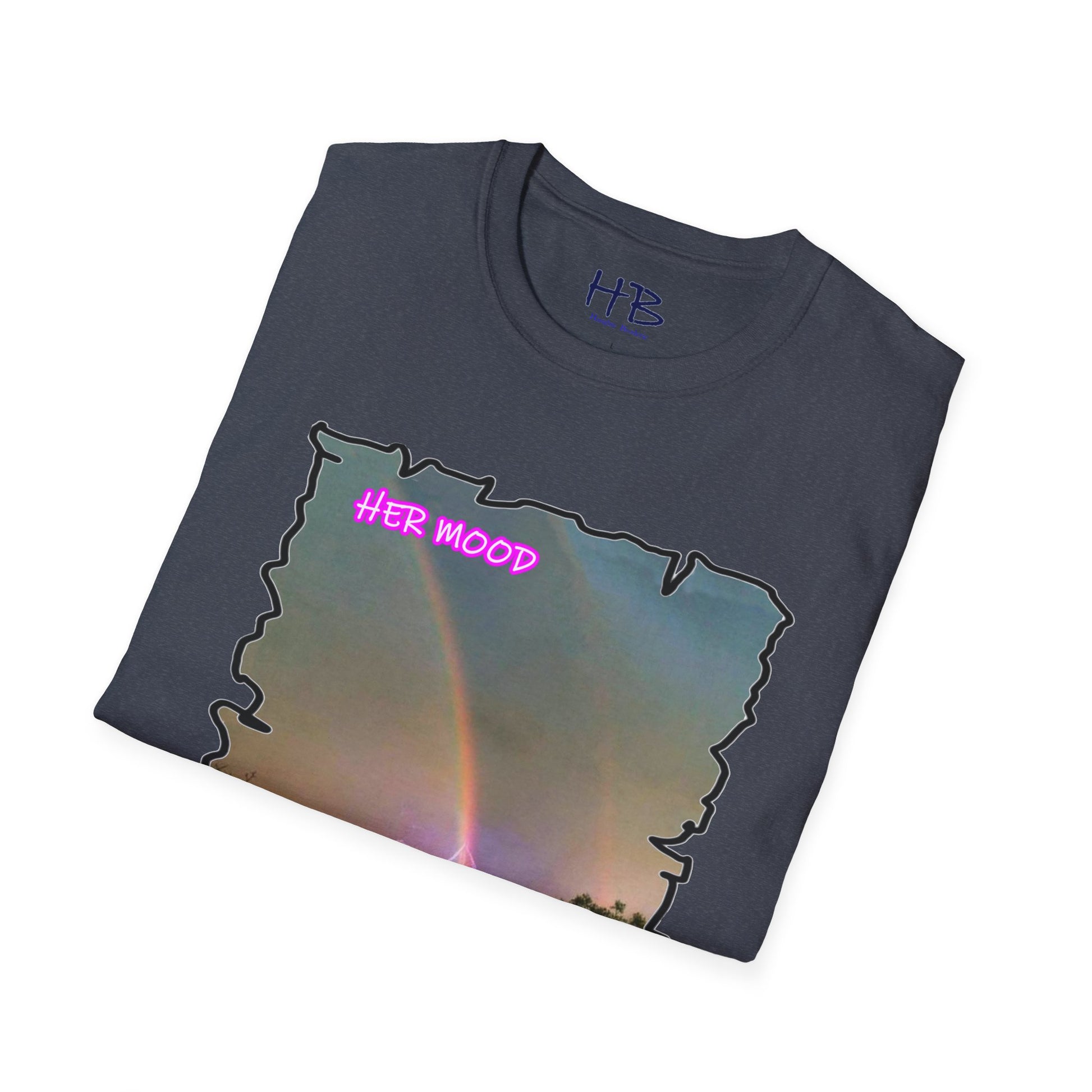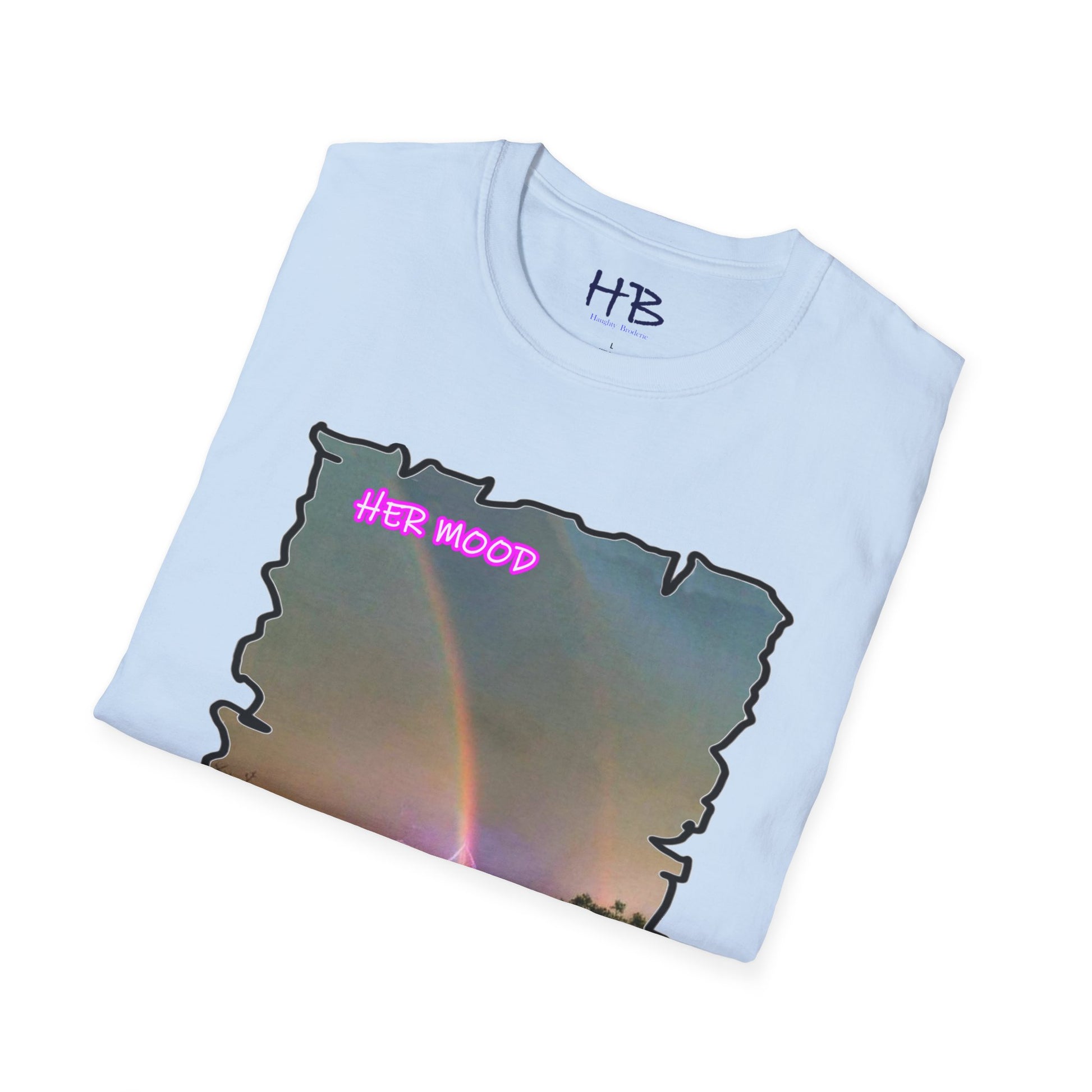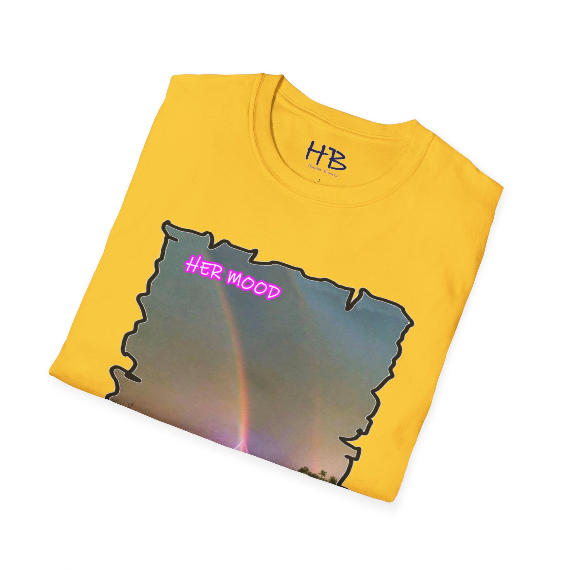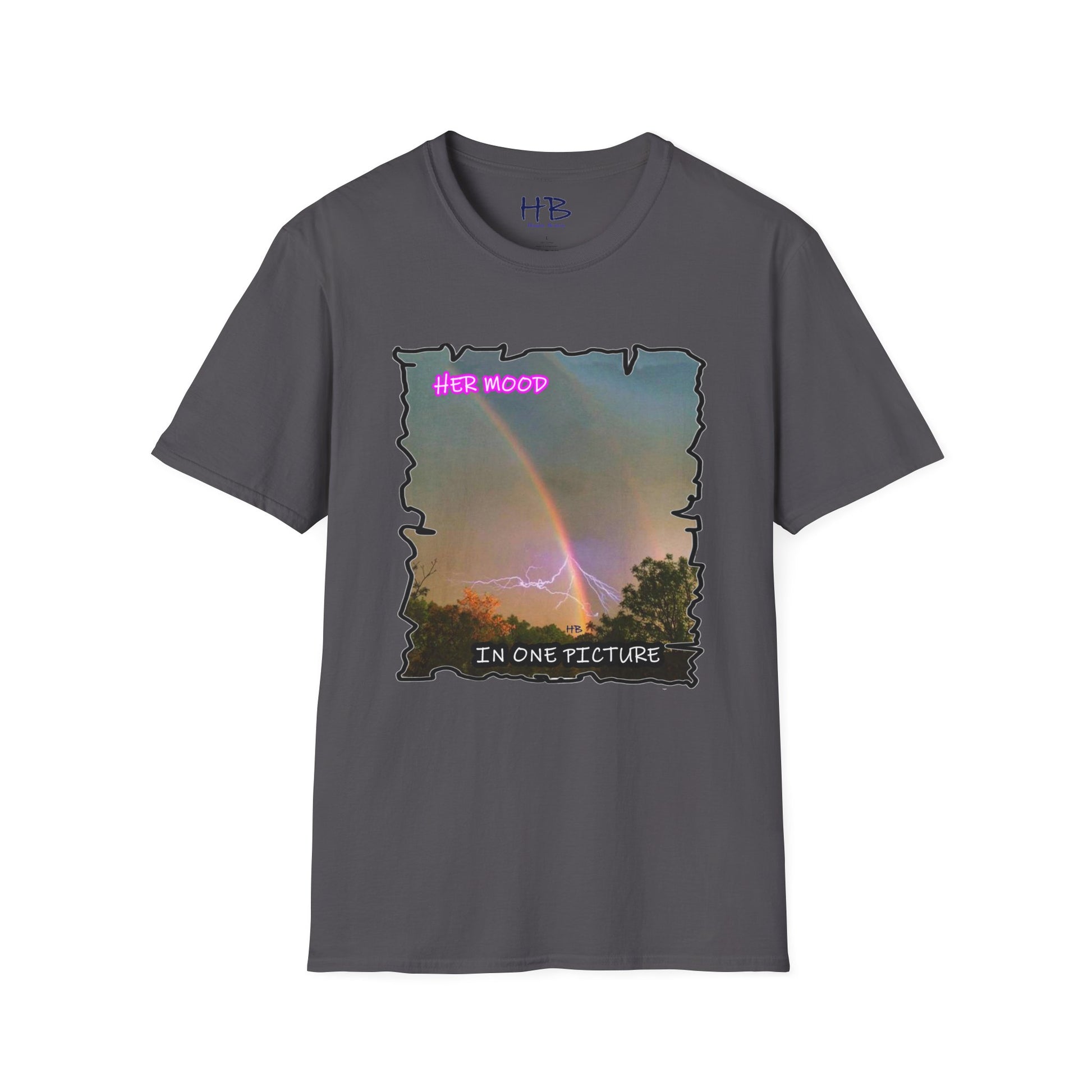But there's more to this tee shirt than meets the eye. At the edge of the magnificent rainbow, flashes of light burst forth, resembling lightning bolts. These electrifying strokes branch out from the rainbow, creating a sense of tension and excitement. These dynamic bursts reflect the text on the image, which reads, "Her mood, in one picture."