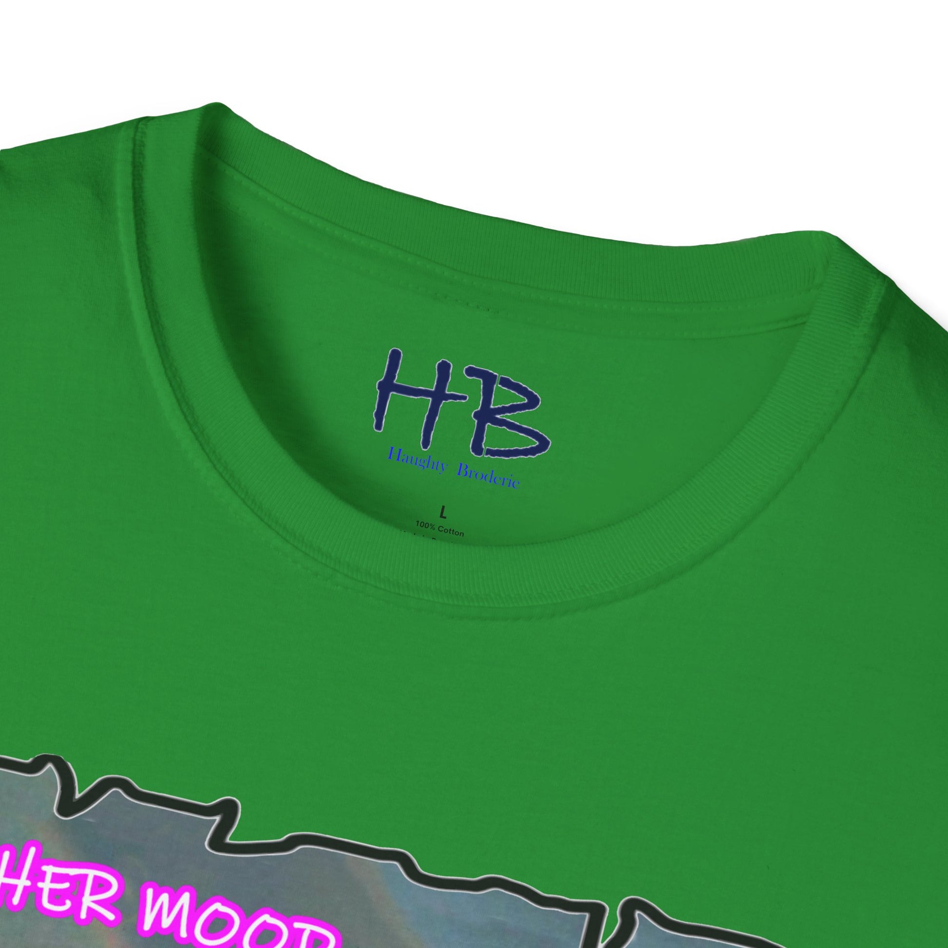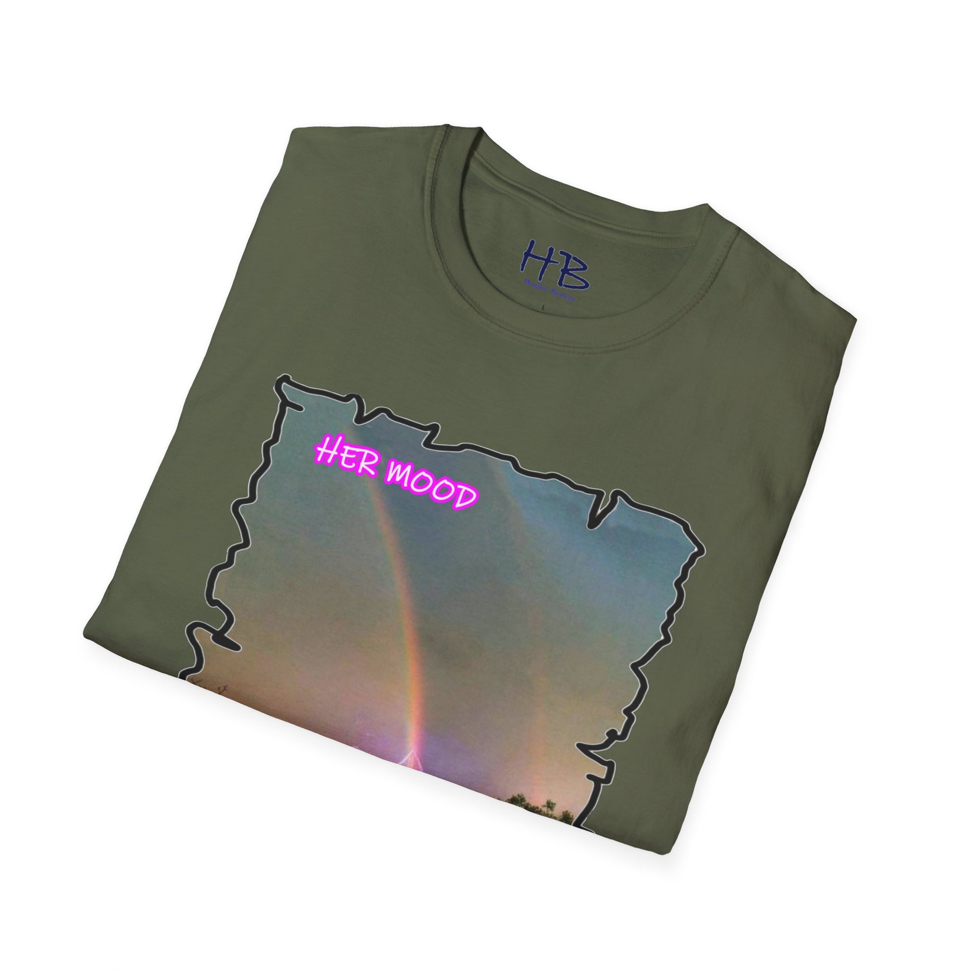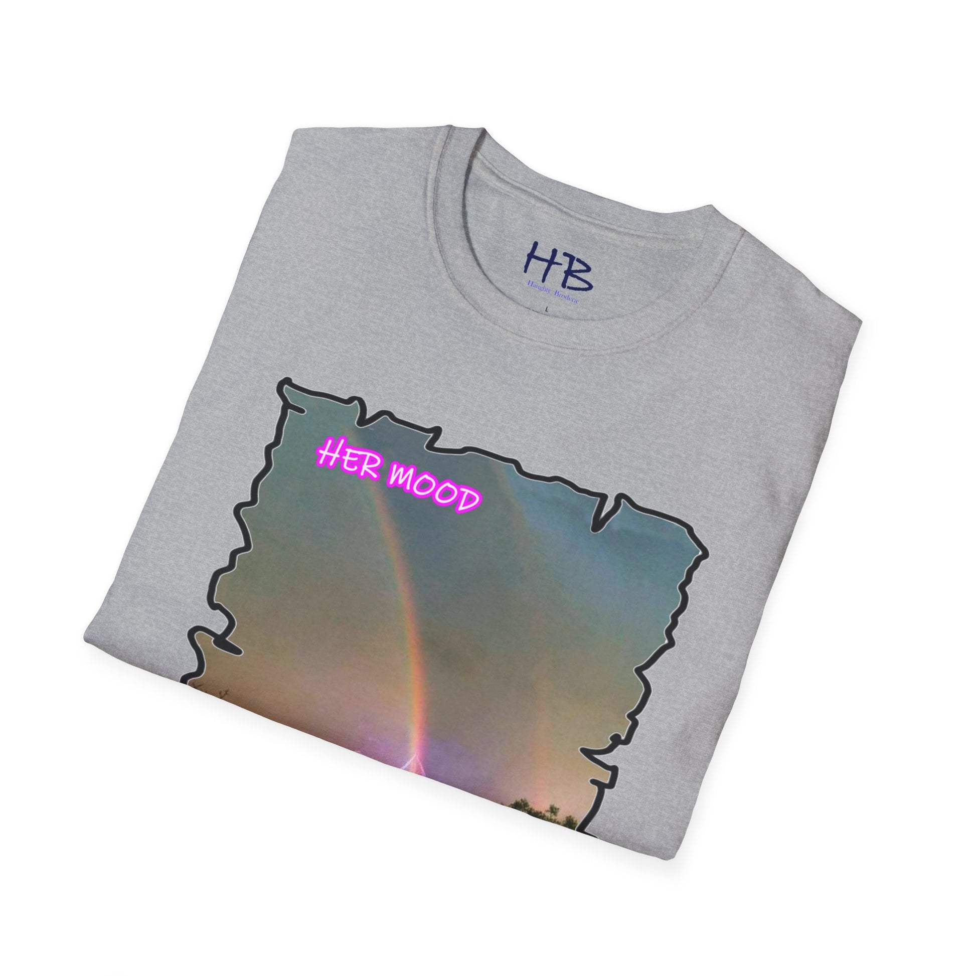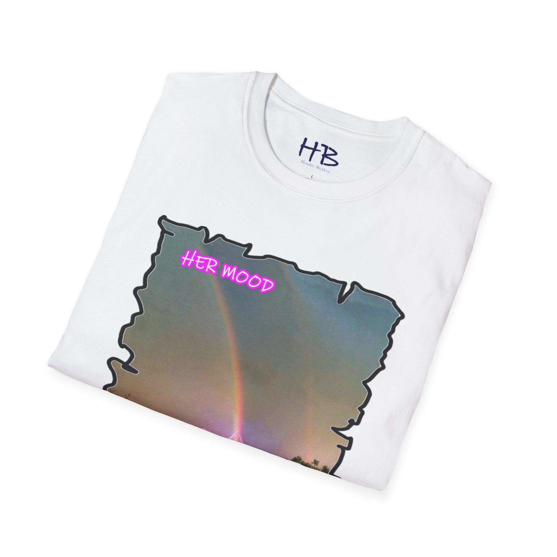But there's more to this tee shirt than meets the eye. At the edge of the magnificent rainbow, flashes of light burst forth, resembling lightning bolts. These electrifying strokes branch out from the rainbow, creating a sense of tension and excitement. These dynamic bursts reflect the text on the image, which reads, "Her mood, in one picture."