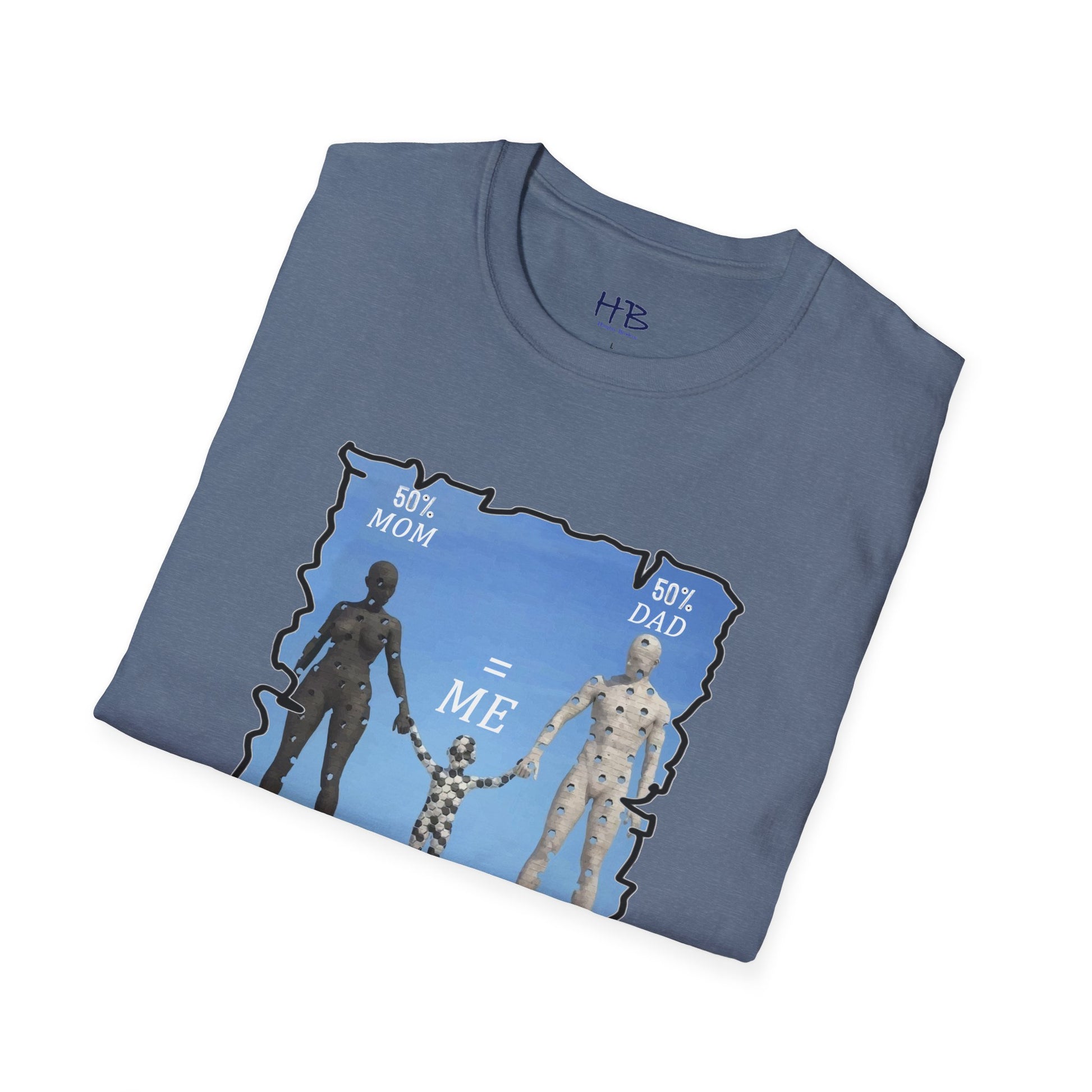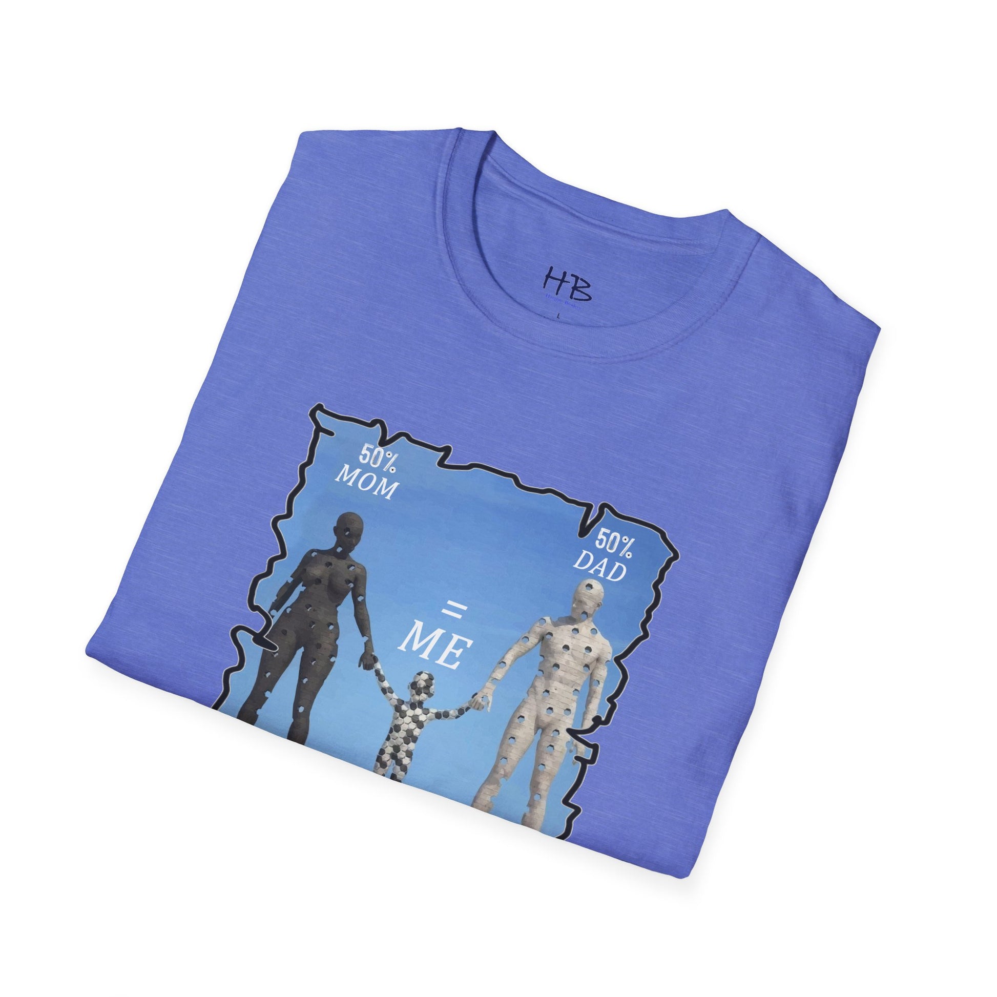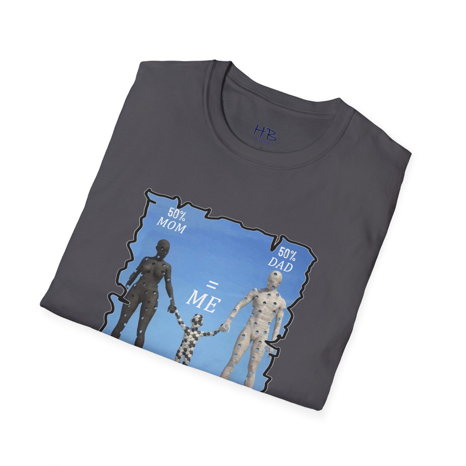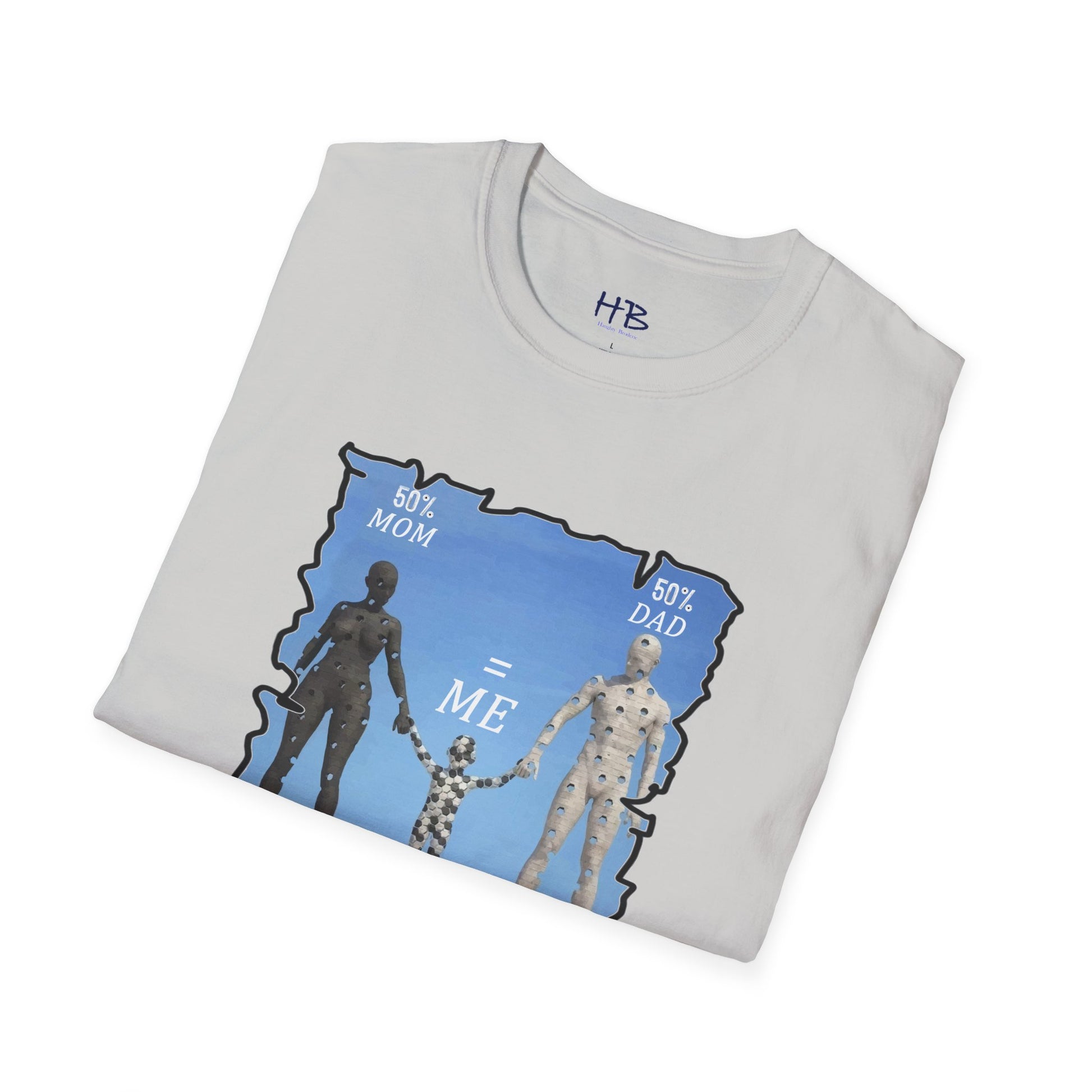 Introducing our latest tee shirt featuring a unique design of a mother, father, and child model. The parents are depicted with missing pieces or holes, which perfectly fit into the child to form a complete image. The caption reads "50% Mom, 50% Dad = ME," emphasizing the importance of a child's genetic makeup. This creative and thoughtful design is sure to turn heads and spark conversations. It's perfect for parents, children, or anyone who wants to celebrate their unique family heritage. With this tee, you can proudly show the world your roots and let everyone know that you are a perfect blend of both your parents. So, grab this tee today and let the world know that you are a perfect combination of your mom and dad. Up to you and your friends to decide who wears it best!