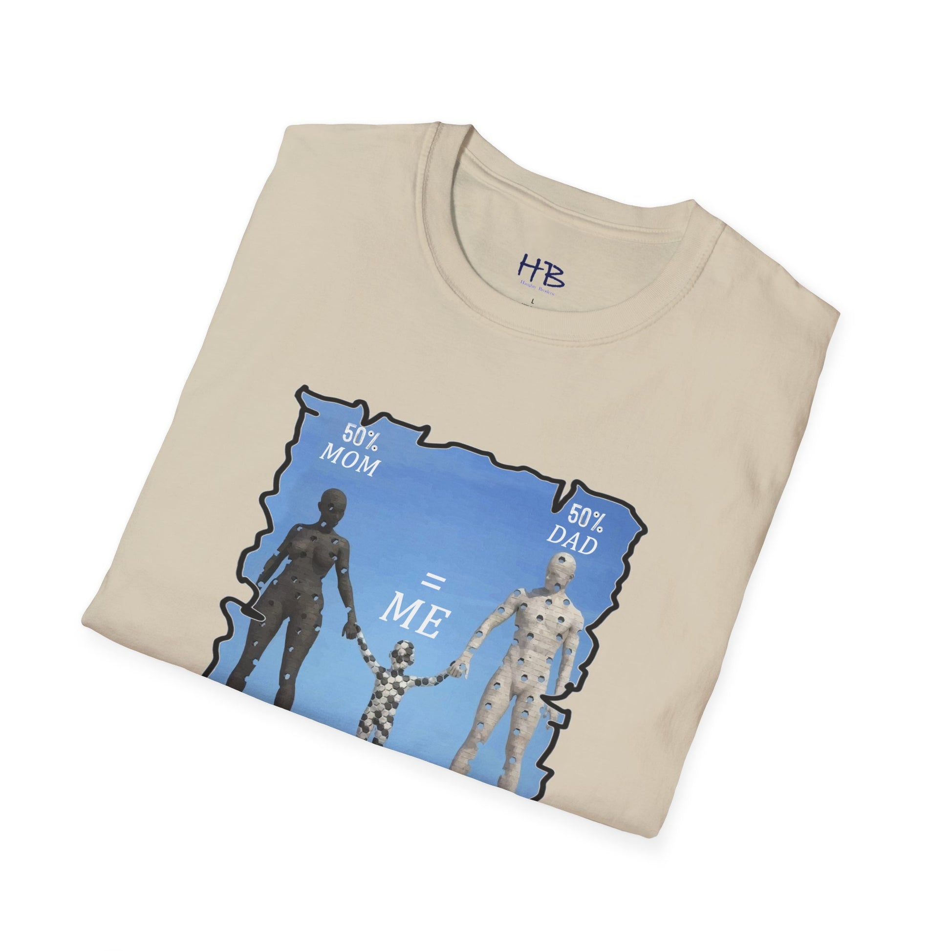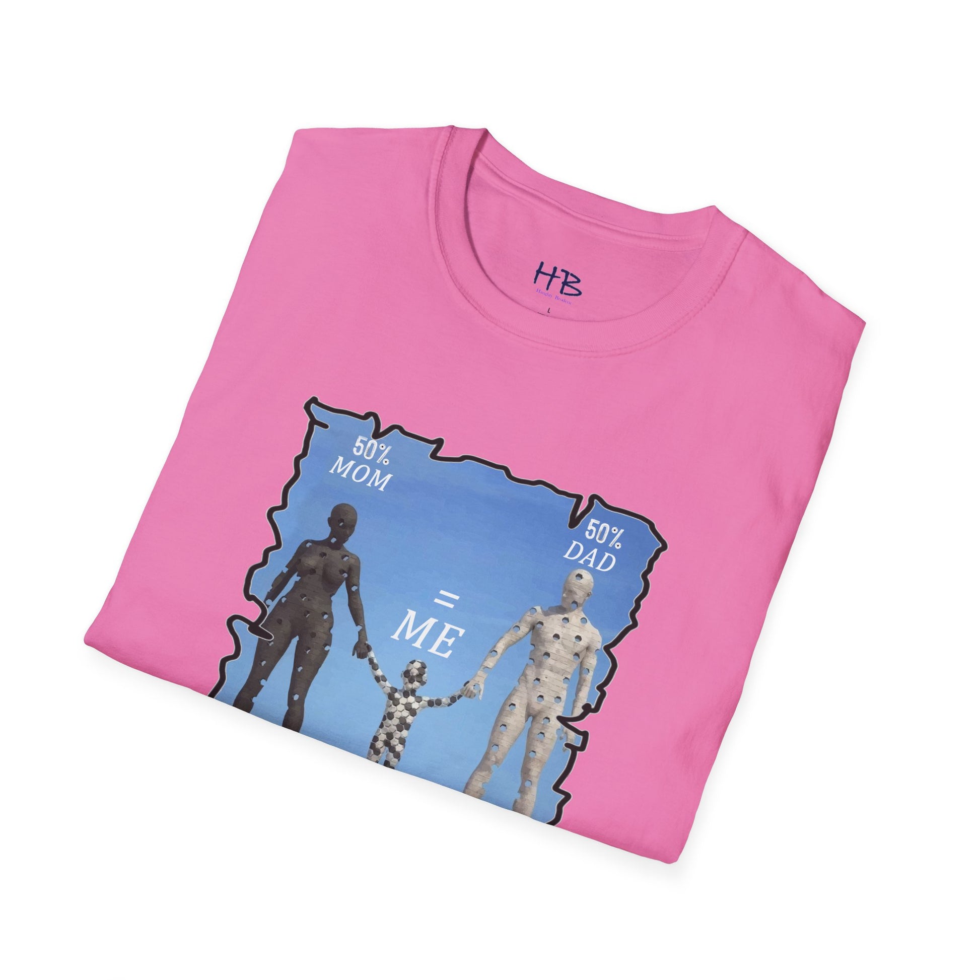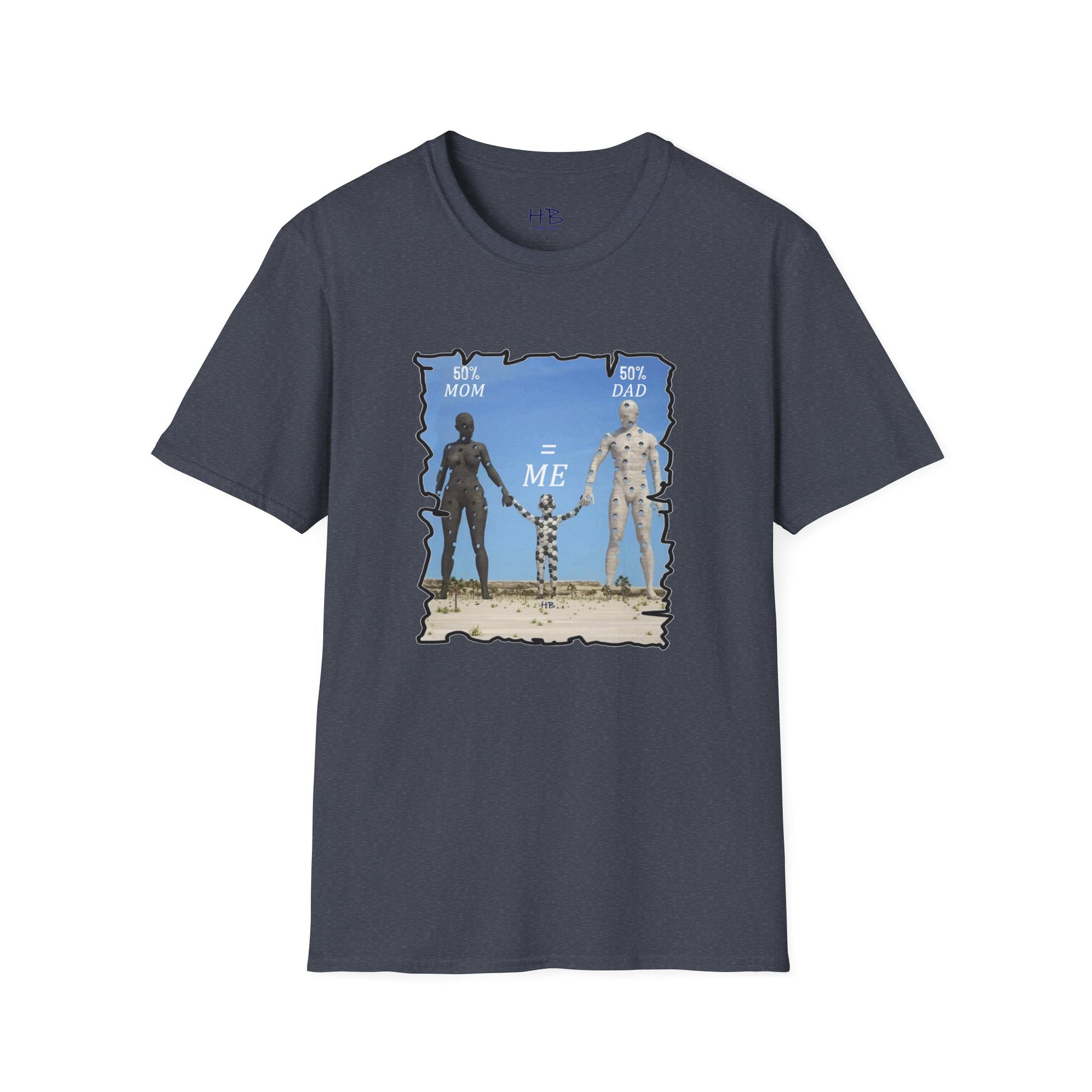 Introducing our latest tee shirt featuring a unique design of a mother, father, and child model. The parents are depicted with missing pieces or holes, which perfectly fit into the child to form a complete image. The caption reads "50% Mom, 50% Dad = ME," emphasizing the importance of a child's genetic makeup. This creative and thoughtful design is sure to turn heads and spark conversations. It's perfect for parents, children, or anyone who wants to celebrate their unique family heritage. With this tee, you can proudly show the world your roots and let everyone know that you are a perfect blend of both your parents. So, grab this tee today and let the world know that you are a perfect combination of your mom and dad. Up to you and your friends to decide who wears it best!