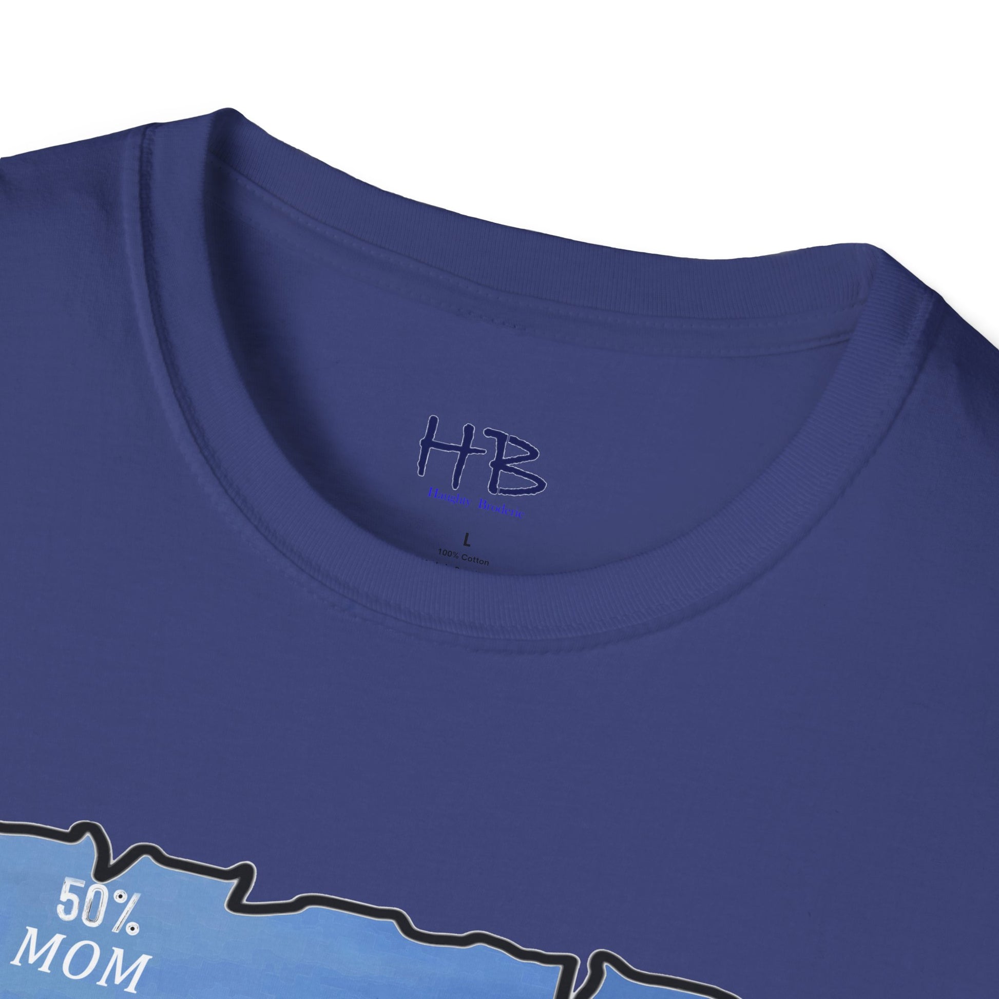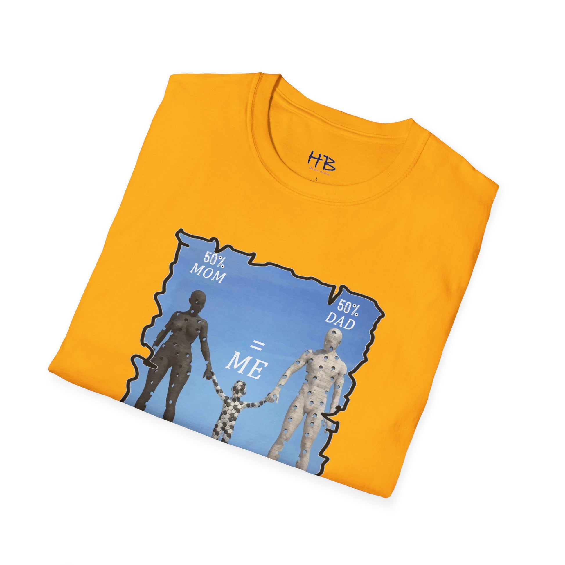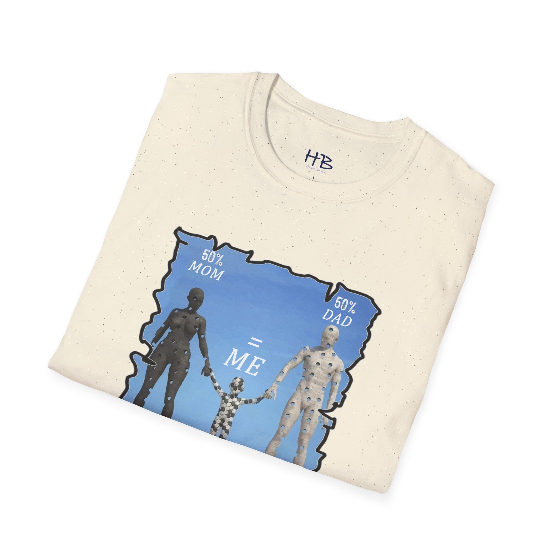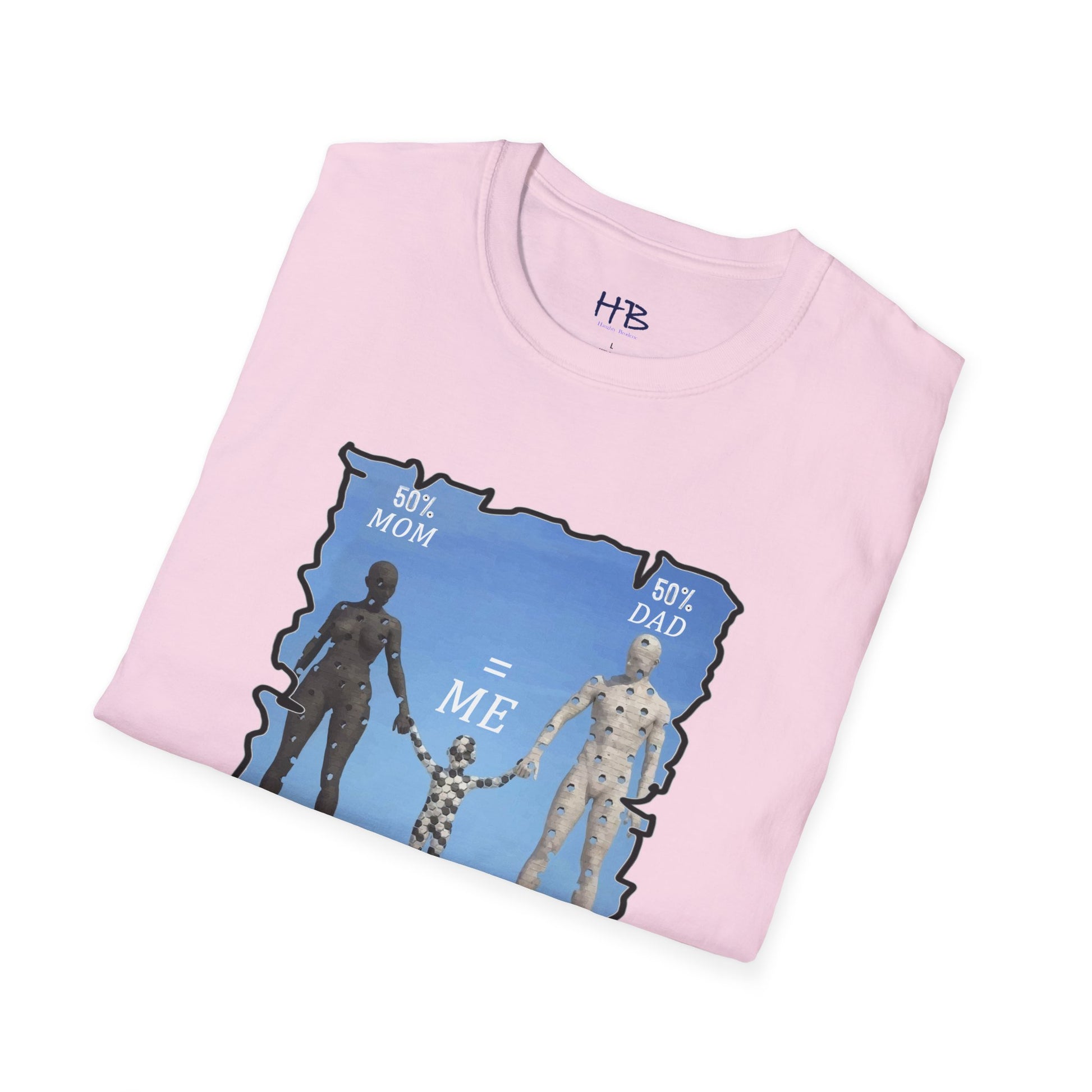 Introducing our latest tee shirt featuring a unique design of a mother, father, and child model. The parents are depicted with missing pieces or holes, which perfectly fit into the child to form a complete image. The caption reads "50% Mom, 50% Dad = ME," emphasizing the importance of a child's genetic makeup. This creative and thoughtful design is sure to turn heads and spark conversations. It's perfect for parents, children, or anyone who wants to celebrate their unique family heritage. With this tee, you can proudly show the world your roots and let everyone know that you are a perfect blend of both your parents. So, grab this tee today and let the world know that you are a perfect combination of your mom and dad. Up to you and your friends to decide who wears it best!