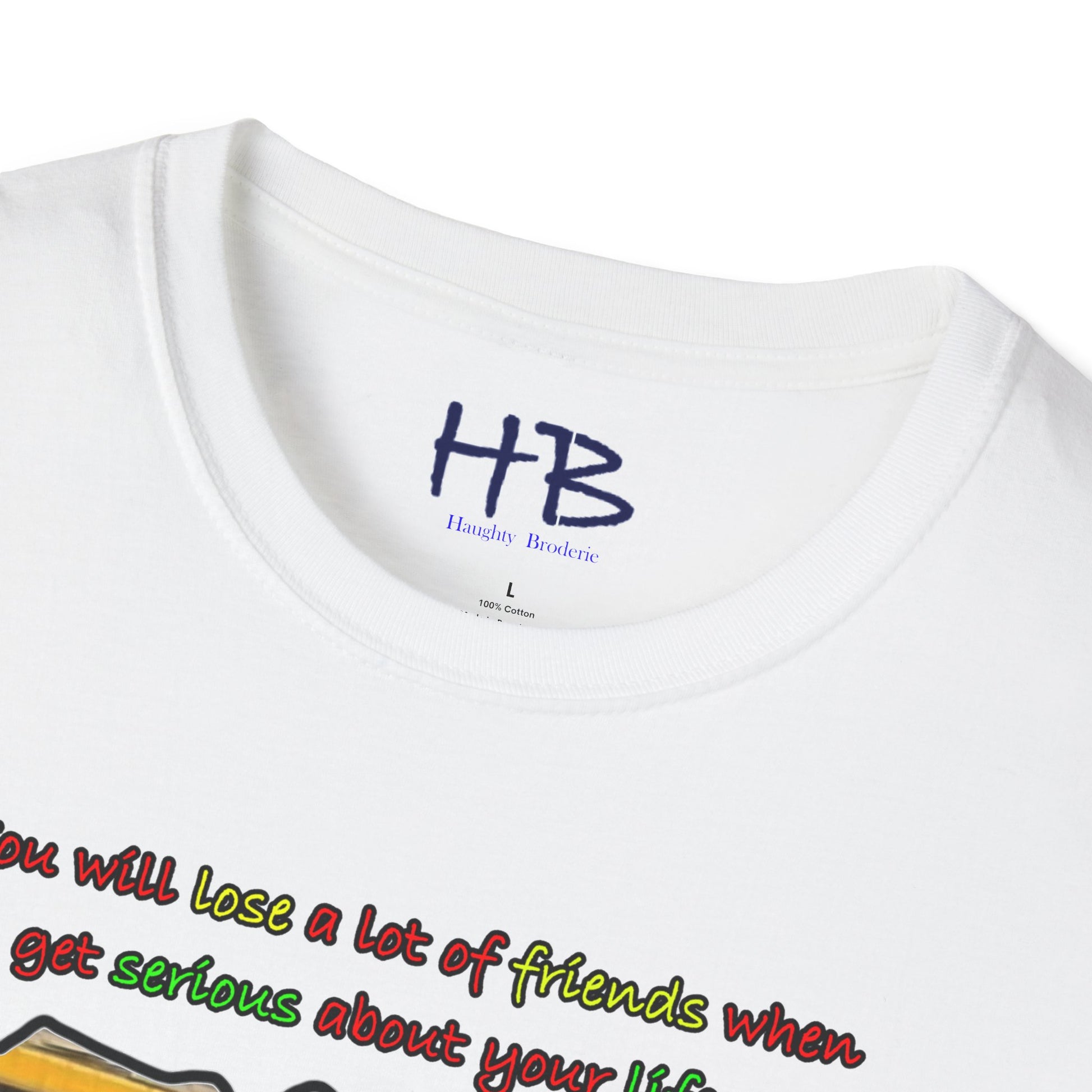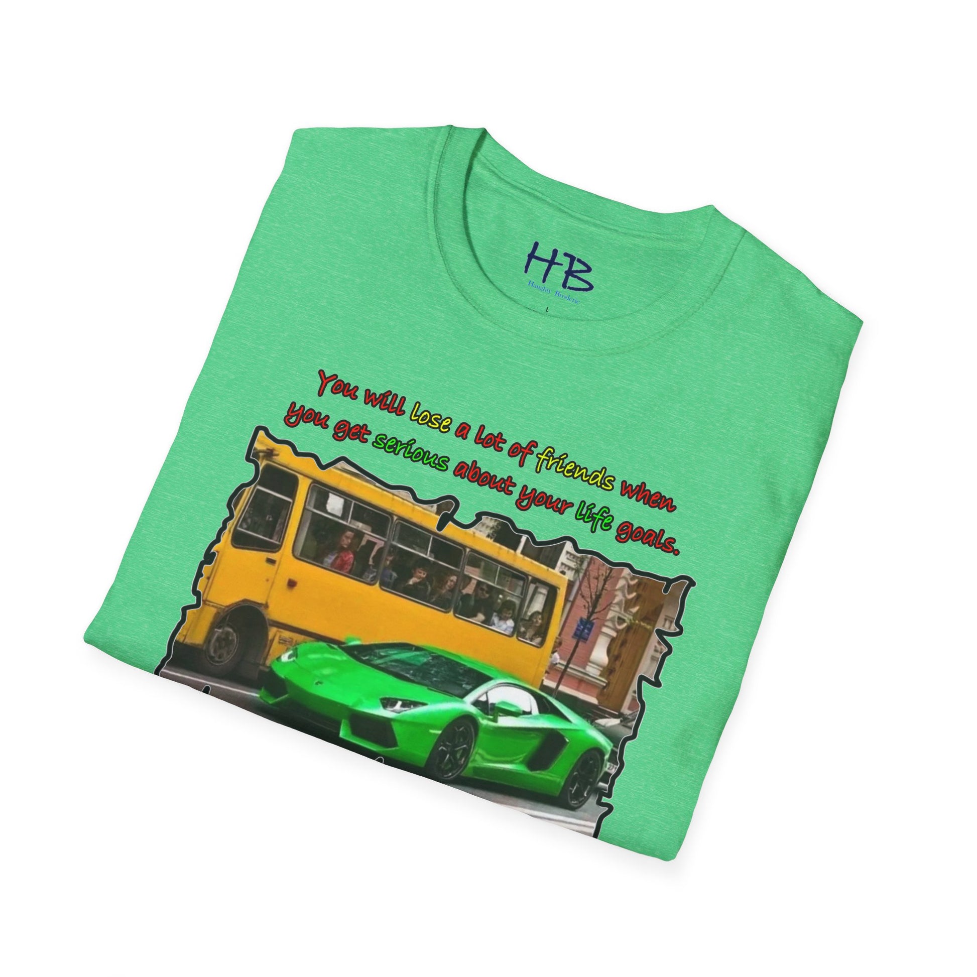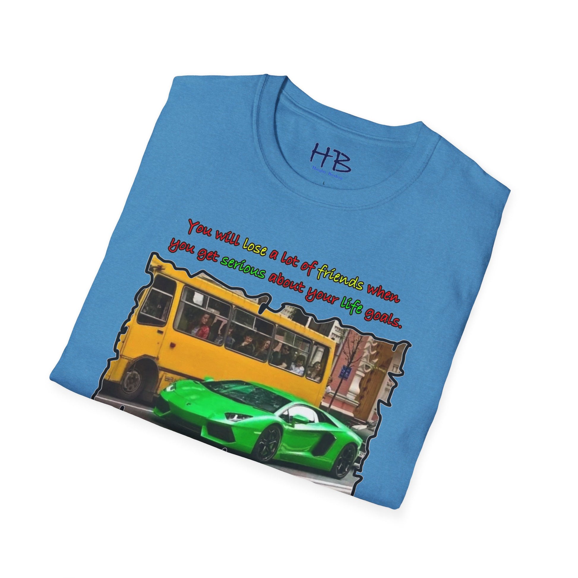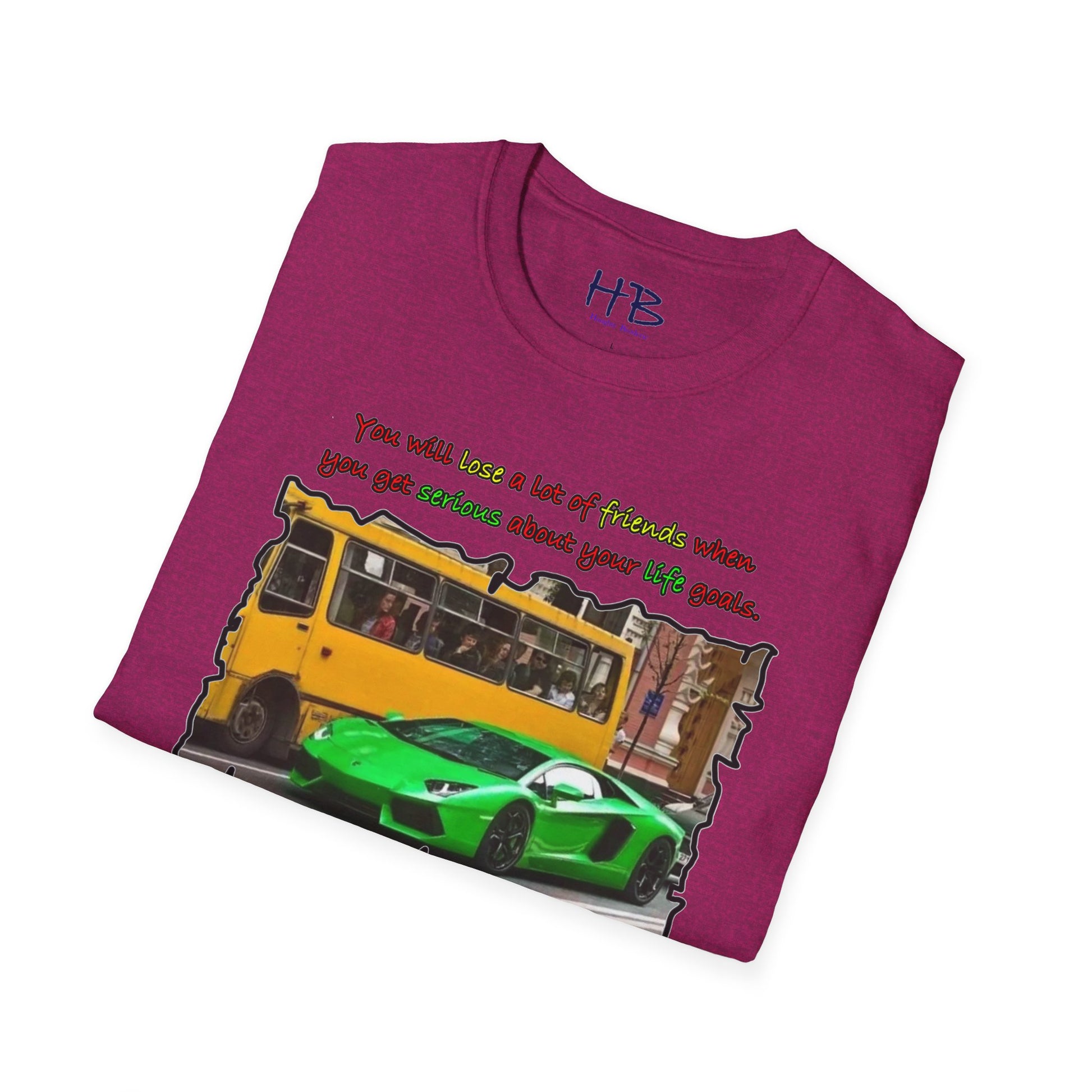 Introducing our trendy t-shirt that embodies the message of prioritizing your life goals and the sacrifices that come with it. The striking image on the shirt portrays a massive coach filled with passengers, all gazing down at a verdant and flamboyant Lamborghini, consumed by envy. The text overlay boldly declares that dedicating oneself to life goals can lead to losing friends, and highlights the contrast between the two-seater Lamborghini and the 50-seater bus. This image symbolizes the idea that when you pursue your passions and ambitions, you may have to leave behind people who do not share the same aspirations.