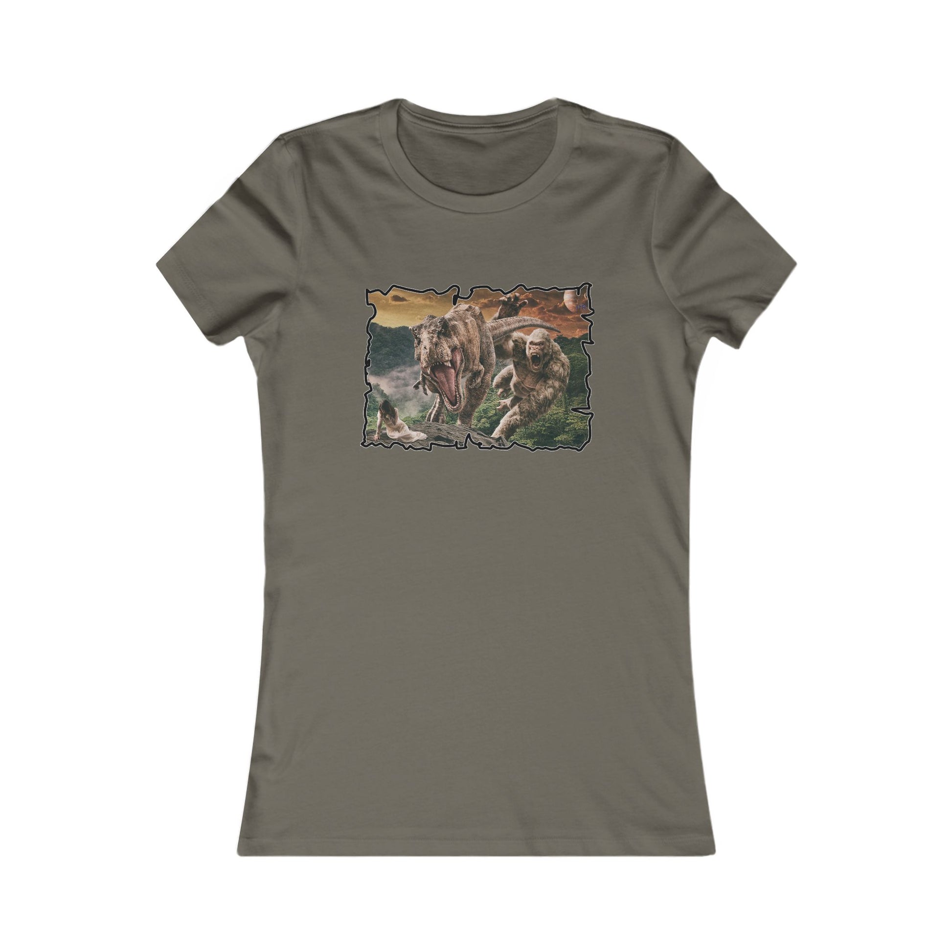 Looking for a tee shirt that features a massive ape reaching for the tail of a tyrannosaurus rex? Want a shirt with a prehistoric predator baring its teeth as it prepares to attack a frightened young woman perched on a rocky outcropping? Look no further than this unique and eye-catching tee!