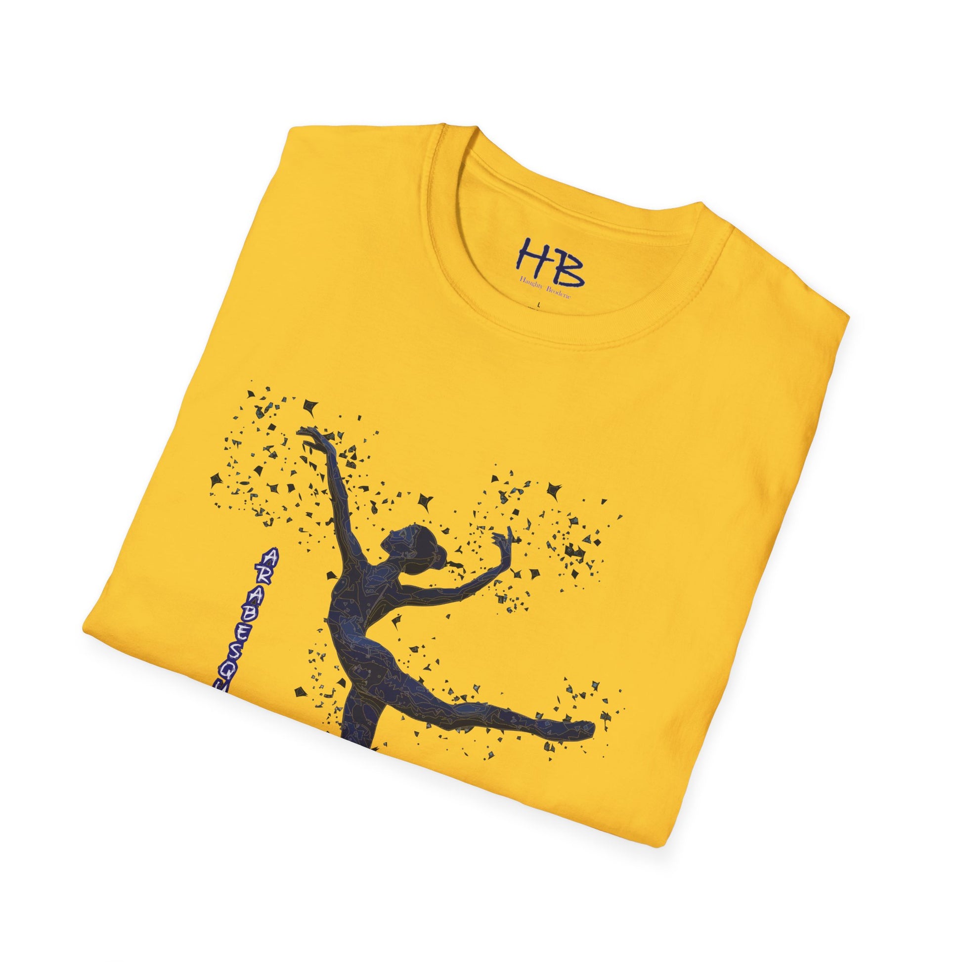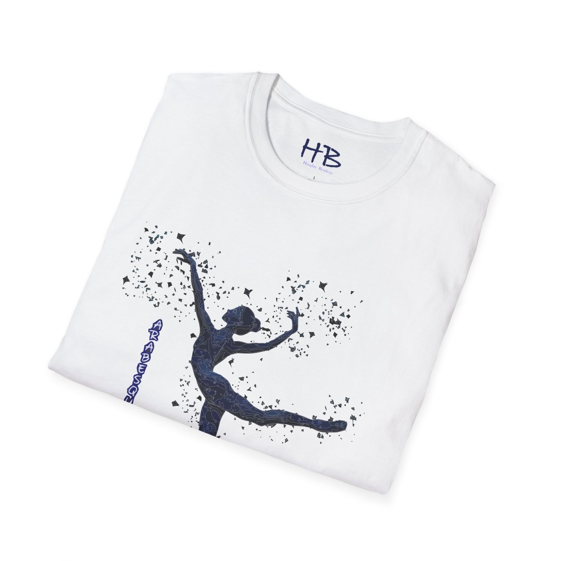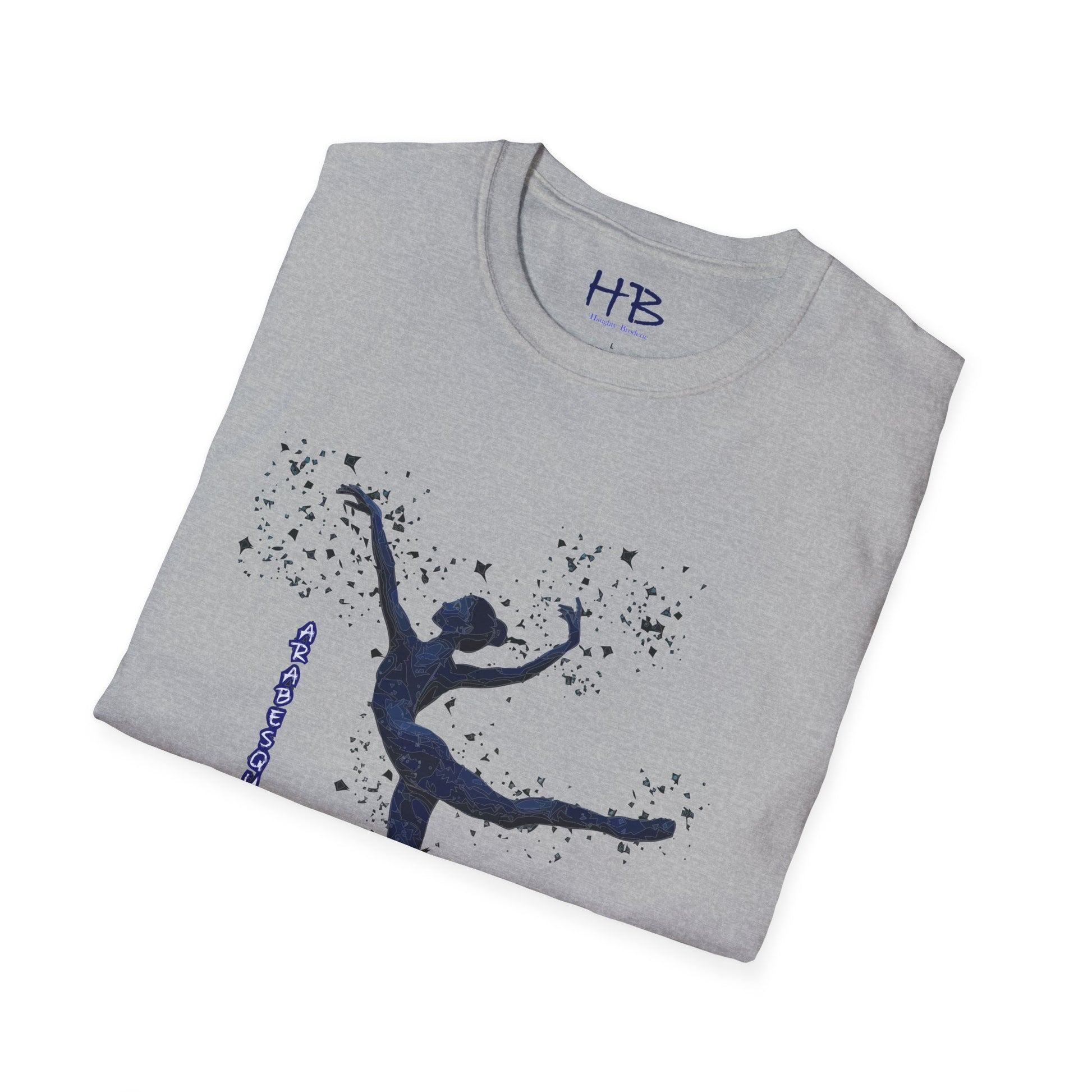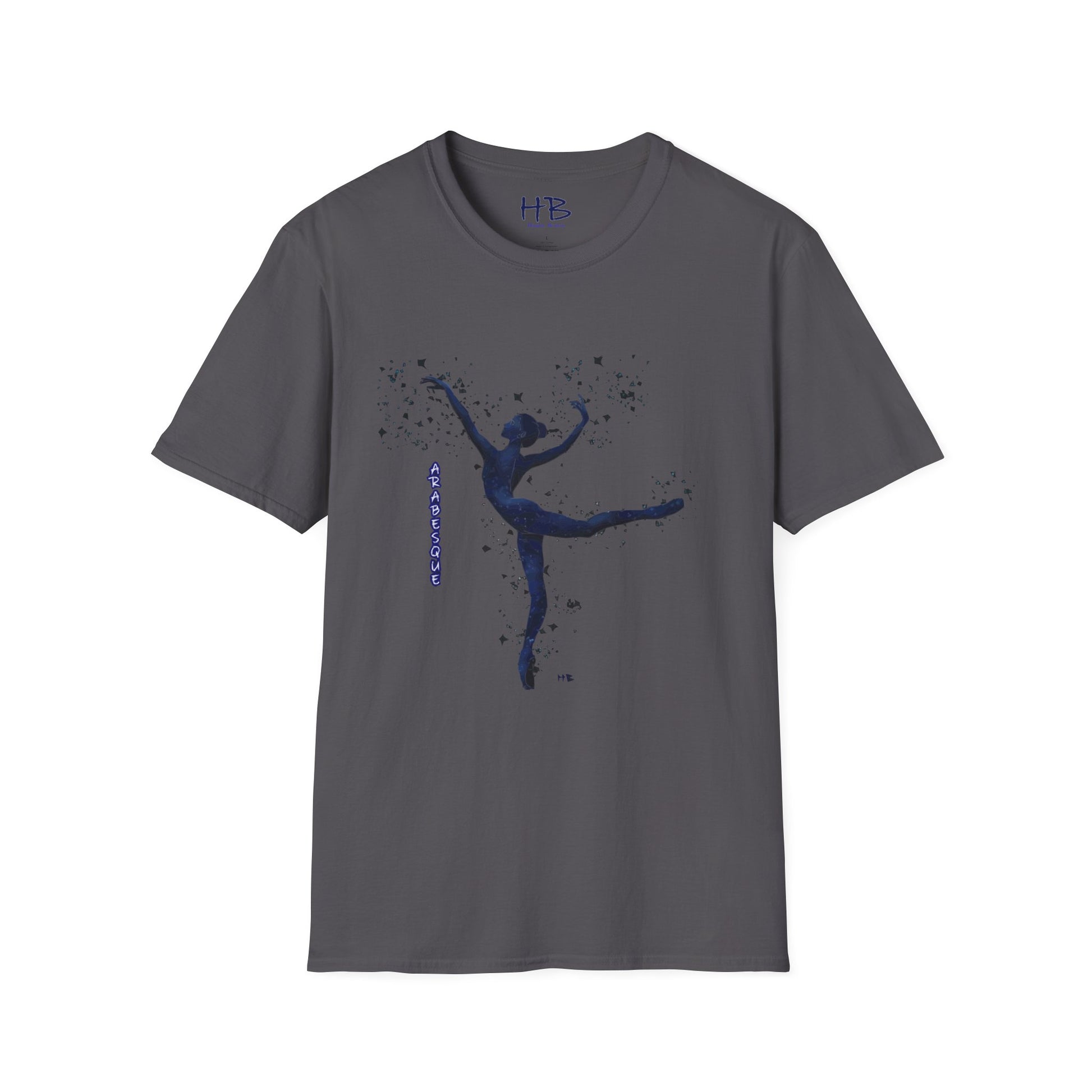 Introducing our exquisite garment that captures the essence of grace and beauty - the ARABESQUE tee shirt. This meticulously designed masterpiece features a captivating drawing of a lady ballerina gracefully performing the Arabesque dance move, adorned with enchanting sprinkles delicately scattered around her elegant figure. With the word "ARABESQUE" accompanying the enchanting artwork, this tee shirt effortlessly captures the essence of this mesmerizing ballet move.
