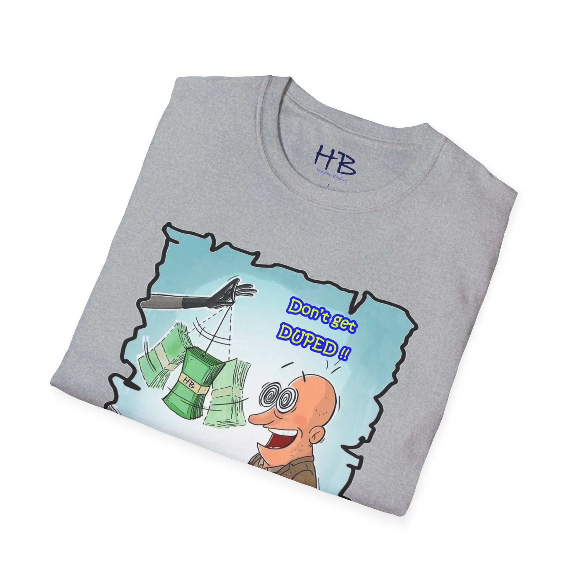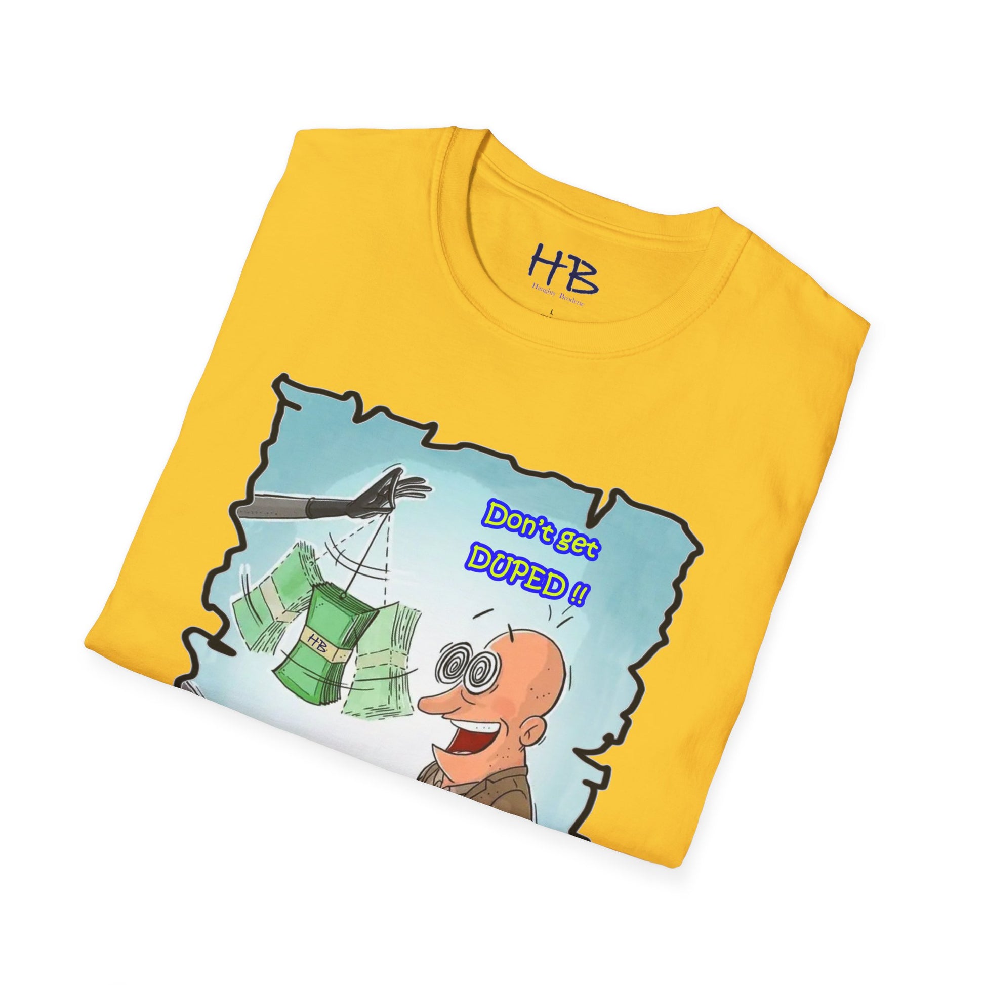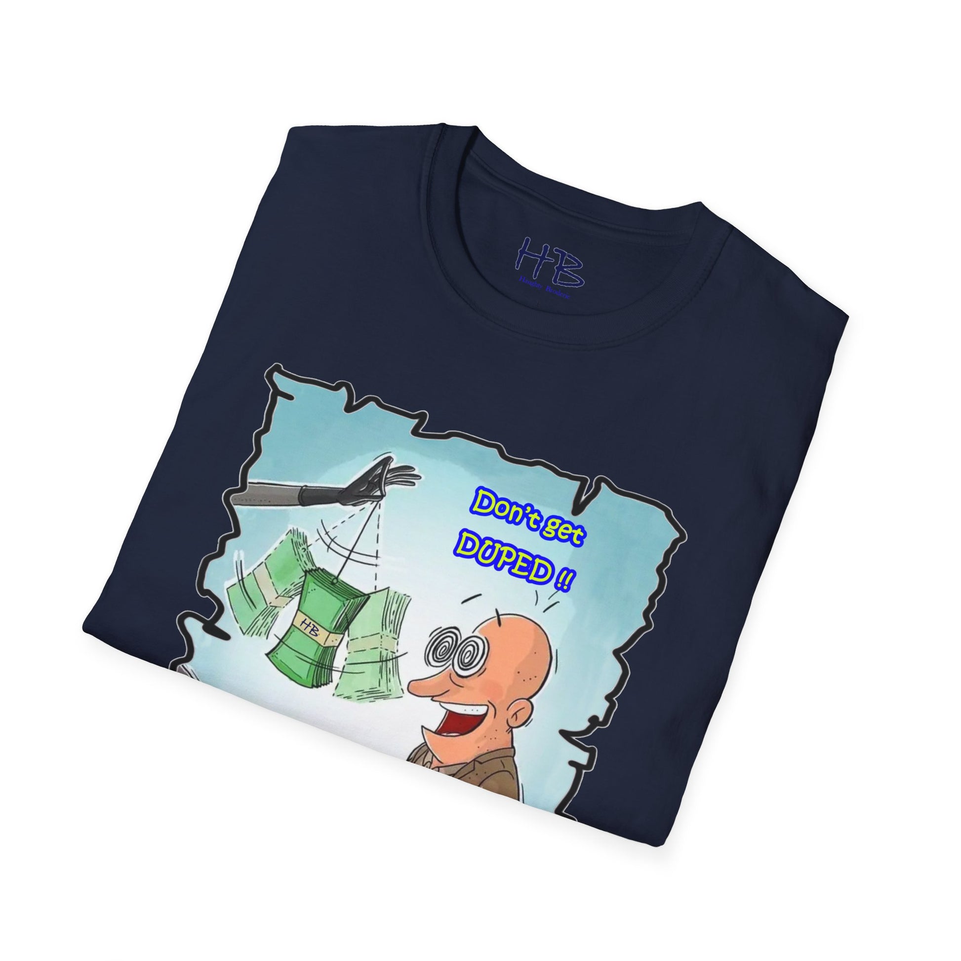 One hand, with its mesmerizing grip, has the man entranced, fixated on the allure of wealth. Meanwhile, the other hand deftly slips into the vest pocket of the unsuspecting man, stealthily pilfering his hard-earned money. With bold clarity, the text on this t-shirt emphatically declares, "Don't get DUPED!"